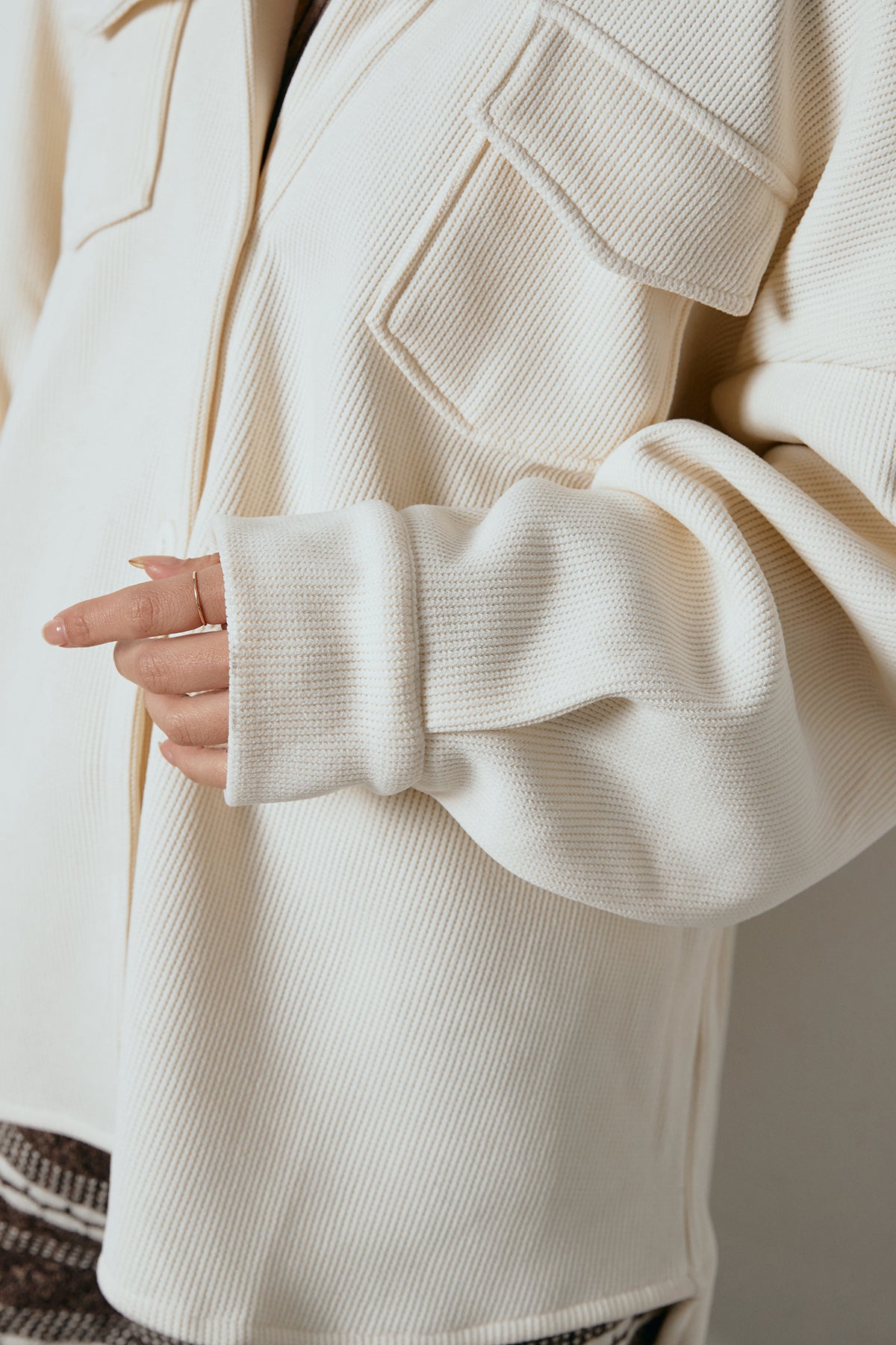 オーバーサイズ気味のシルエットで抜け感を演出しつつ、胸元の大きめポケットが程よいアクセントに。