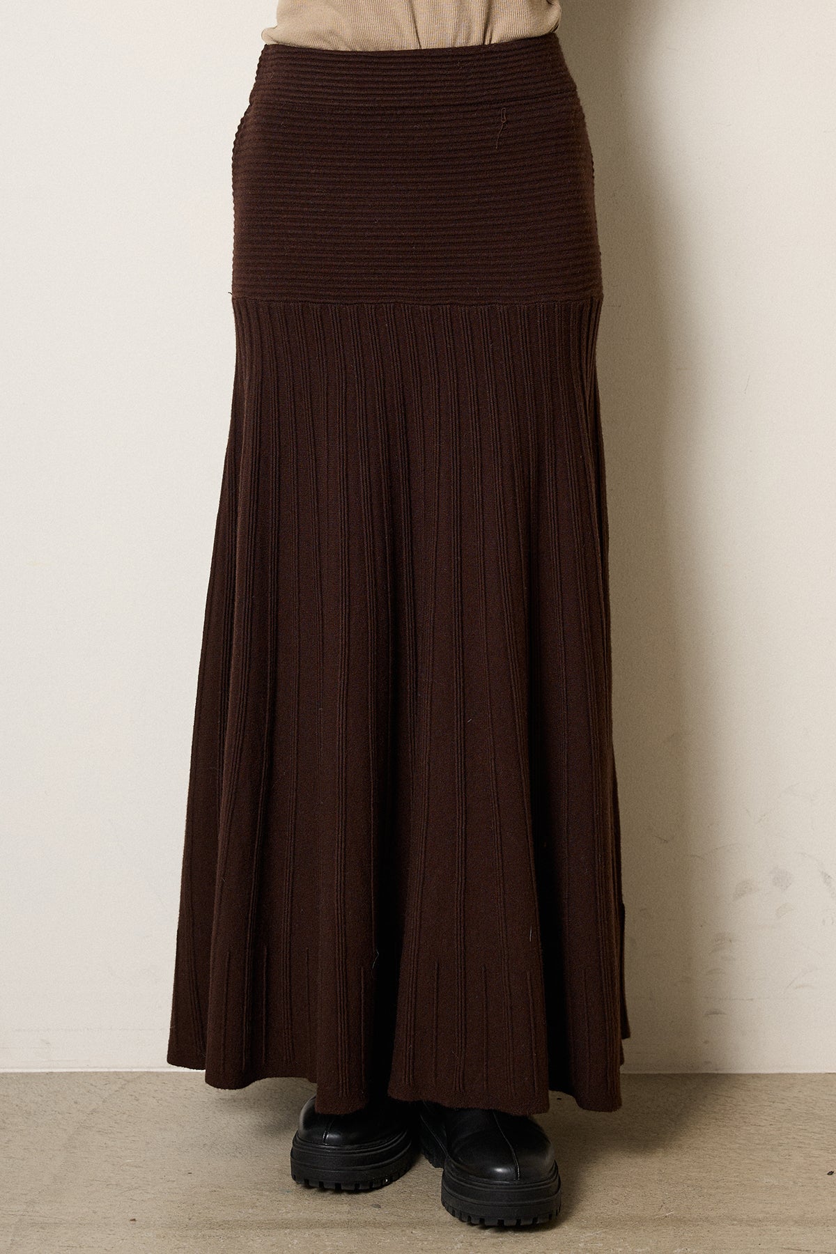 ウエストからヒップにかけてはリブ編みですっきり見せ、裾に向かって柔らかく広がるフレアシルエットが美しい一枚。