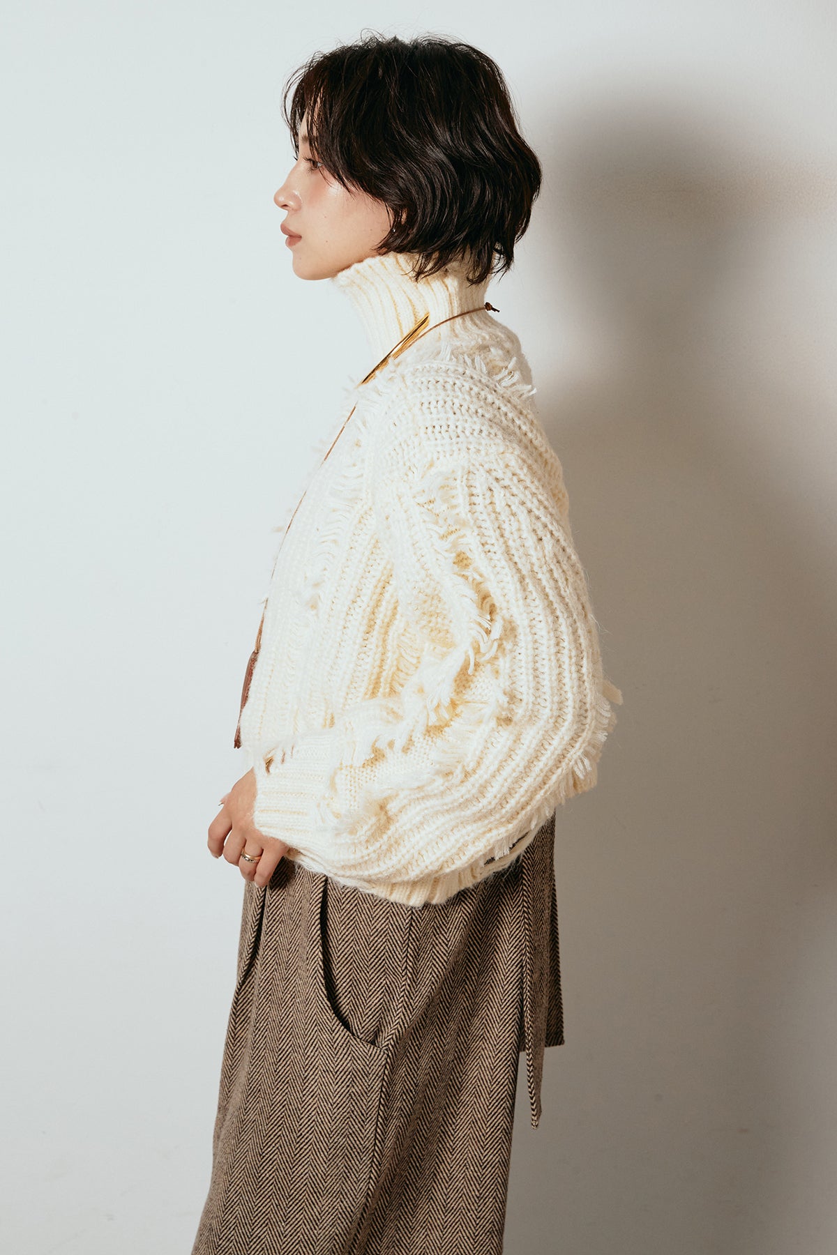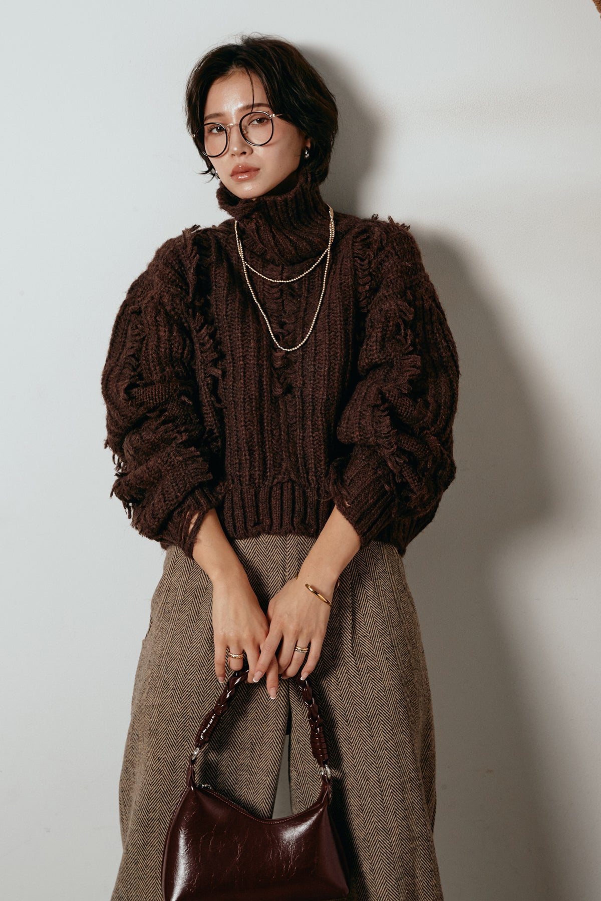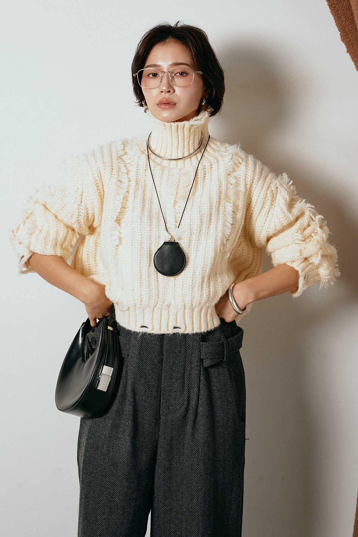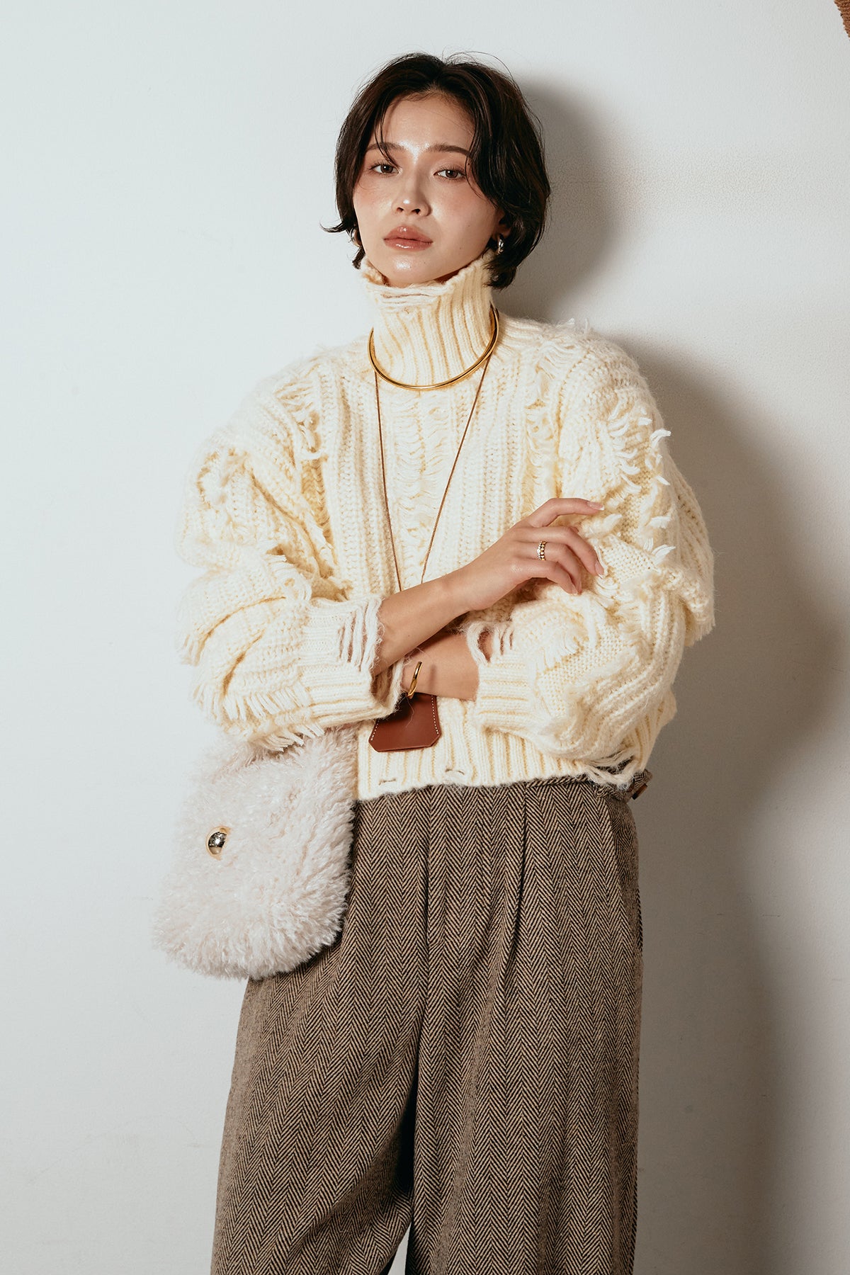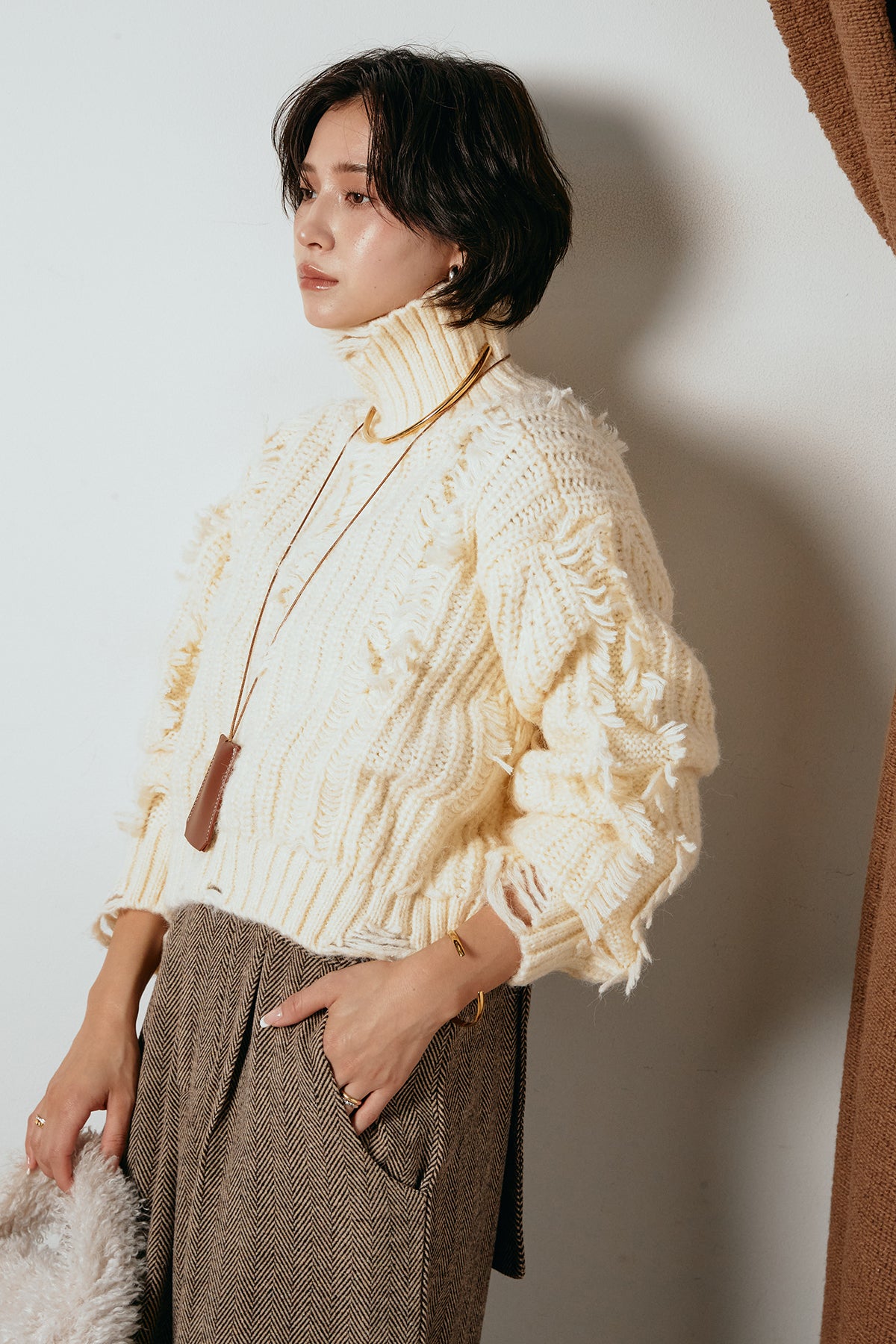 立体感のあるフリンジが印象的なタートルショートニット。