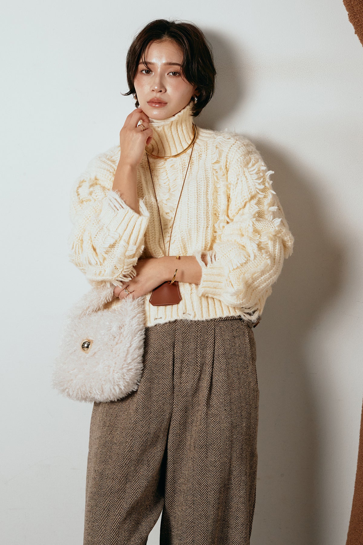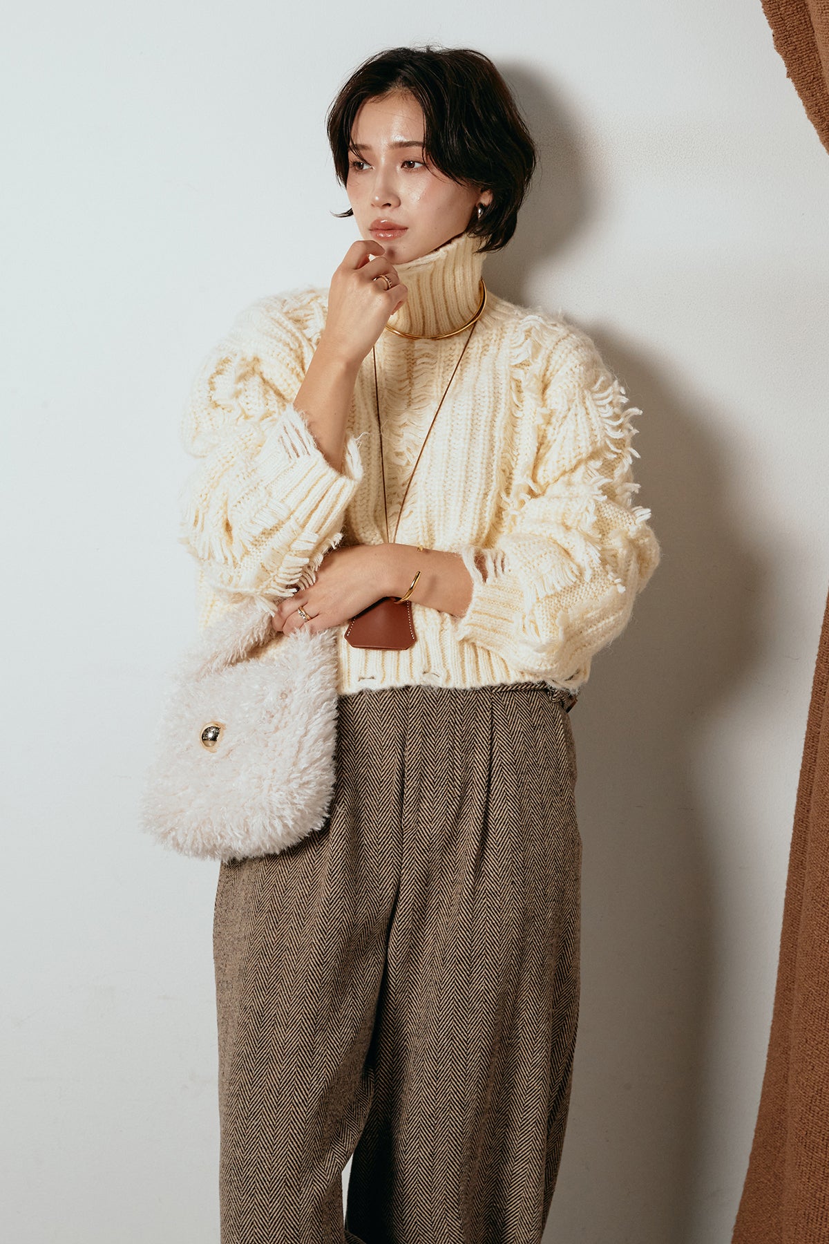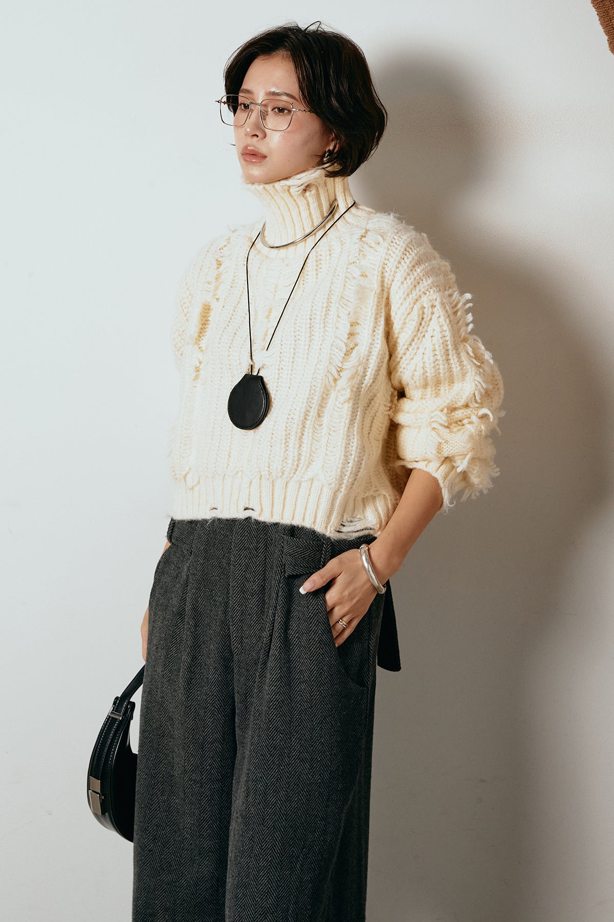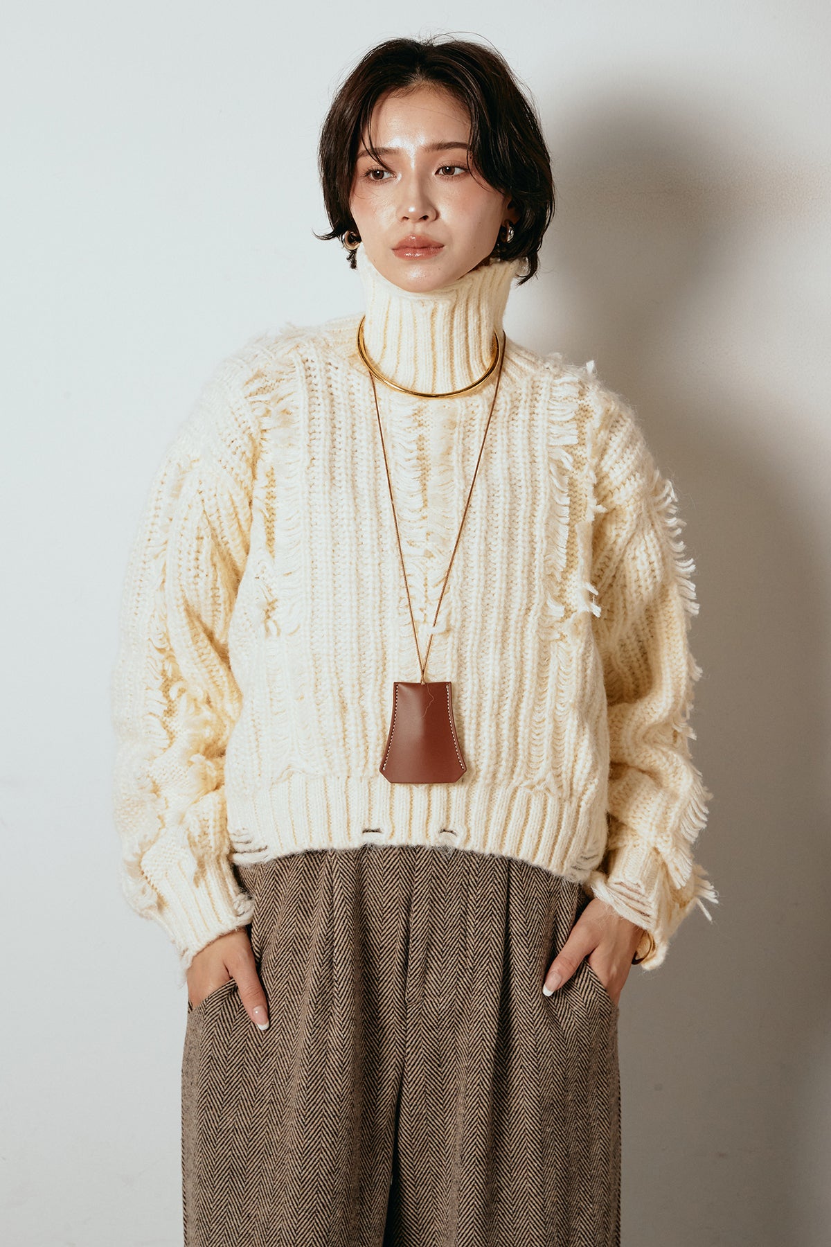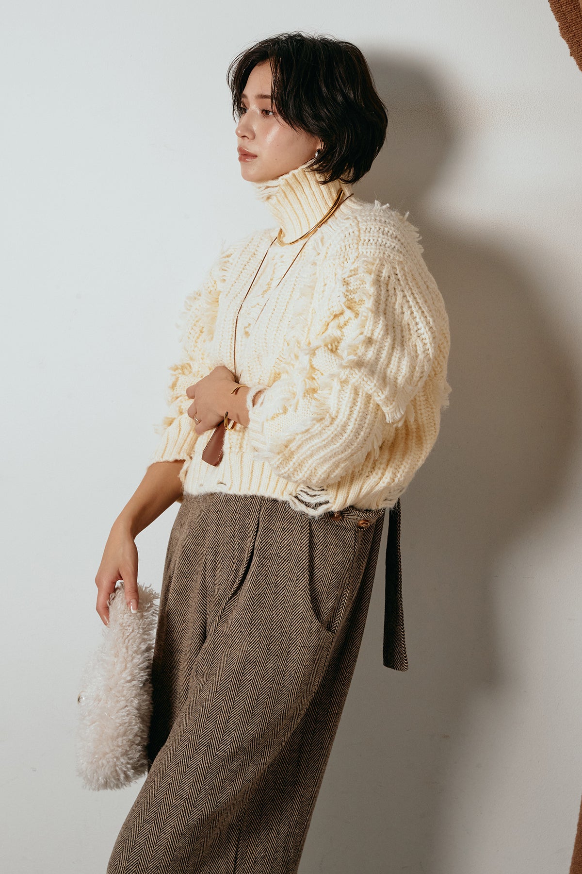 立体感のあるフリンジが印象的なタートルショートニット。