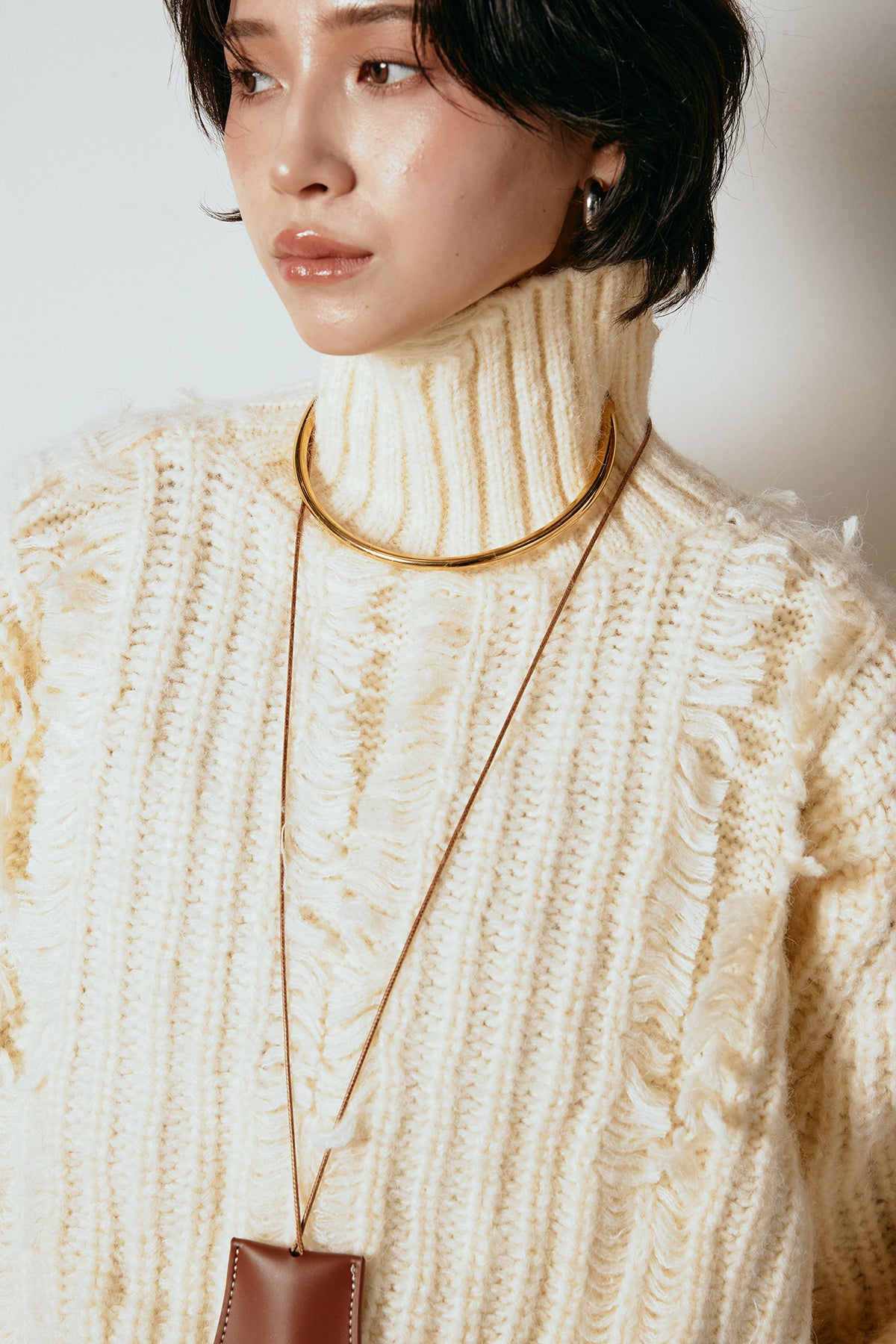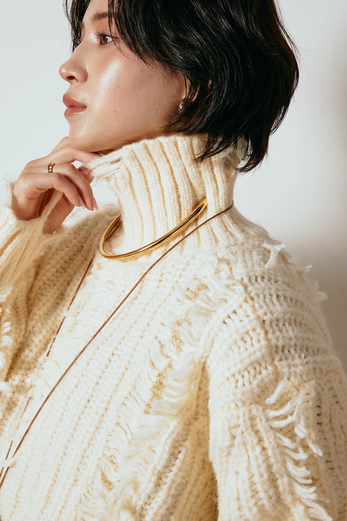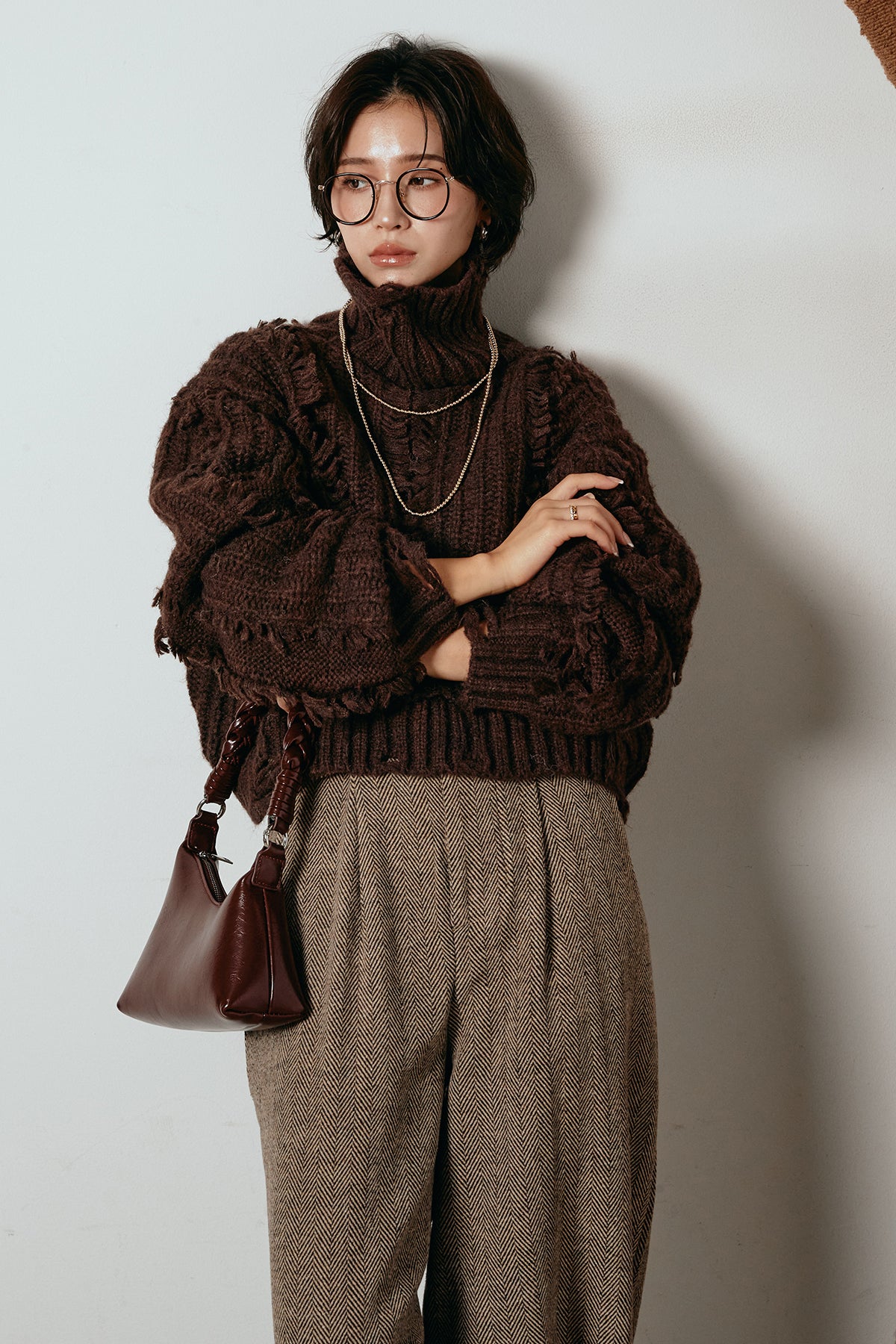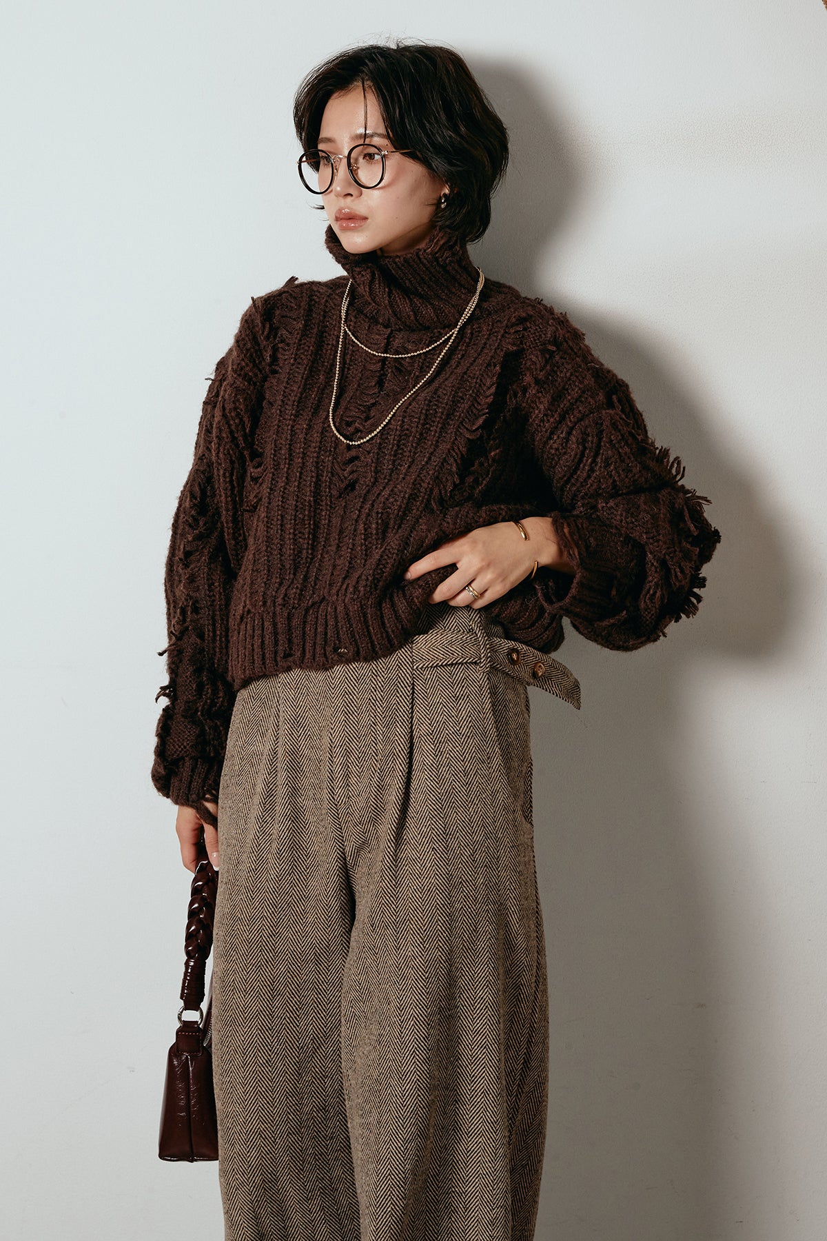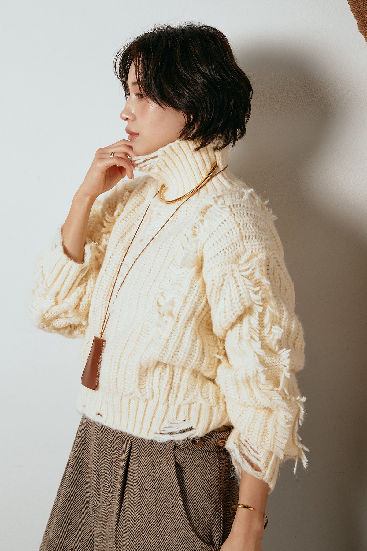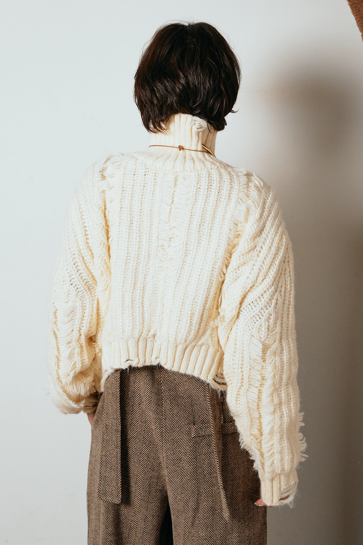 立体感のあるフリンジが印象的なタートルショートニット。