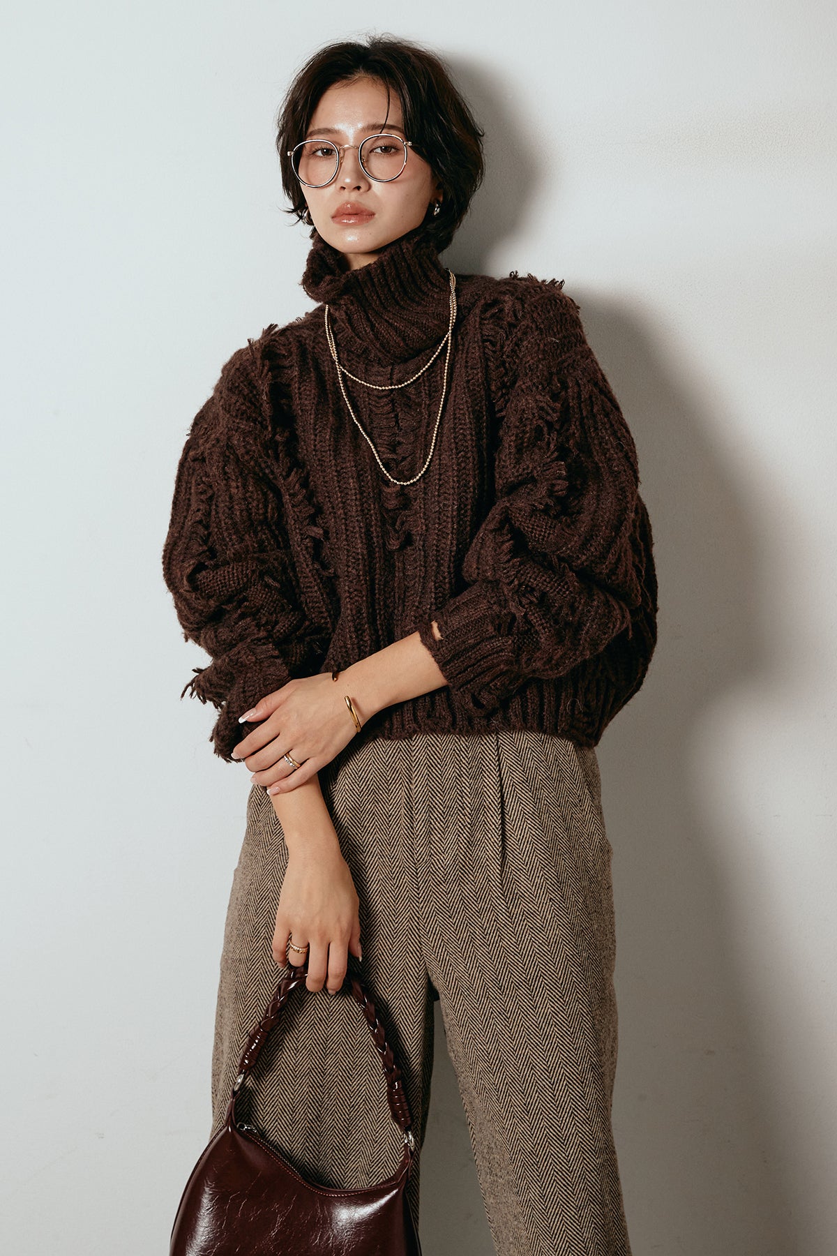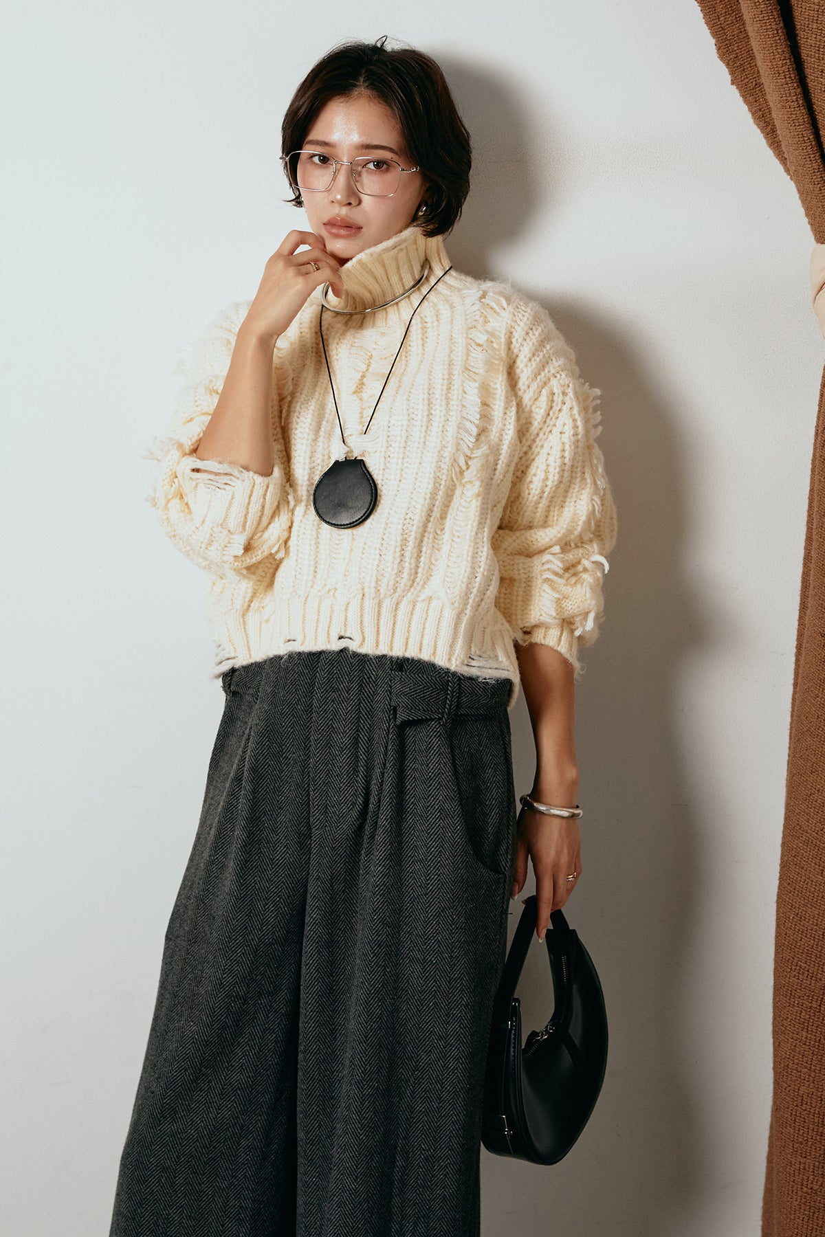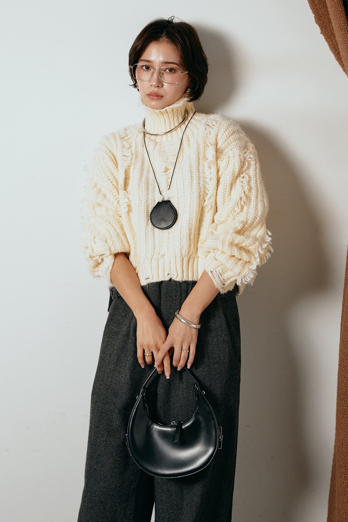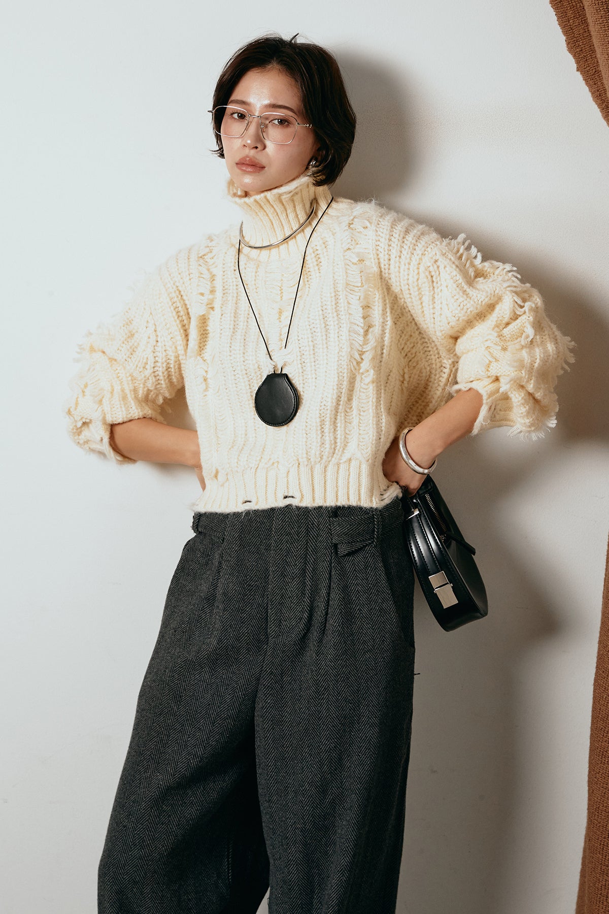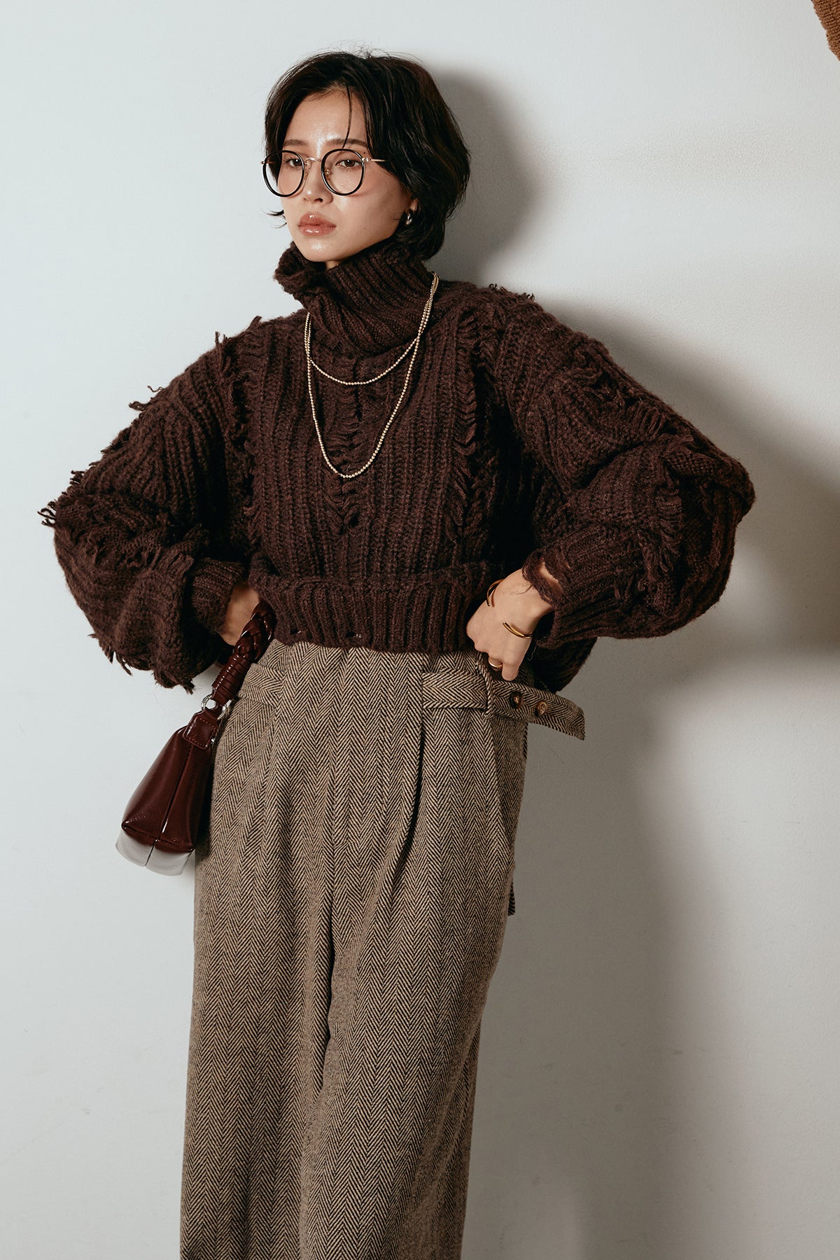 立体感のあるフリンジが印象的なタートルショートニット。