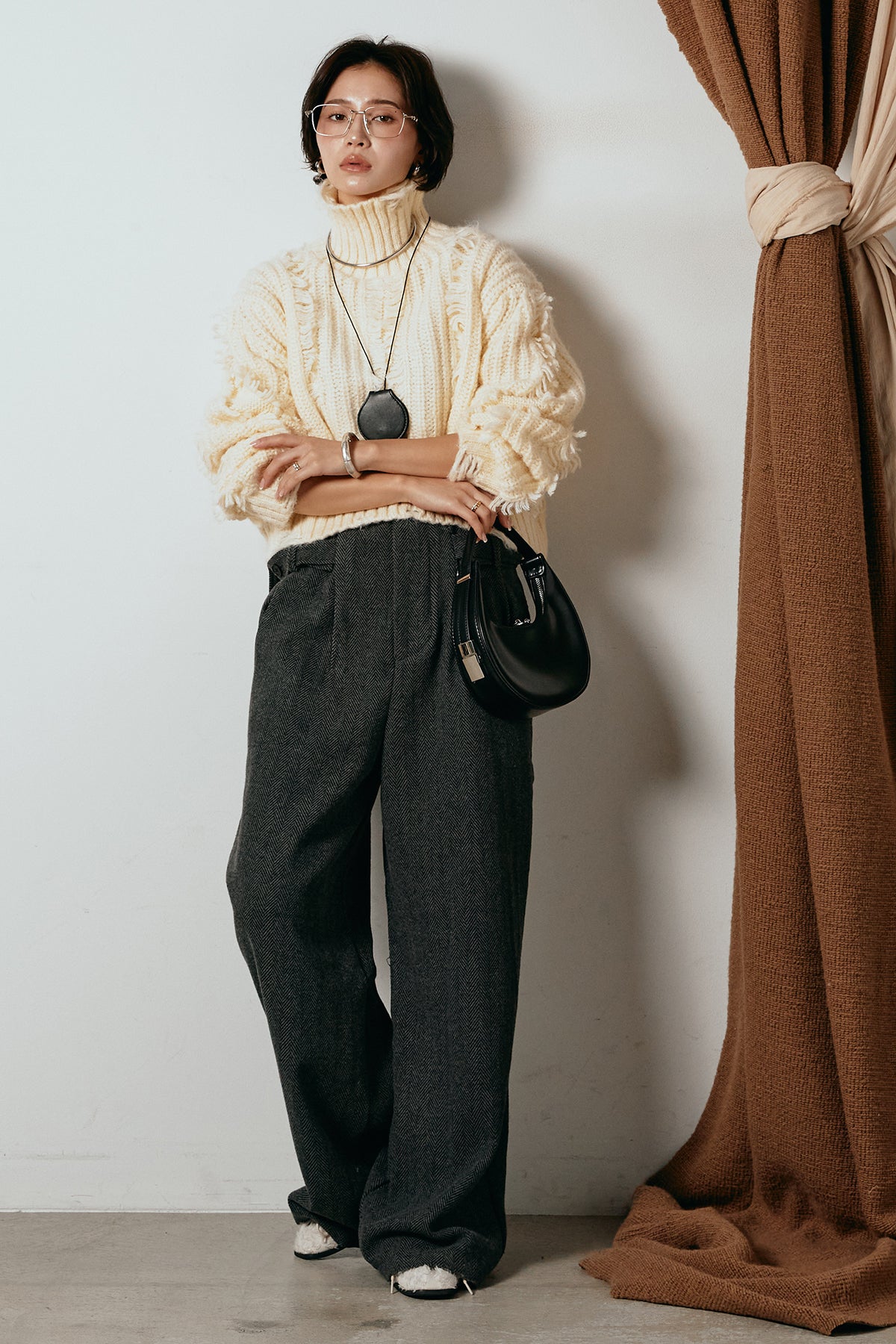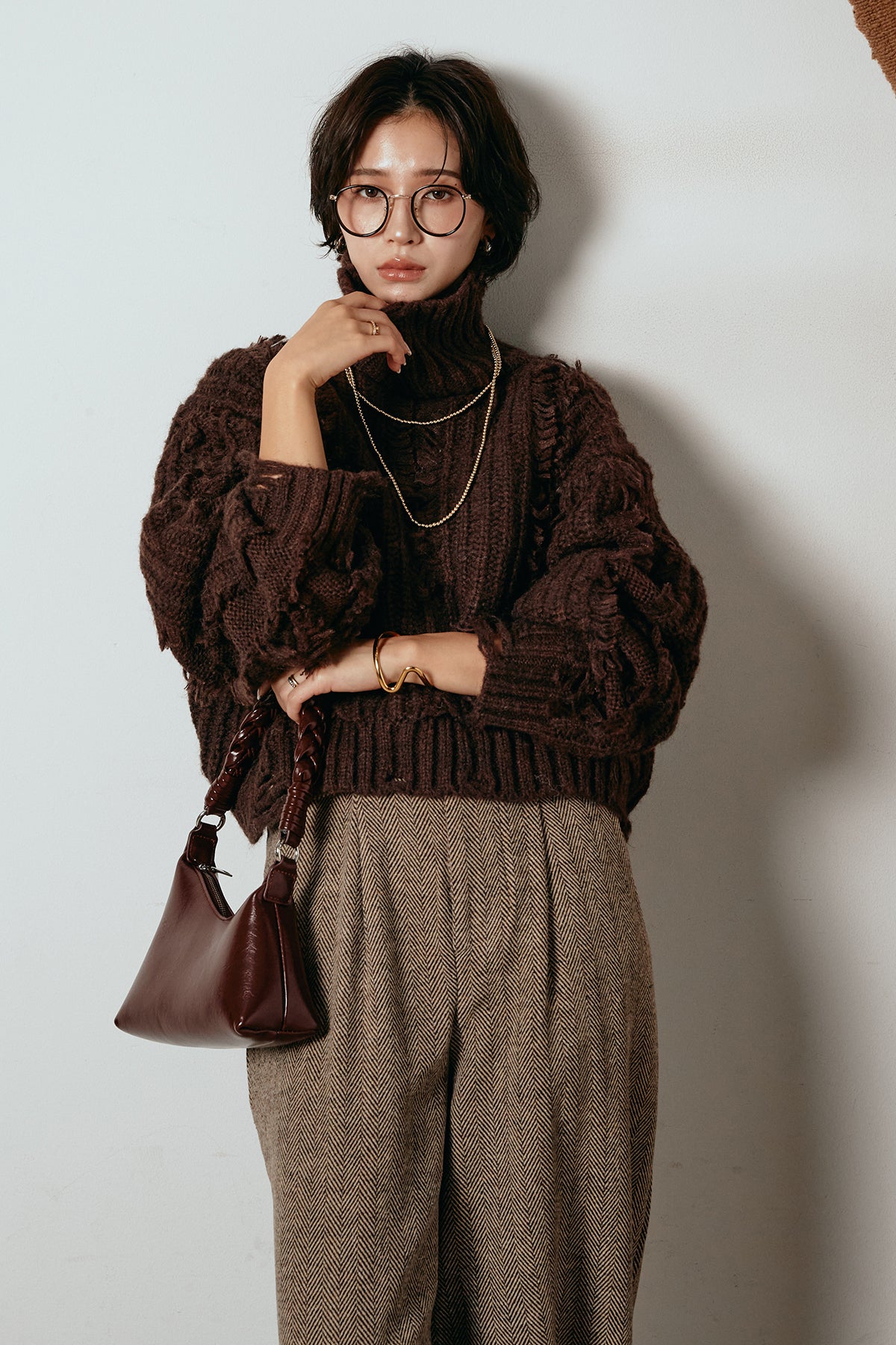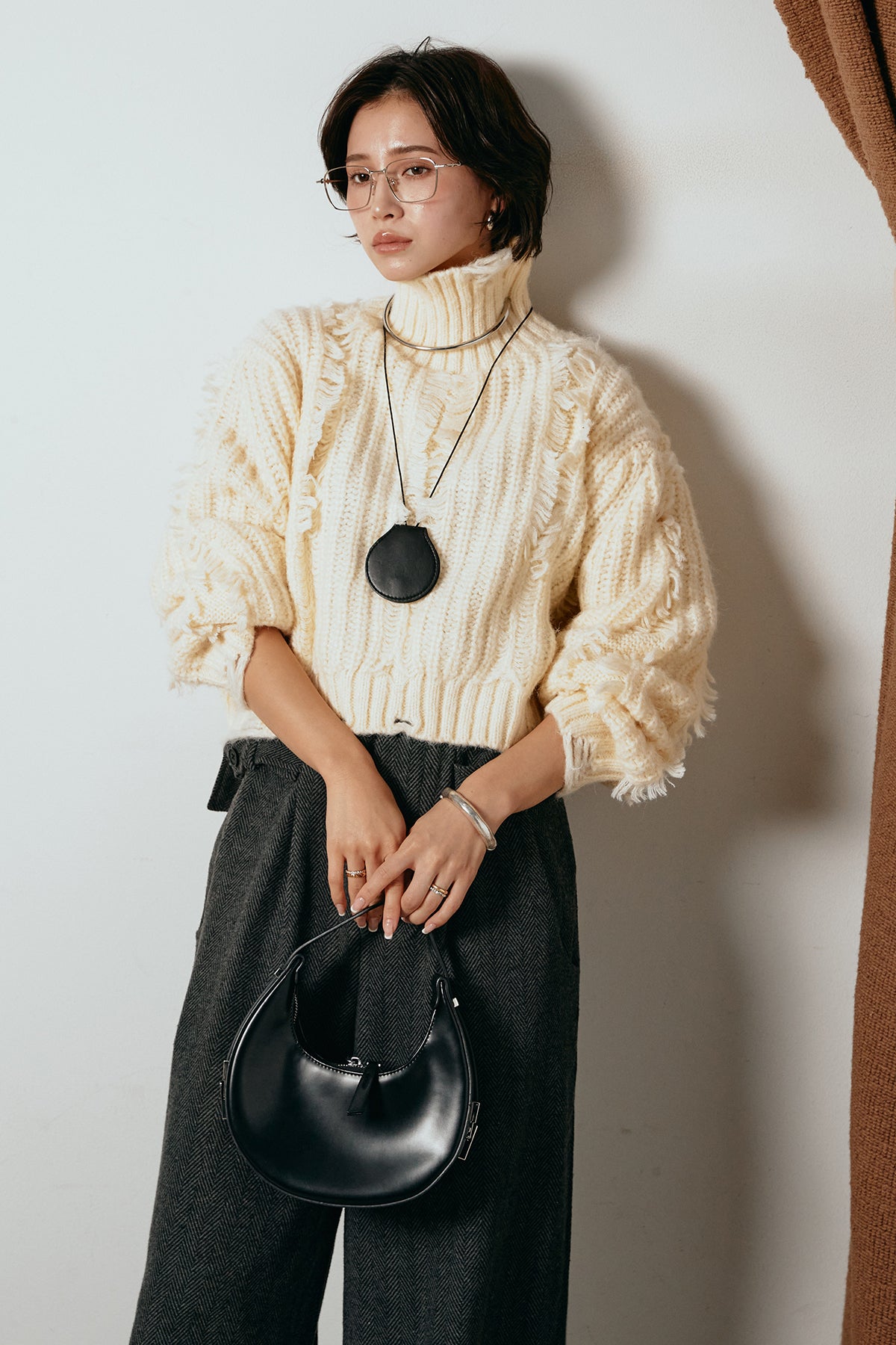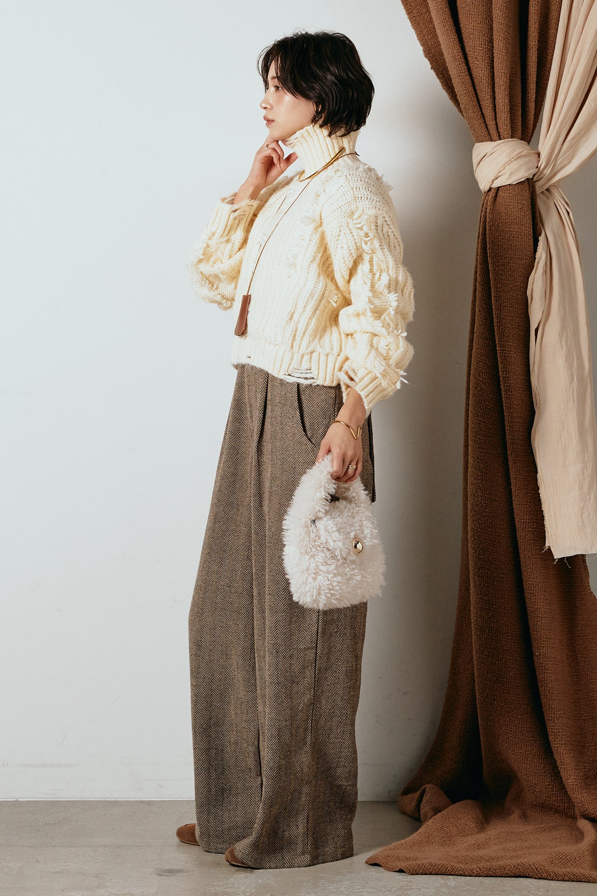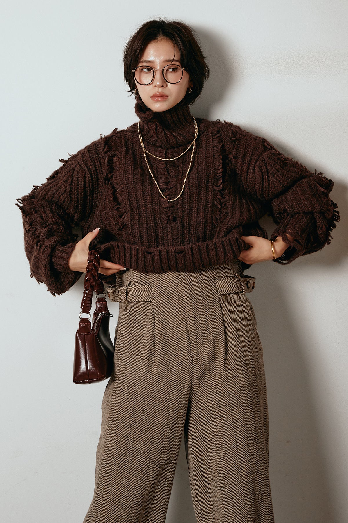 立体感のあるフリンジが印象的なタートルショートニット。
