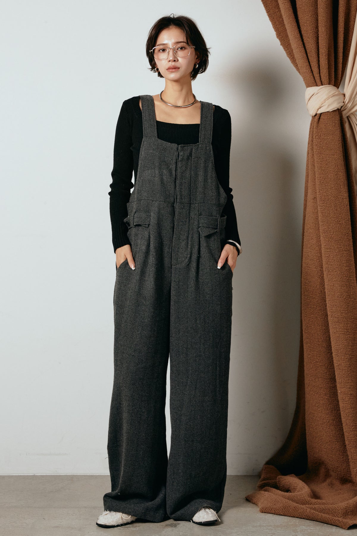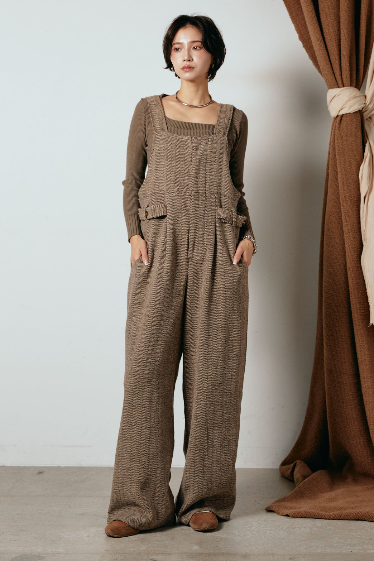 ヘリンボーン柄が印象的なサロペット。