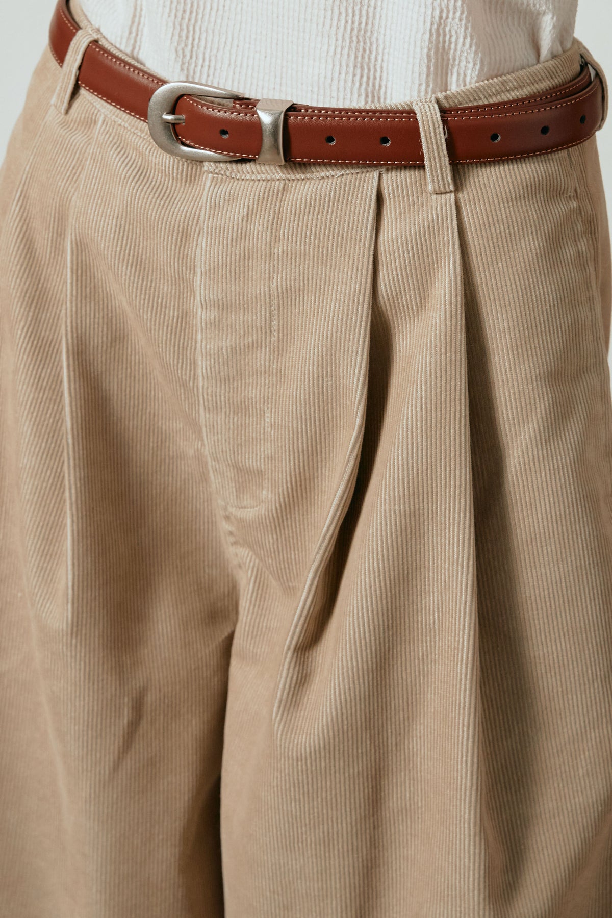 温かみのあるコーデュロイ素材を使用したフロントタックパンツ。程よくゆとりを持たせたワイドシルエットが体型を拾わず、リラクシーな印象に仕上げます。フロントのタックディテールが立体感を生み、脚長効果も◎。トップスをインしてウエストベルトをアクセントにする着こなしもおすすめ。秋冬らしい素材感で、カジュアルからきれいめまで幅広く活躍する一本です。