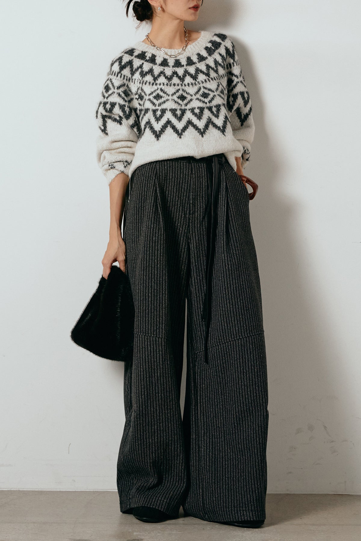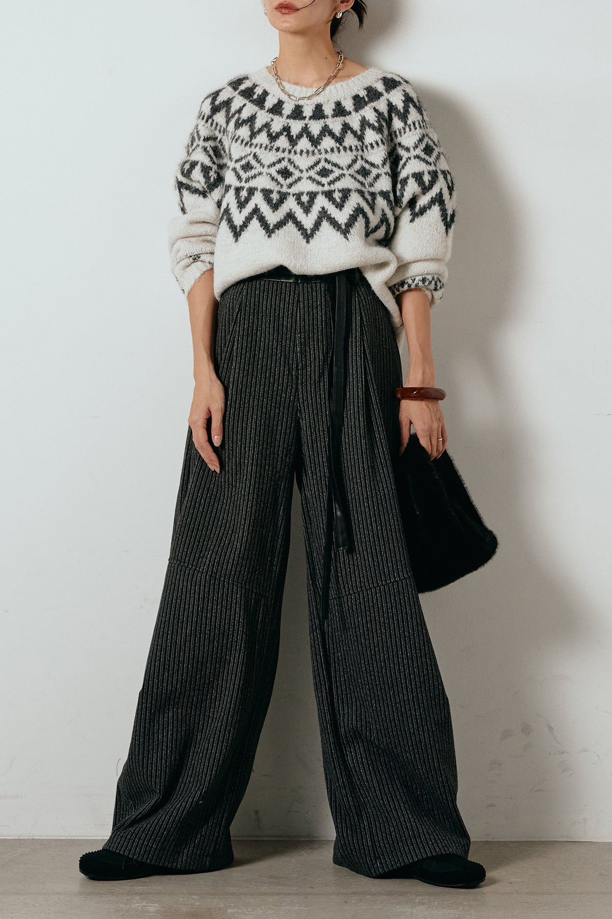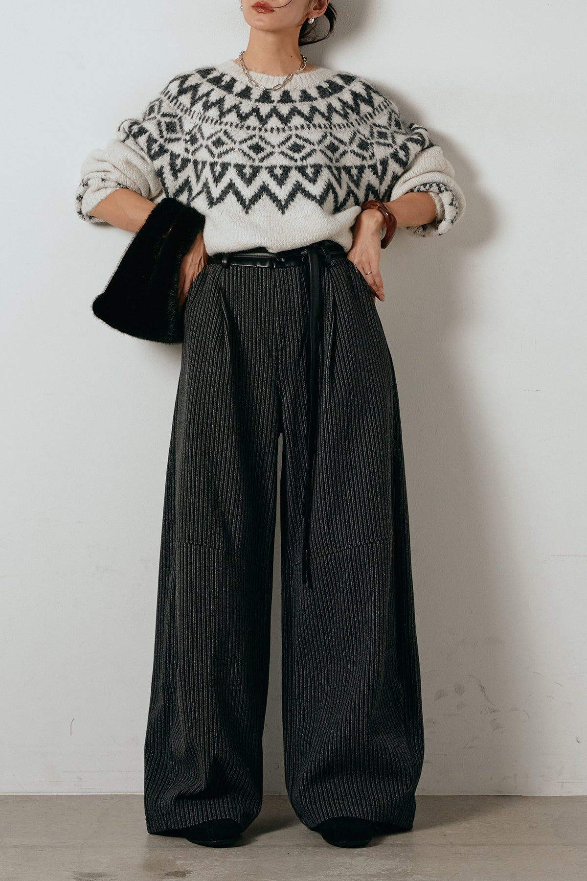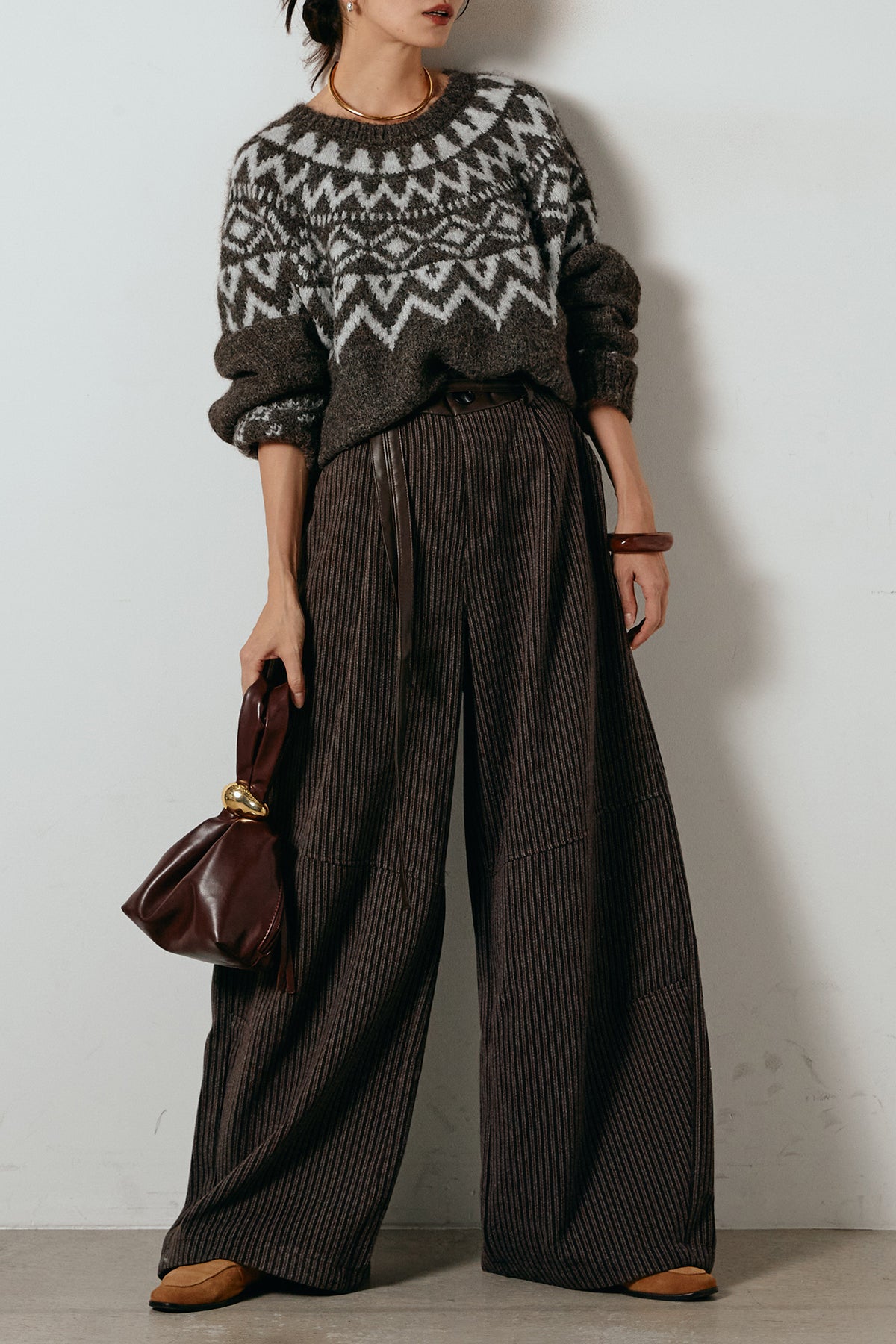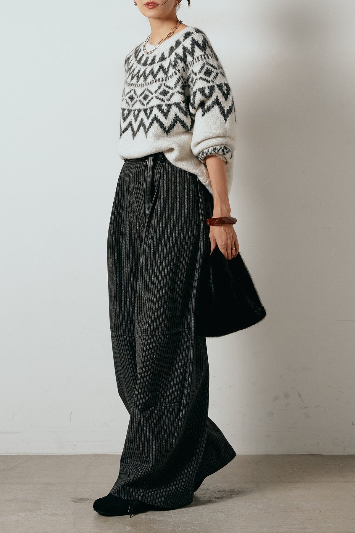 縦ラインを強調する細かなストライプがすっきり見えを叶え、ワイドシルエットでもバランスよく着られます。