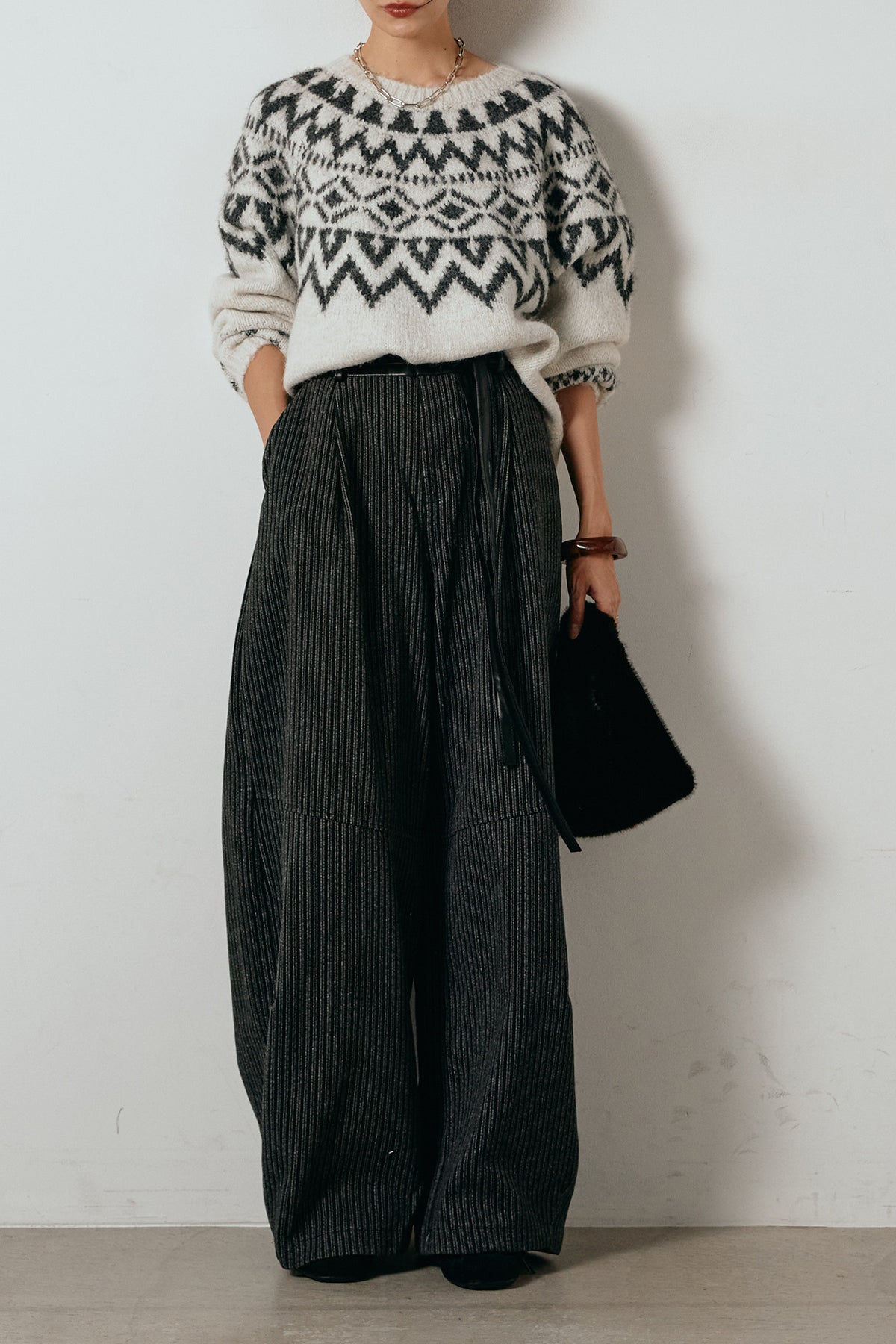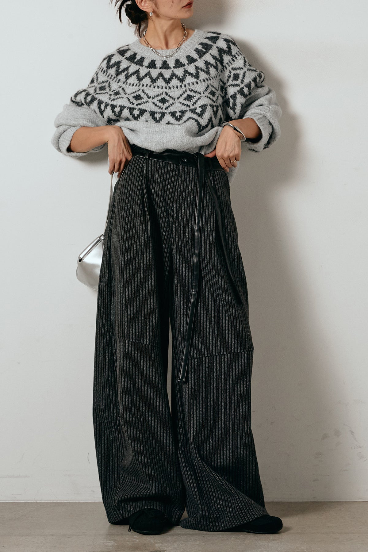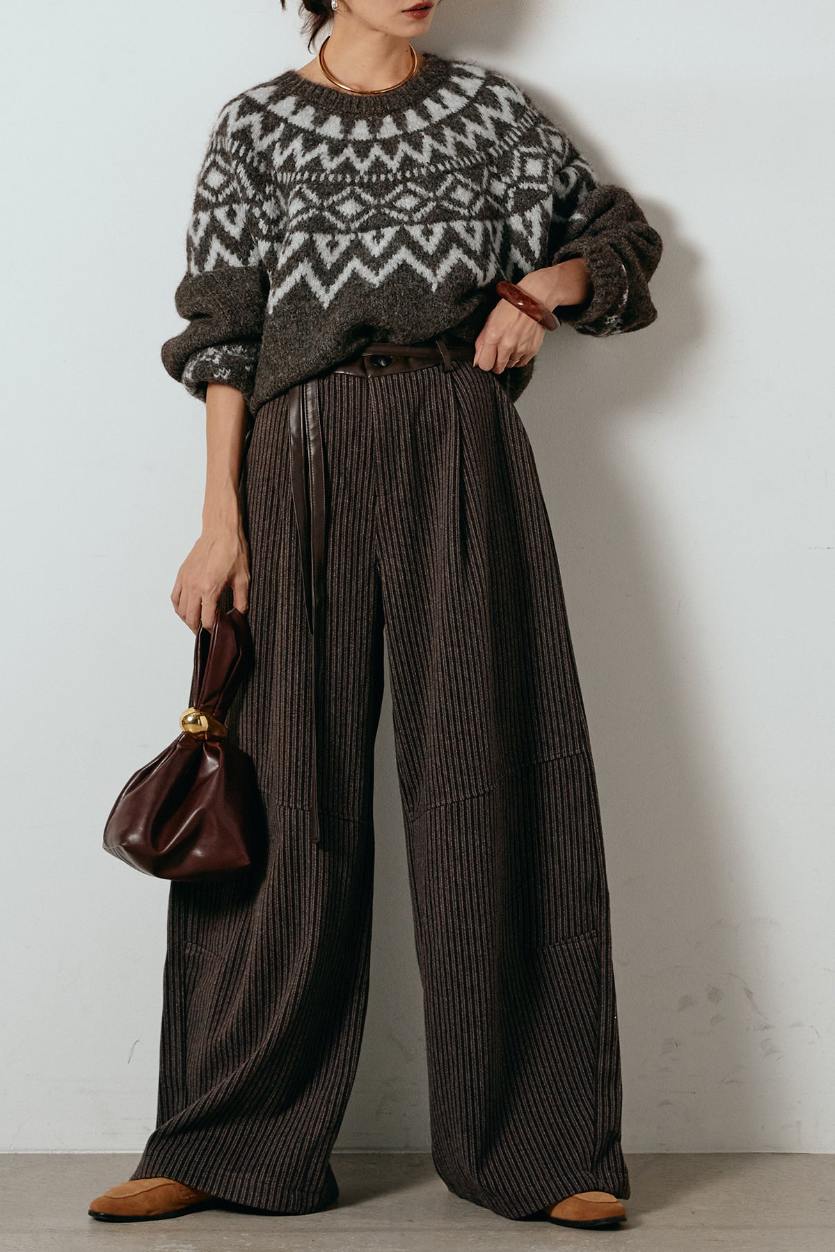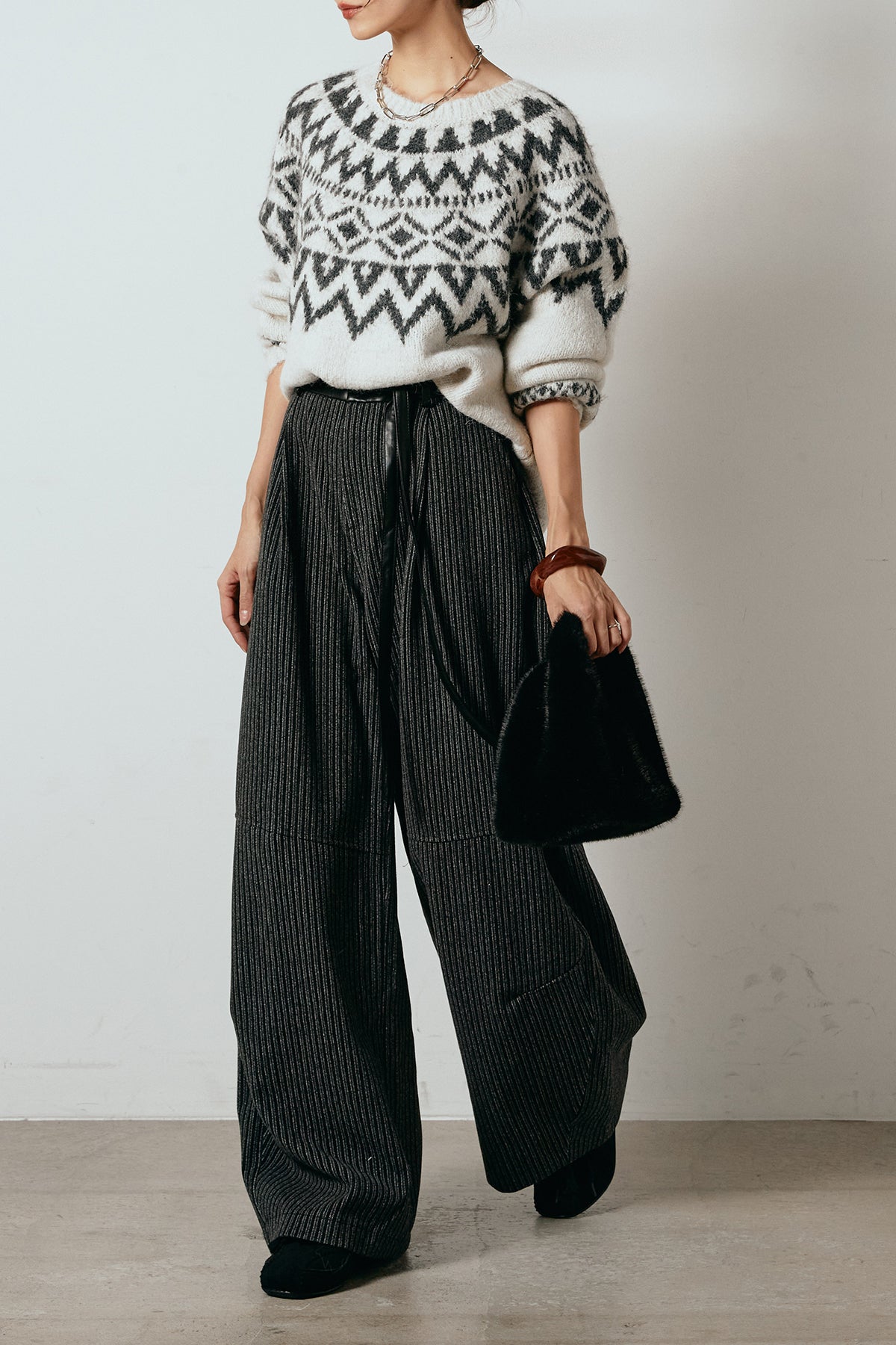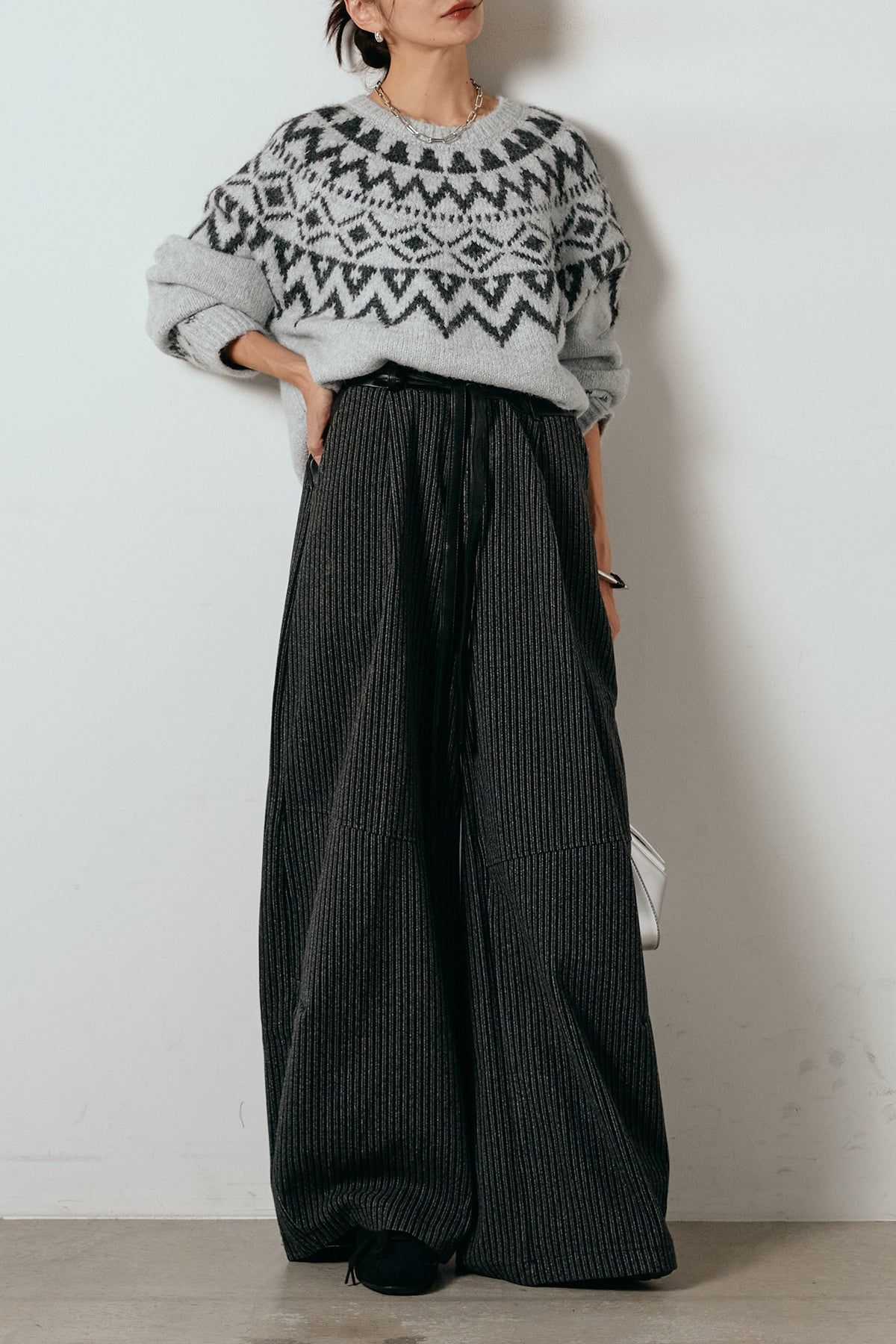 縦ラインを強調する細かなストライプがすっきり見えを叶え、ワイドシルエットでもバランスよく着られます。