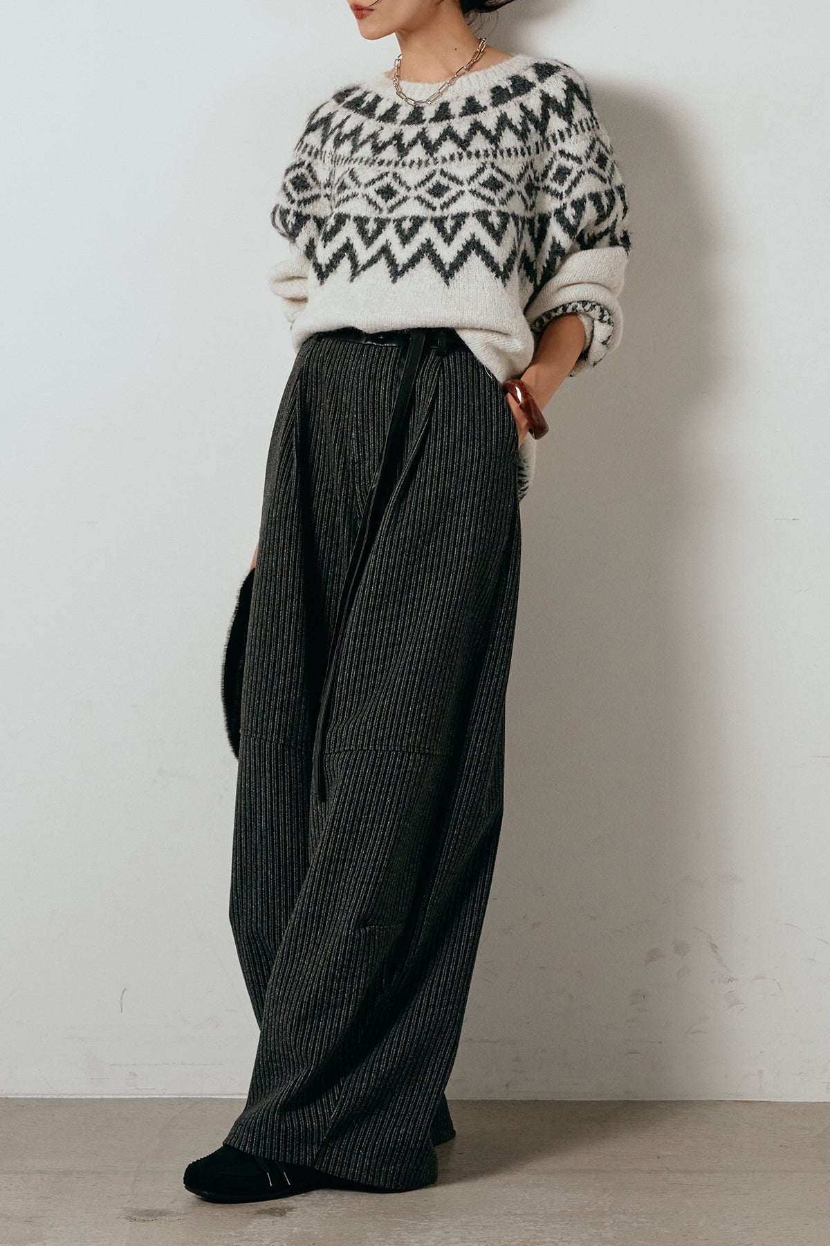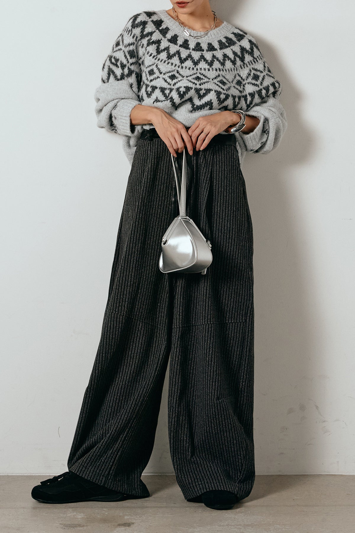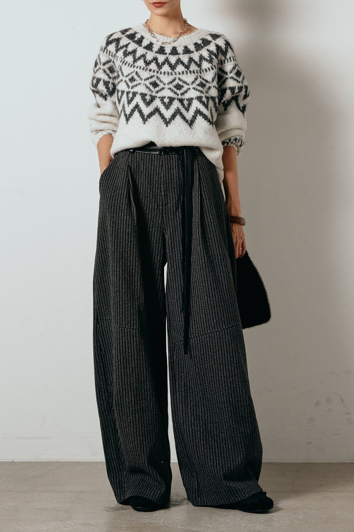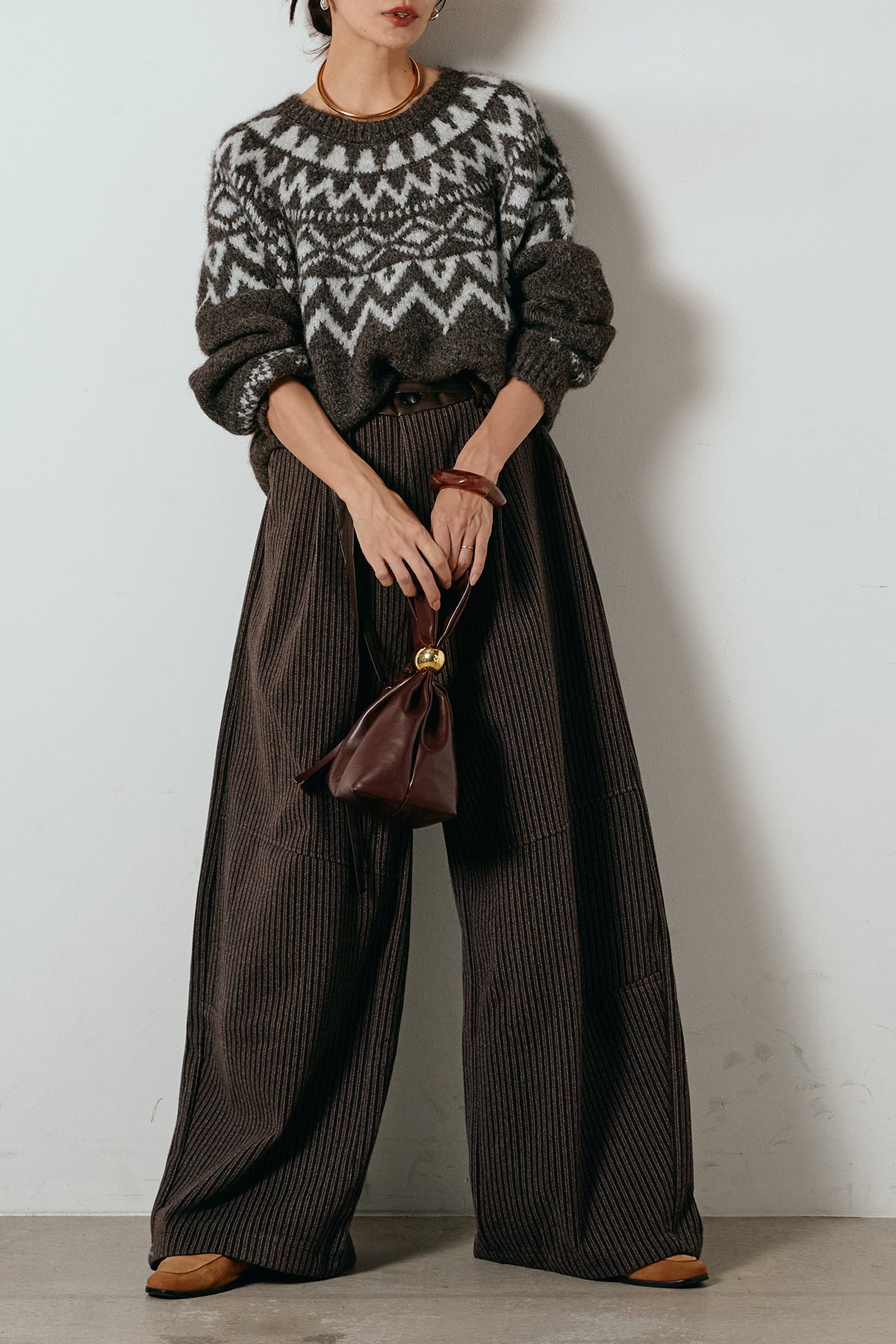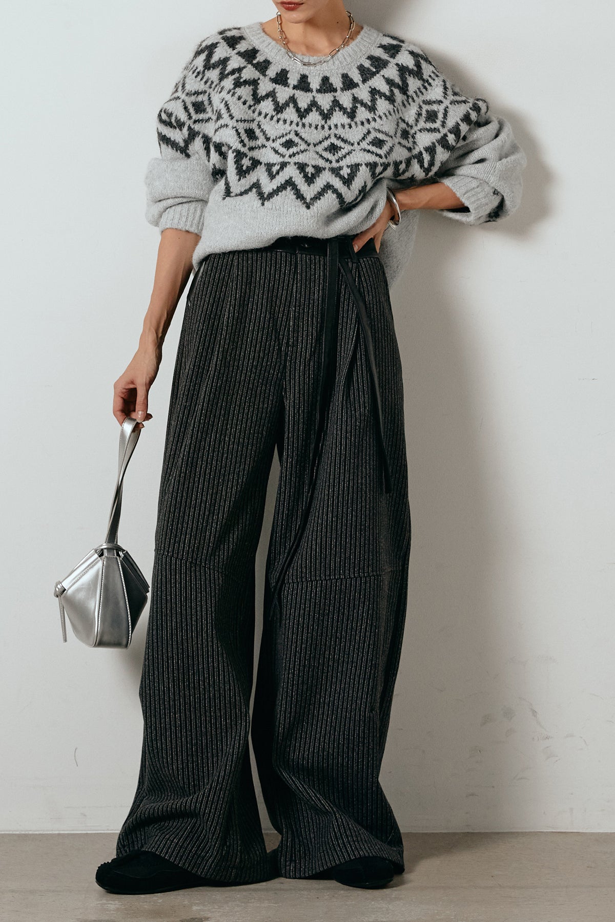 縦ラインを強調する細かなストライプがすっきり見えを叶え、ワイドシルエットでもバランスよく着られます。