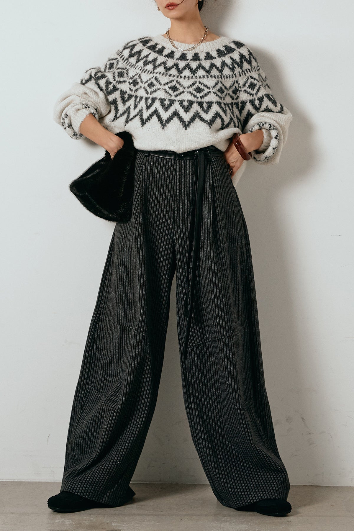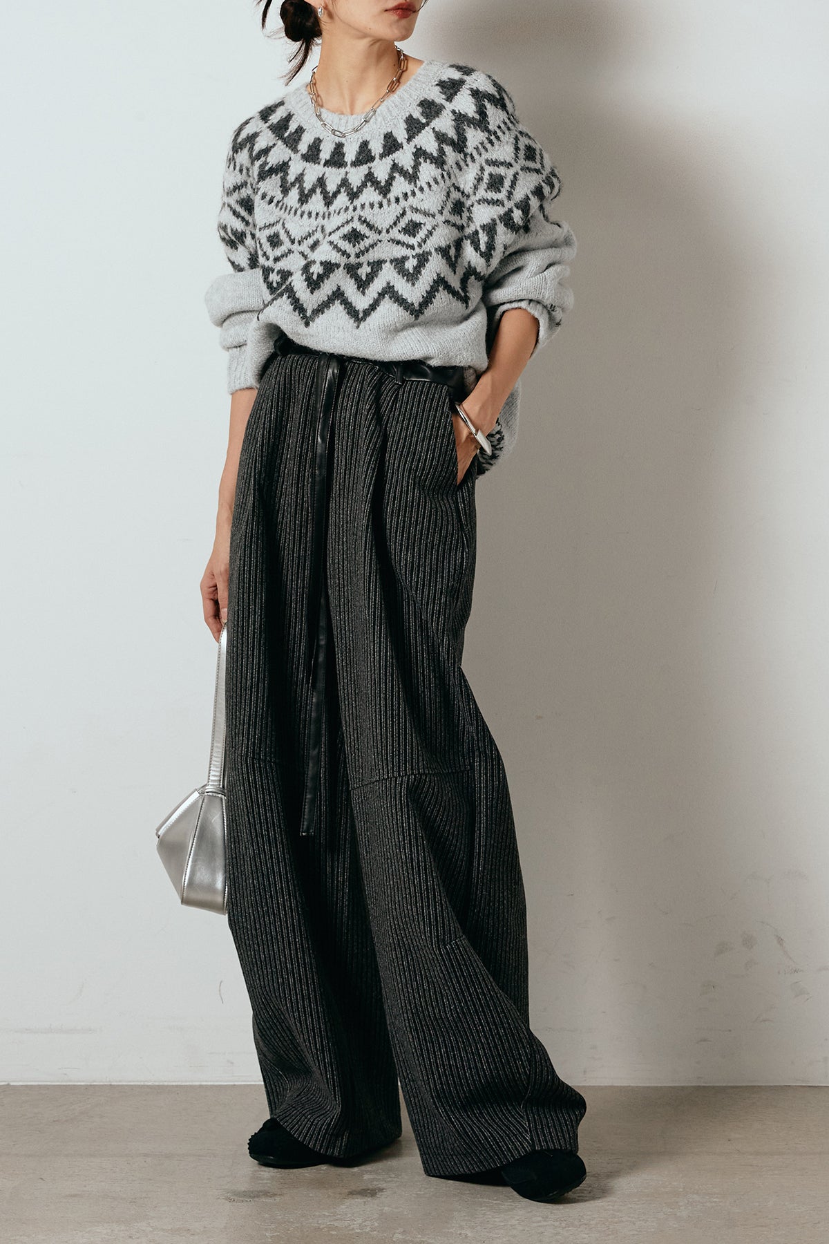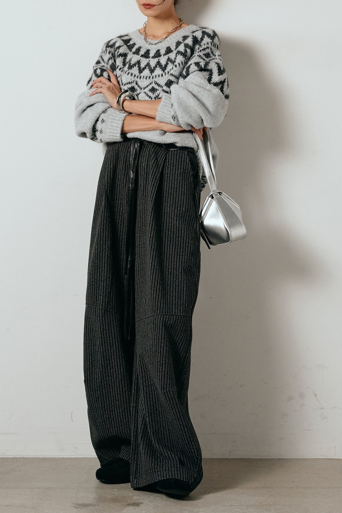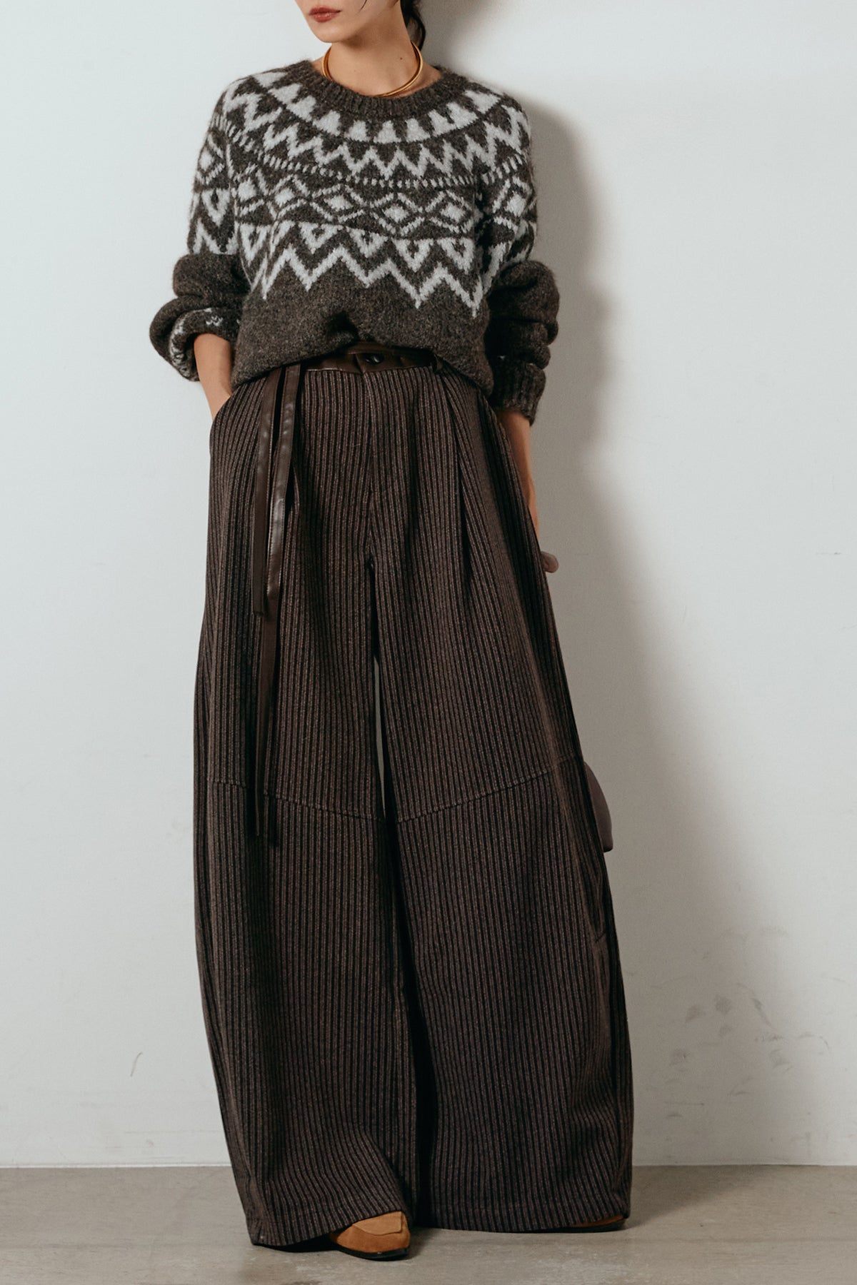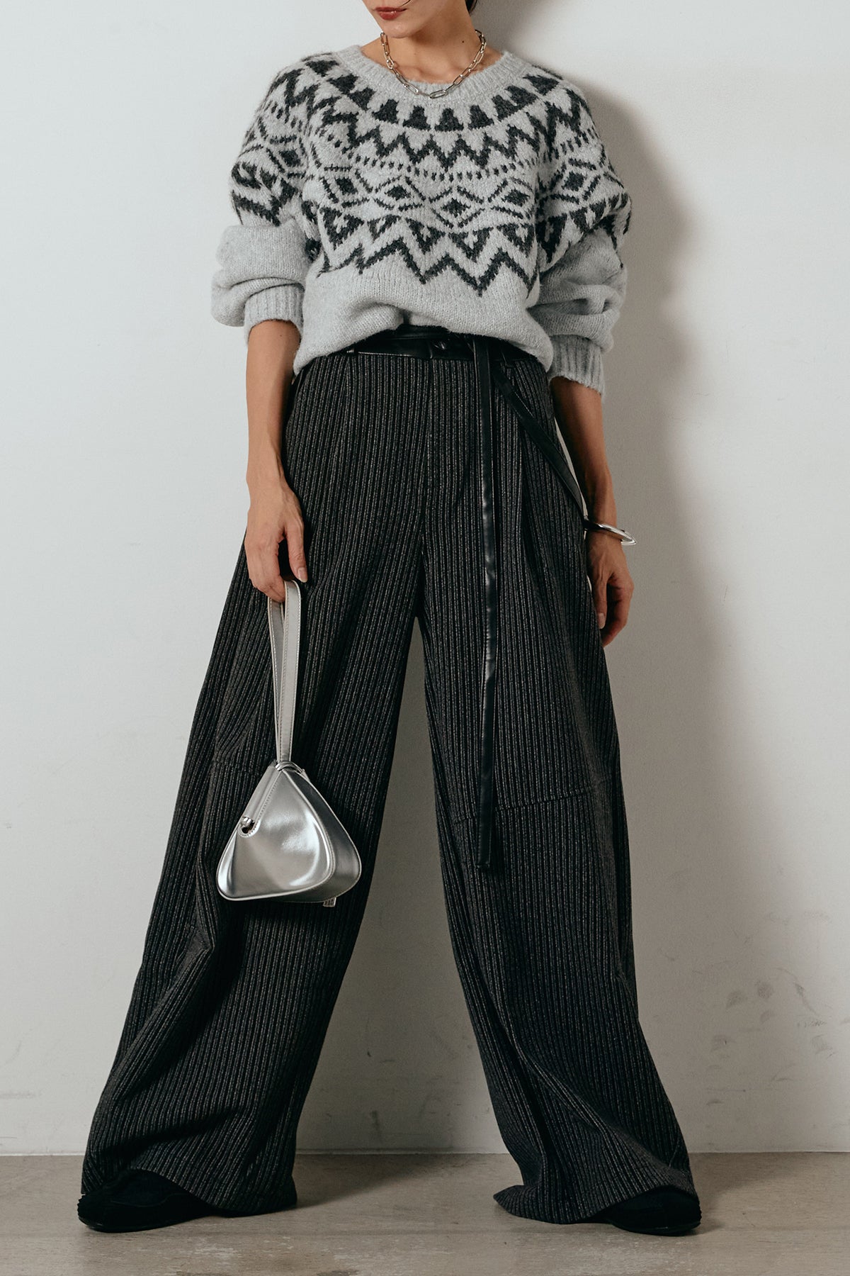 縦ラインを強調する細かなストライプがすっきり見えを叶え、ワイドシルエットでもバランスよく着られます。