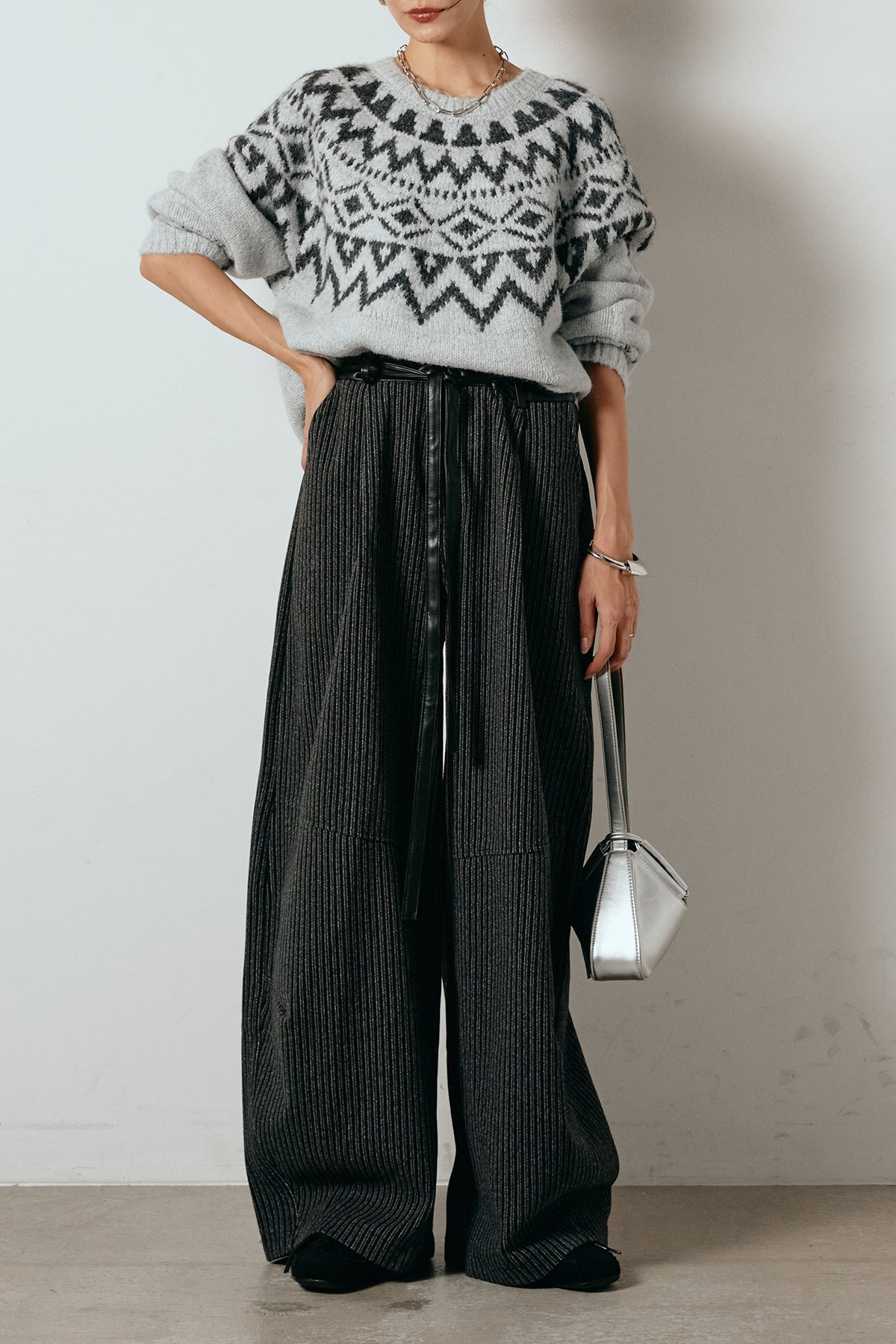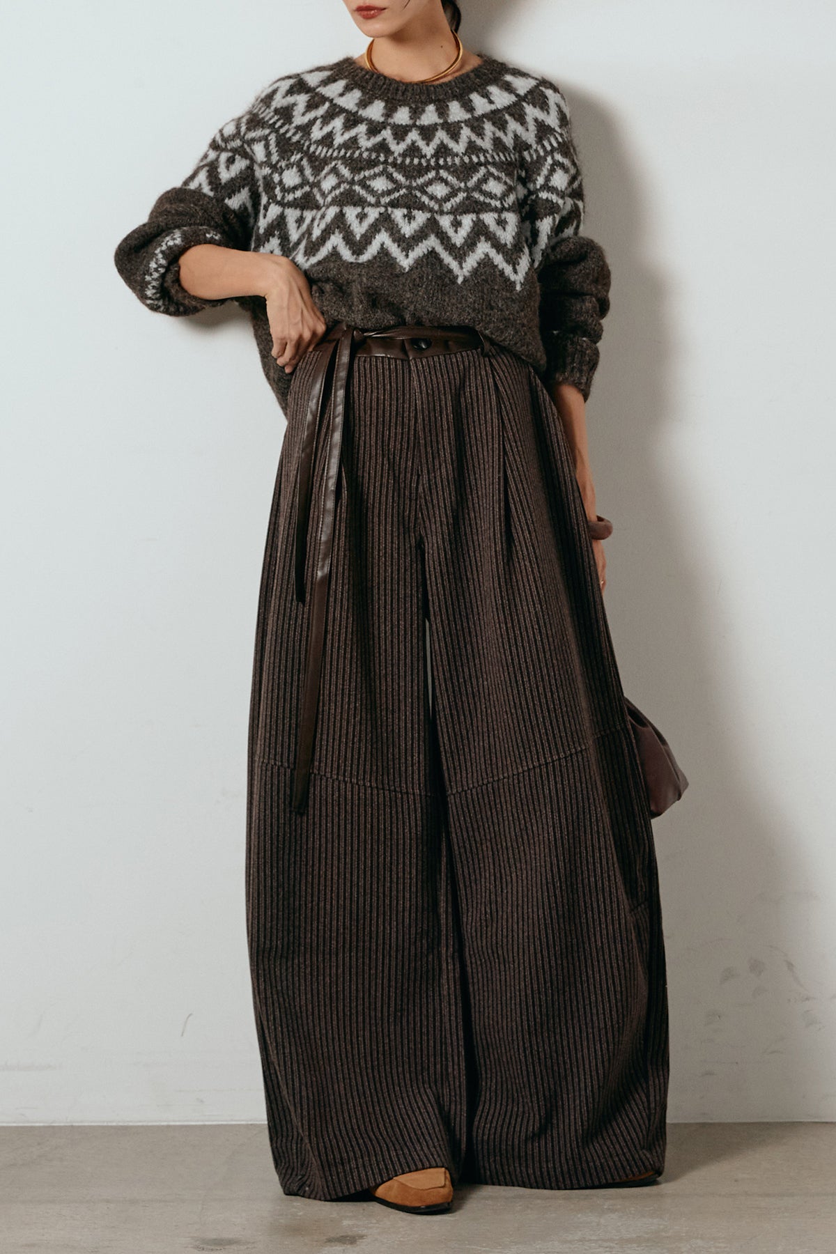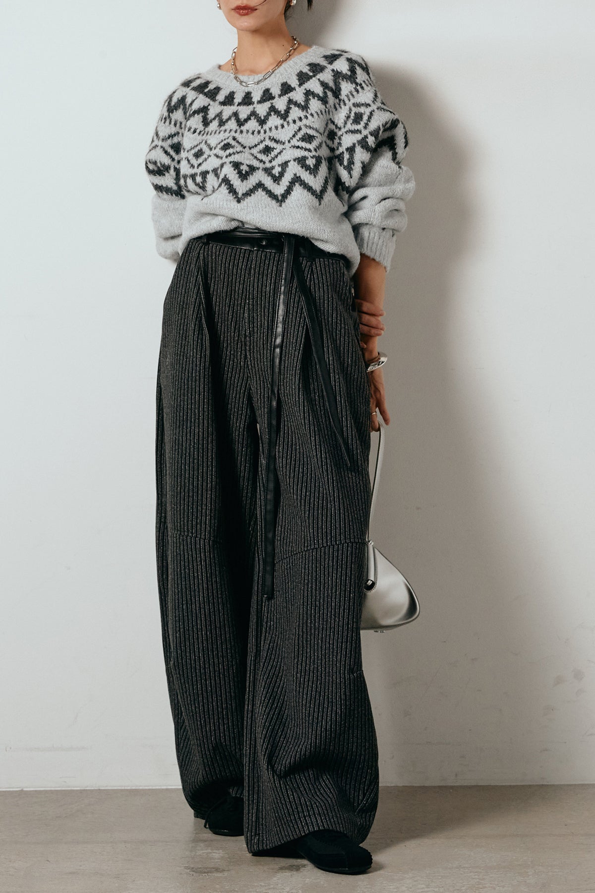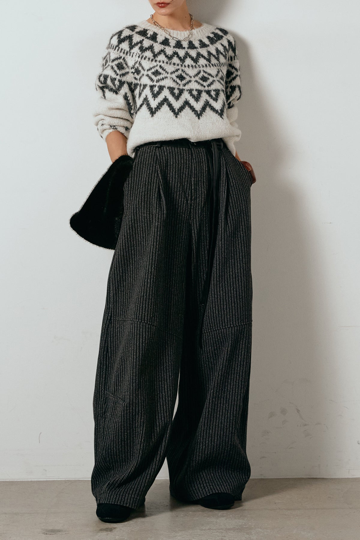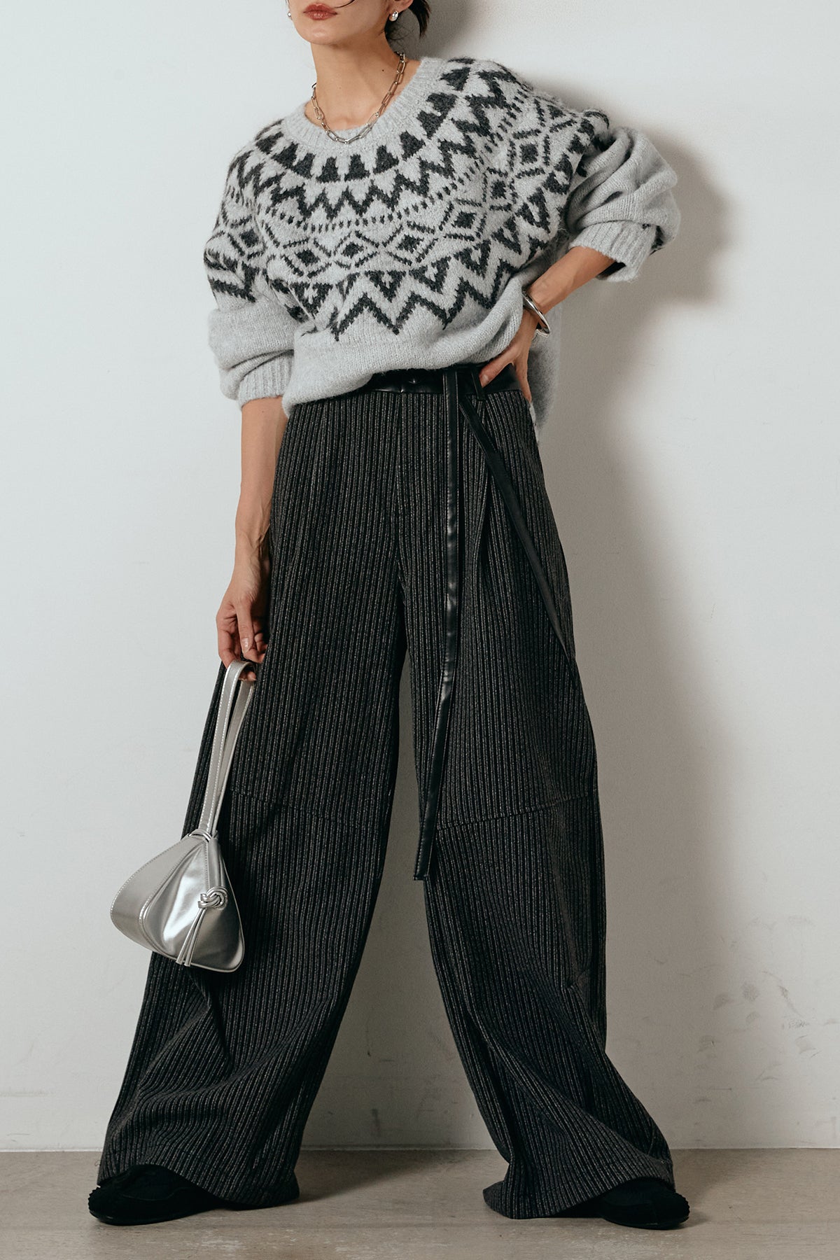 縦ラインを強調する細かなストライプがすっきり見えを叶え、ワイドシルエットでもバランスよく着られます。