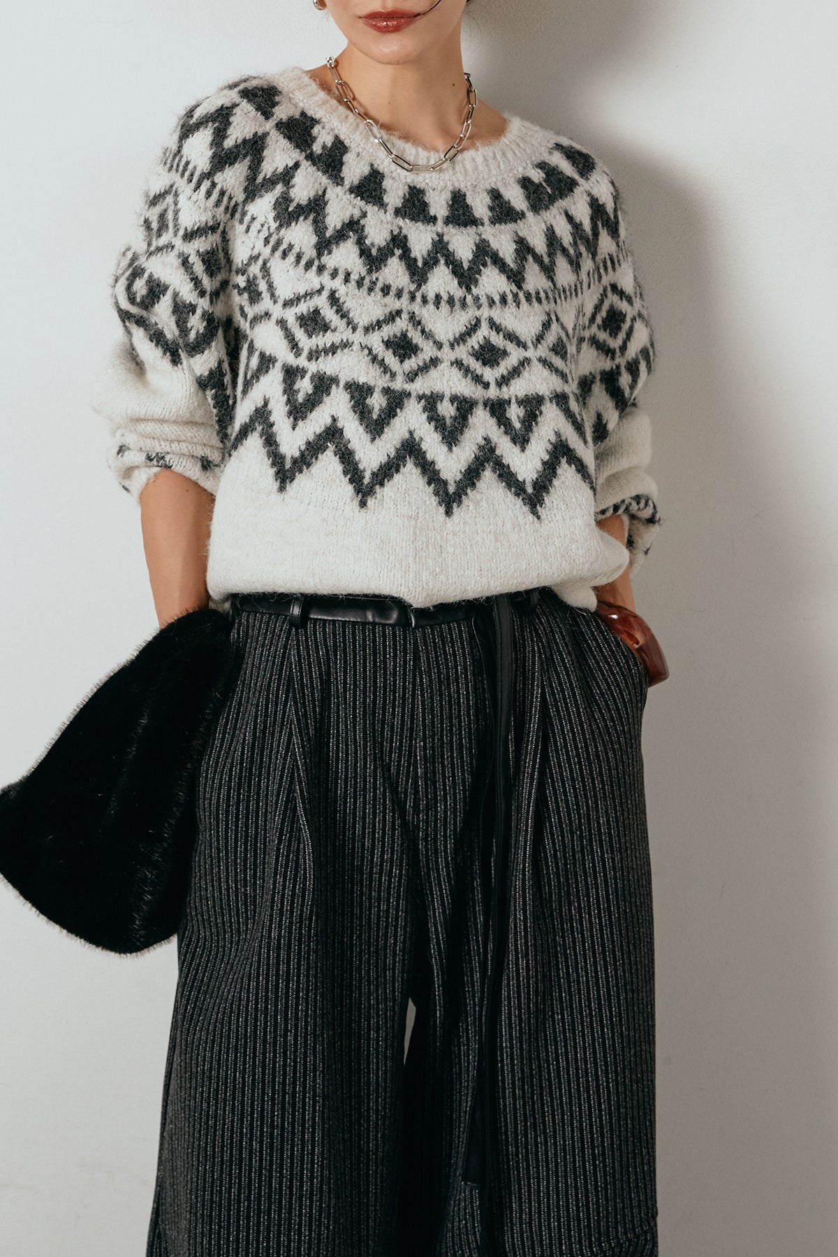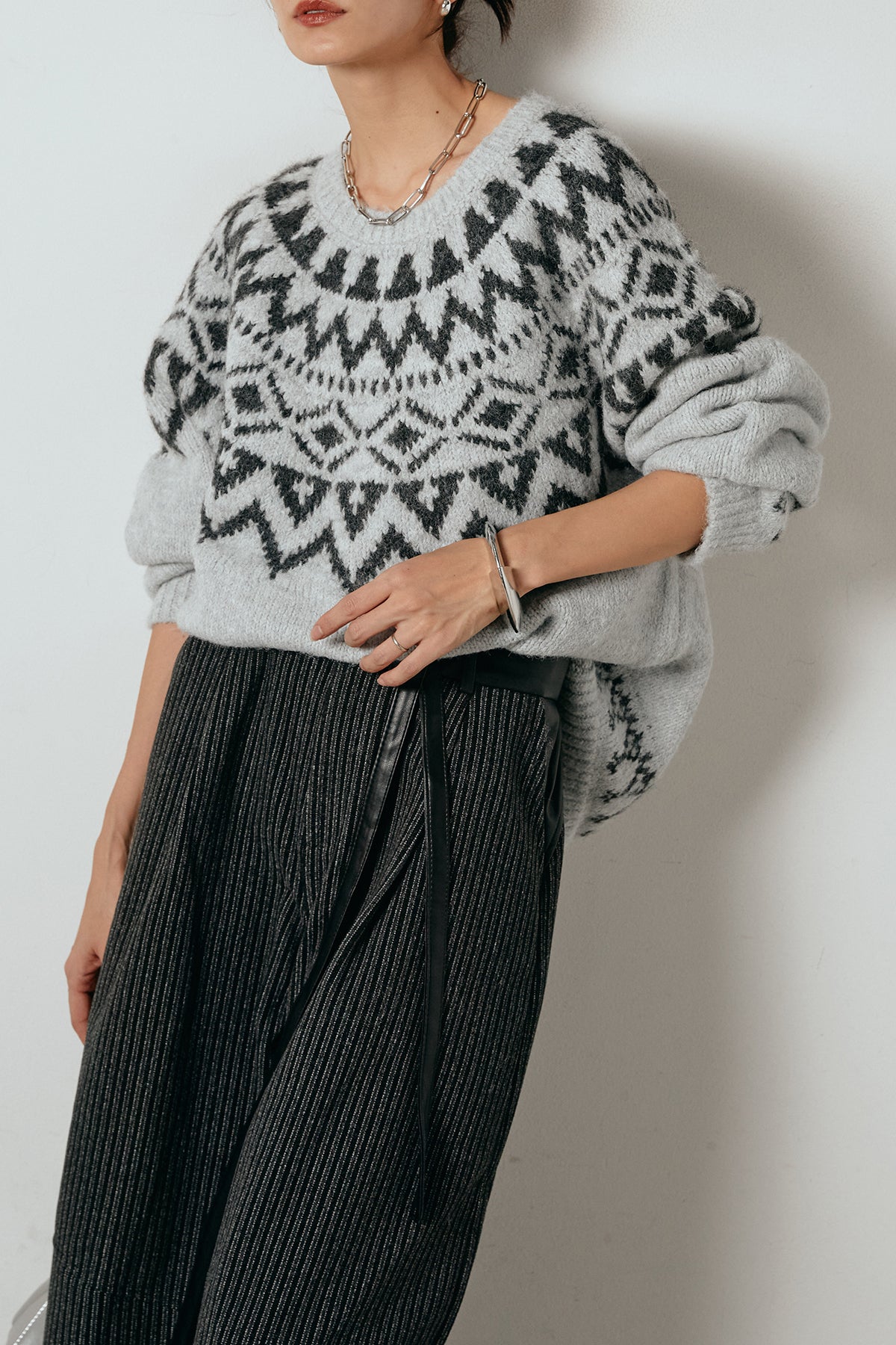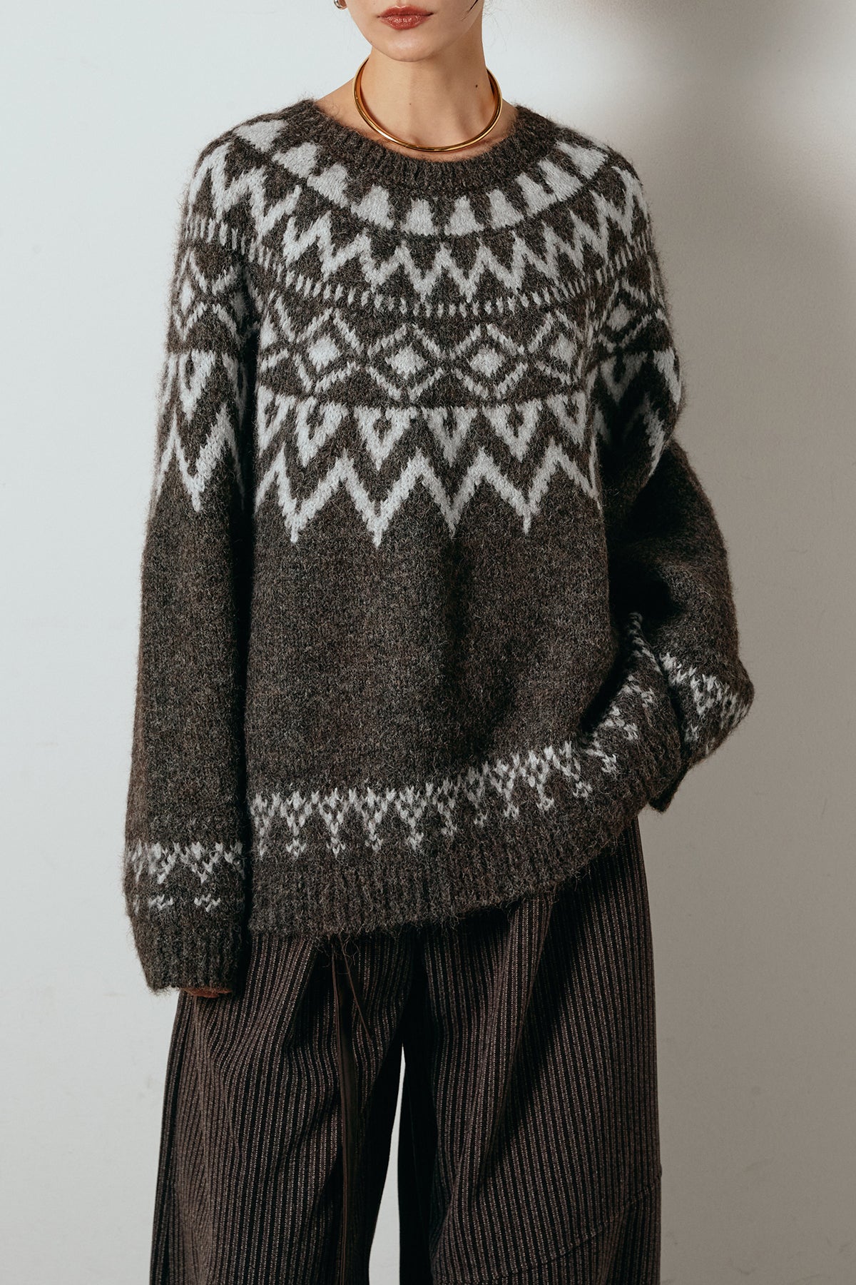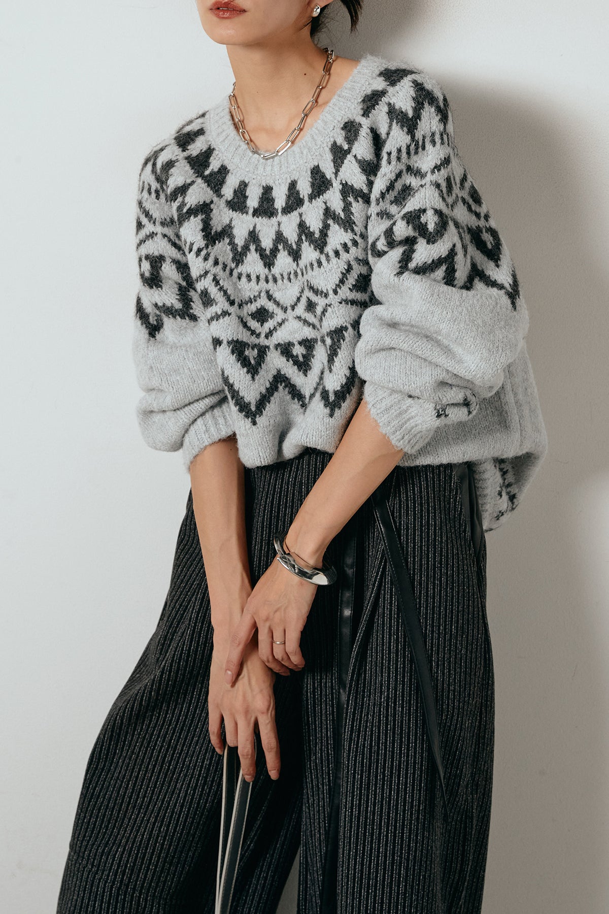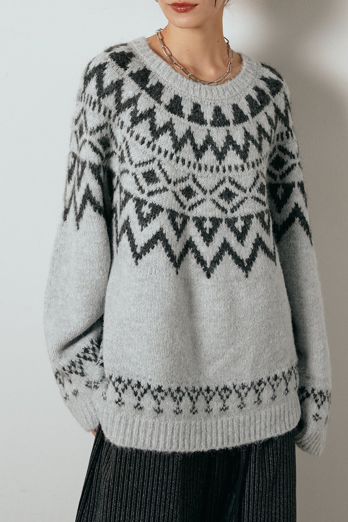 やわらかな風合いと存在感のあるノルディック柄が魅力のUネックプルオーバー。