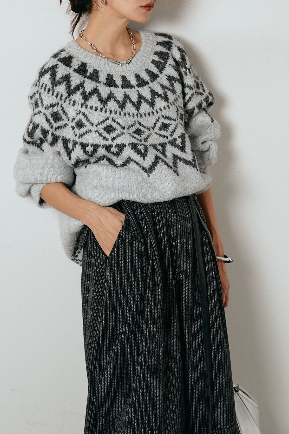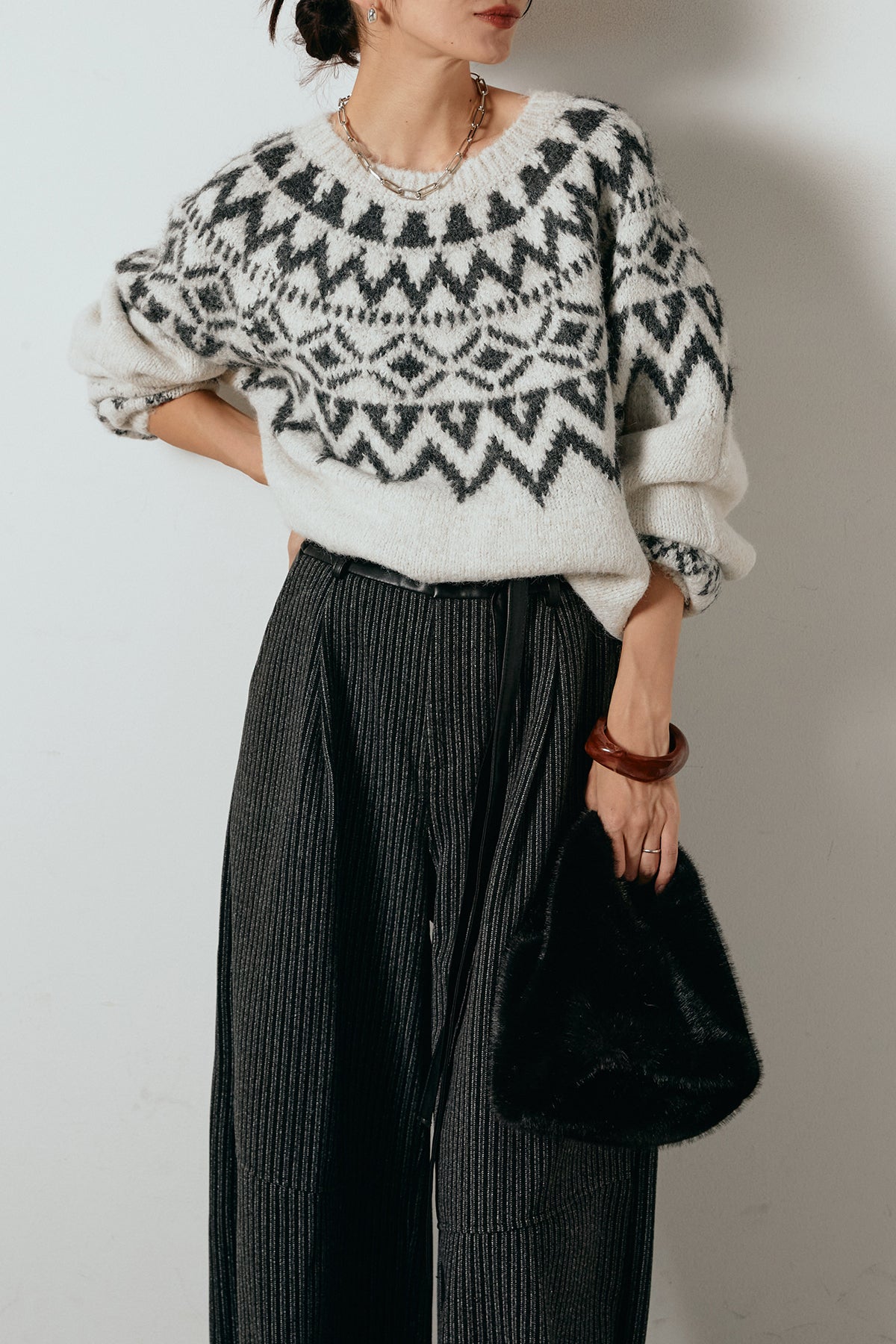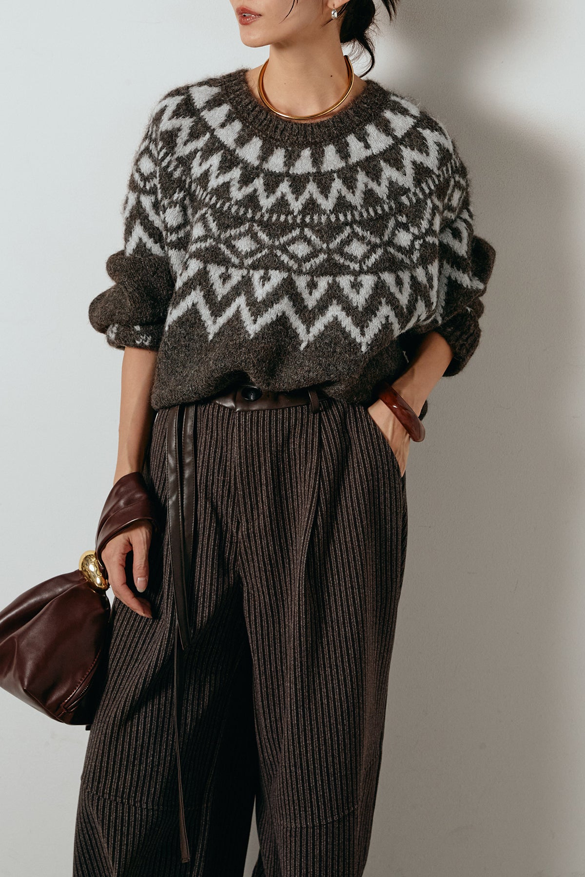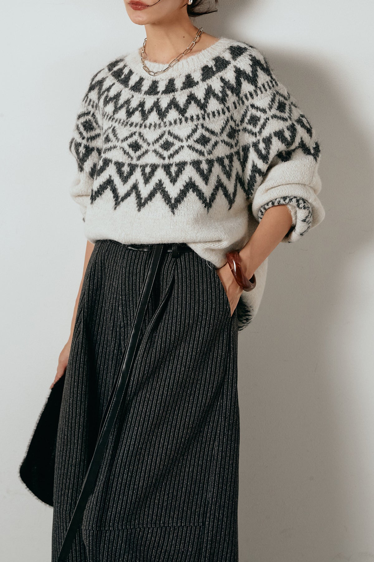 やわらかな風合いと存在感のあるノルディック柄が魅力のUネックプルオーバー。