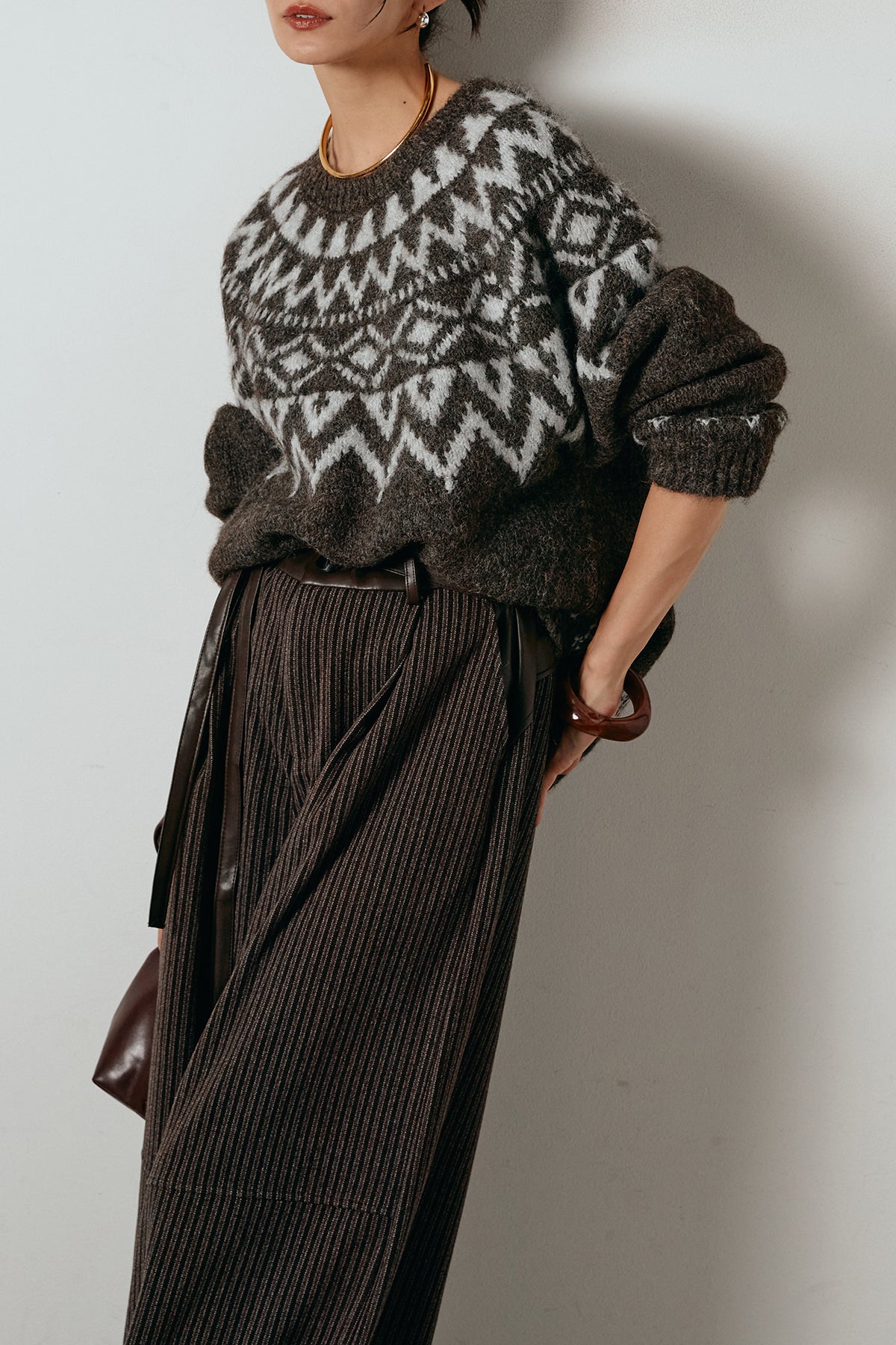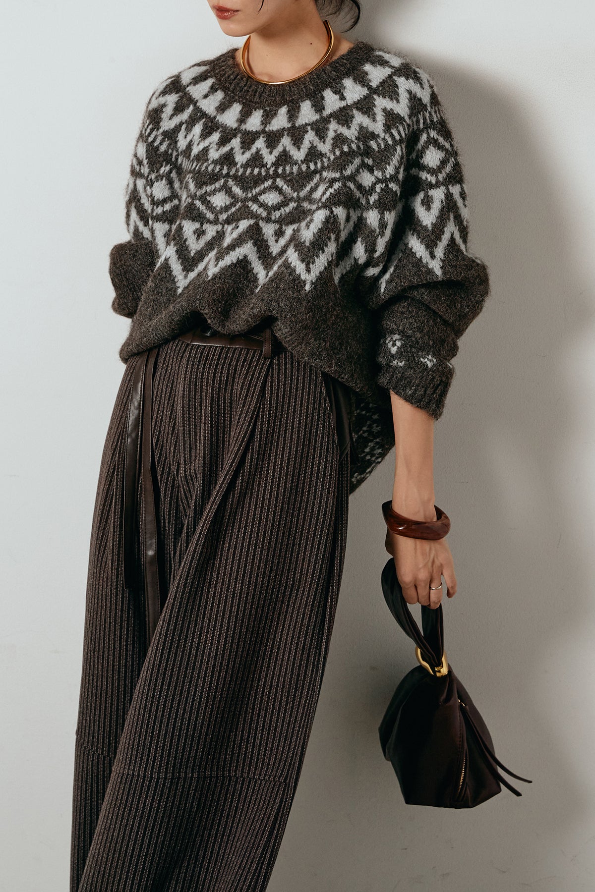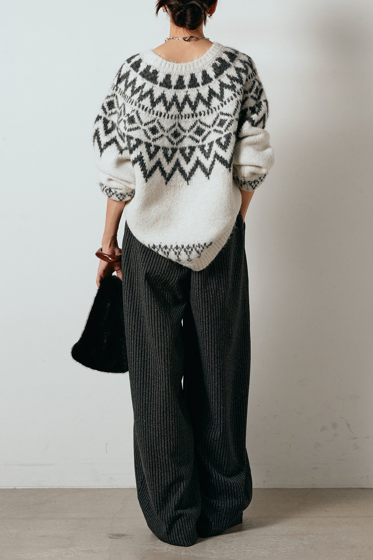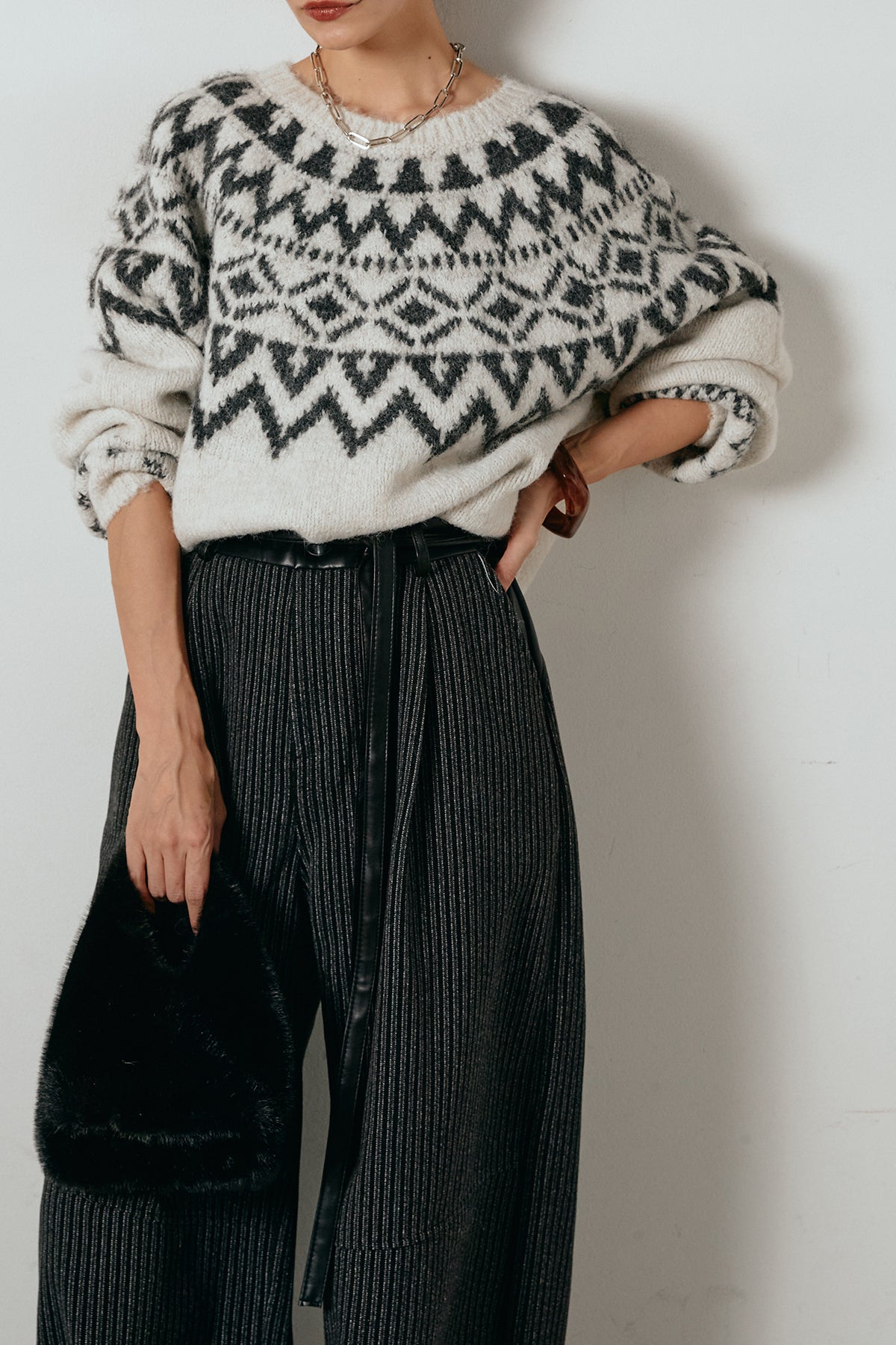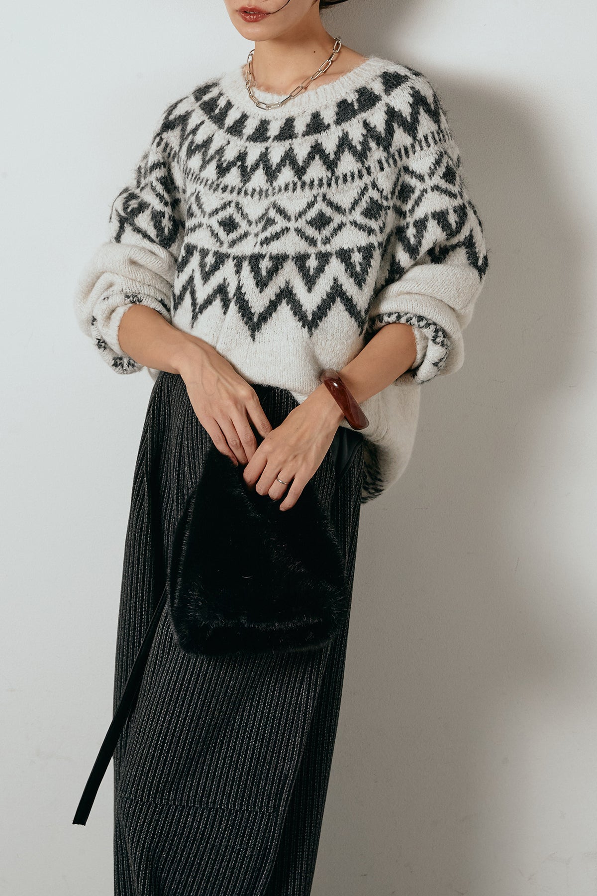 やわらかな風合いと存在感のあるノルディック柄が魅力のUネックプルオーバー。