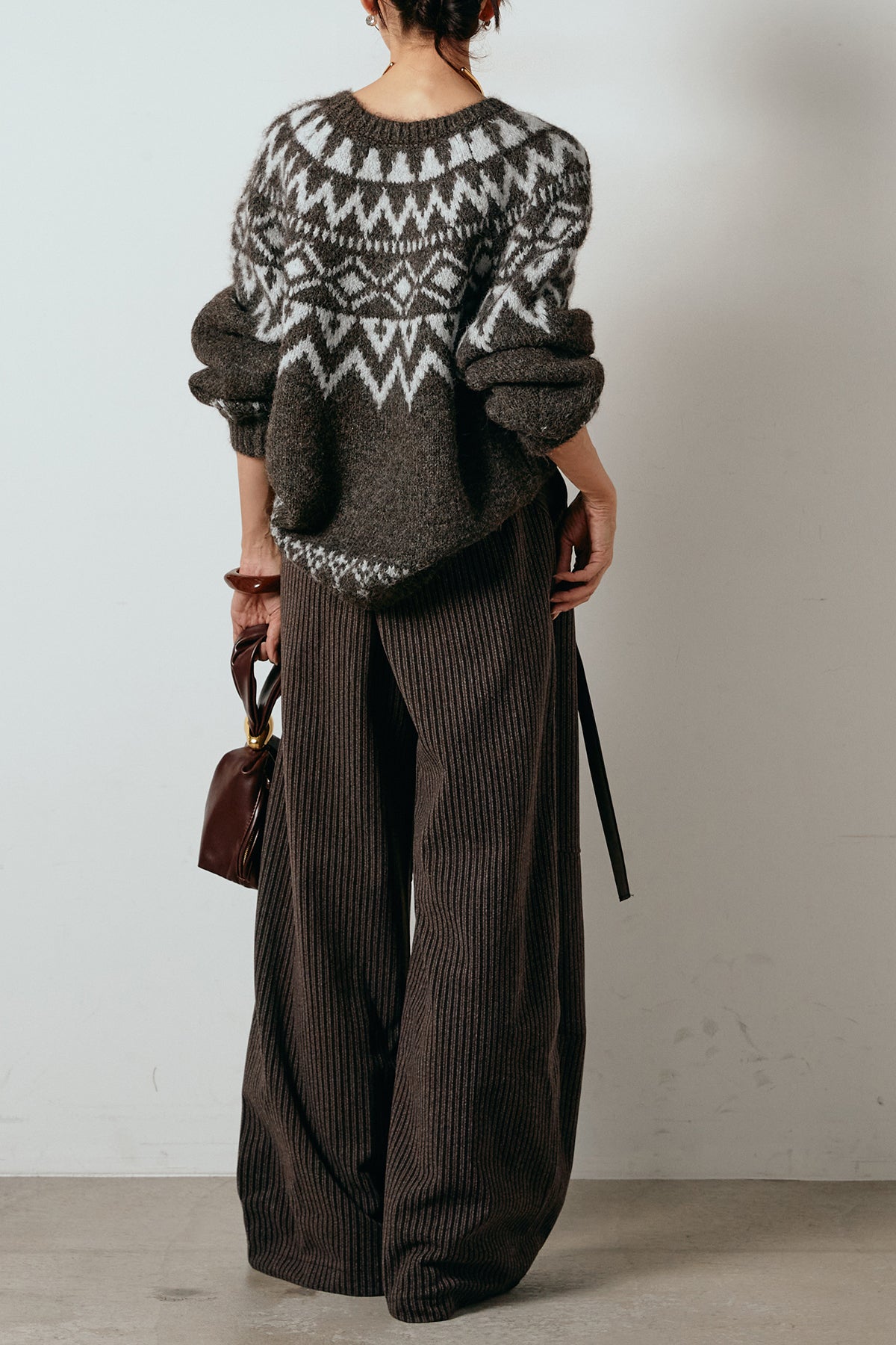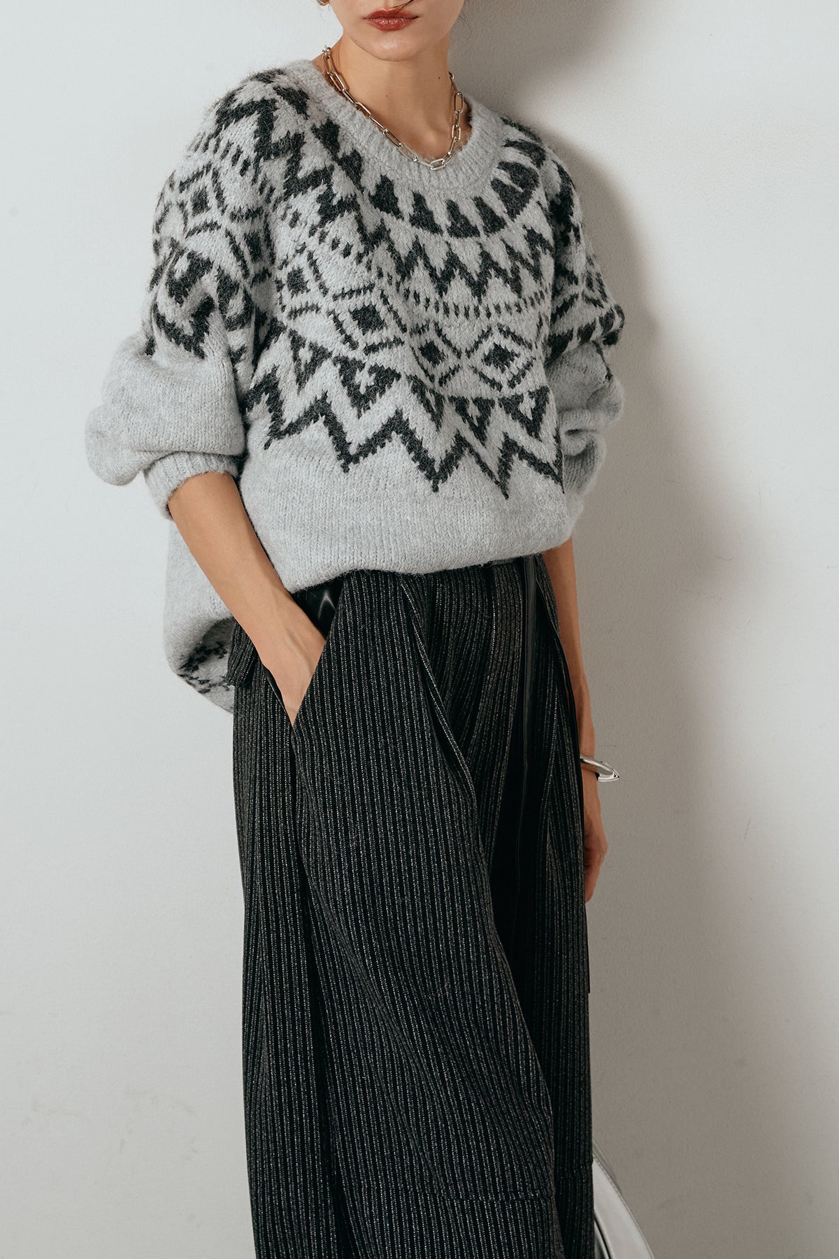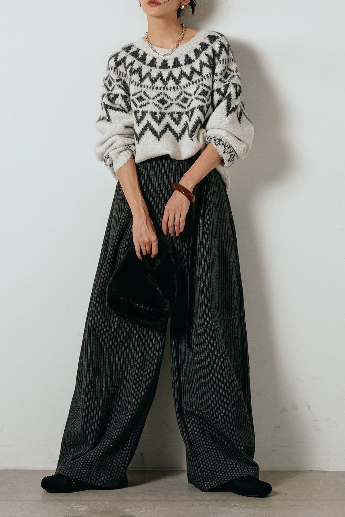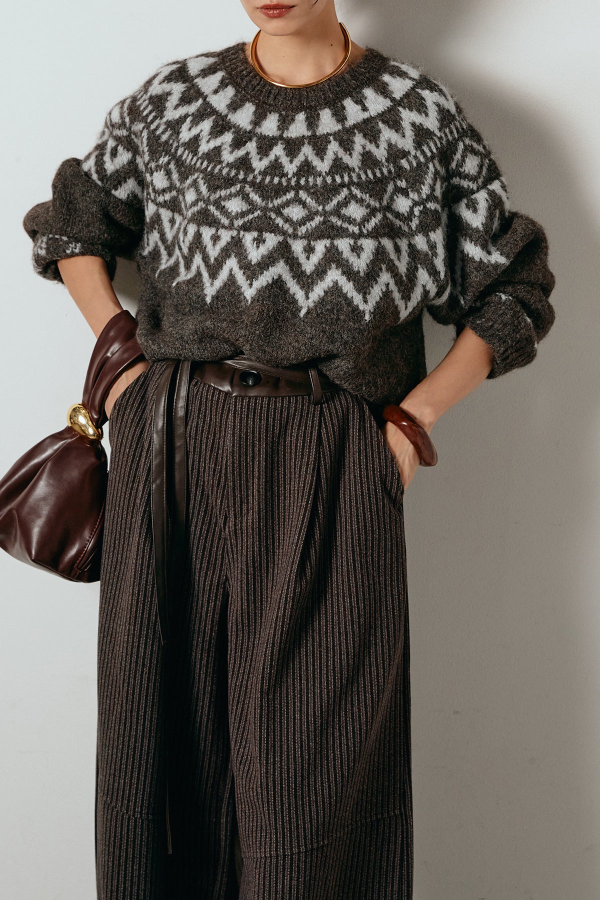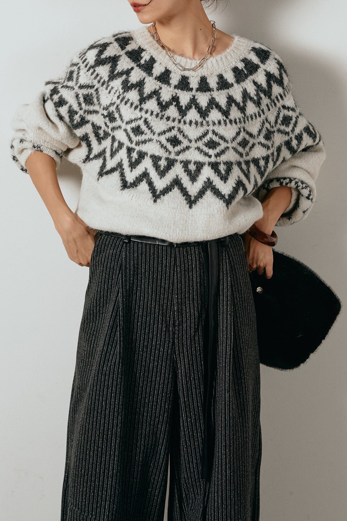 やわらかな風合いと存在感のあるノルディック柄が魅力のUネックプルオーバー。