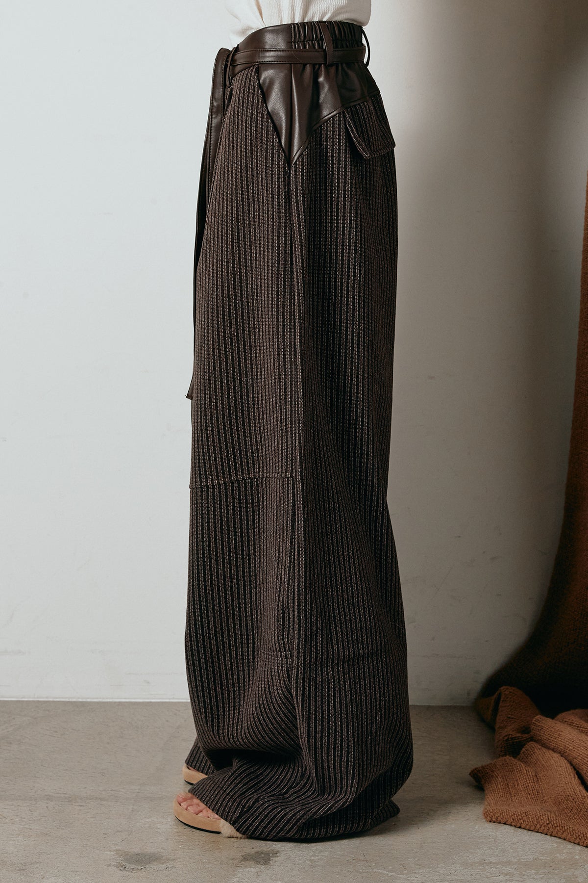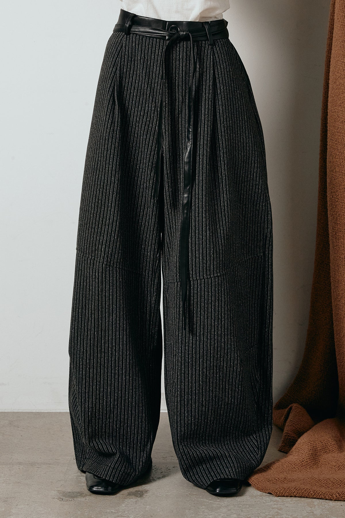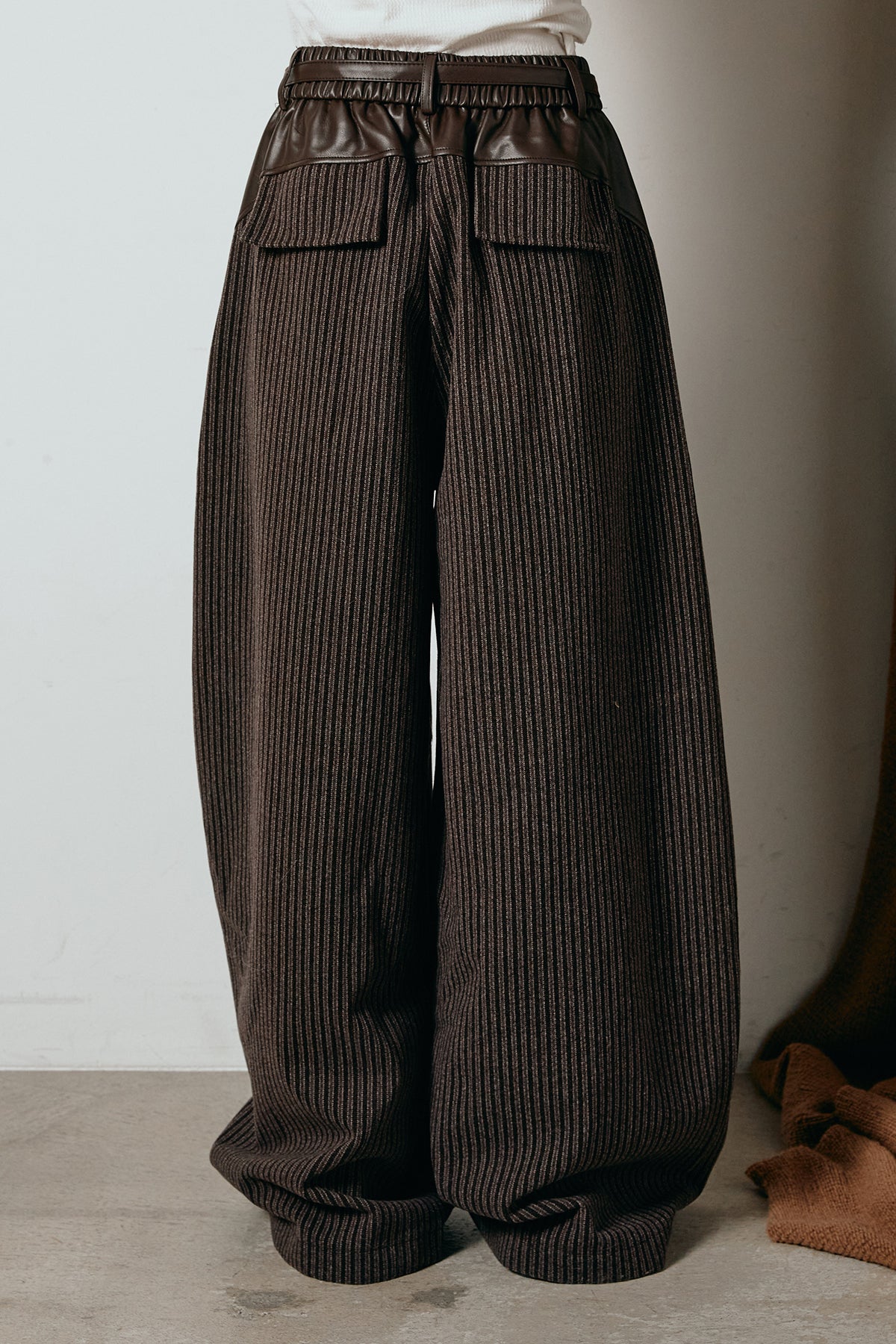 レザーライクなウエストデザインが目を惹くストライプパンツ。