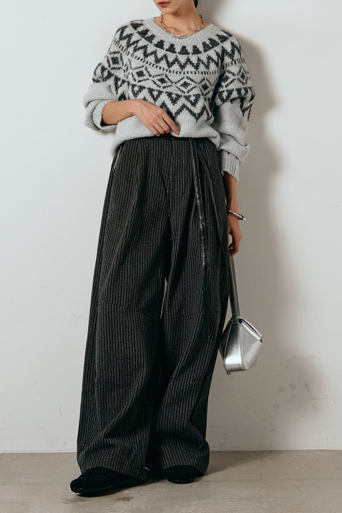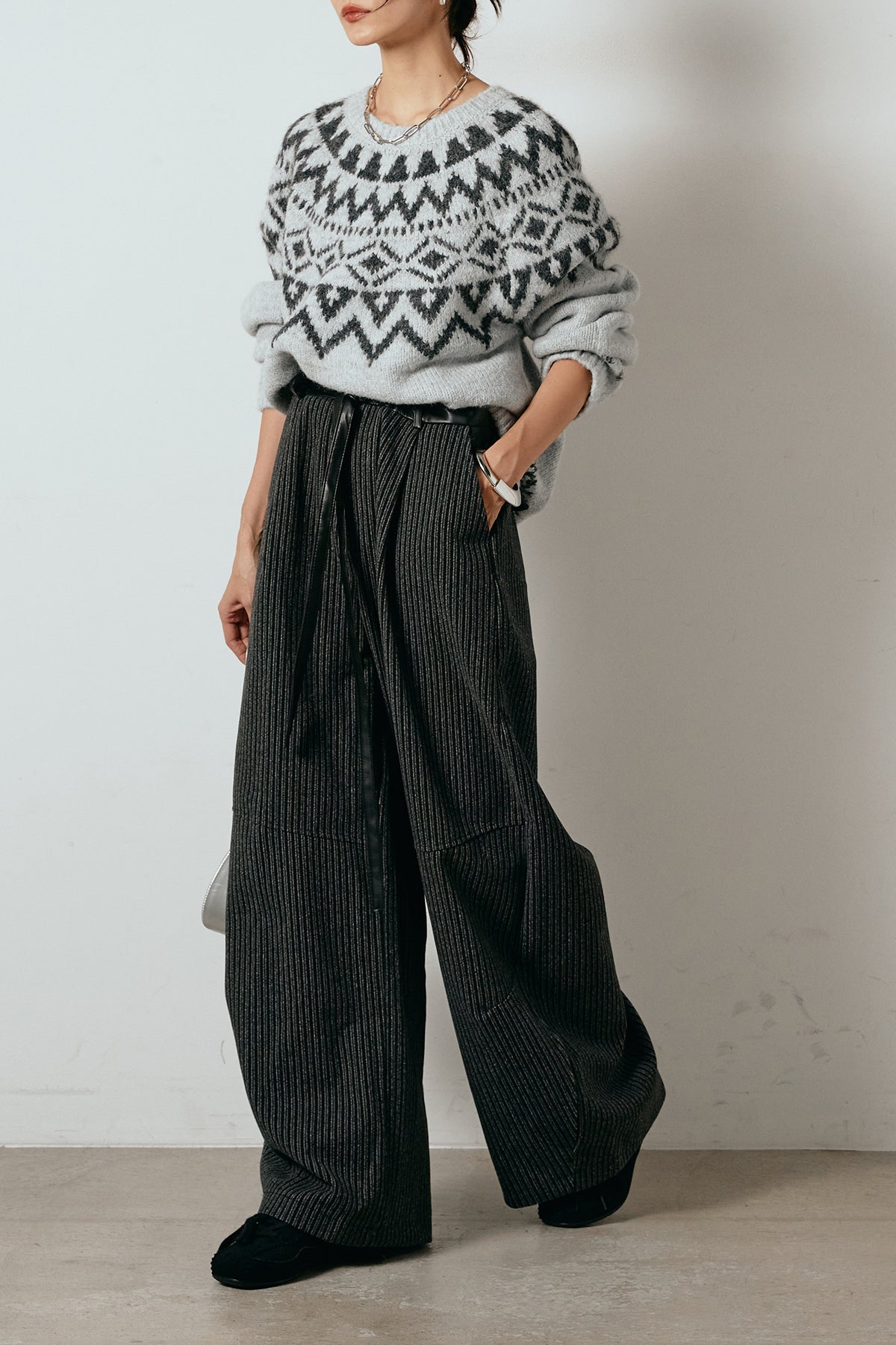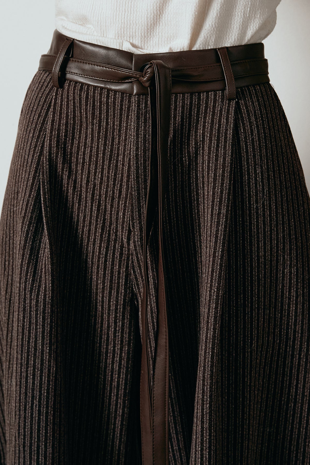 レザーライクなウエストデザインが目を惹くストライプパンツ。