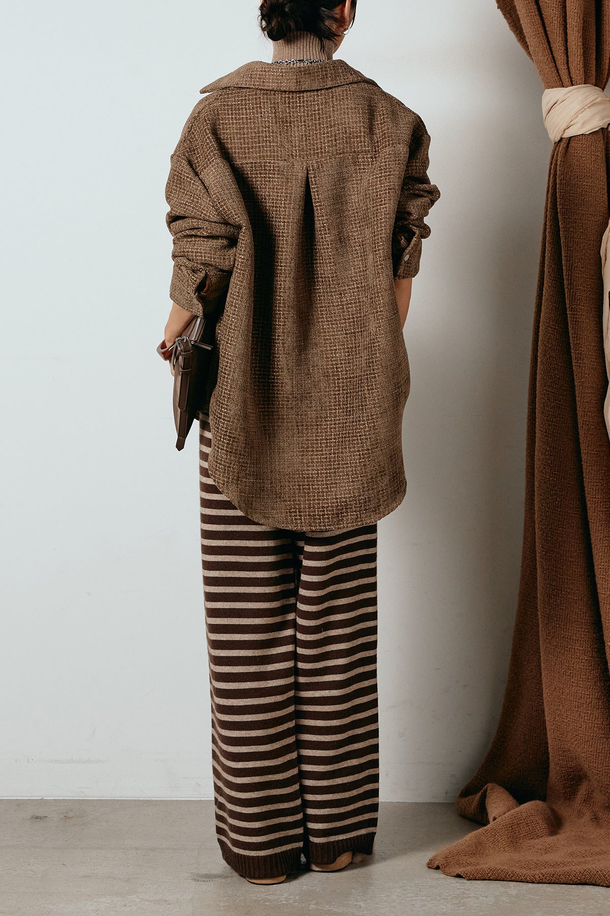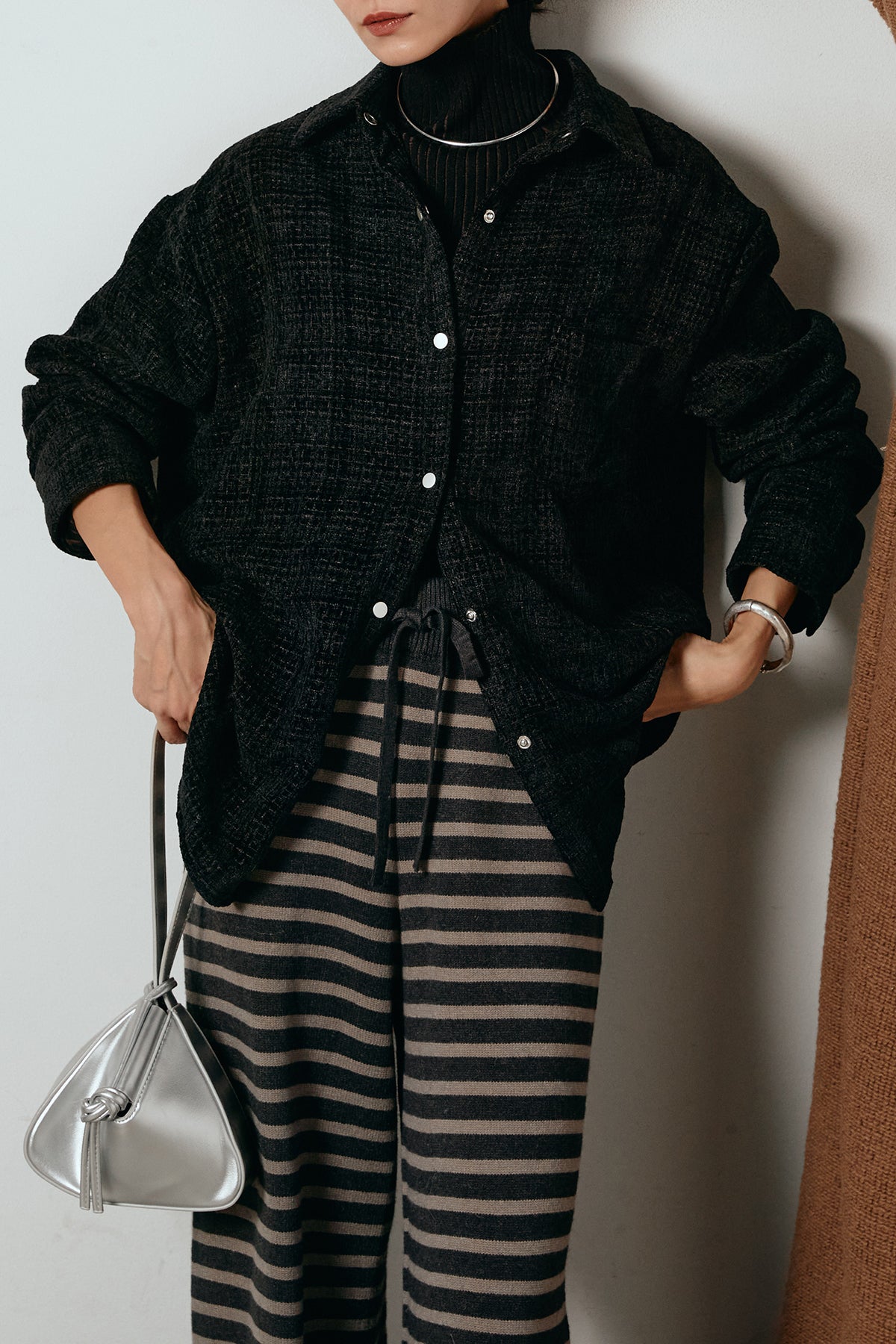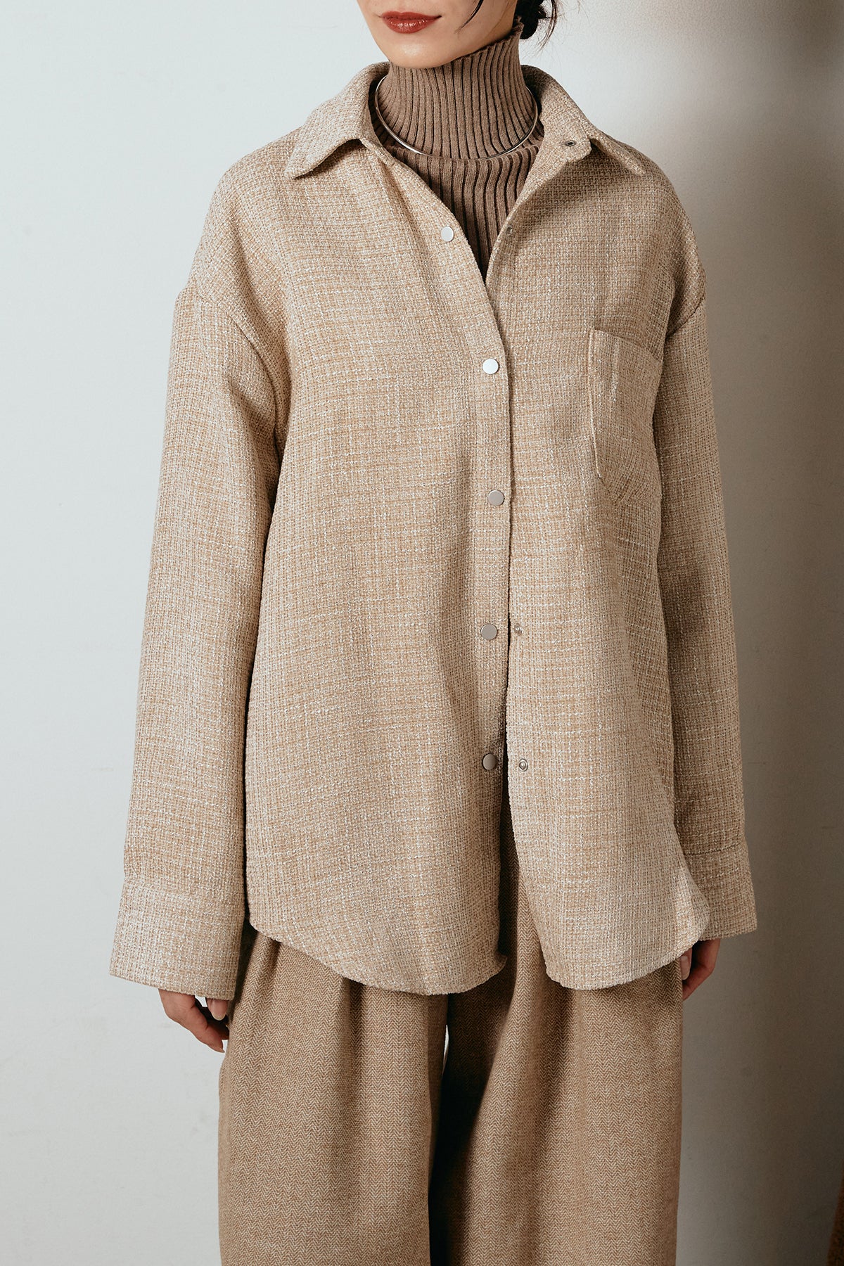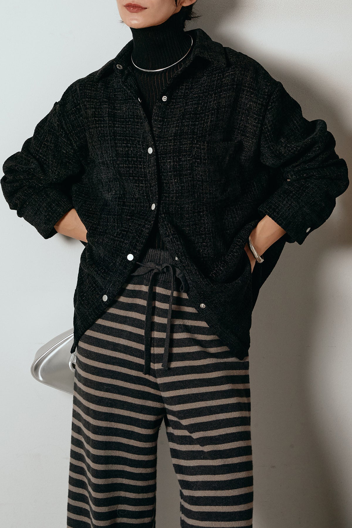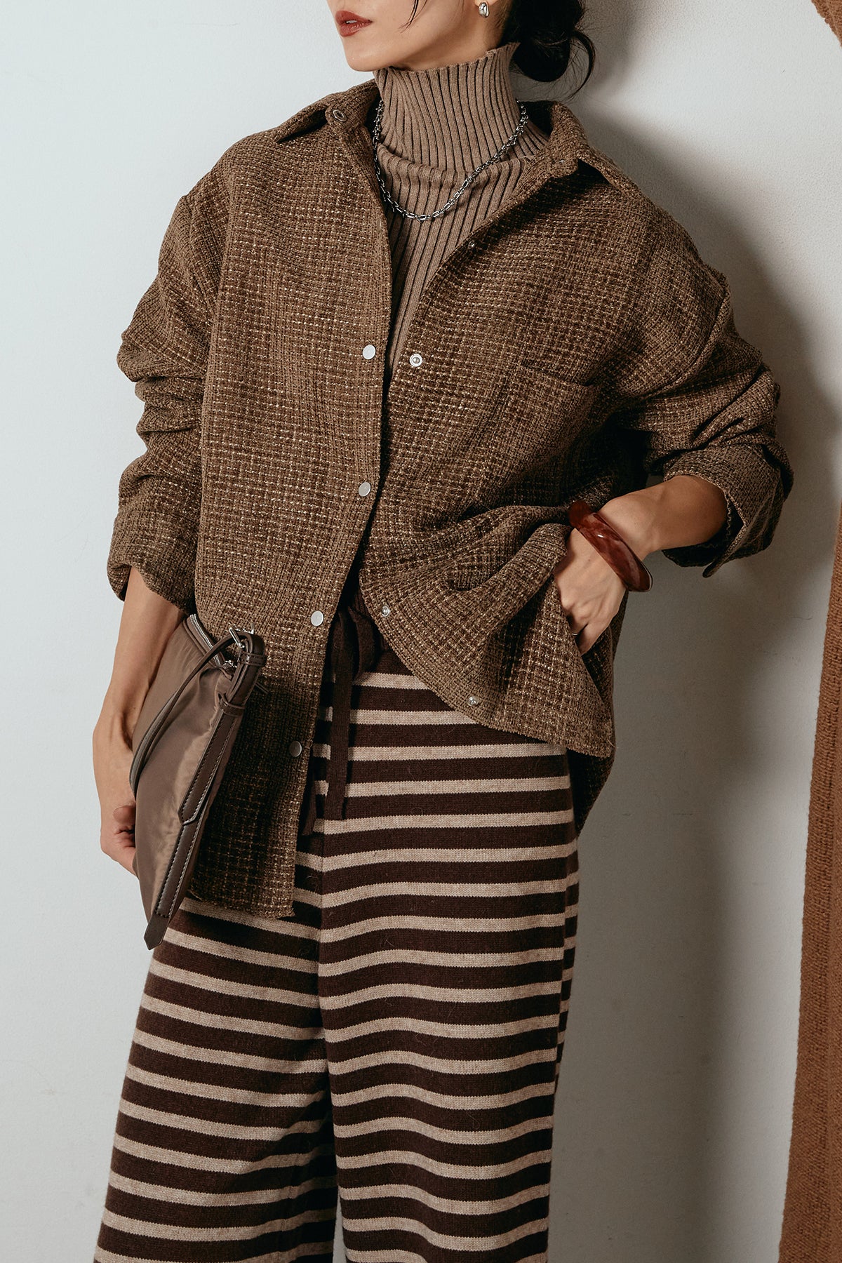 ほどよく表面感のある素材がスタイリングに奥行きを与え、さらりと羽織るだけで雰囲気のある着こなしに。