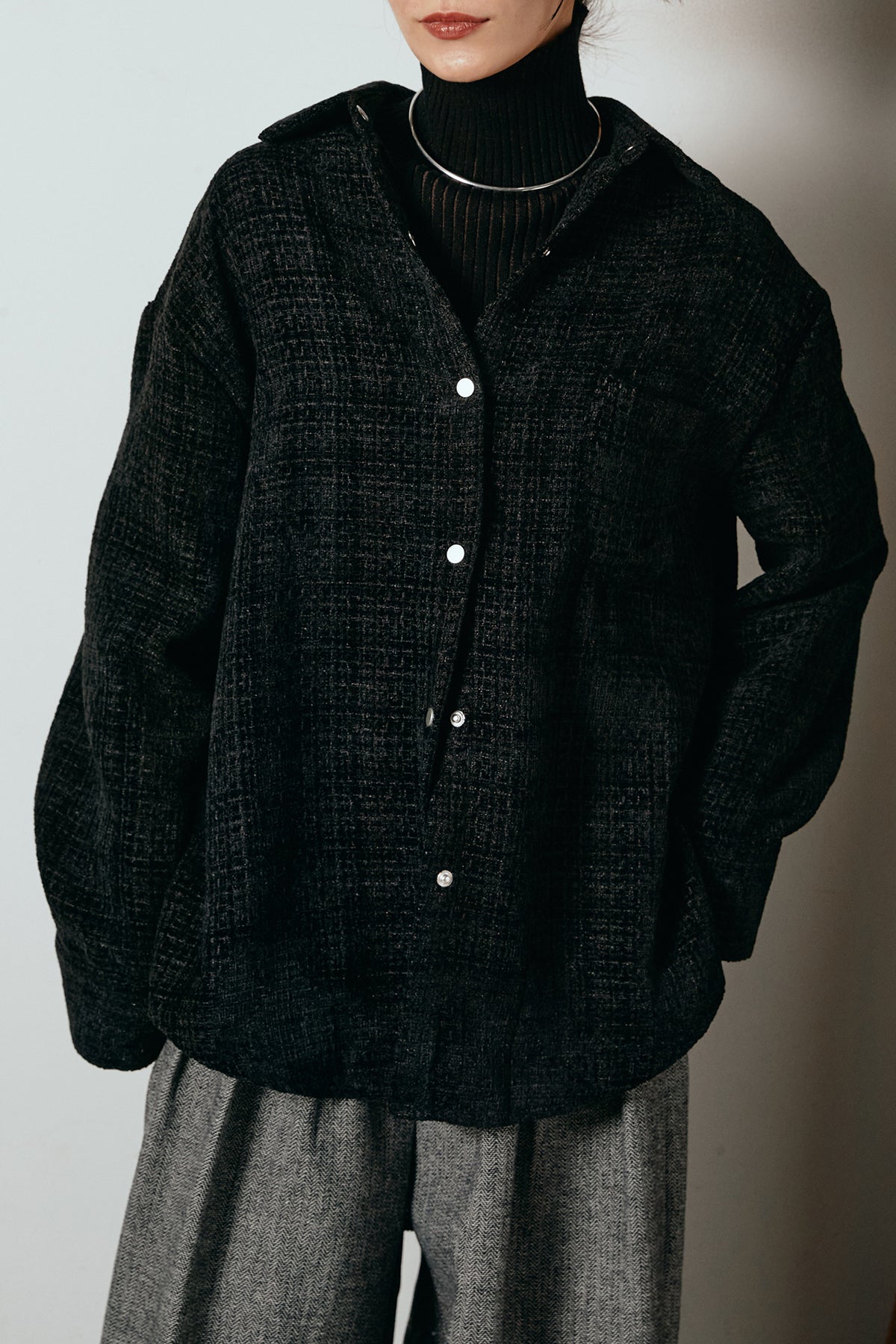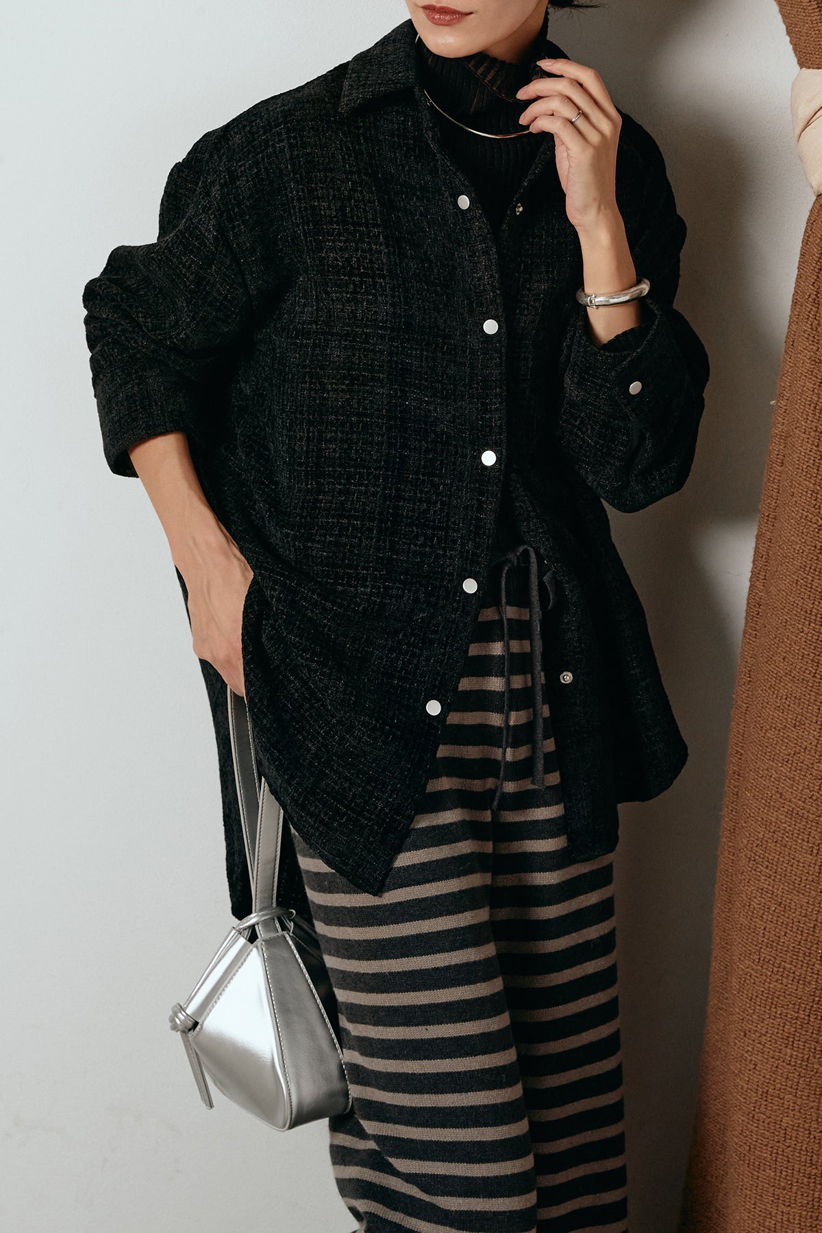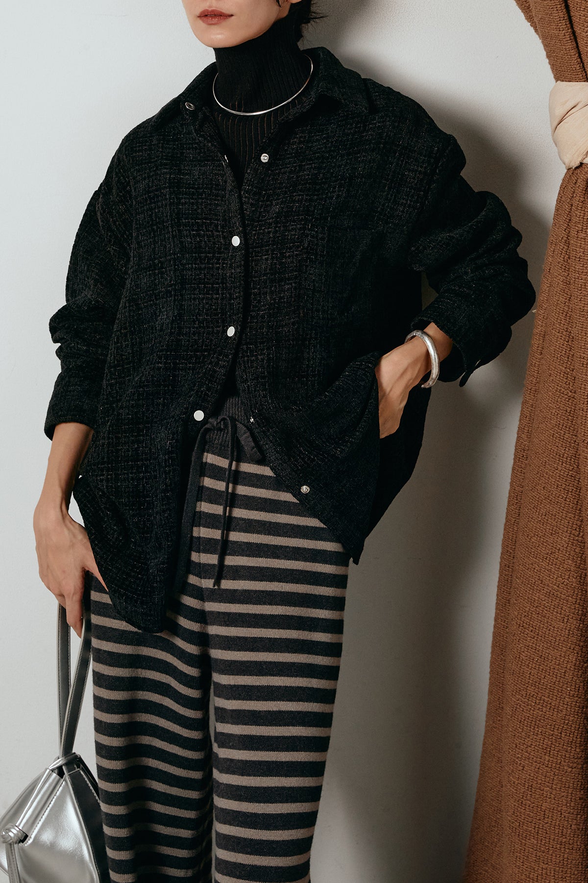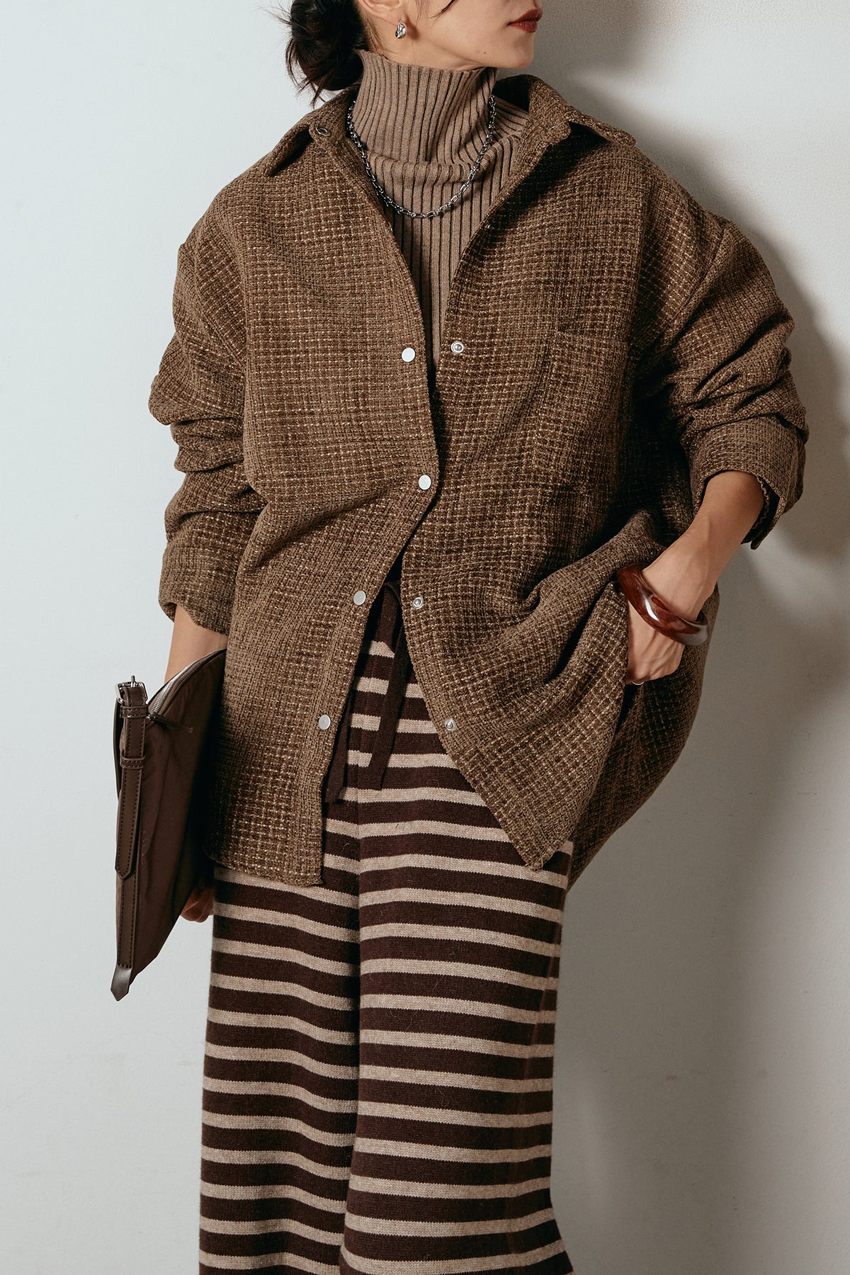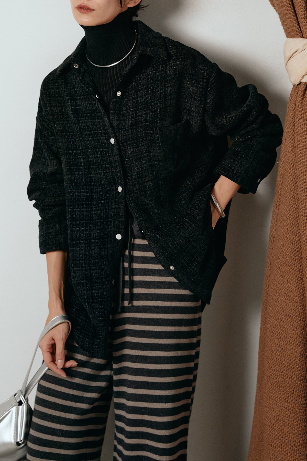 ほどよく表面感のある素材がスタイリングに奥行きを与え、さらりと羽織るだけで雰囲気のある着こなしに。