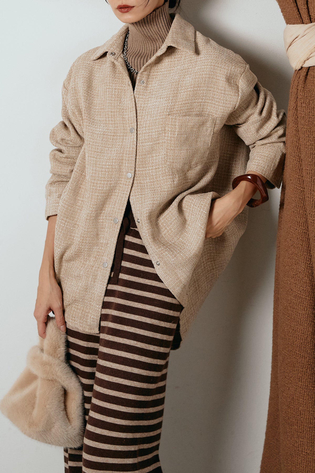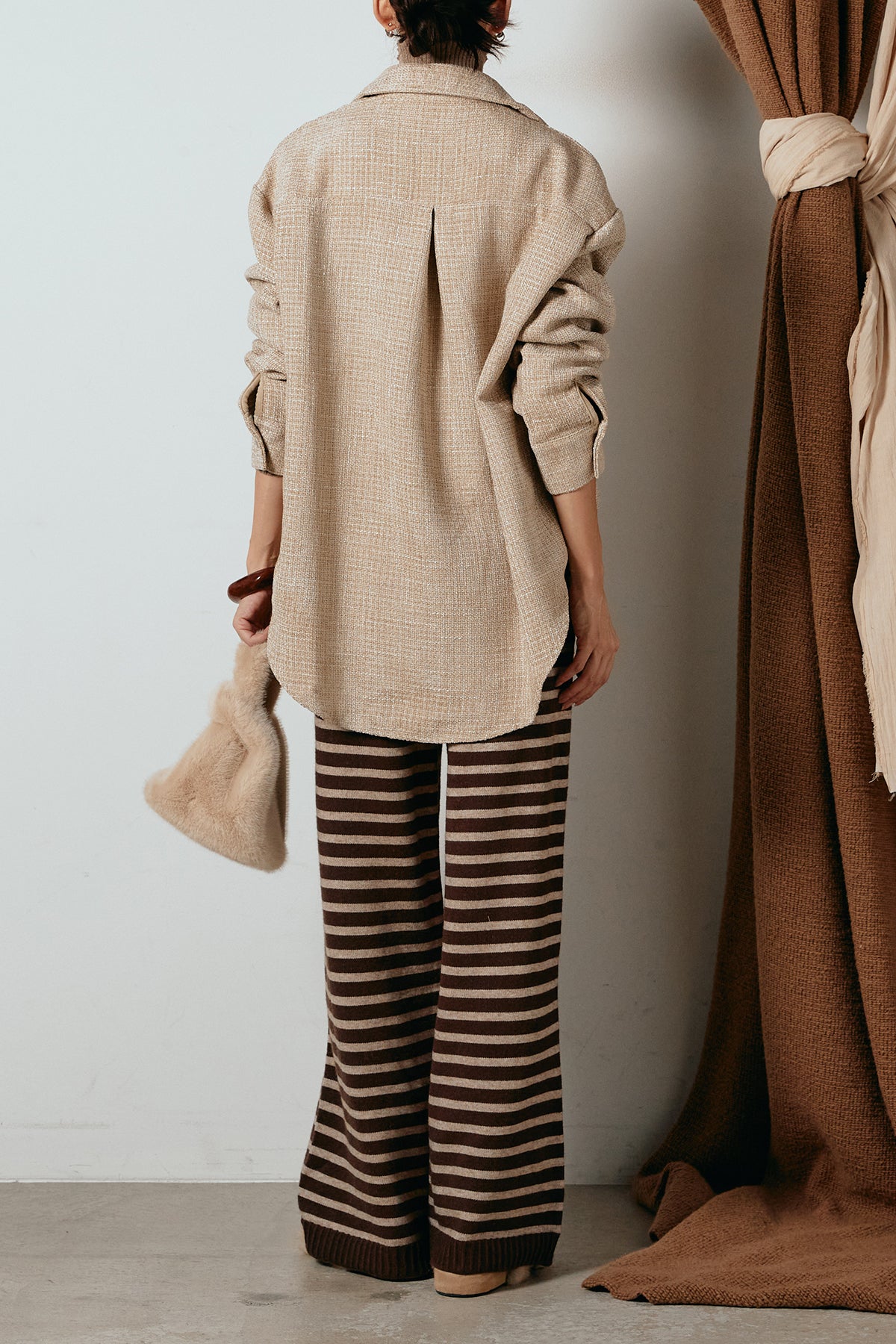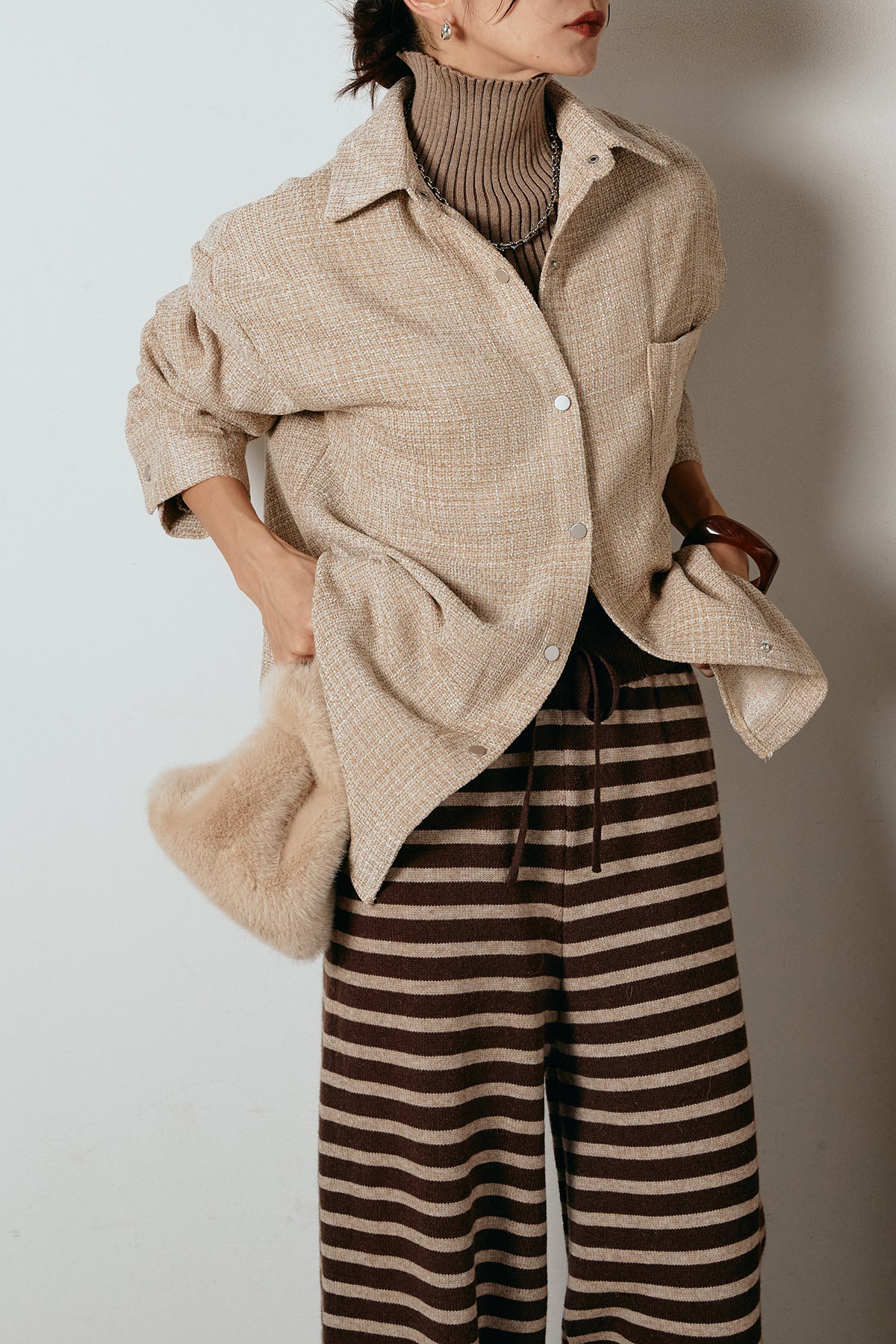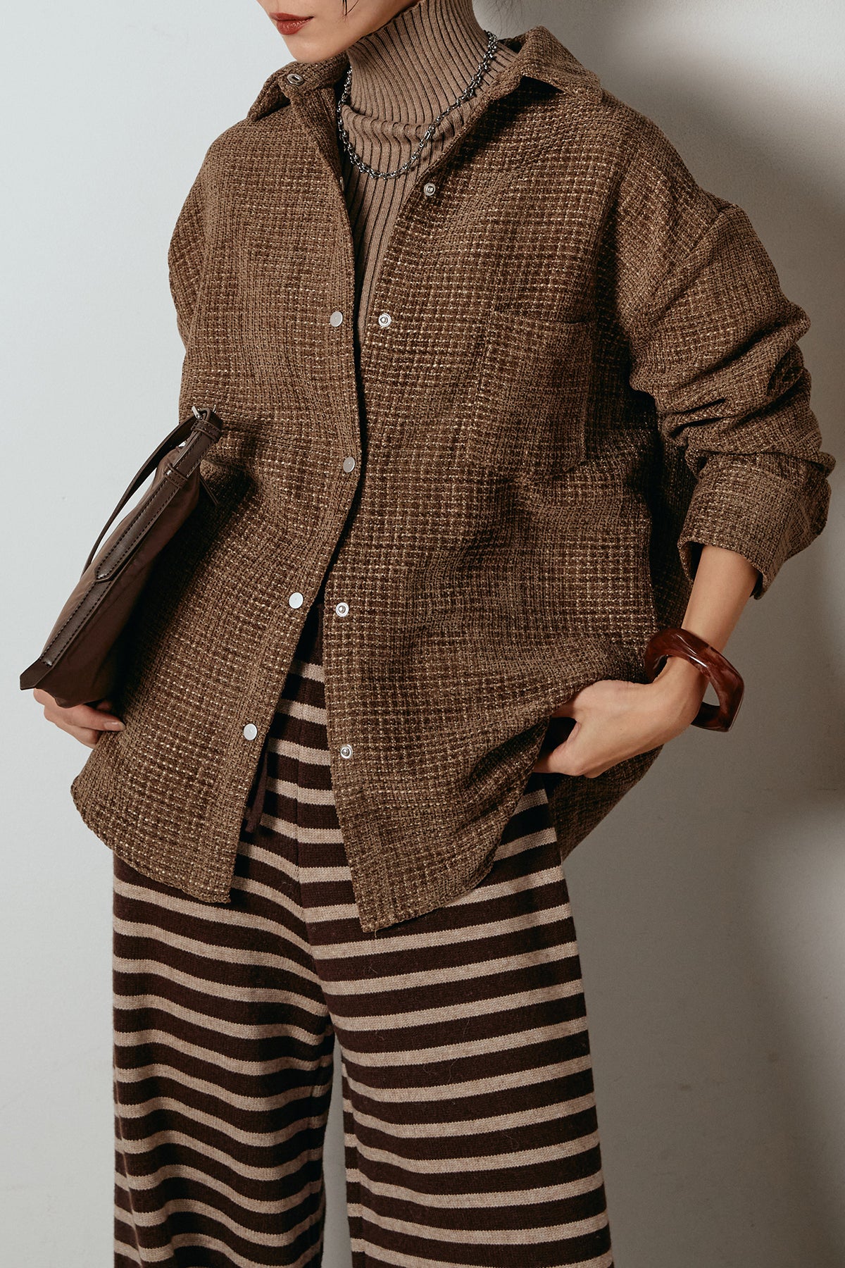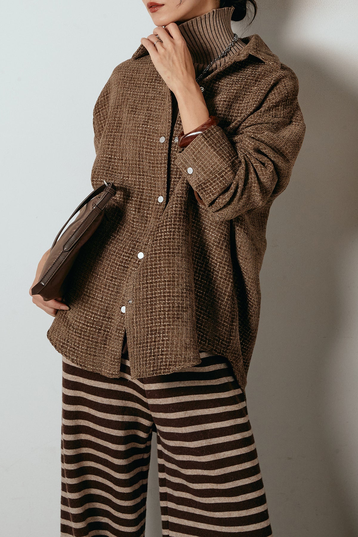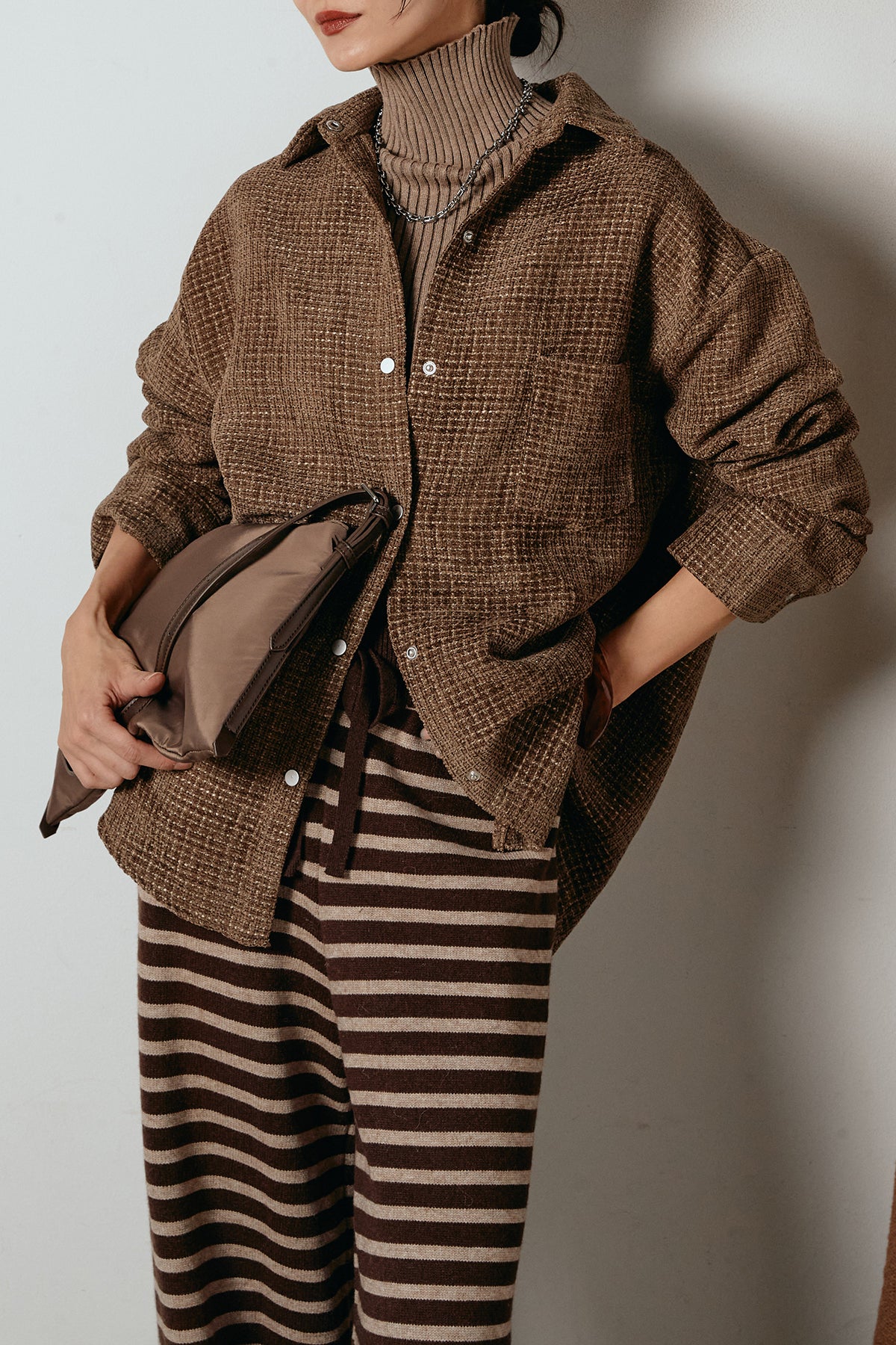 ほどよく表面感のある素材がスタイリングに奥行きを与え、さらりと羽織るだけで雰囲気のある着こなしに。