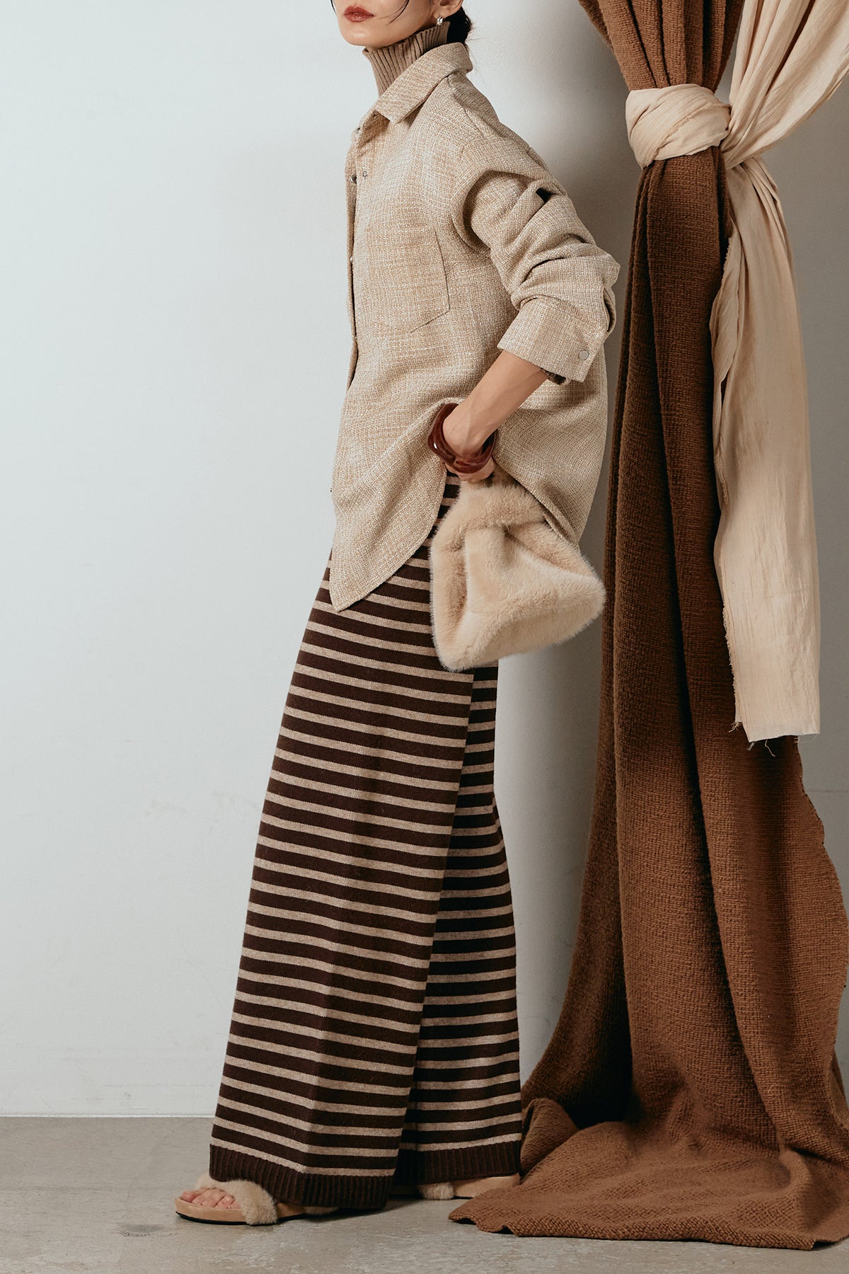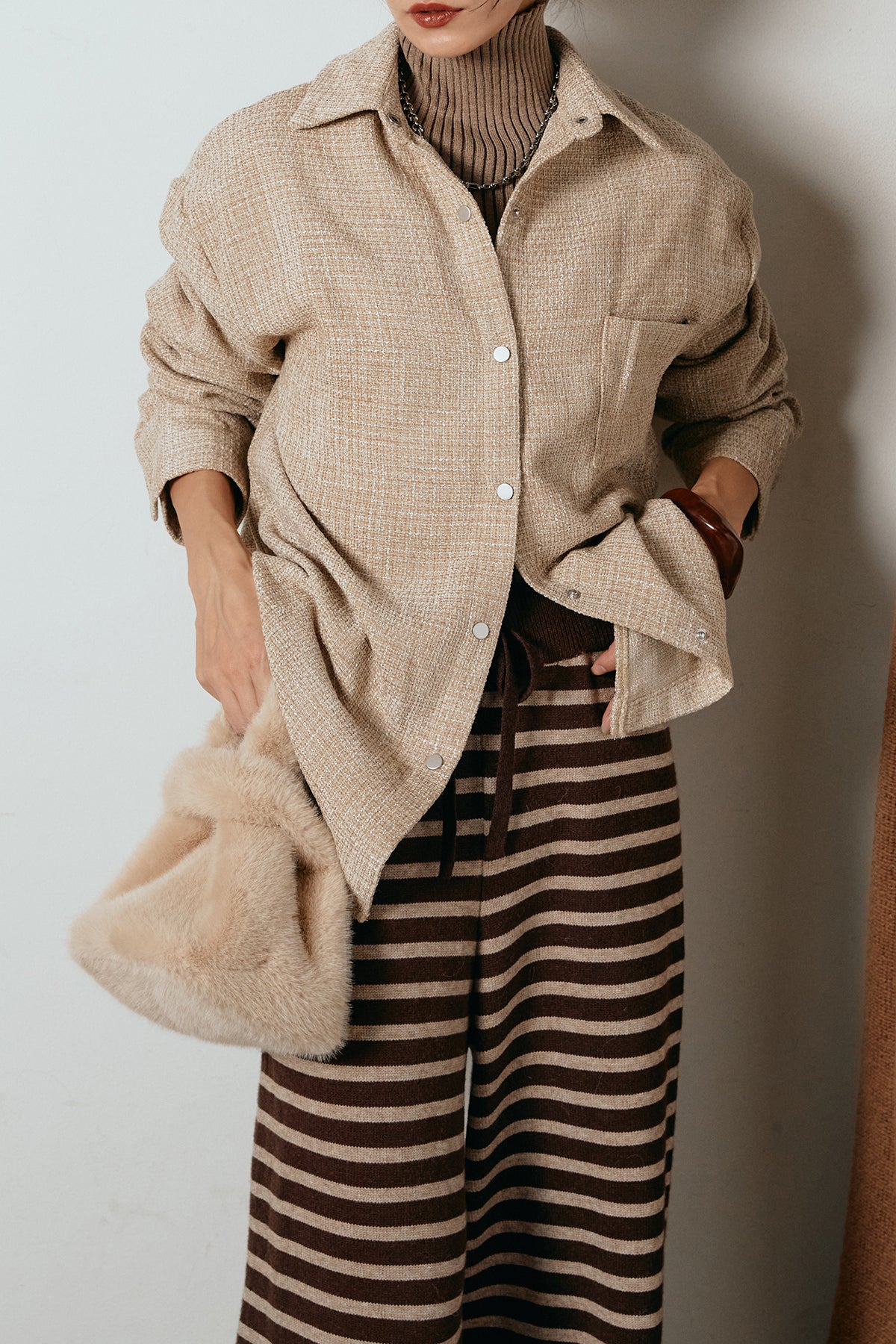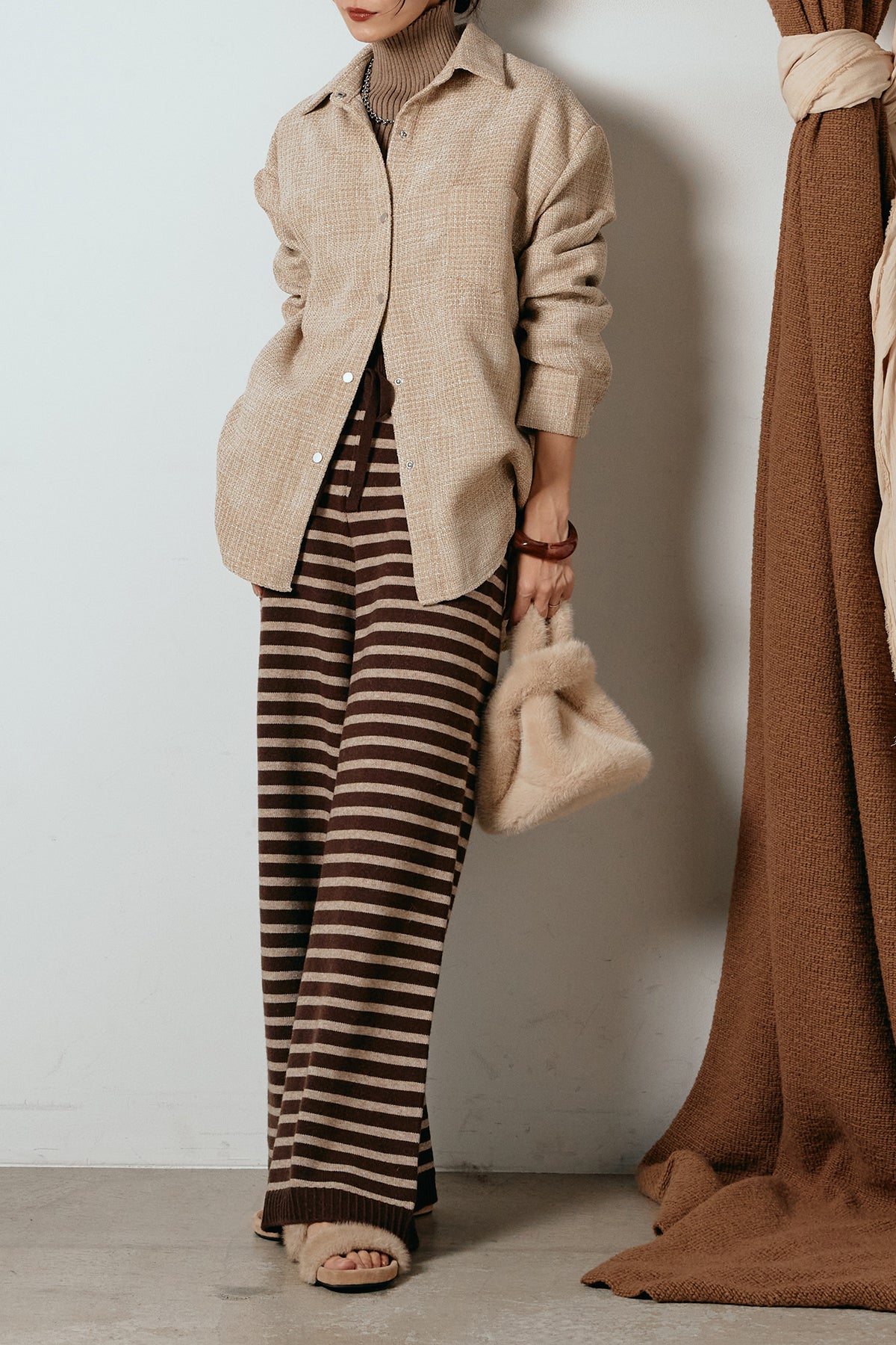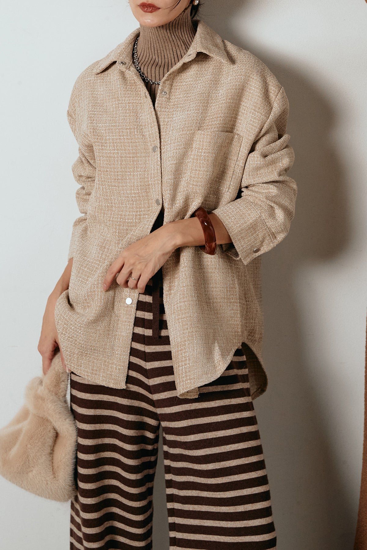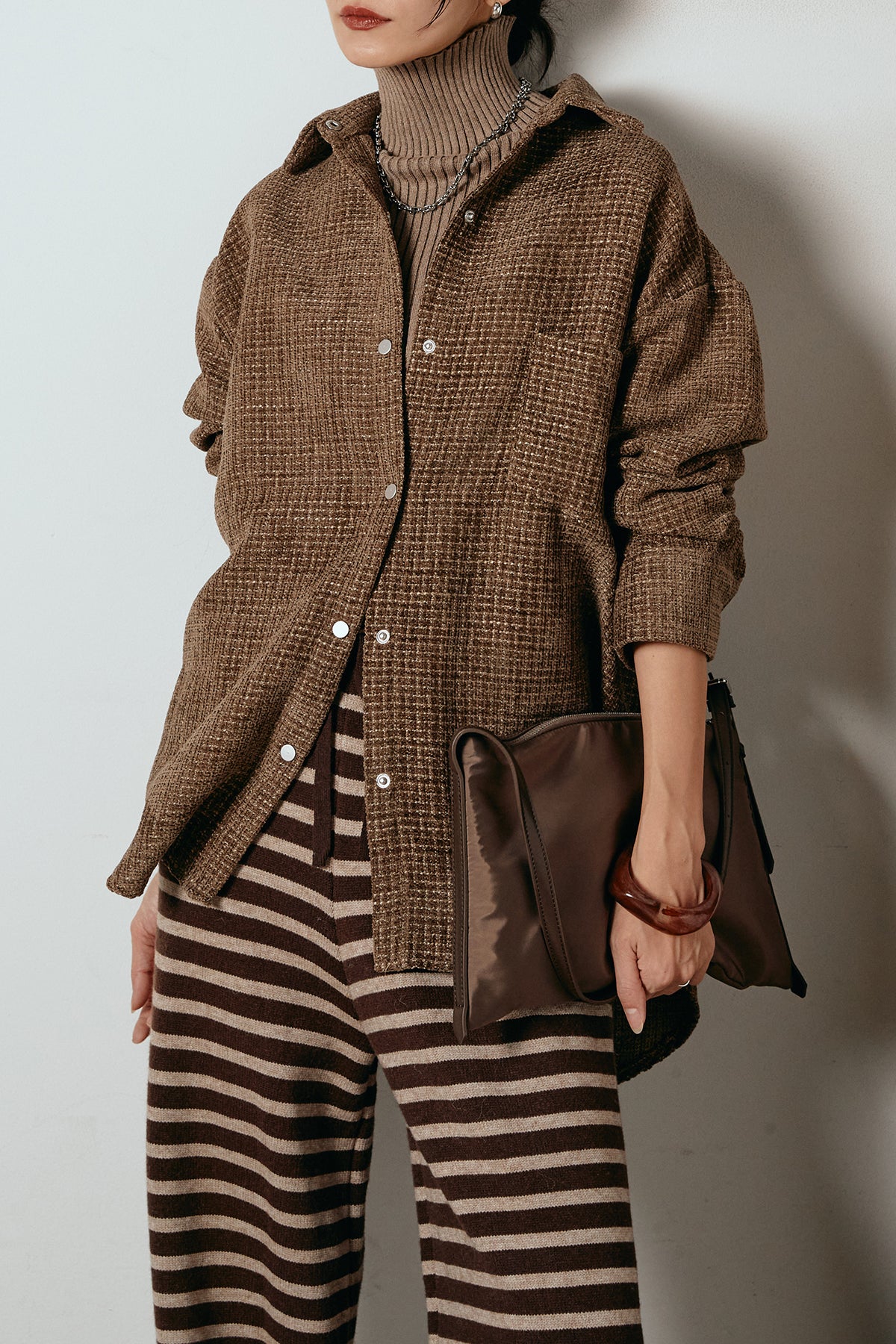 ほどよく表面感のある素材がスタイリングに奥行きを与え、さらりと羽織るだけで雰囲気のある着こなしに。