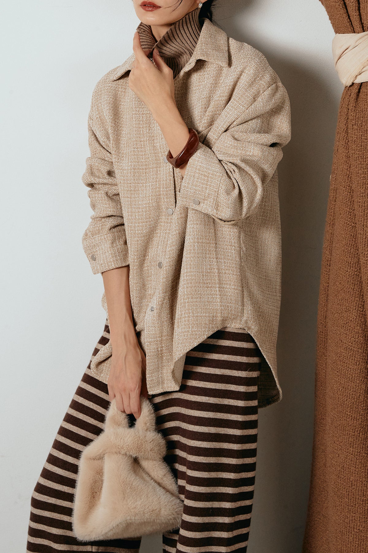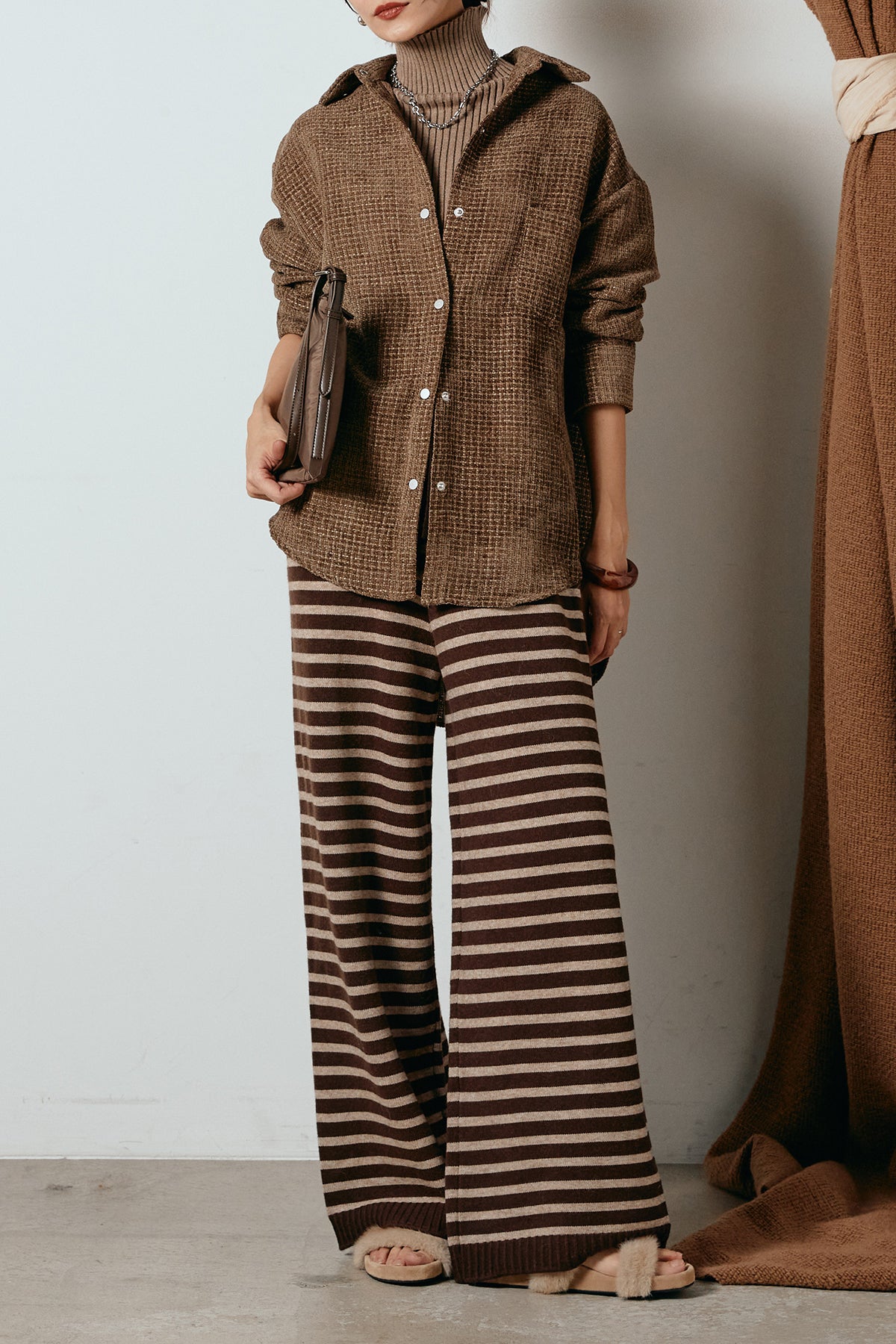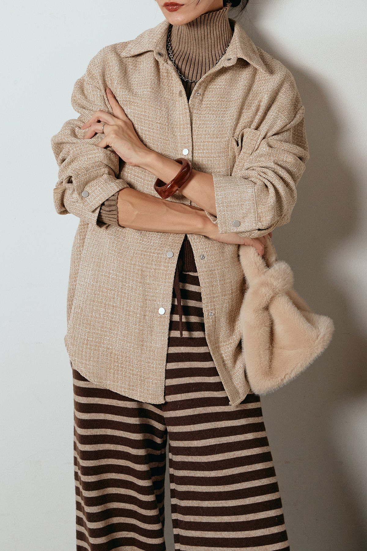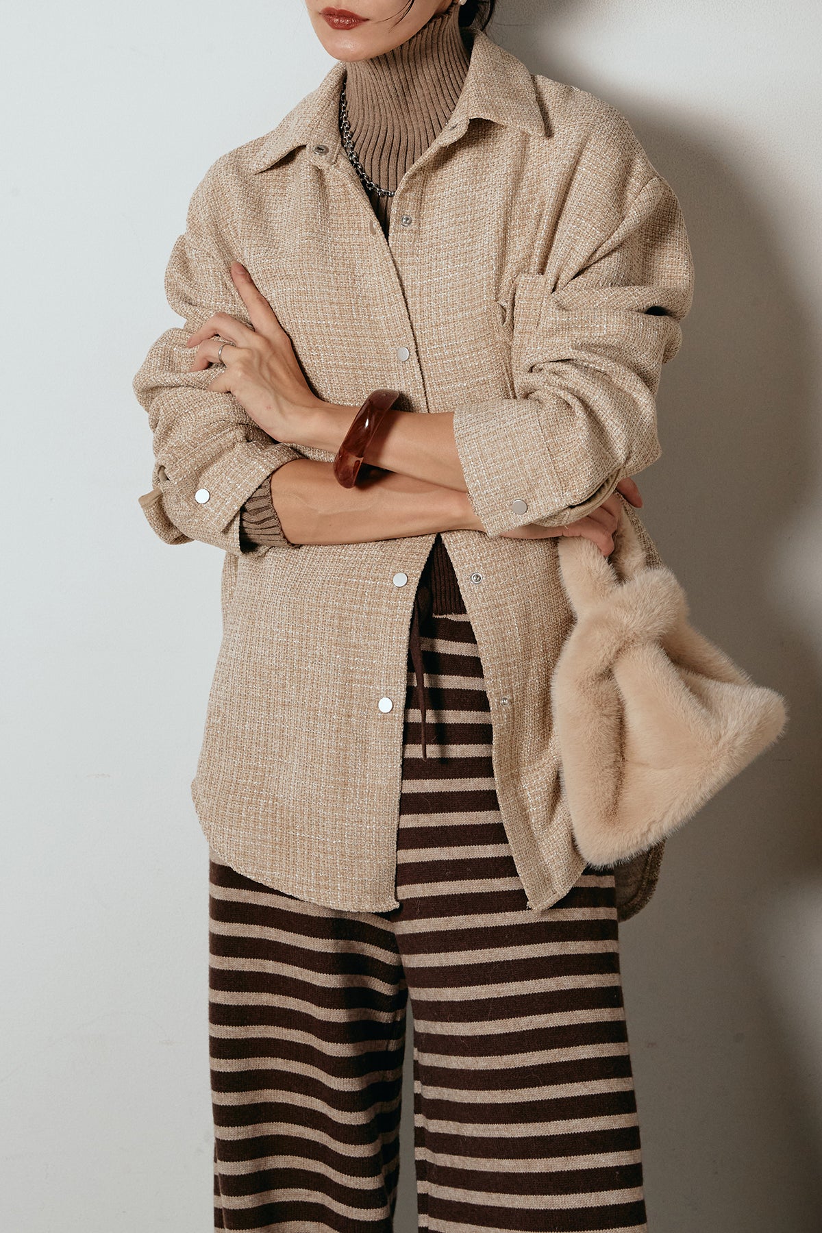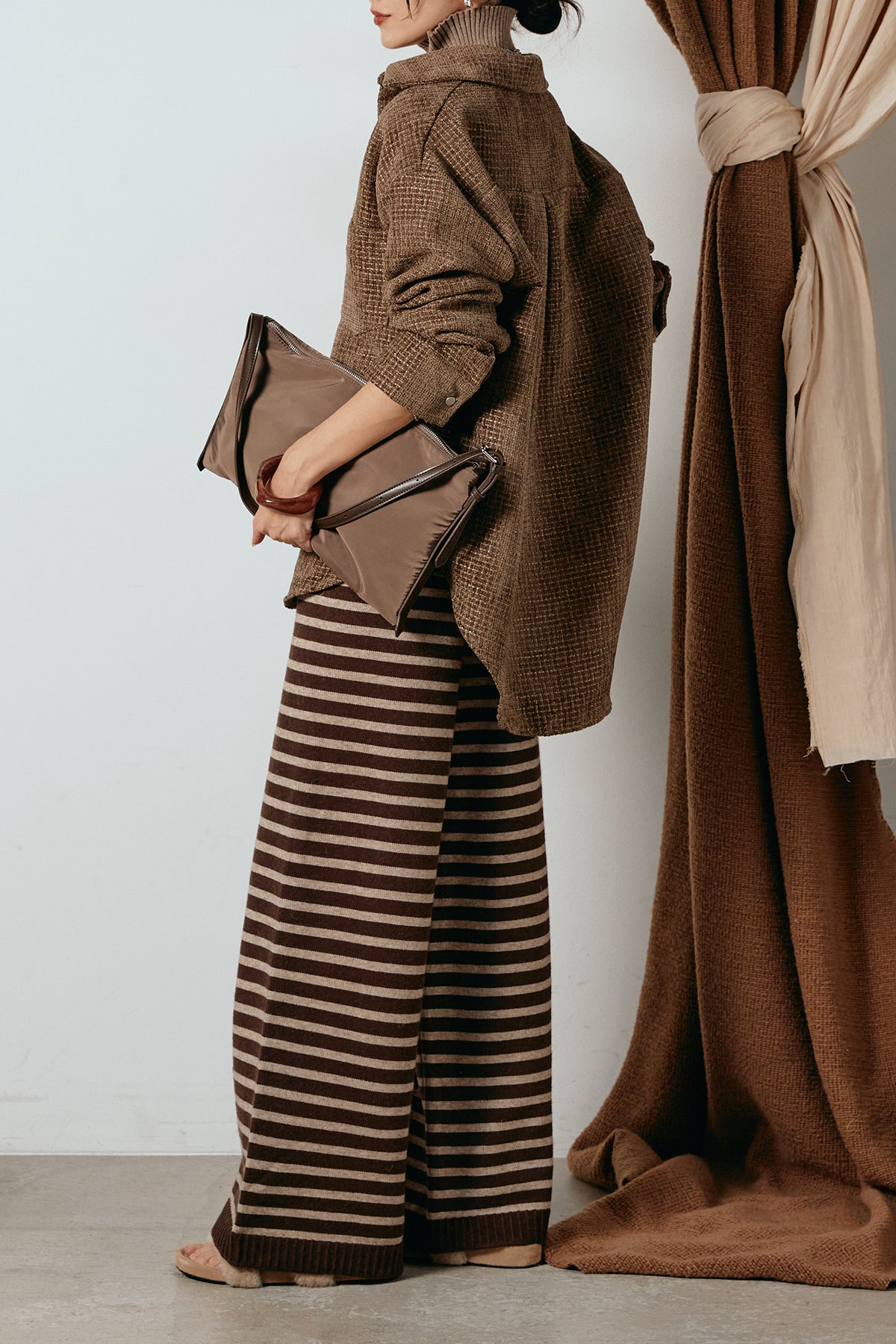 ほどよく表面感のある素材がスタイリングに奥行きを与え、さらりと羽織るだけで雰囲気のある着こなしに。