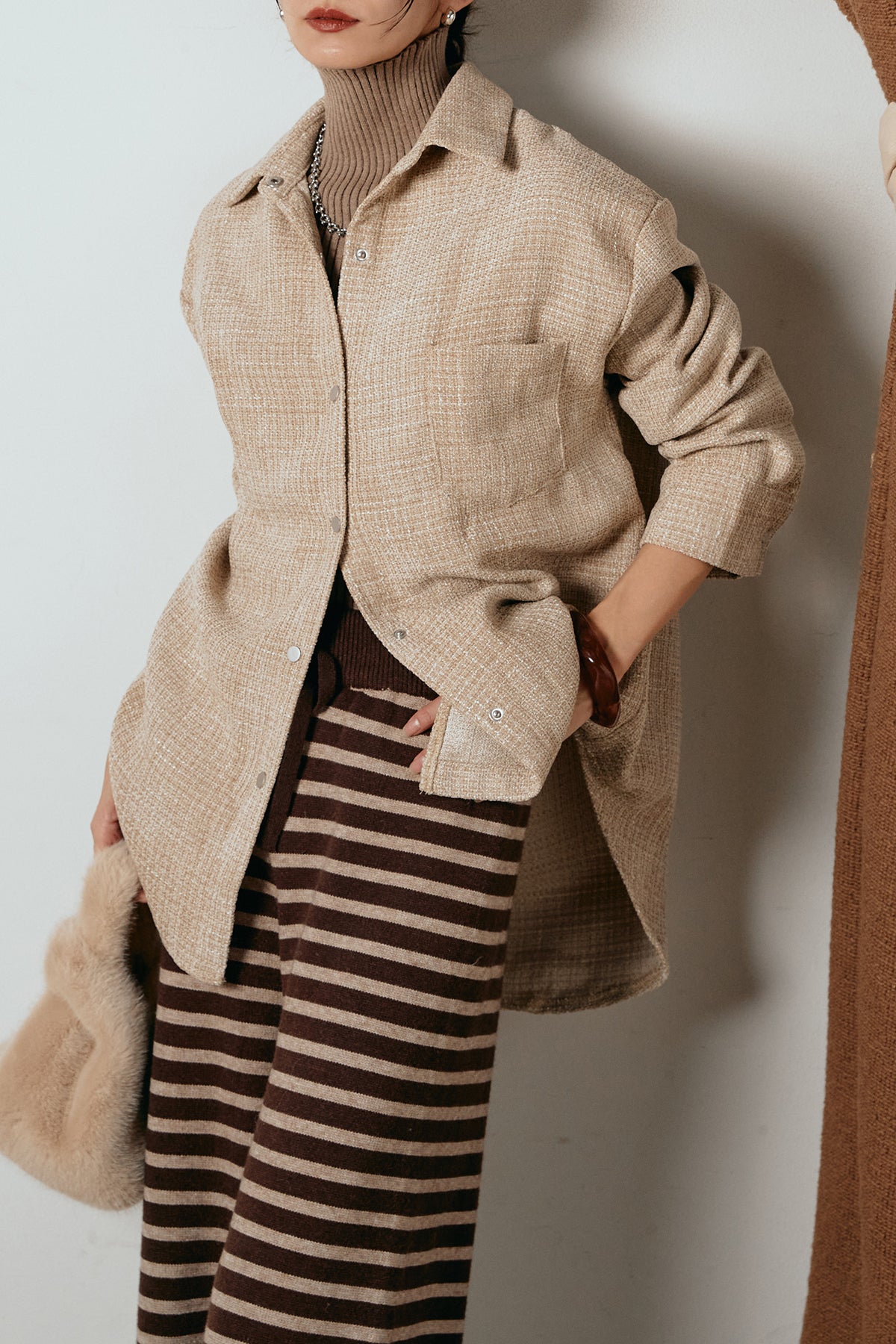 気になるヒップ周りもカバーしやすい丈感で、タートルやニットとのレイヤードもバランスよくまとまります。