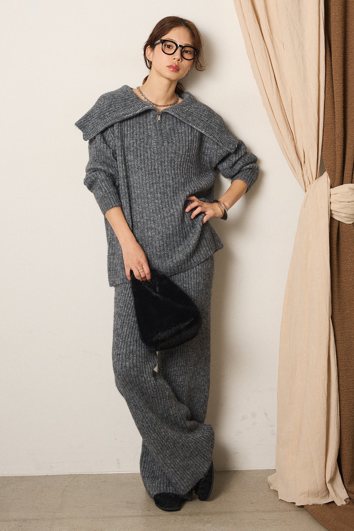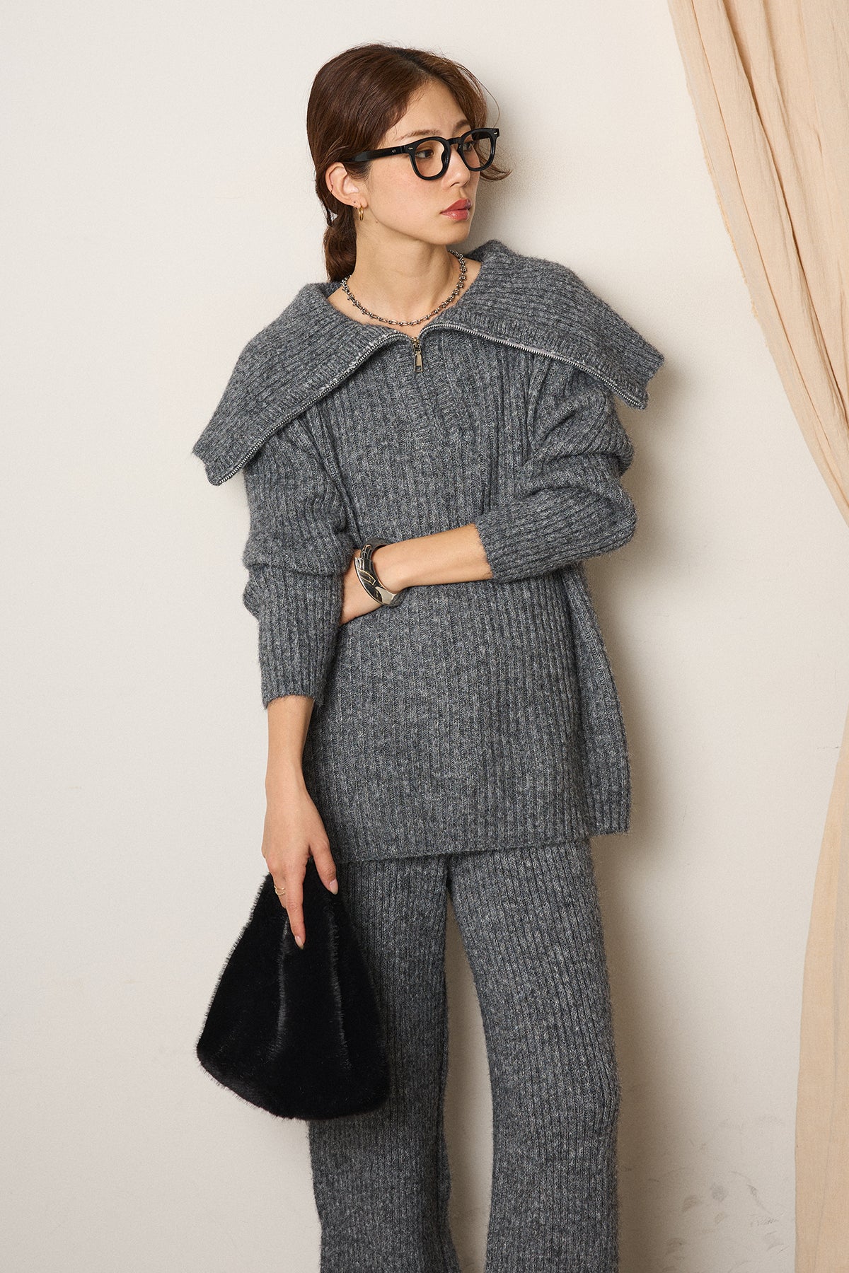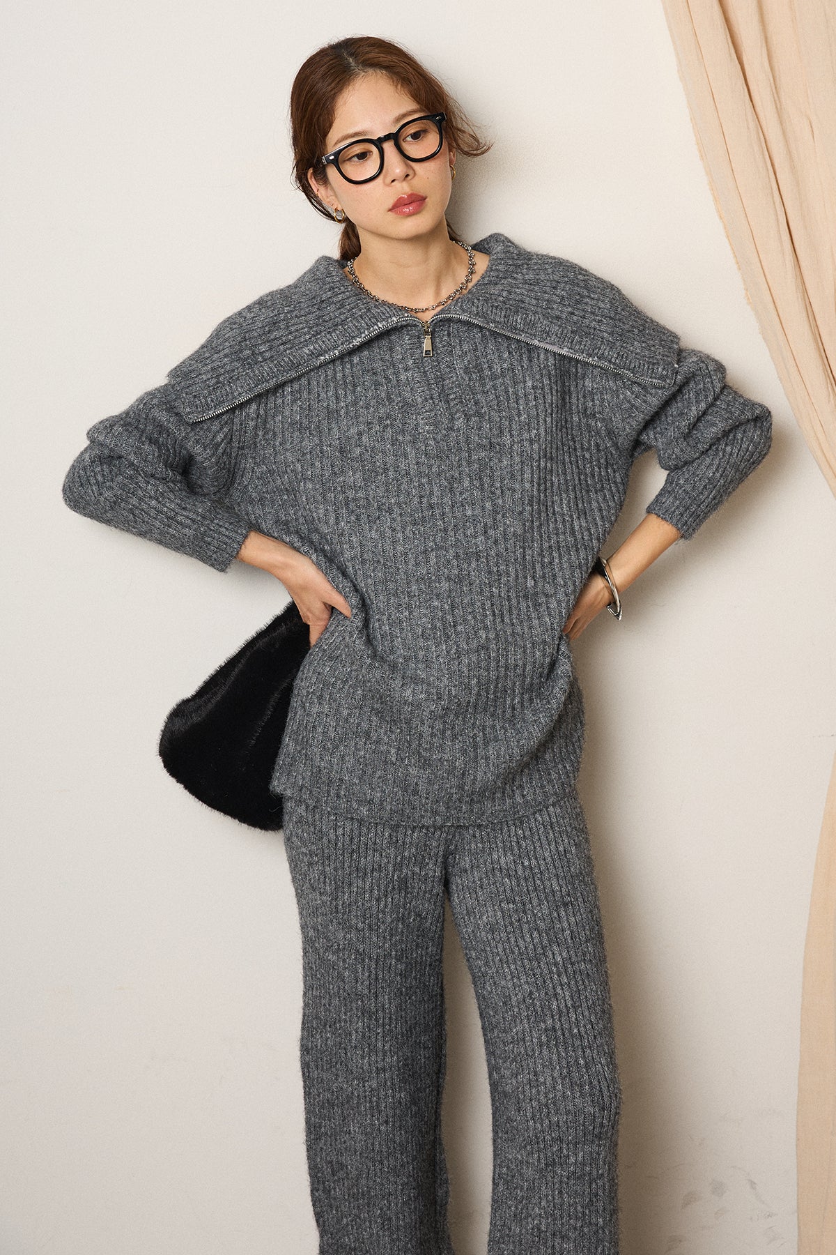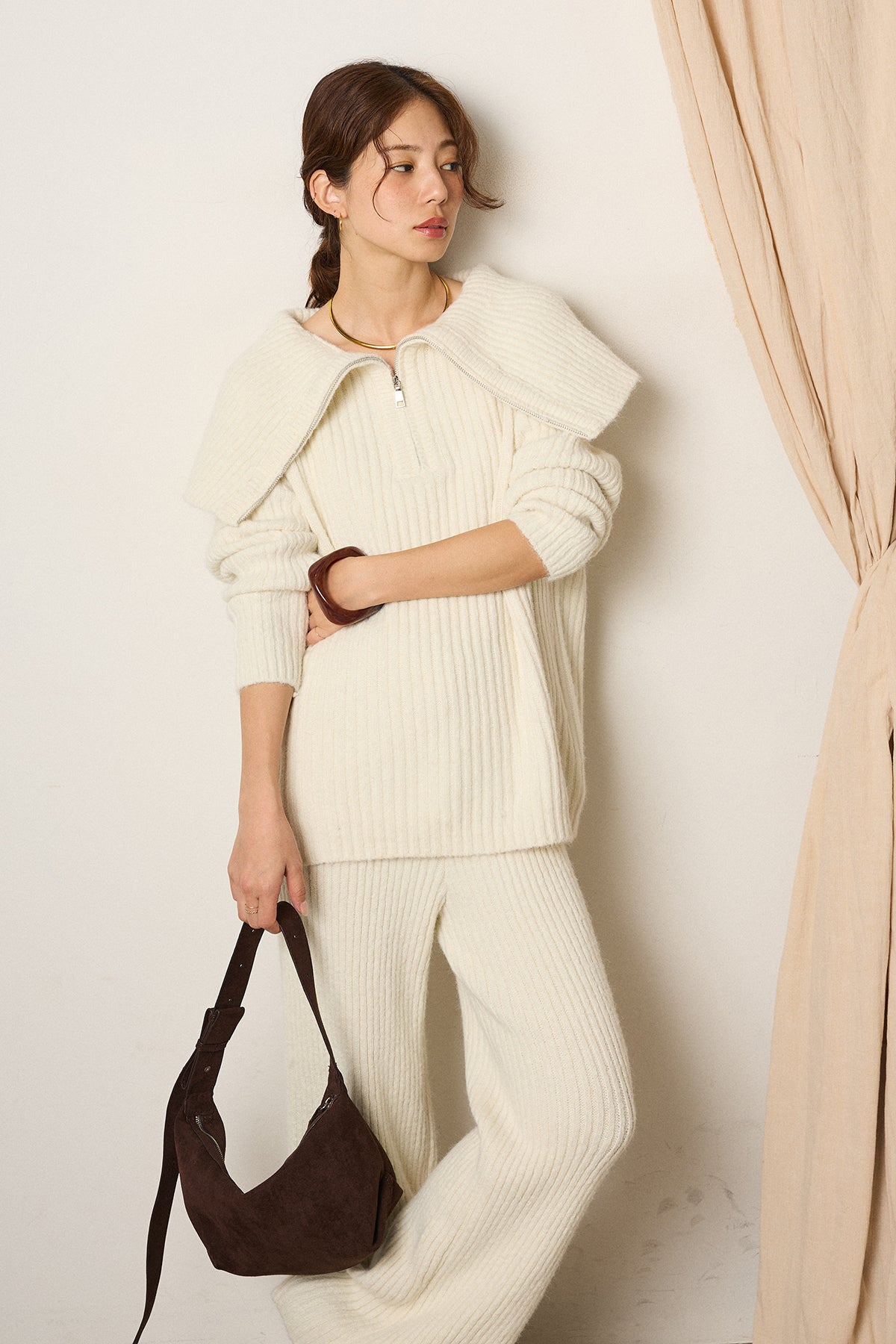大きめの襟が印象的なハーフジップニットとパンツのセットアップ。
