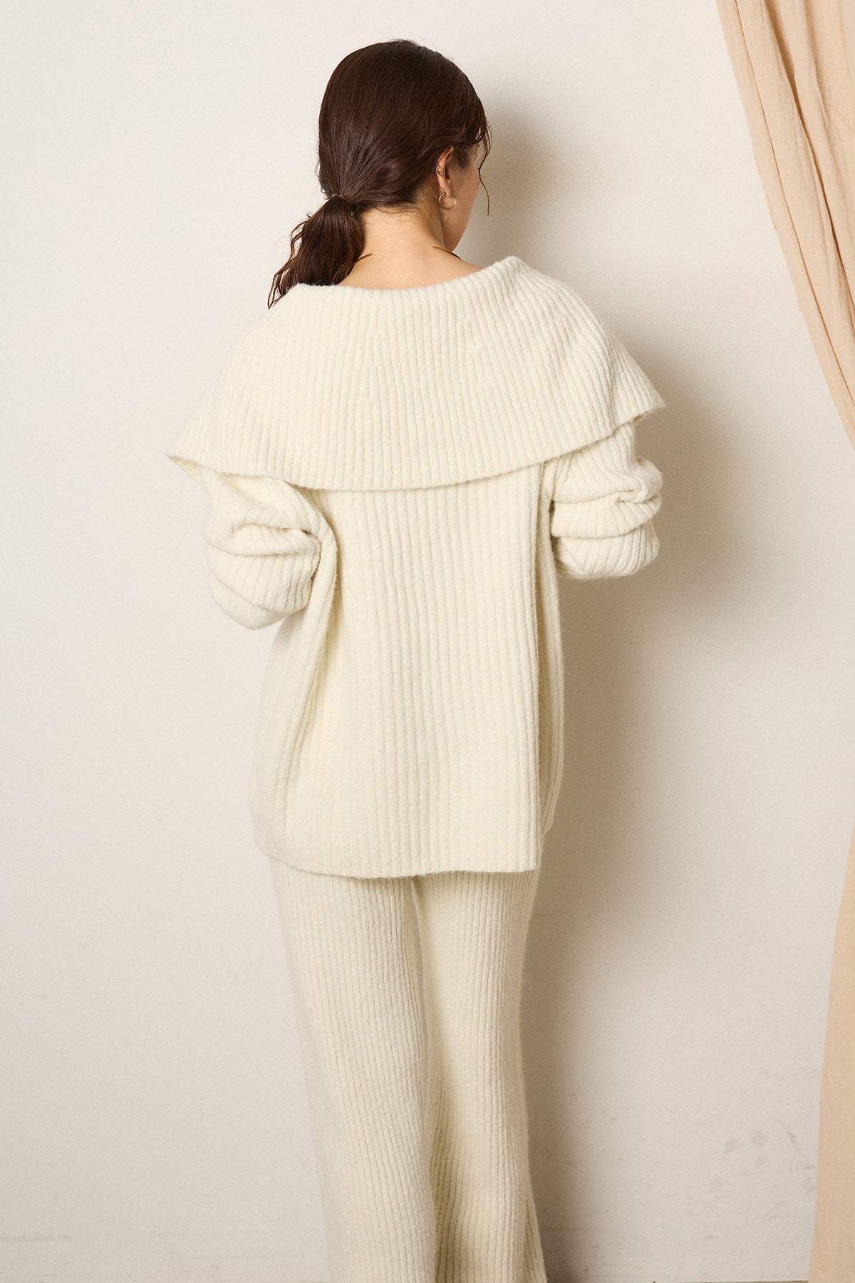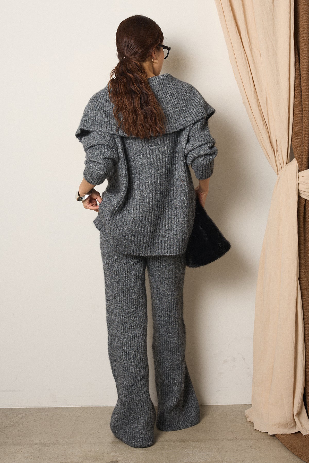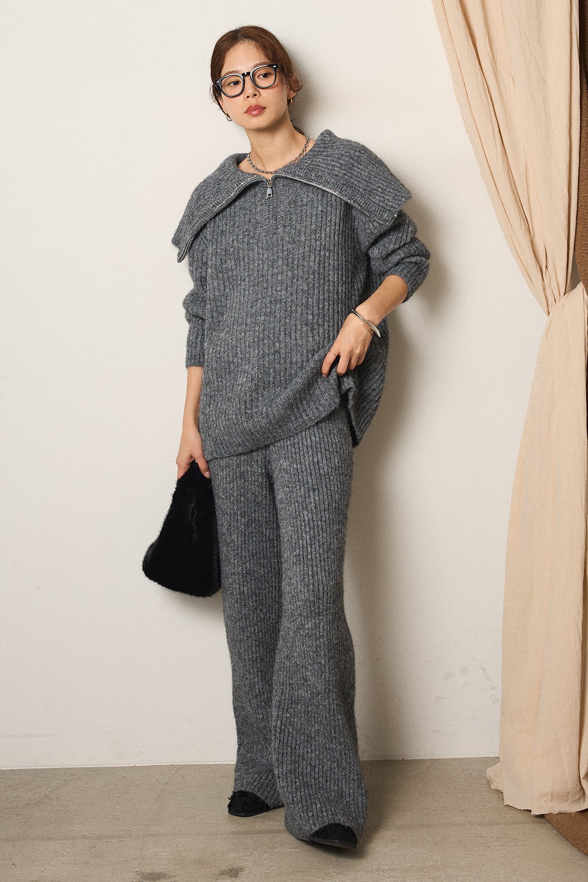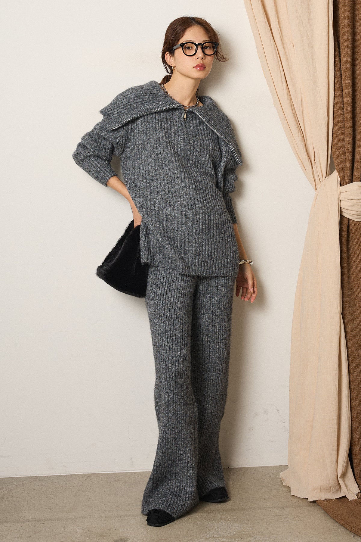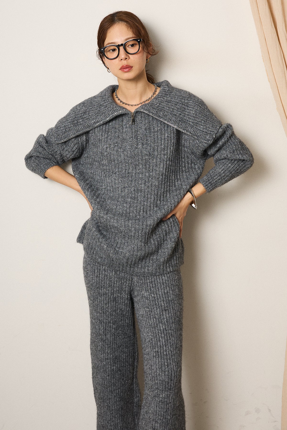 大きめの襟が印象的なハーフジップニットとパンツのセットアップ。