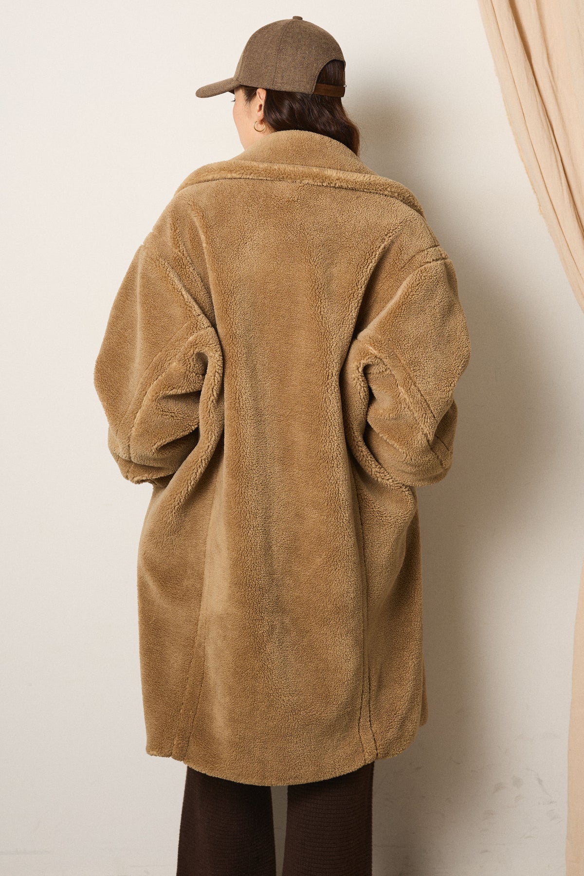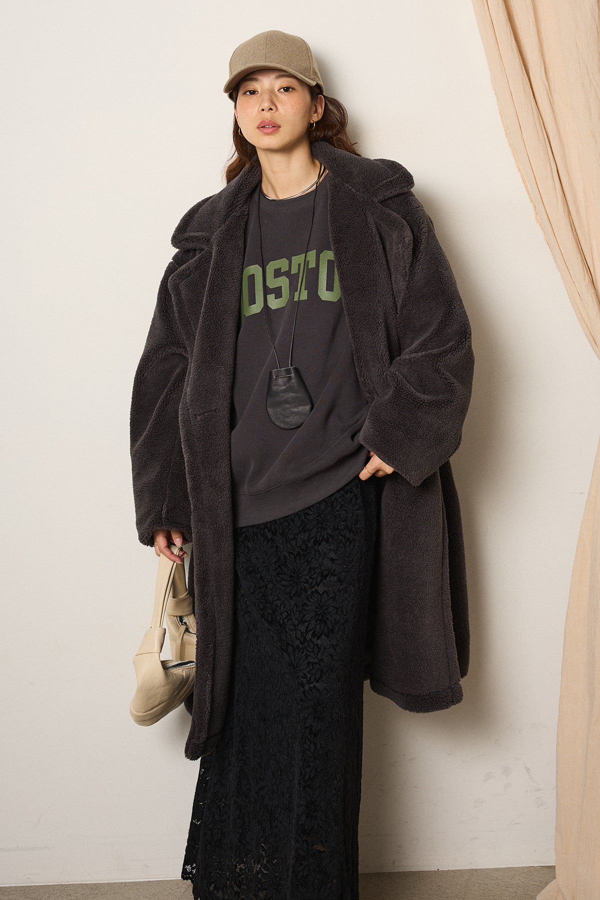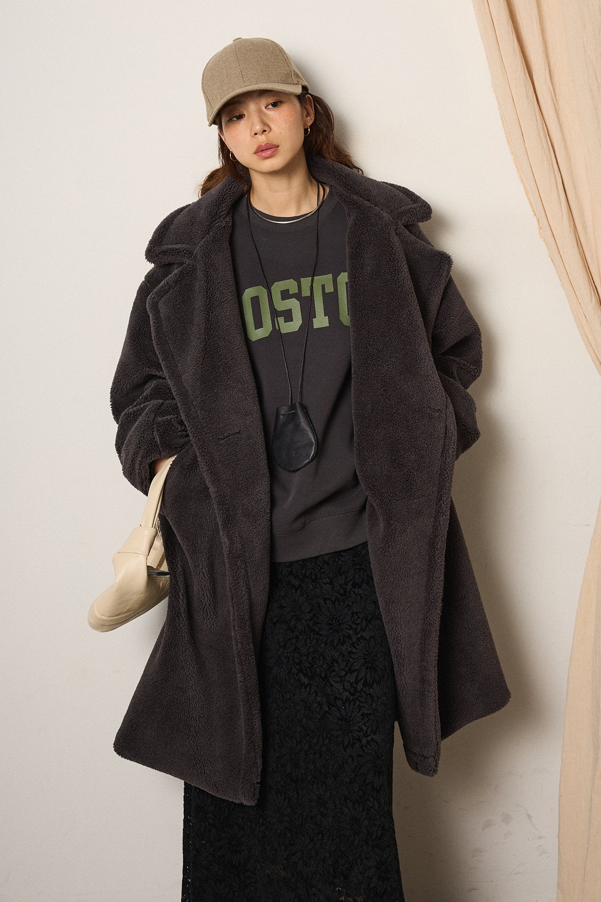 ふんわりとしたボア素材が魅力のテディボアロングコート。 しっかりとした厚みがありながら軽く、あたたかく包み込むような着心地です。 ゆとりのあるシルエットで、厚手のニットやスウェットの上からでもすっきり羽織れるデザイン。 カジュアルにもモードにも合わせやすく、冬の主役アウターとして活躍します。