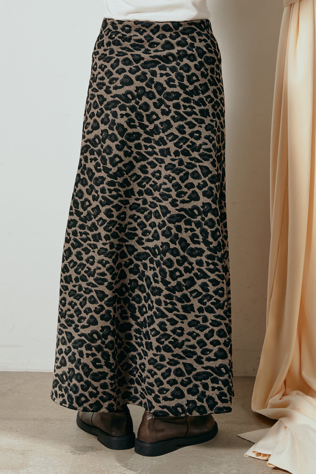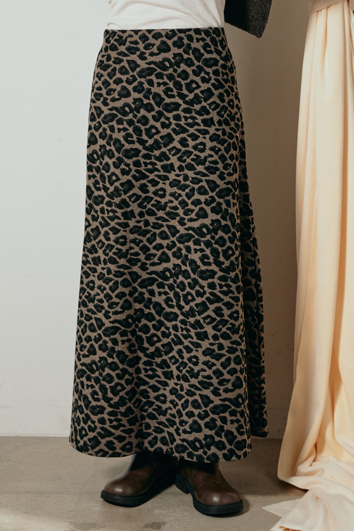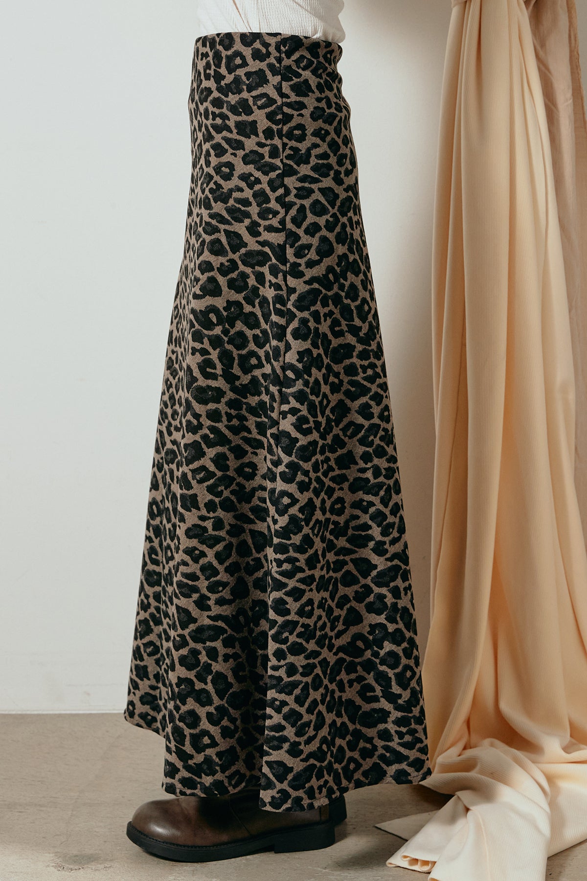 モードな印象を放つレオパードロングスカート。 落ち着いたトーンのレオパード柄が大人の雰囲気を演出し、シンプルなトップスとも好相性。 裾に向かって広がるフレアシルエットが、歩くたびに美しく揺れ、上品な存在感をプラスします。 季節感のある素材で、ニットやブーツと合わせれば秋冬らしい洗練コーデが完成します。