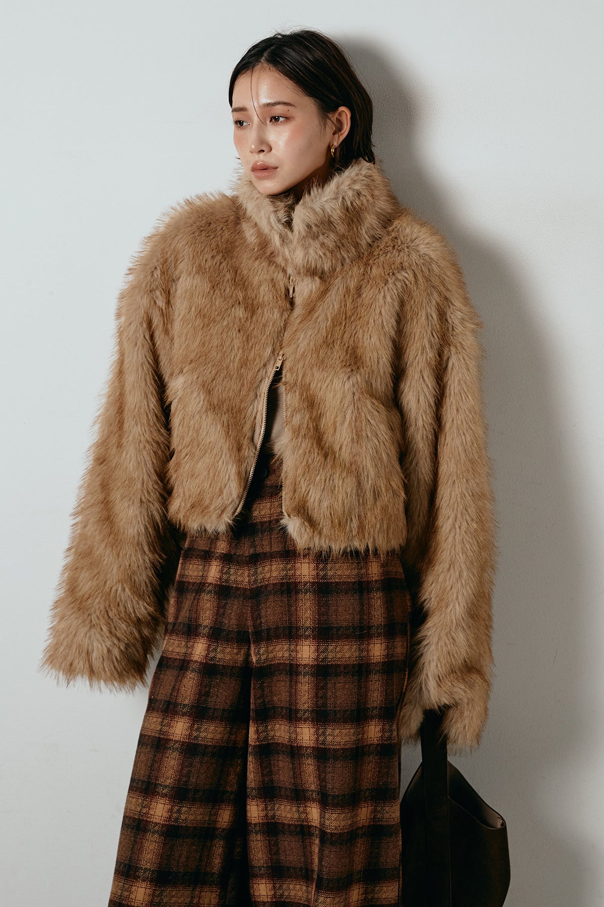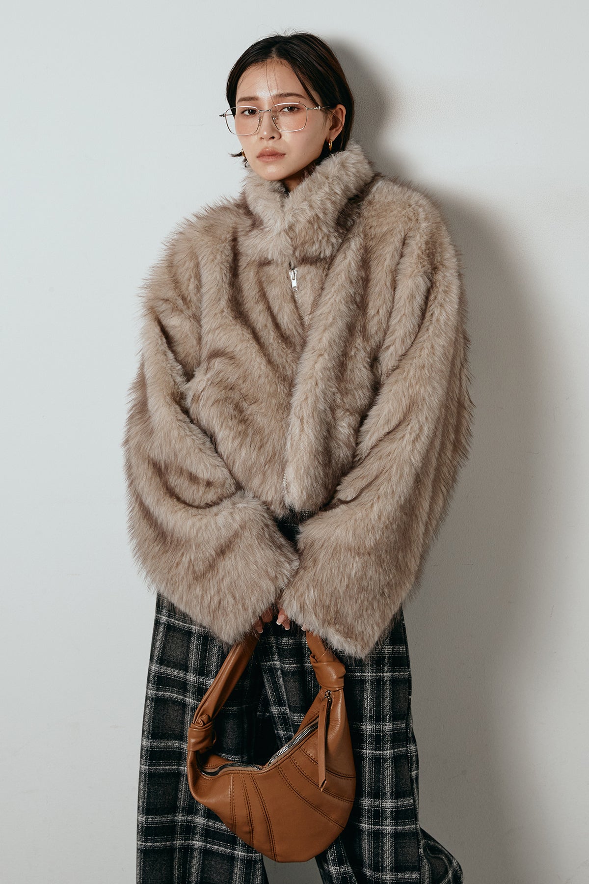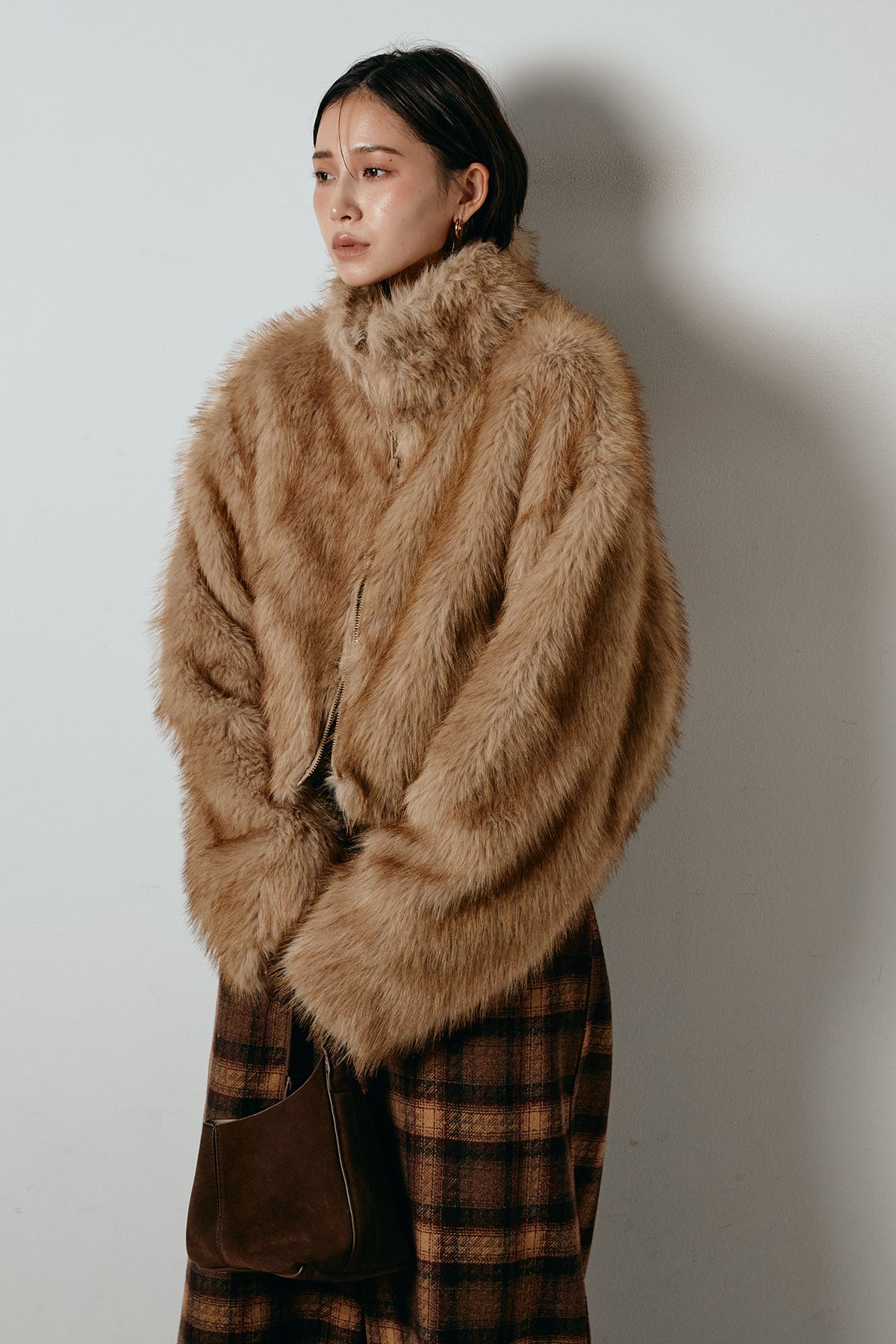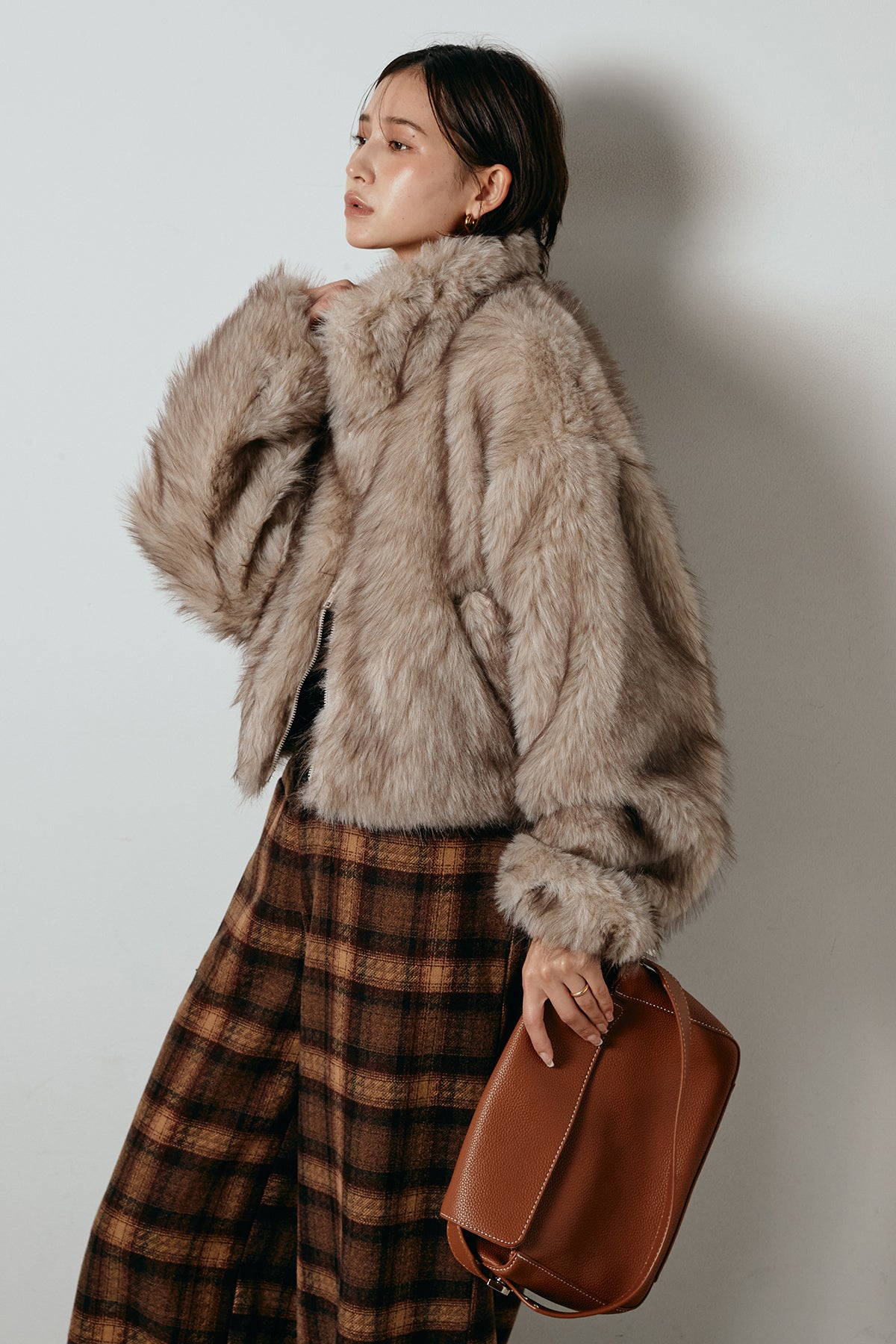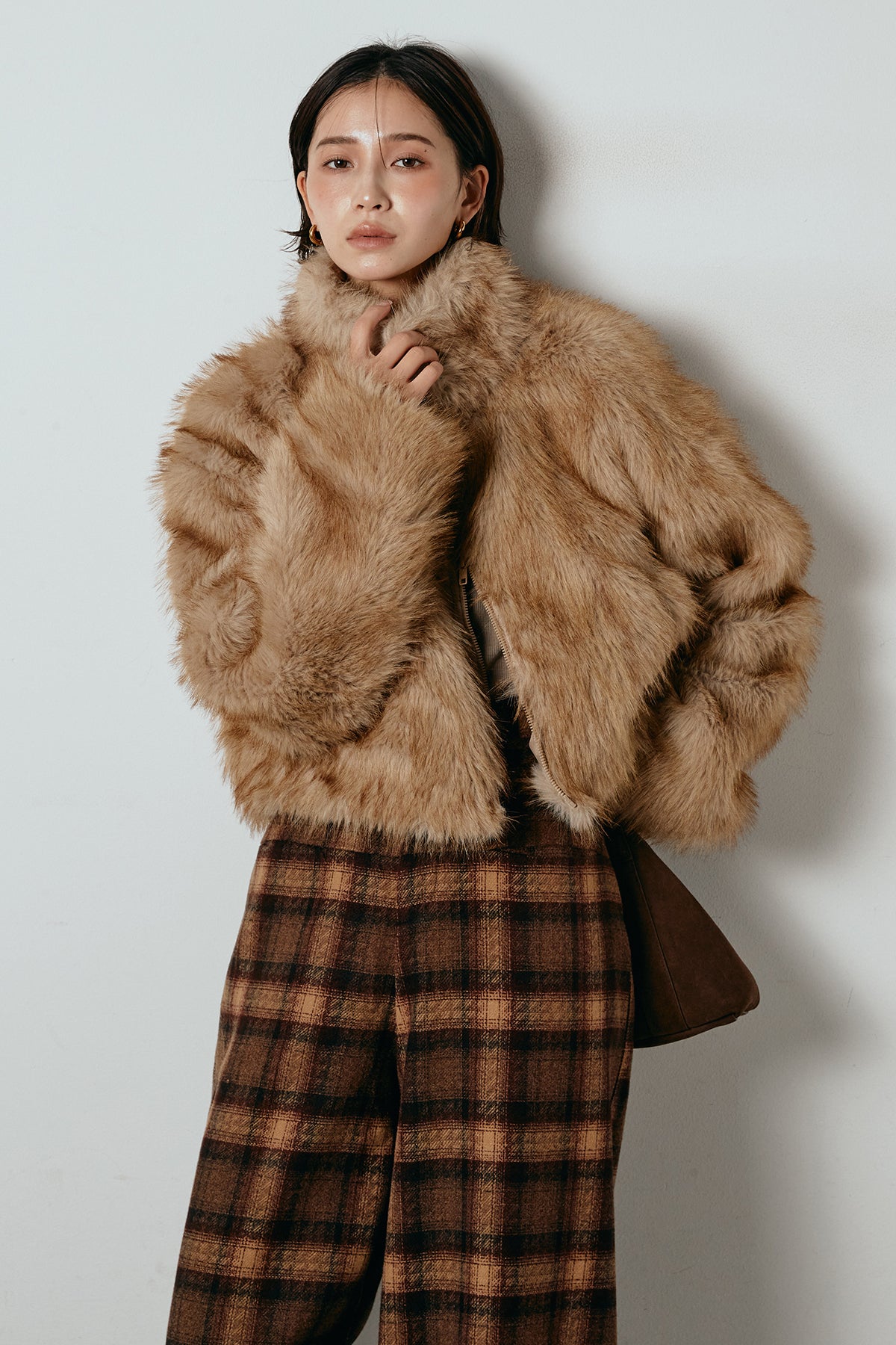 ふんわりとした毛足が魅力のエコファーショート丈ブルゾン。 軽やかな着心地ながら暖かく、ボリューム感のあるフォルムが華やかな印象を与えます。 コンパクトな丈感でバランスが取りやすく、ワイドパンツやロングスカートとも好相性。 シンプルなコーデにプラスするだけで、シーズンムードを引き立てる主役アウターです。