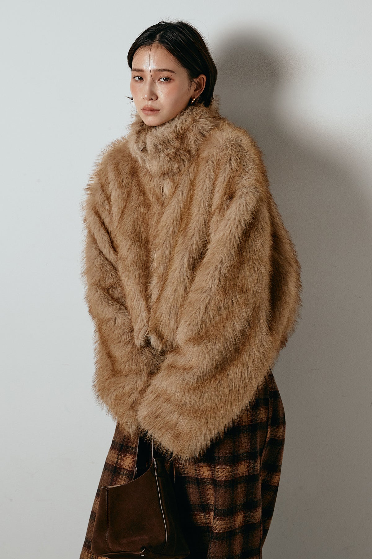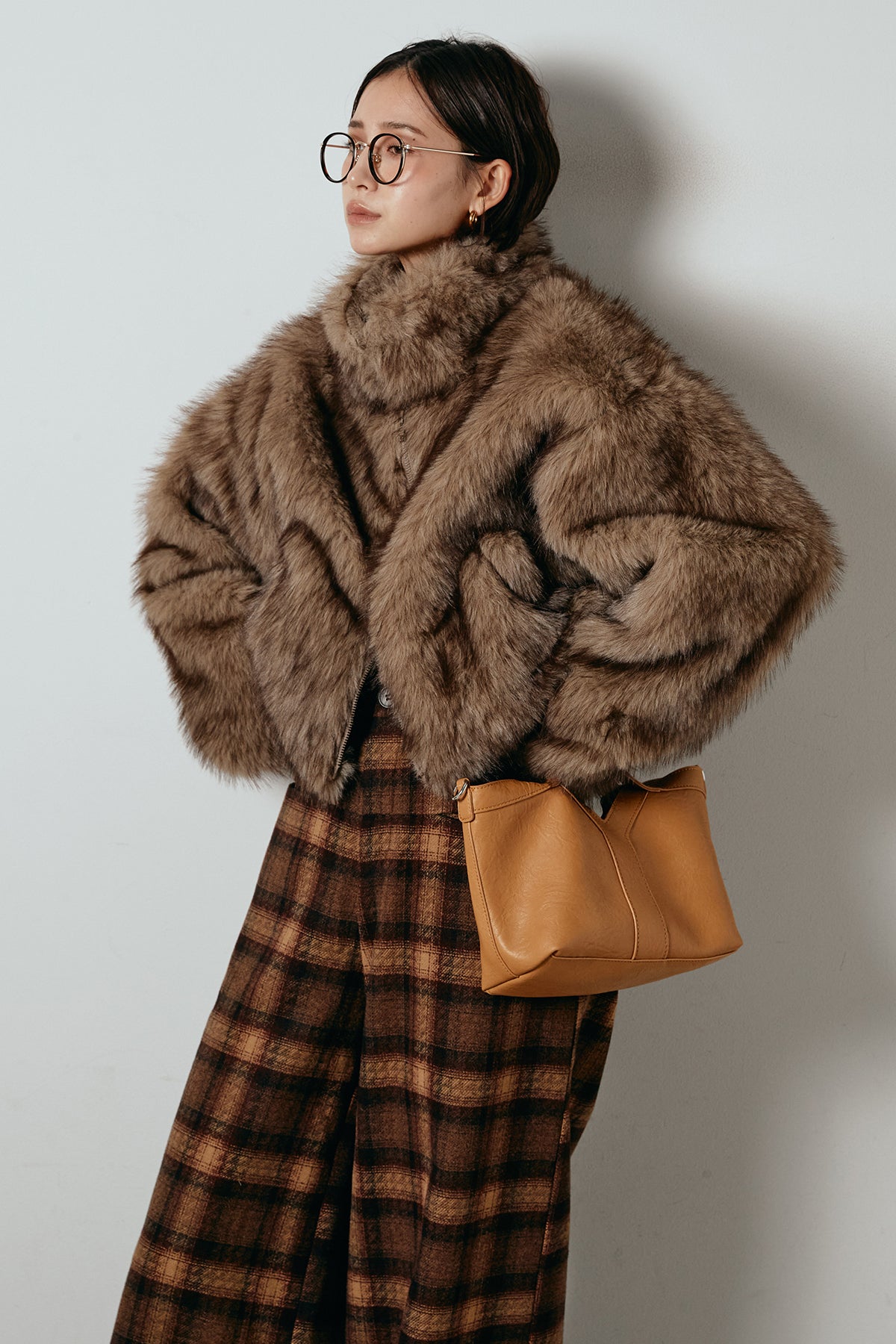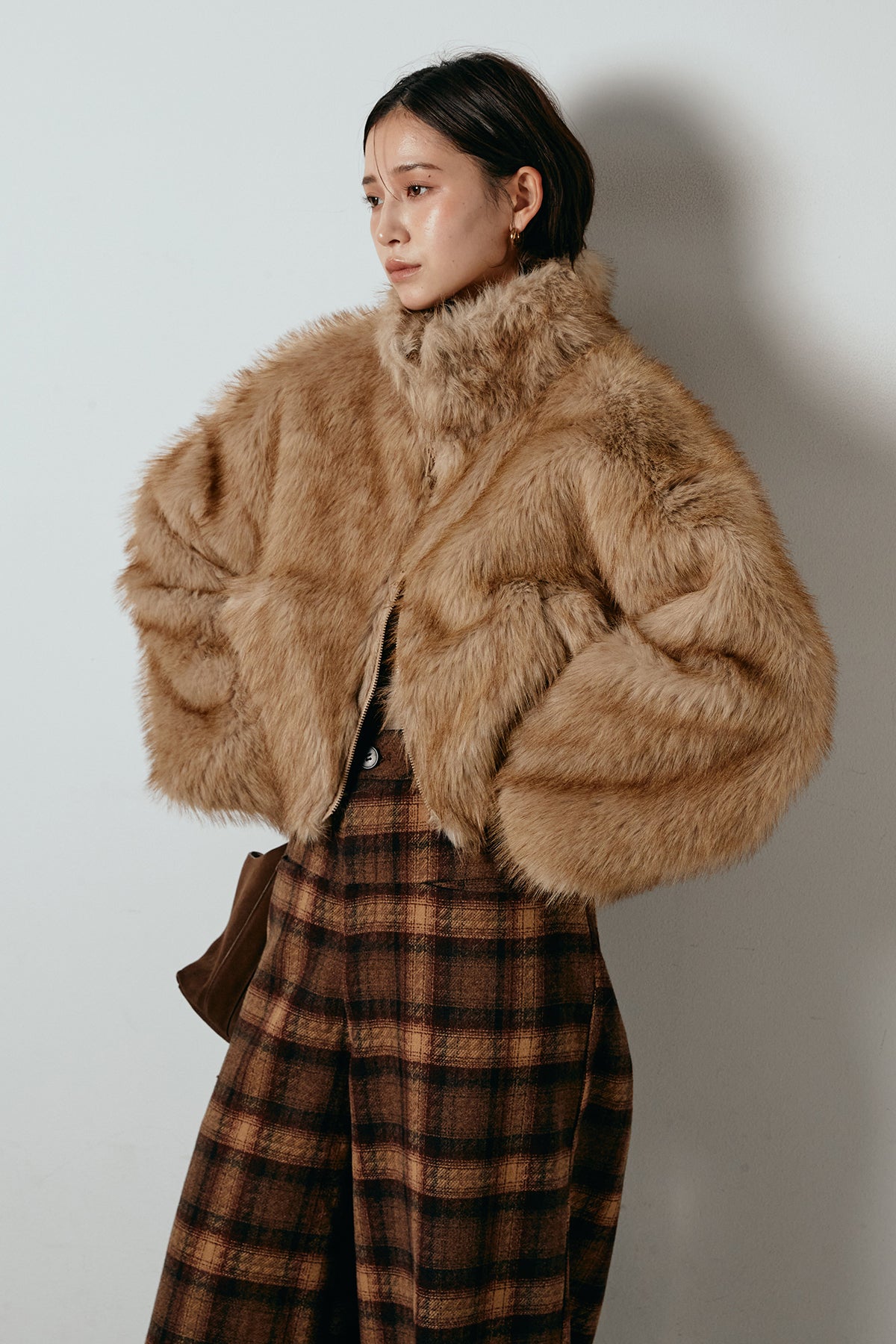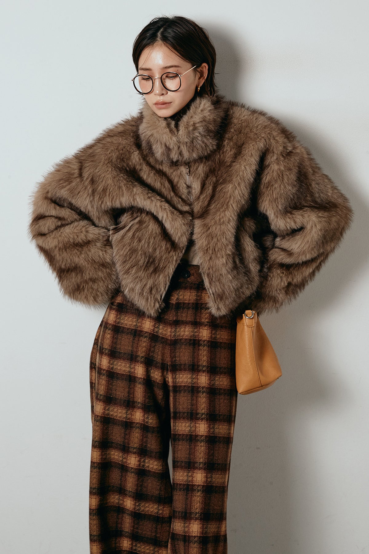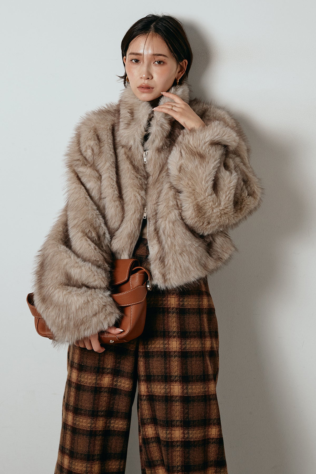 ふんわりとした毛足が魅力のエコファーショート丈ブルゾン。 軽やかな着心地ながら暖かく、ボリューム感のあるフォルムが華やかな印象を与えます。 コンパクトな丈感でバランスが取りやすく、ワイドパンツやロングスカートとも好相性。 シンプルなコーデにプラスするだけで、シーズンムードを引き立てる主役アウターです。