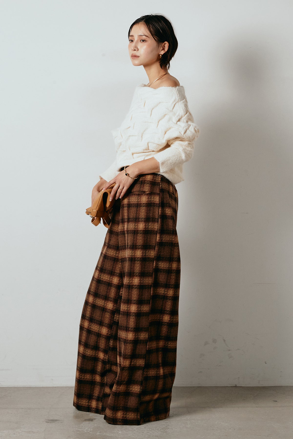 暖かみのある素材感で季節感を演出しつつ、シンプルなトップスと合わせるだけで存在感のあるスタイルに。