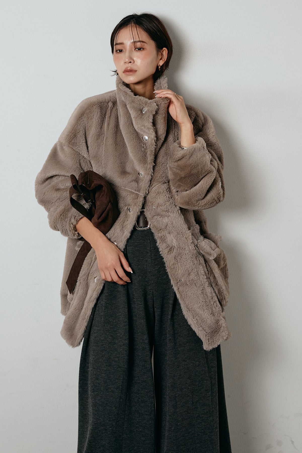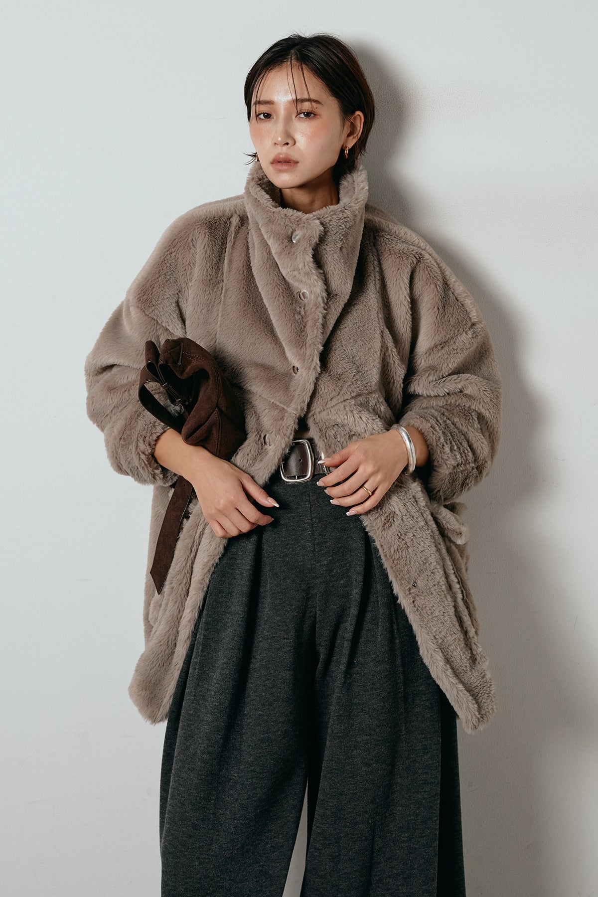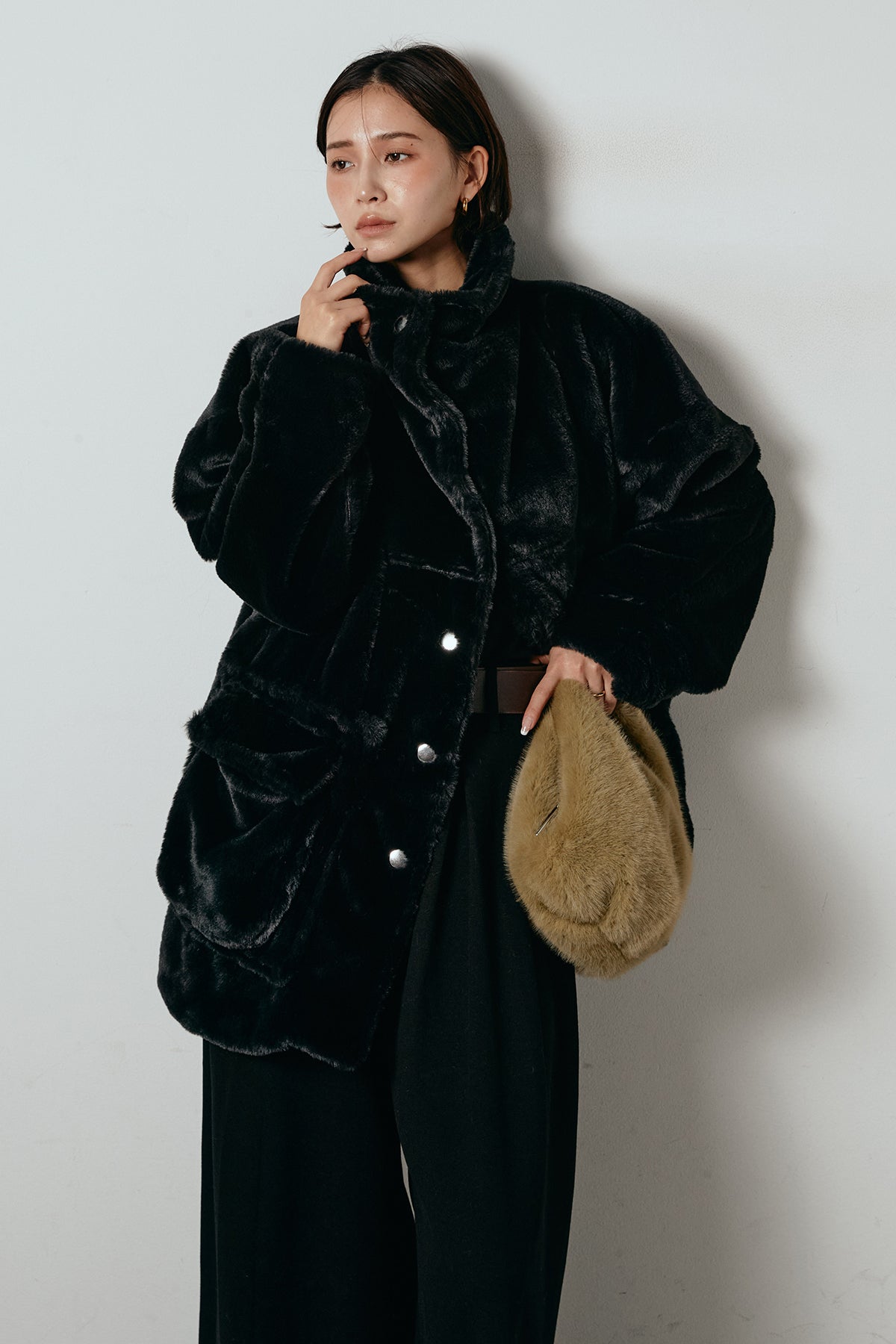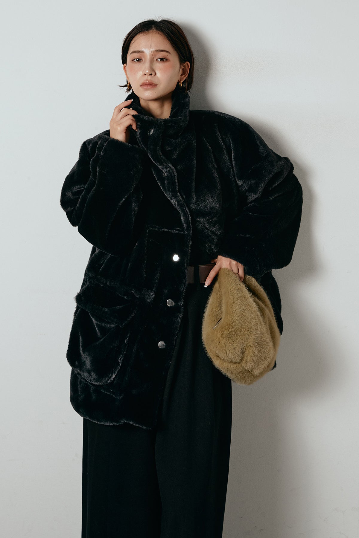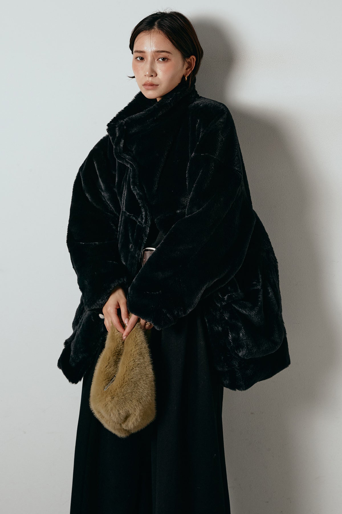 ふんわりとしたボリュームが魅力のスタンドネックファーコート。