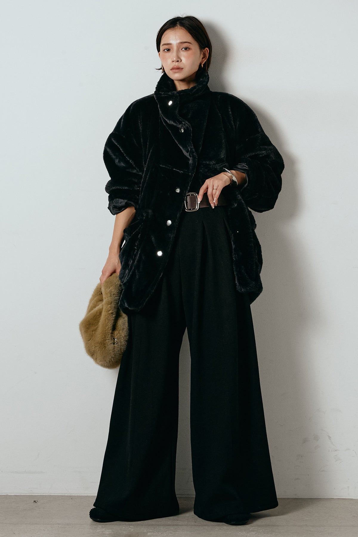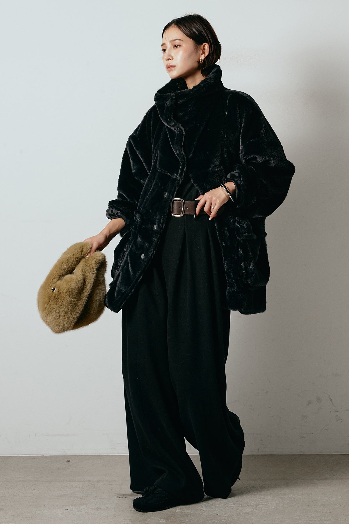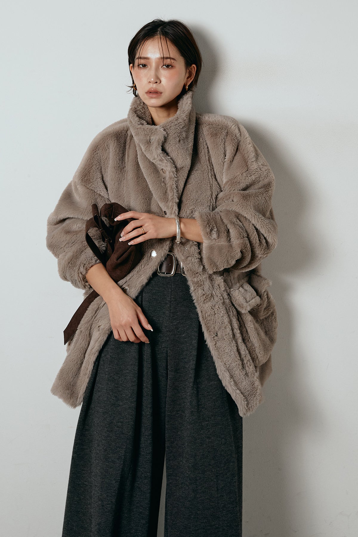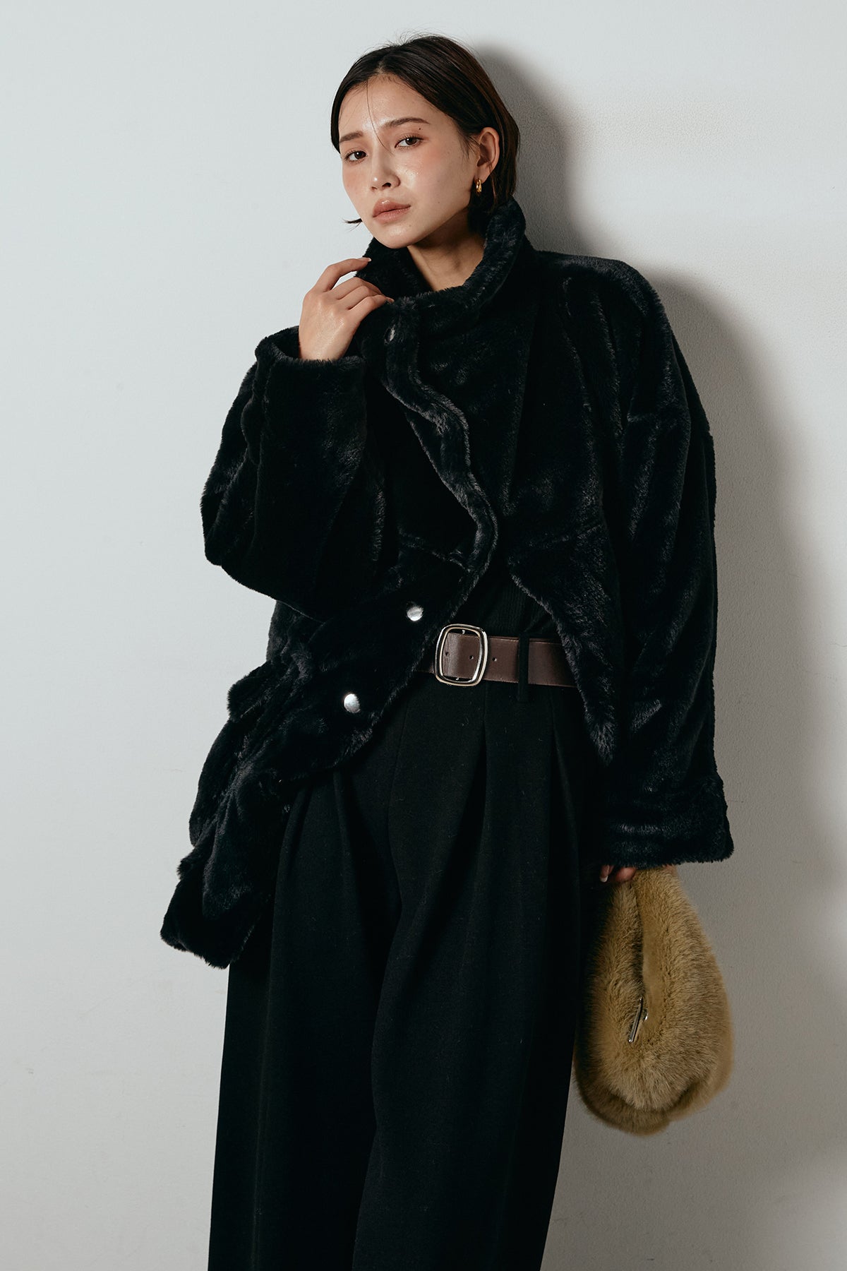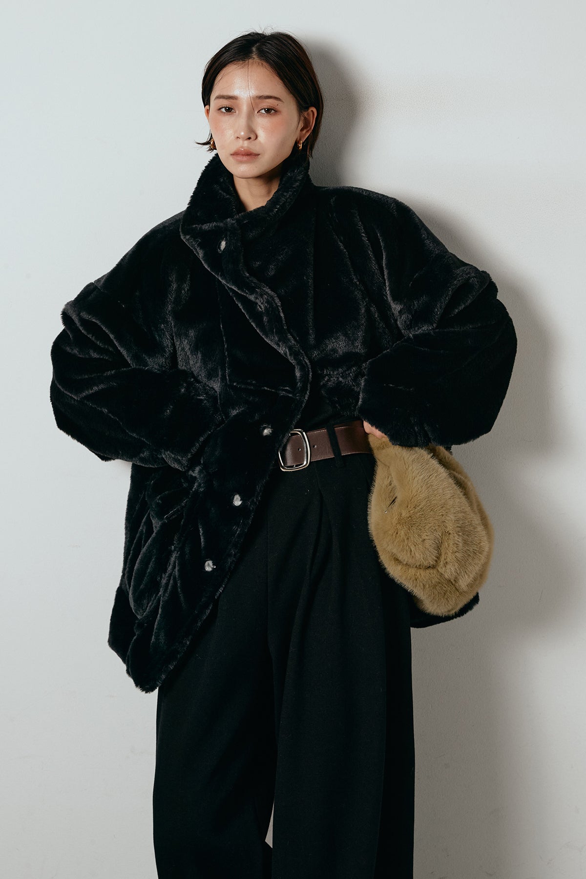 ふんわりとしたボリュームが魅力のスタンドネックファーコート。