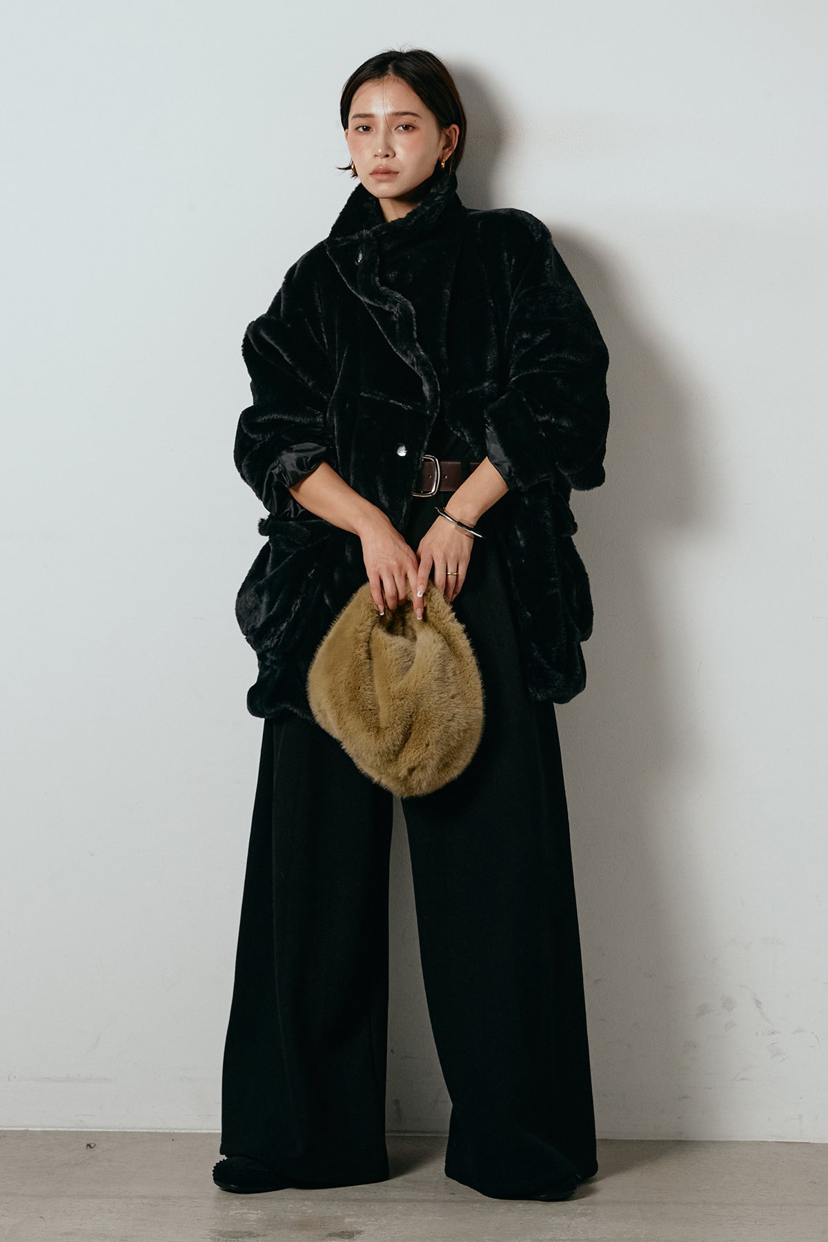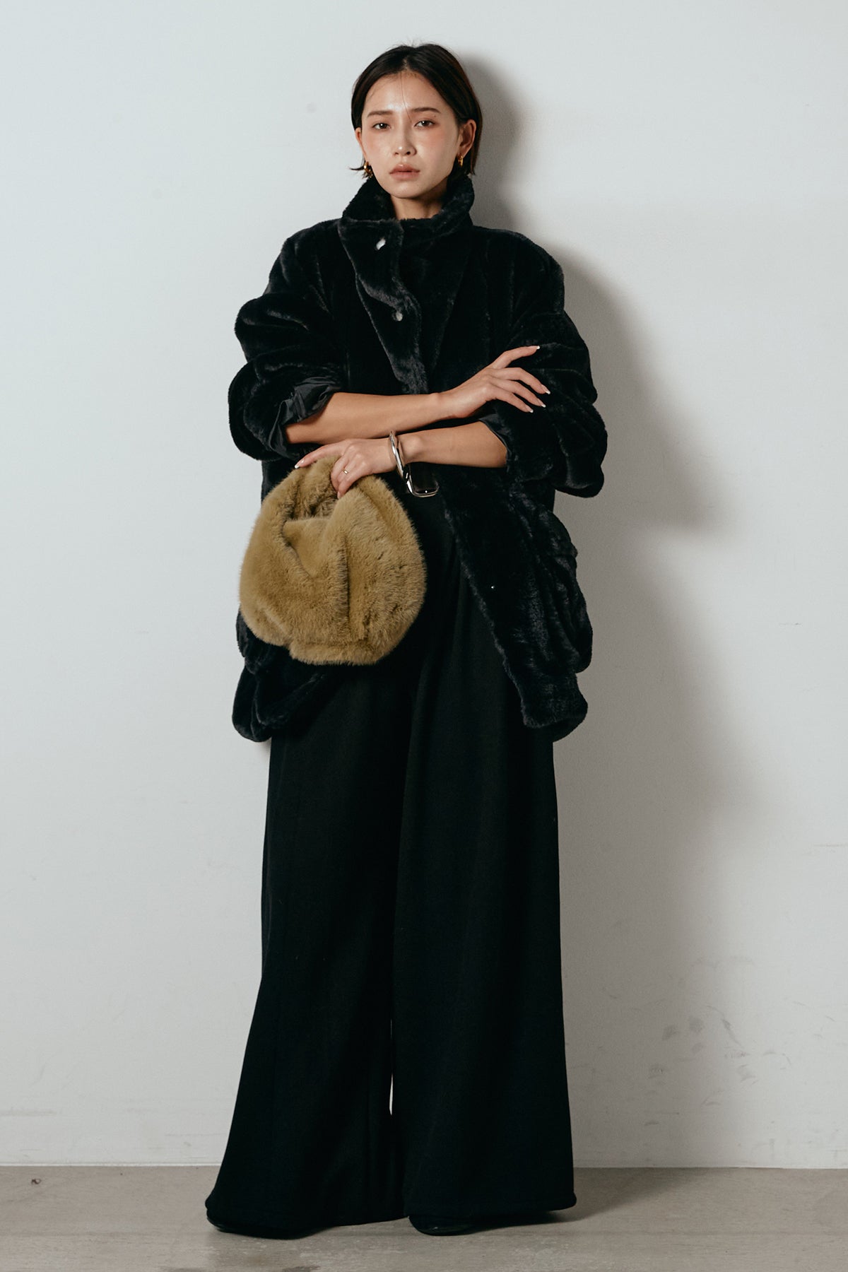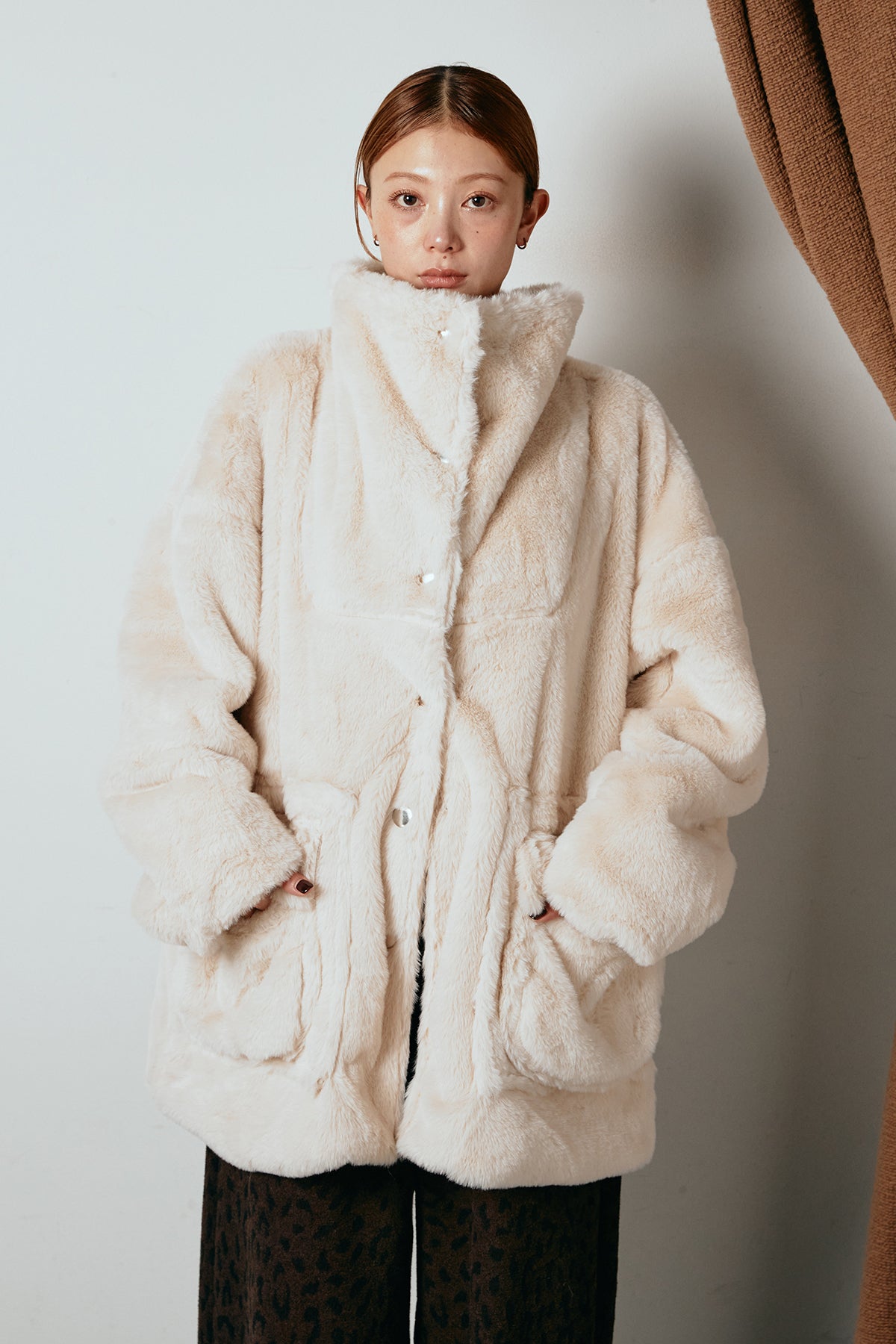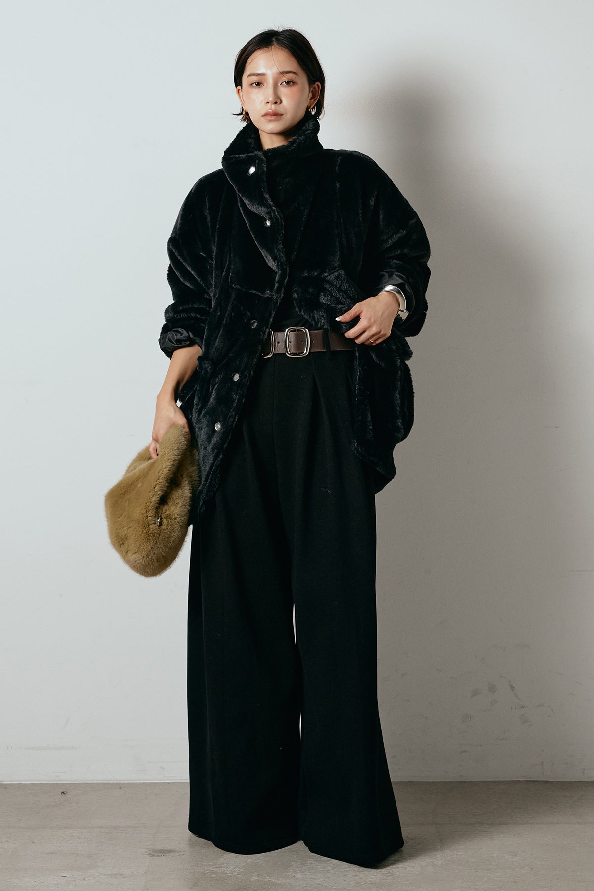 ふんわりとしたボリュームが魅力のスタンドネックファーコート。