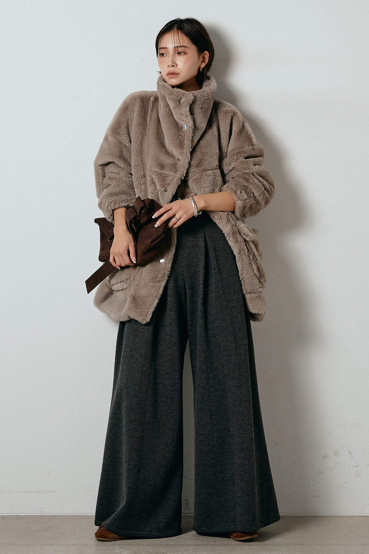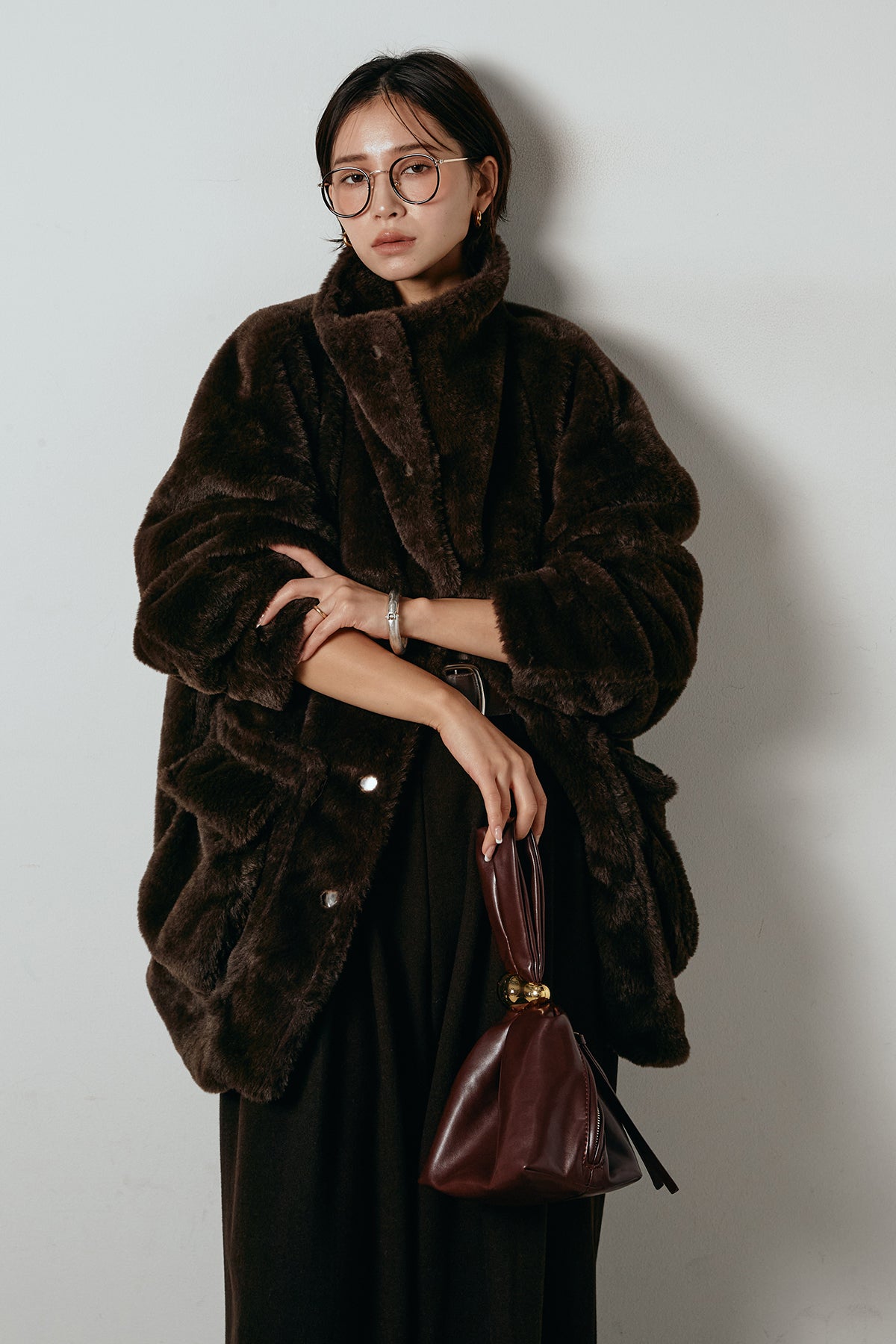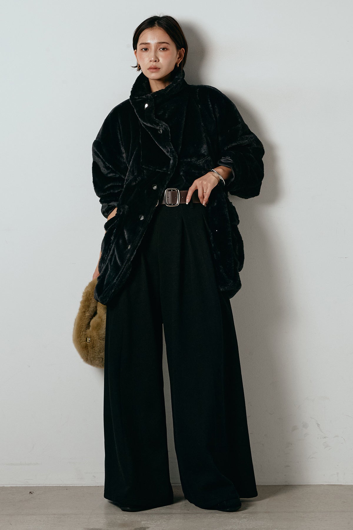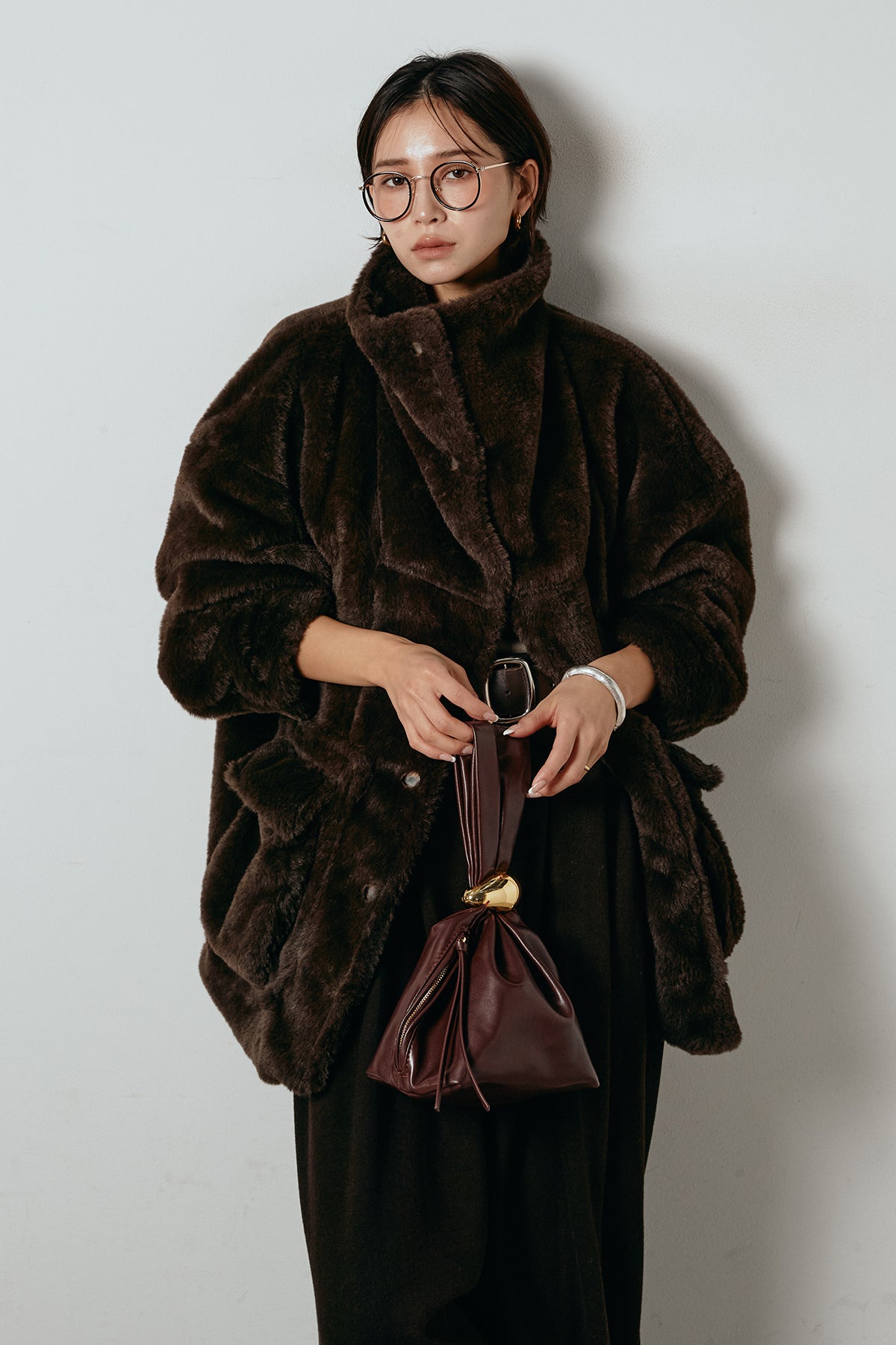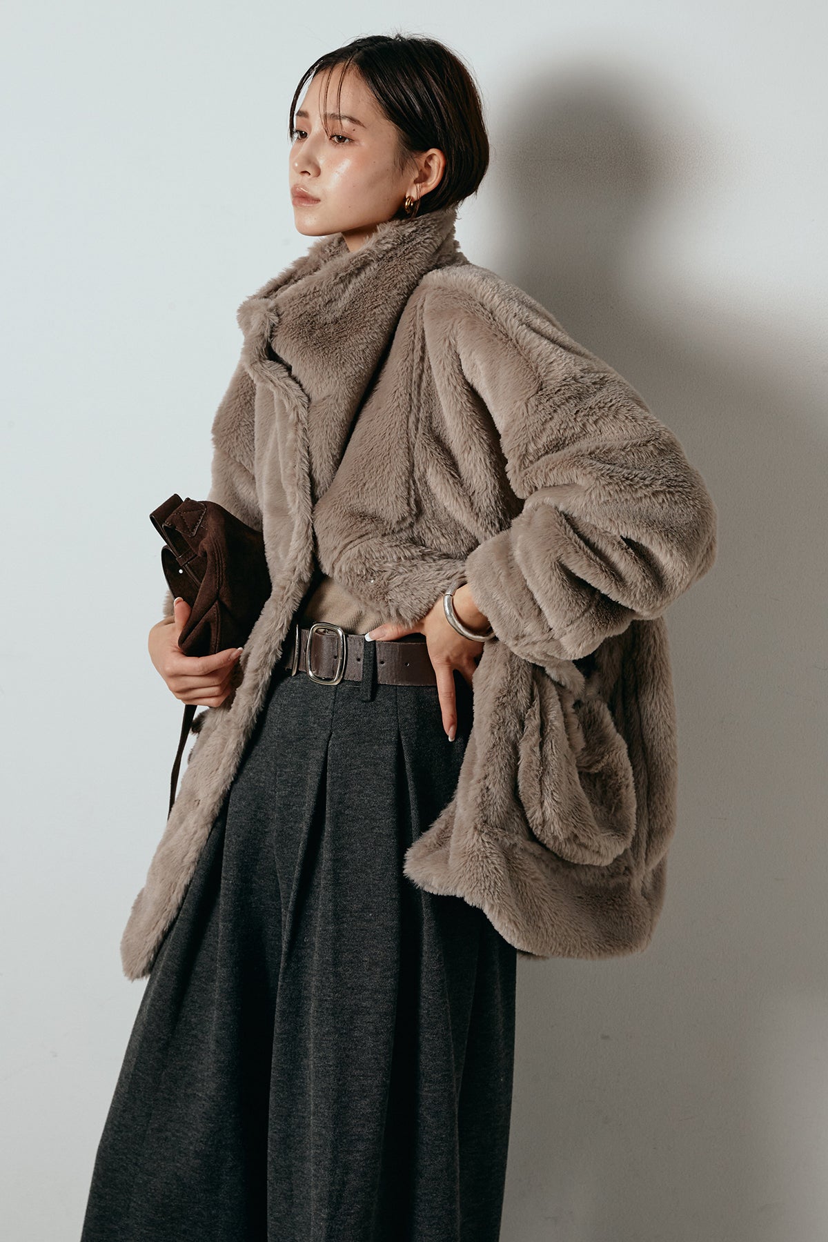 ふんわりとしたボリュームが魅力のスタンドネックファーコート。