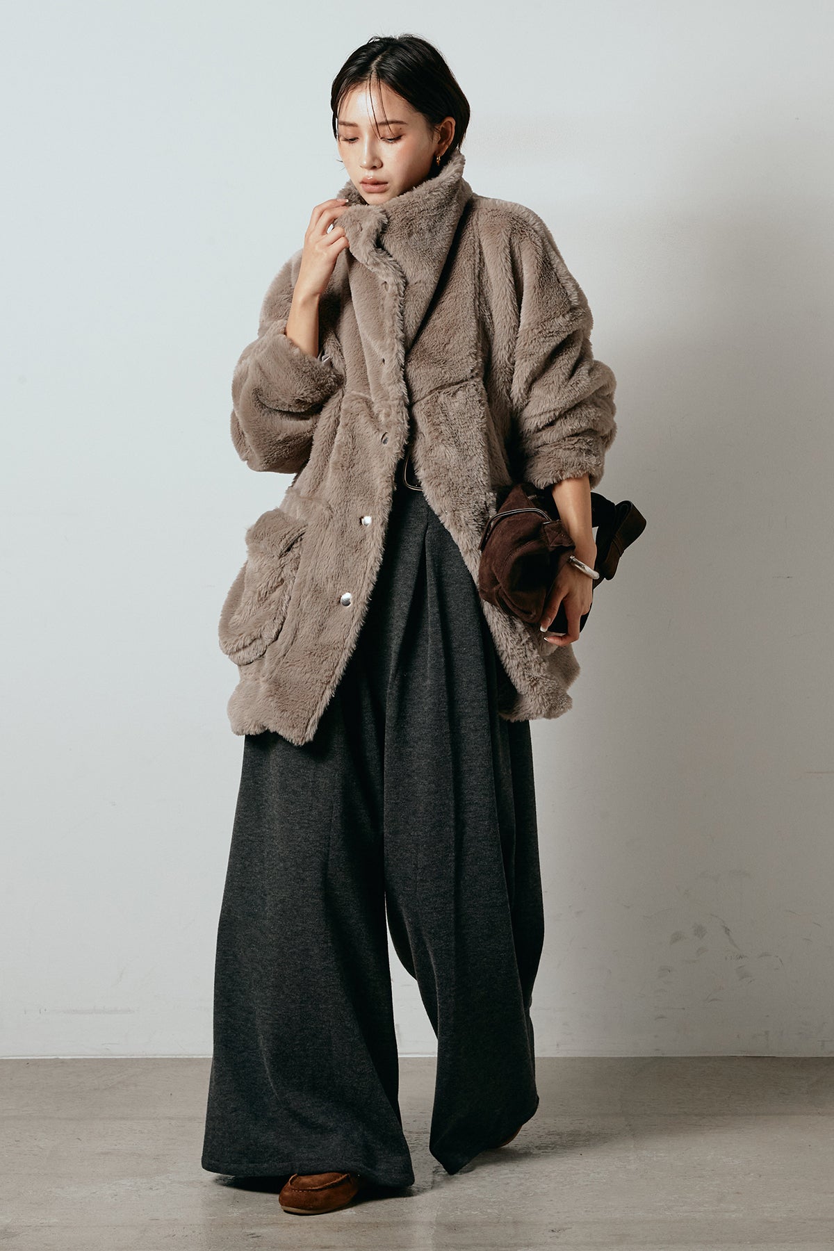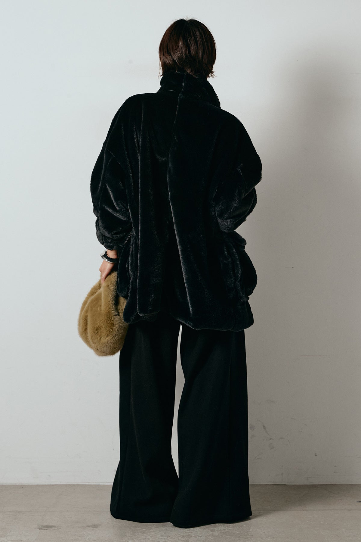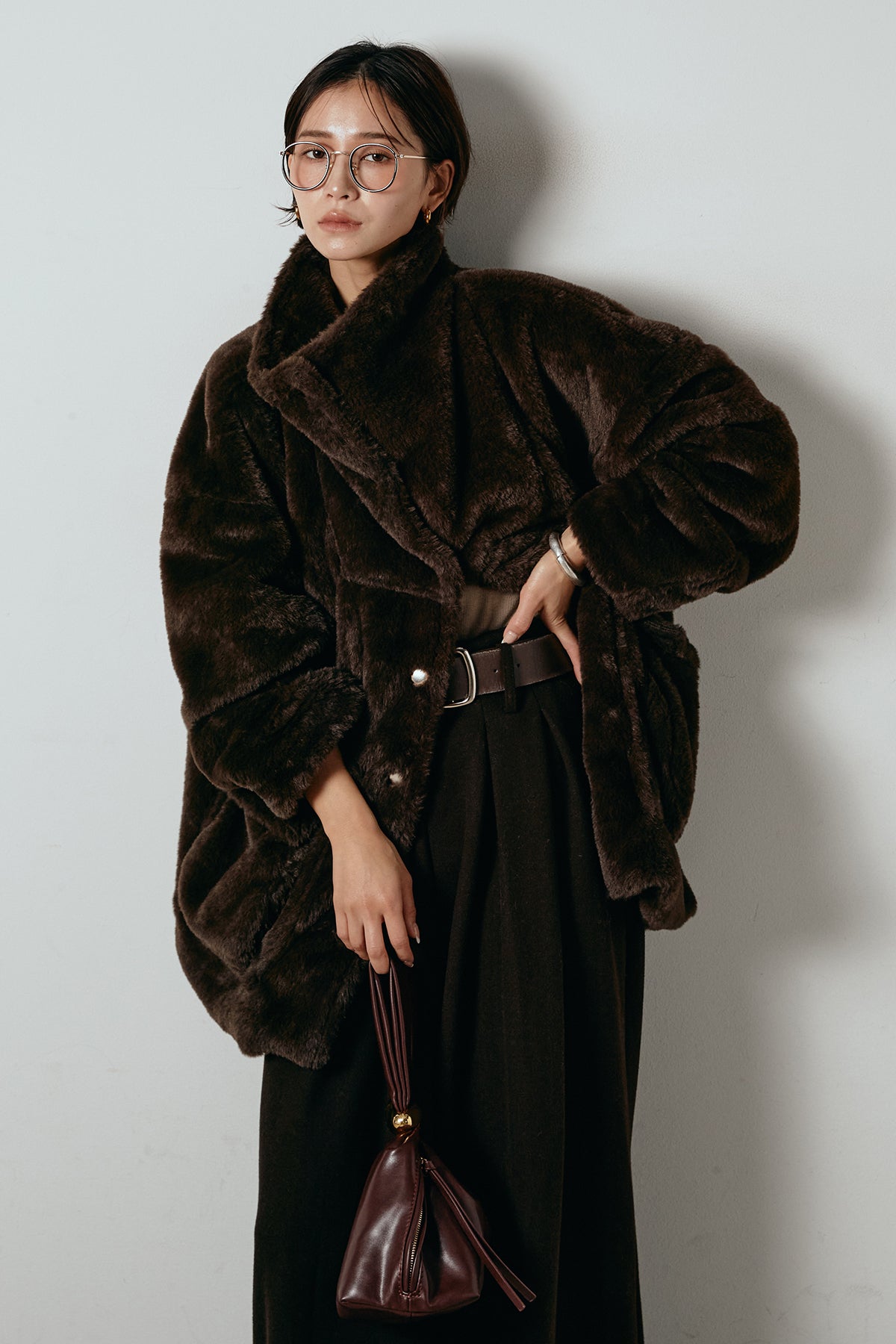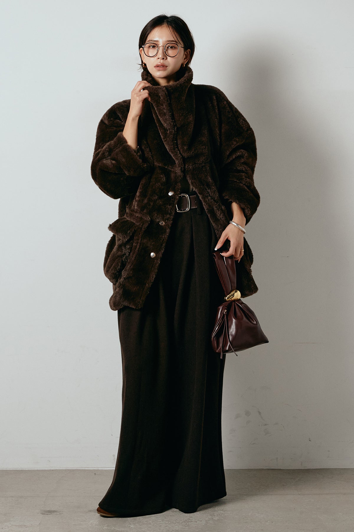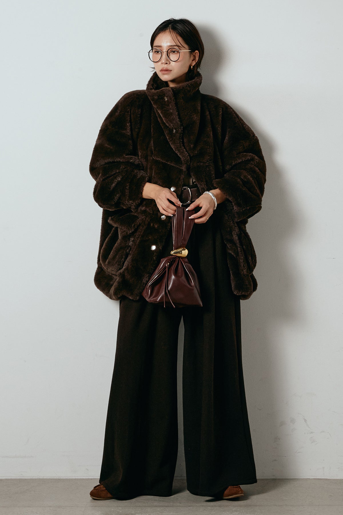 ふんわりとしたボリュームが魅力のスタンドネックファーコート。