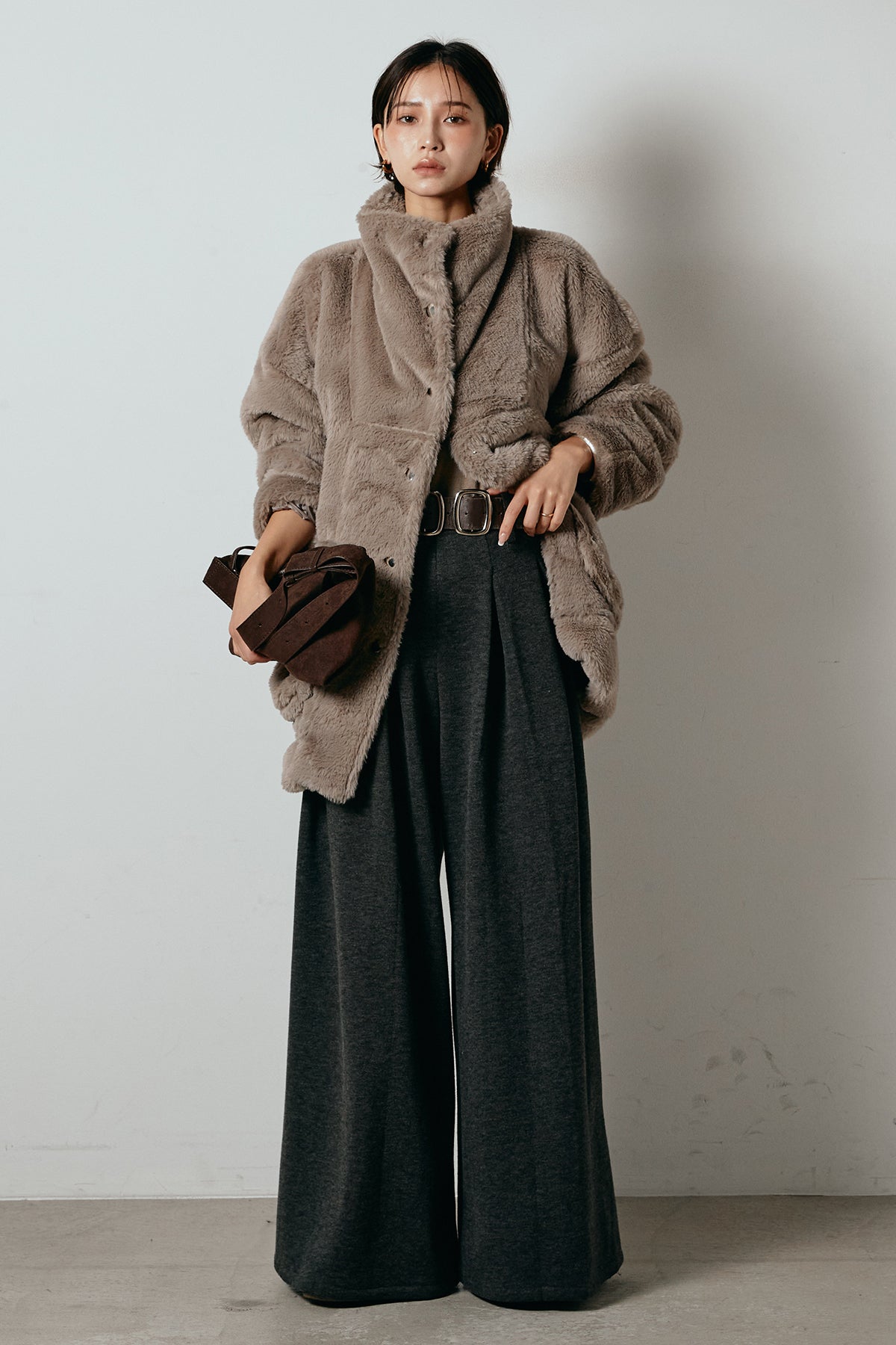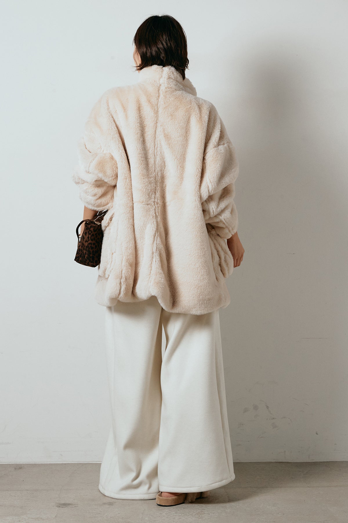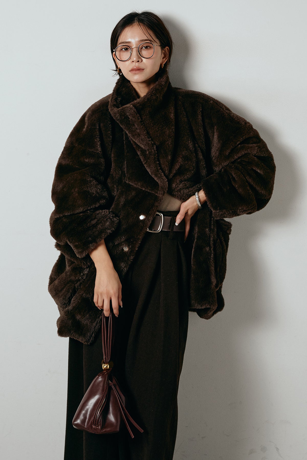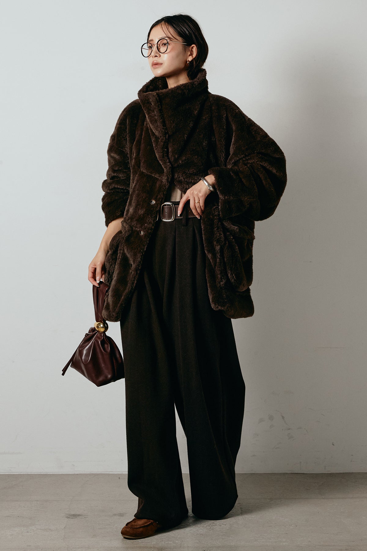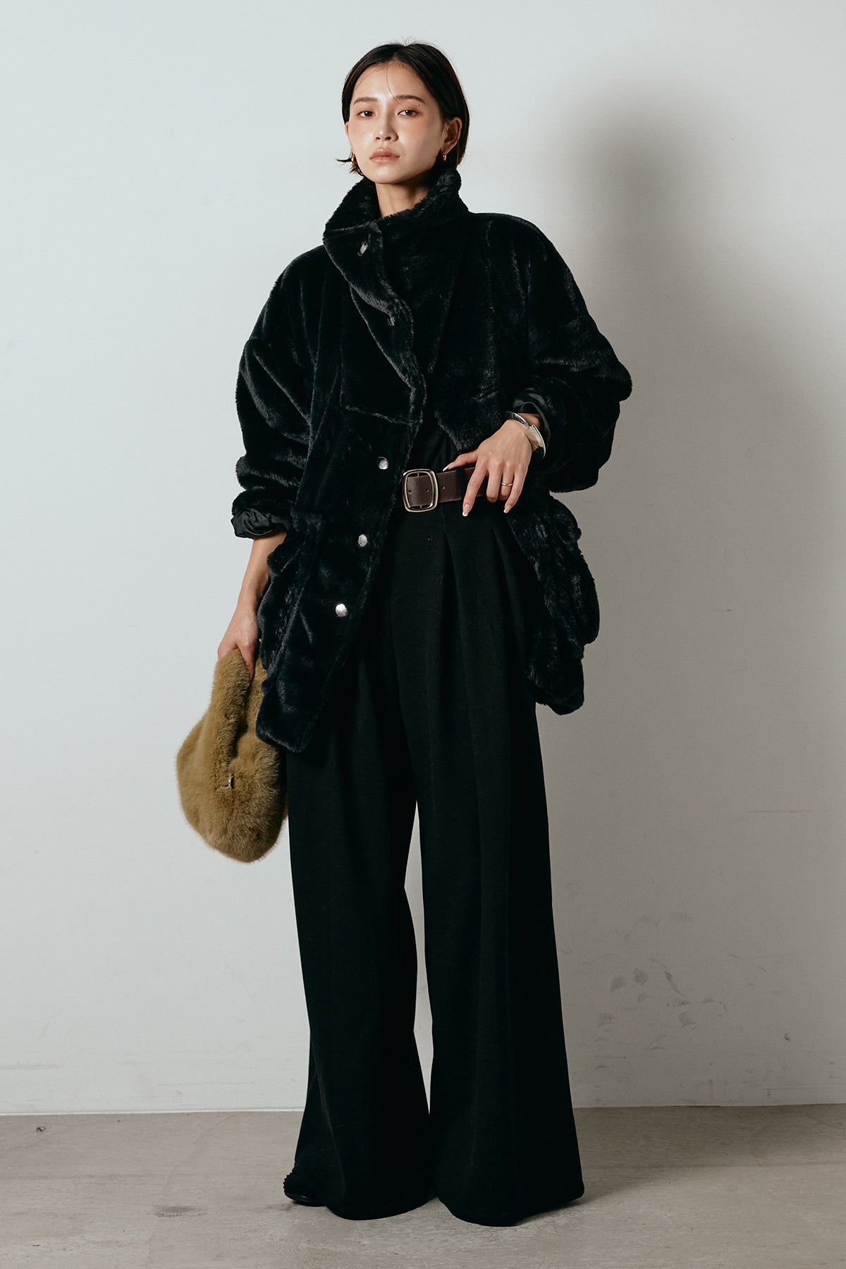 ふんわりとしたボリュームが魅力のスタンドネックファーコート。