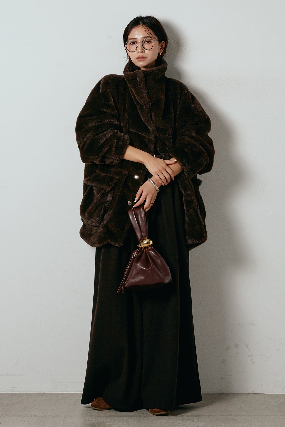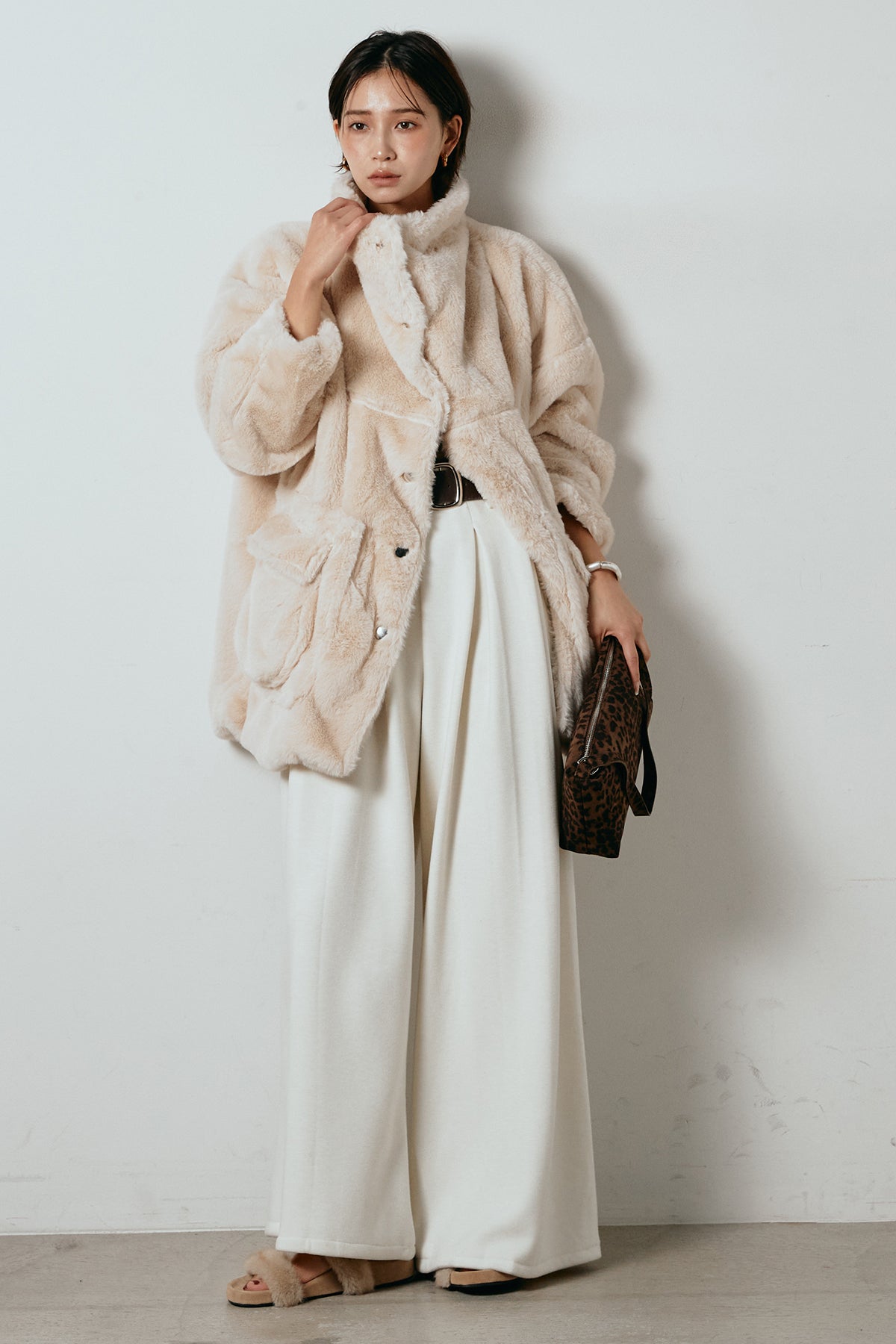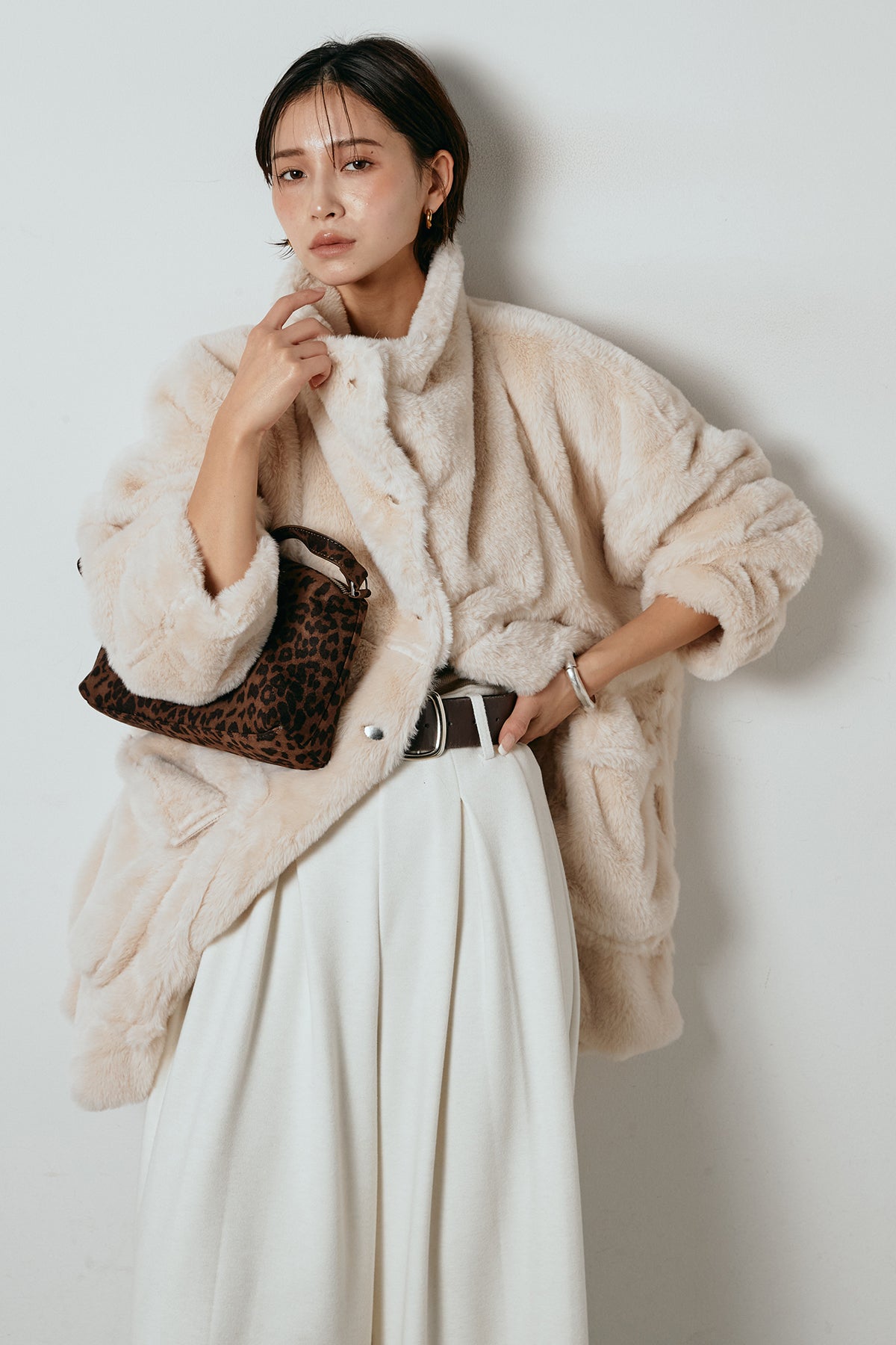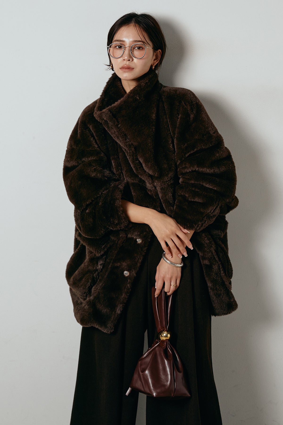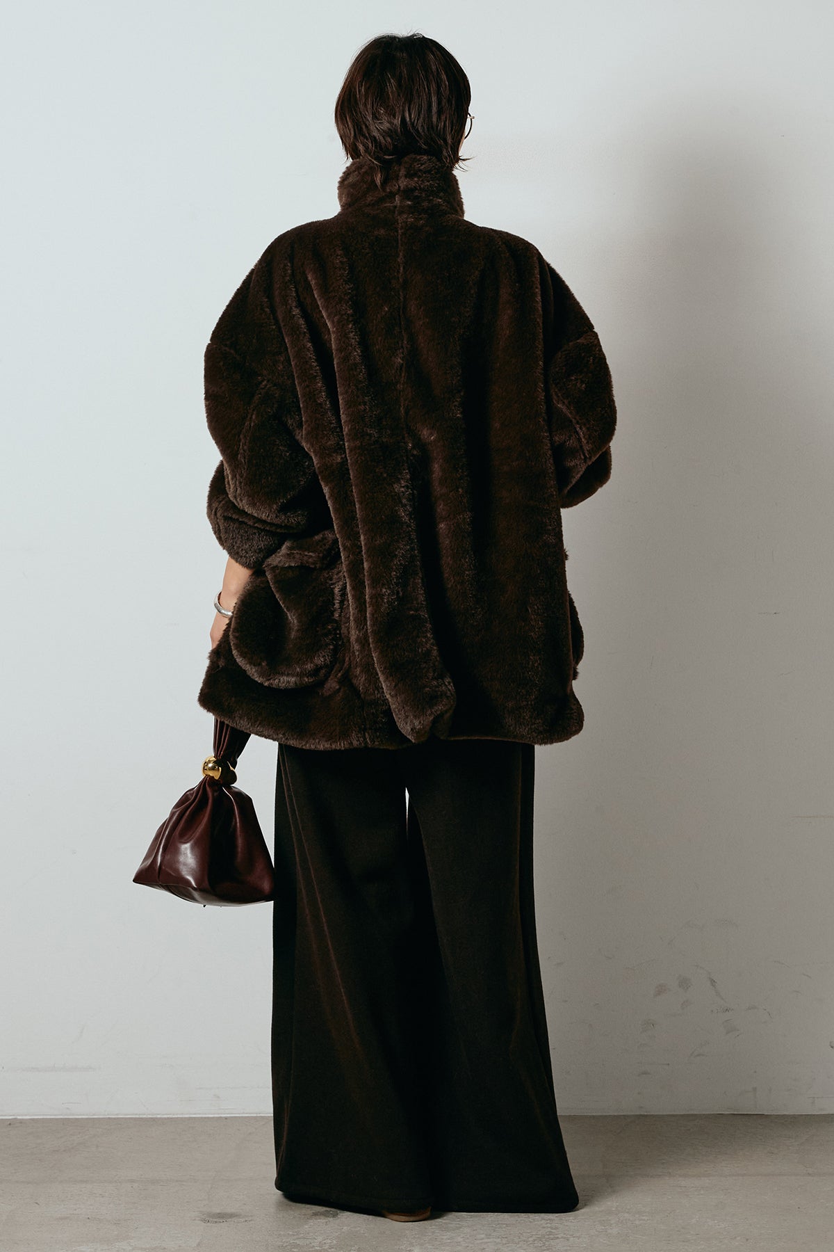 ふんわりとしたボリュームが魅力のスタンドネックファーコート。