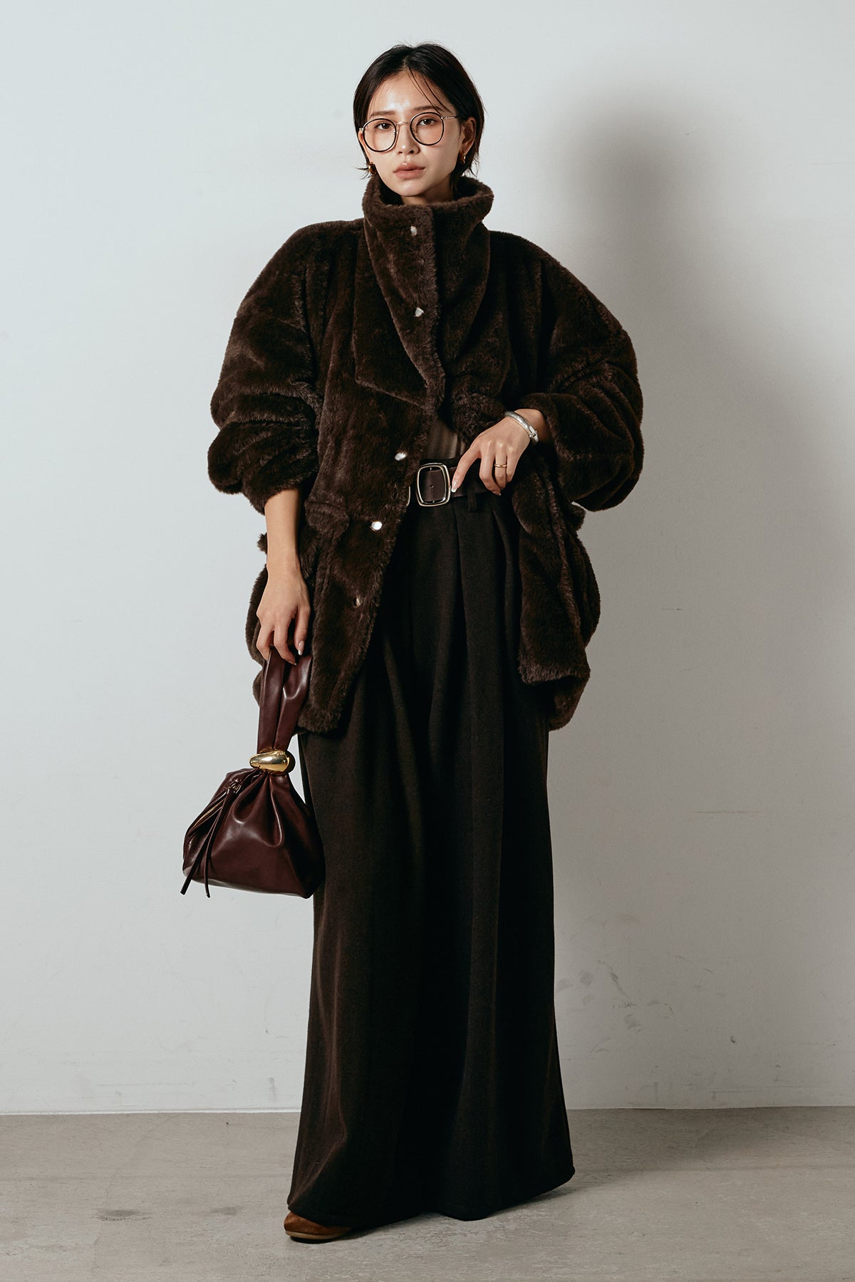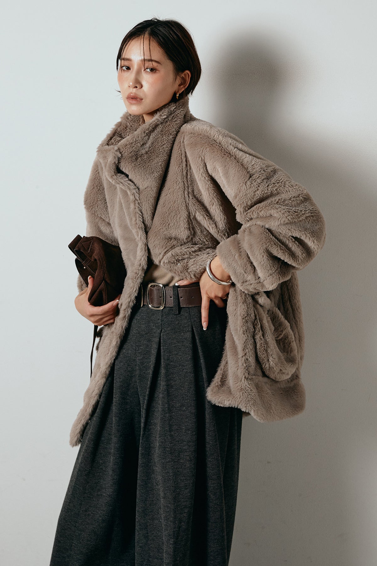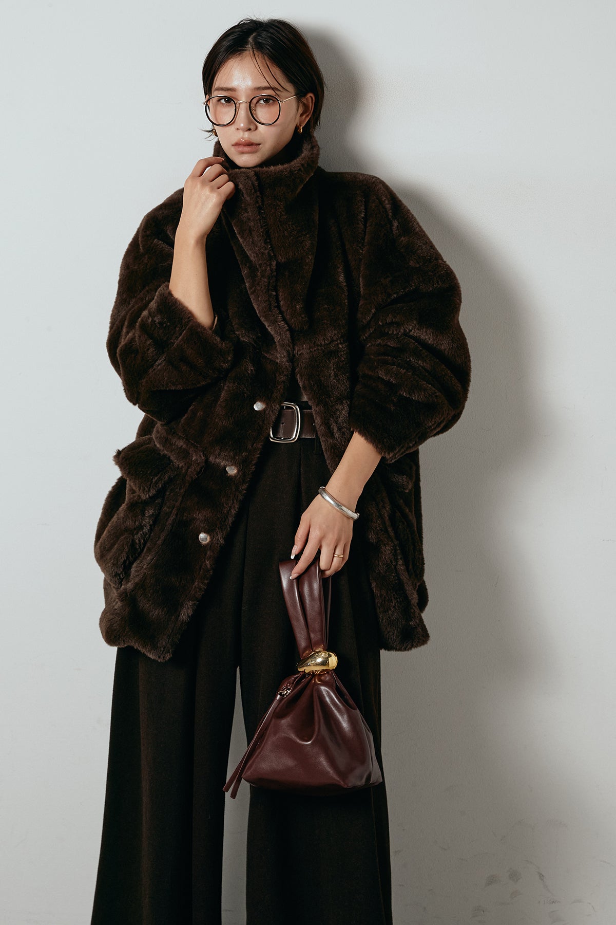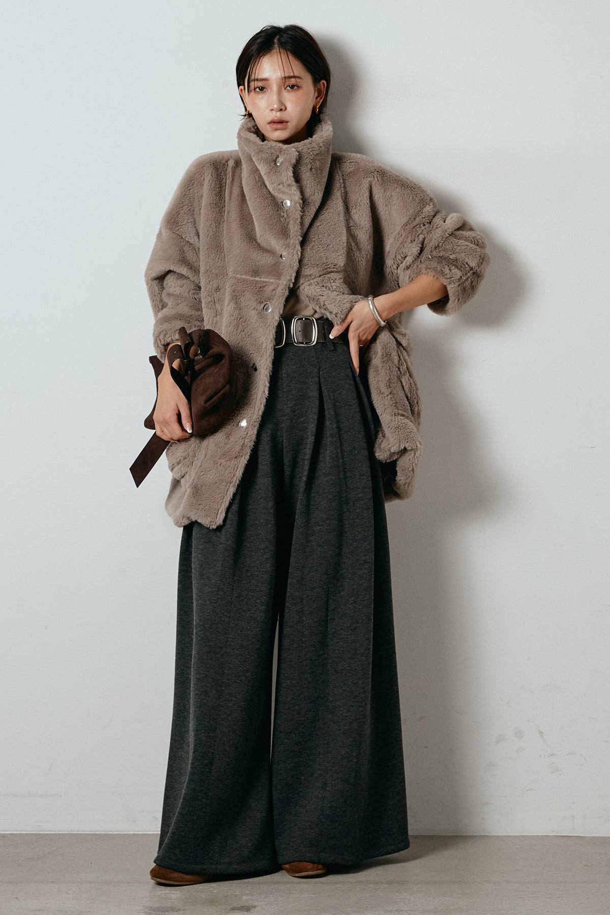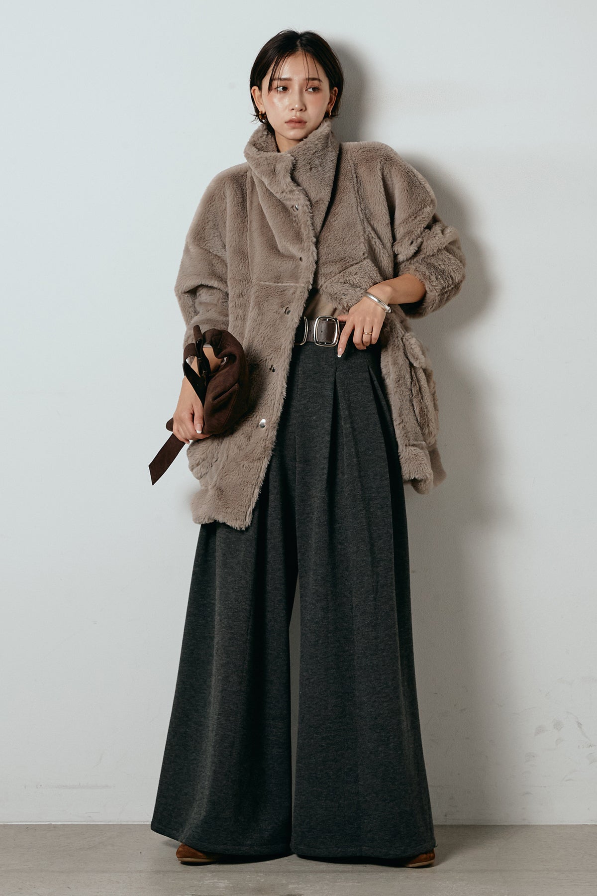 ふんわりとしたボリュームが魅力のスタンドネックファーコート。