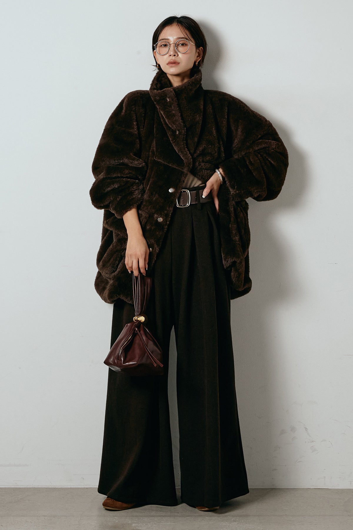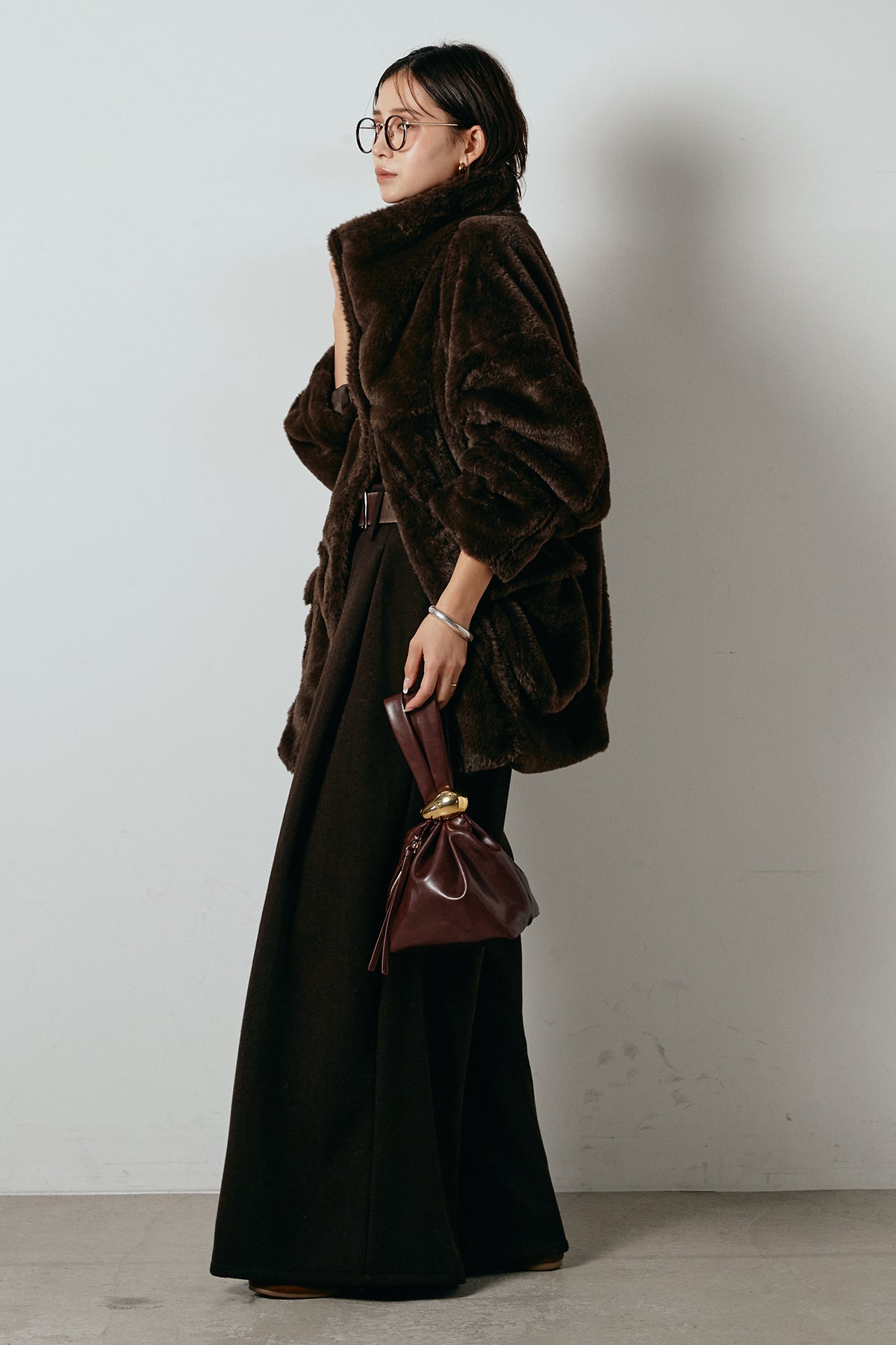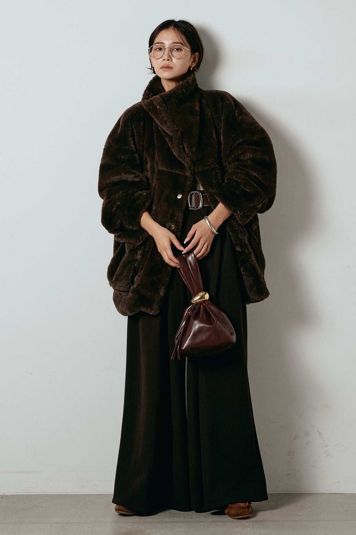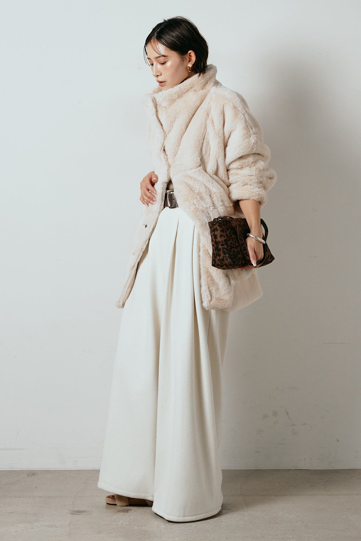 ふんわりとしたボリュームが魅力のスタンドネックファーコート。