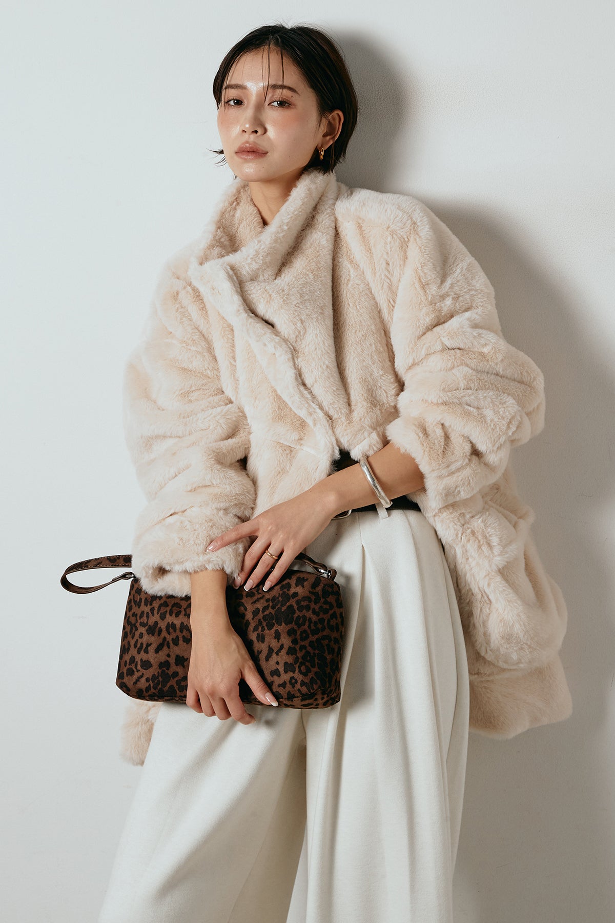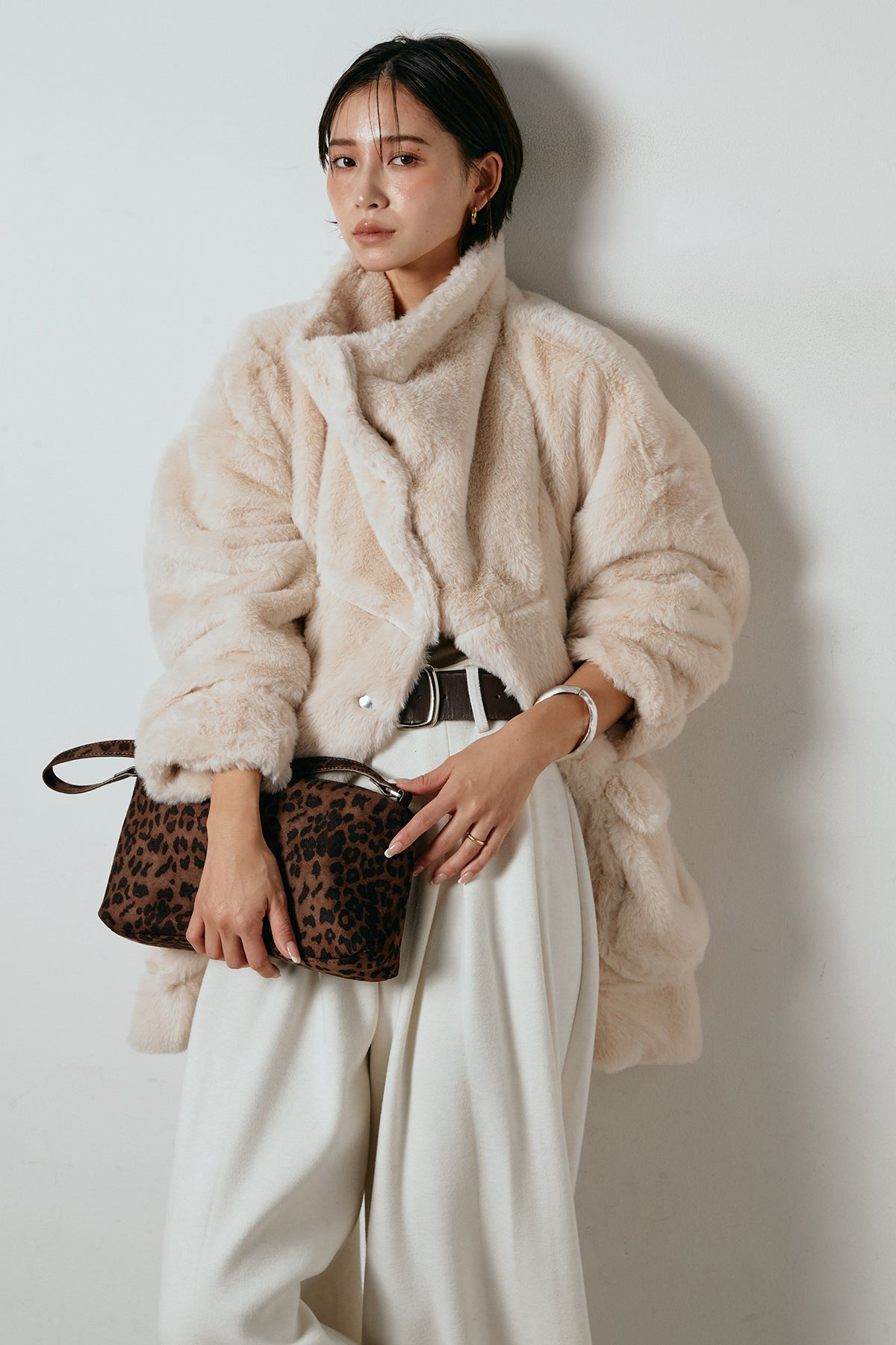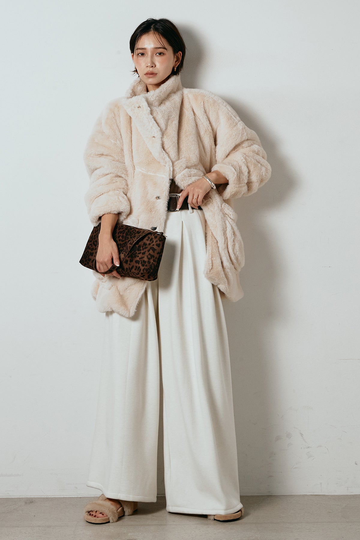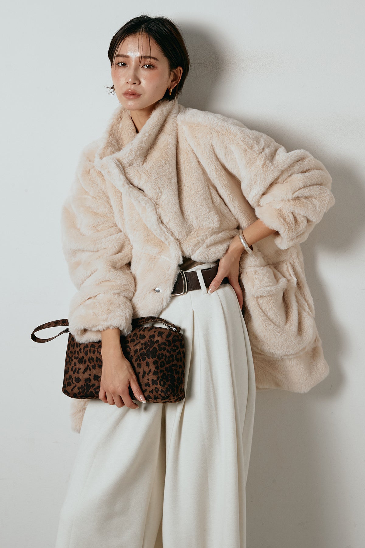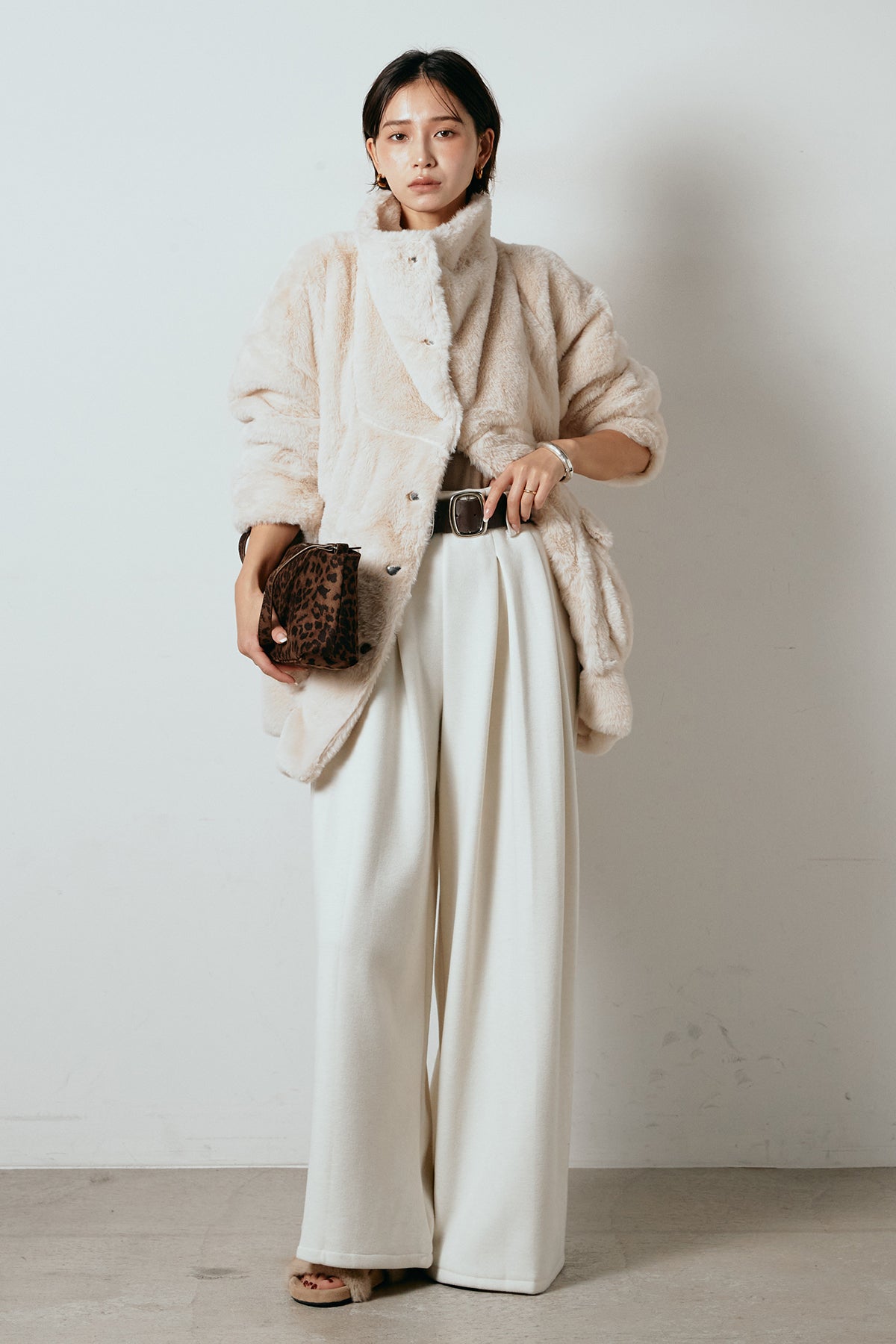 ふんわりとしたボリュームが魅力のスタンドネックファーコート。