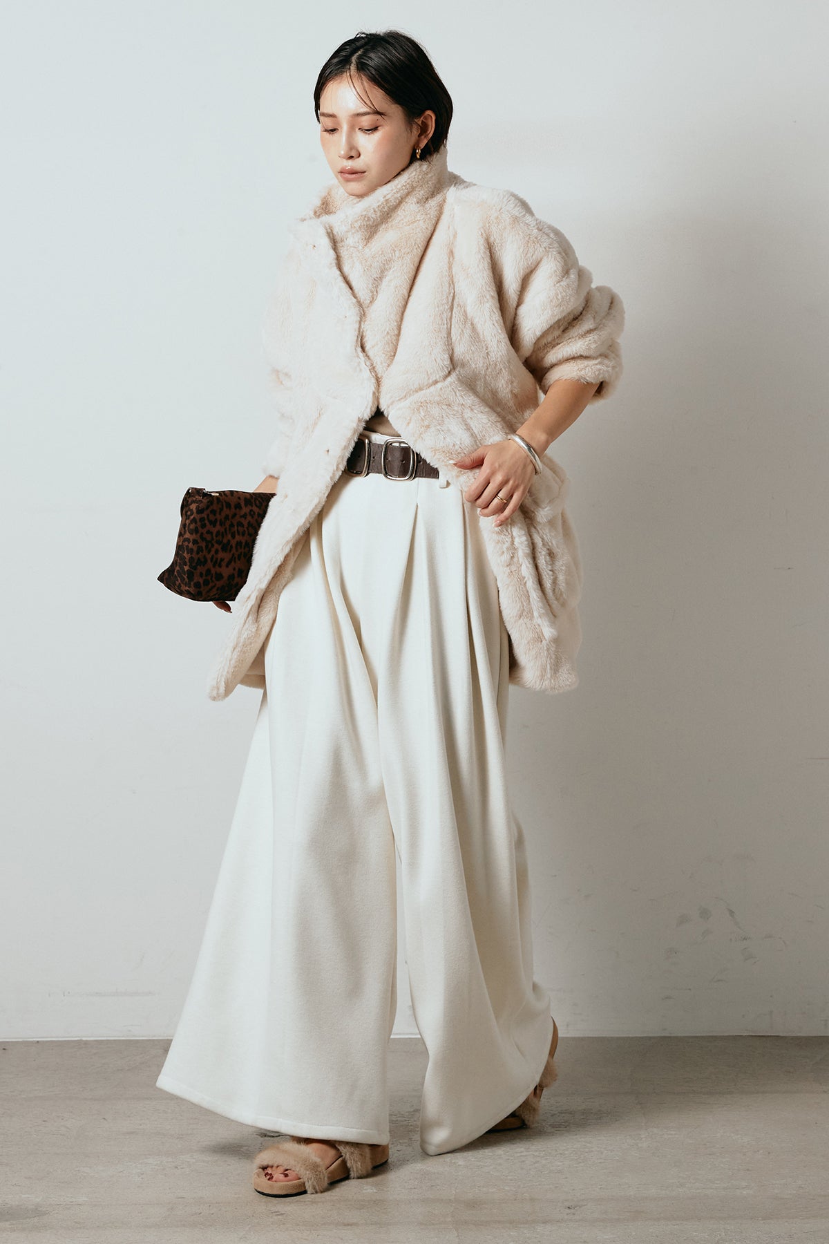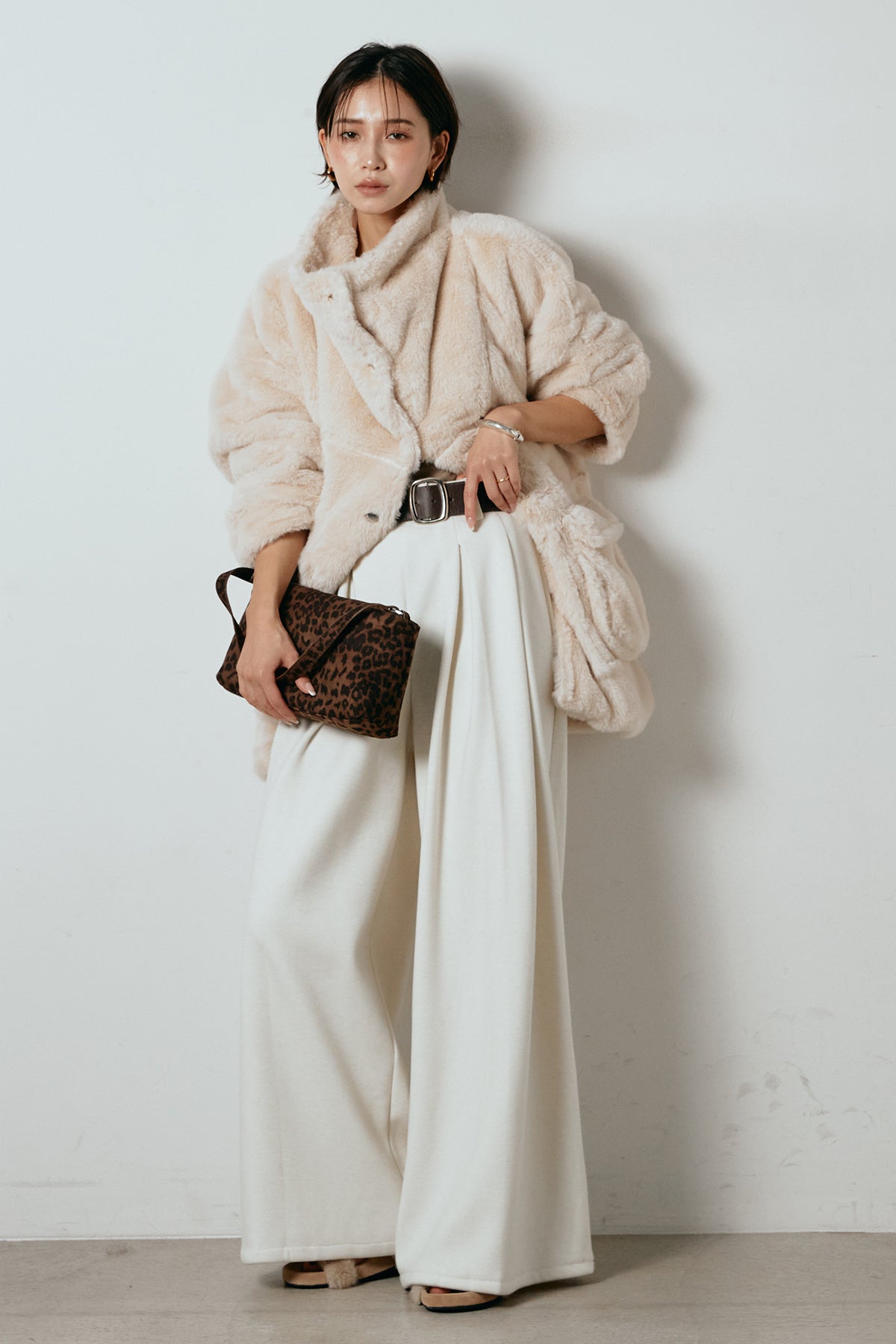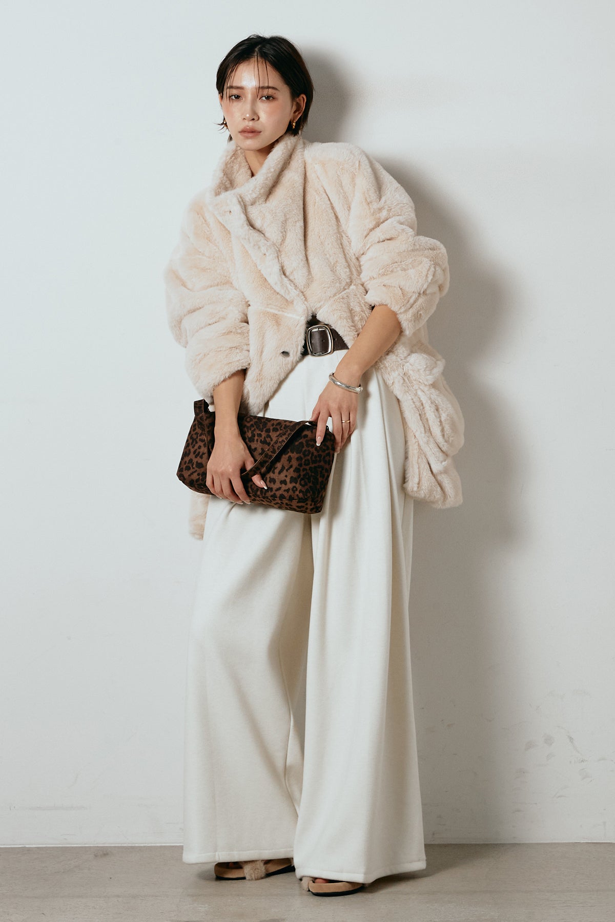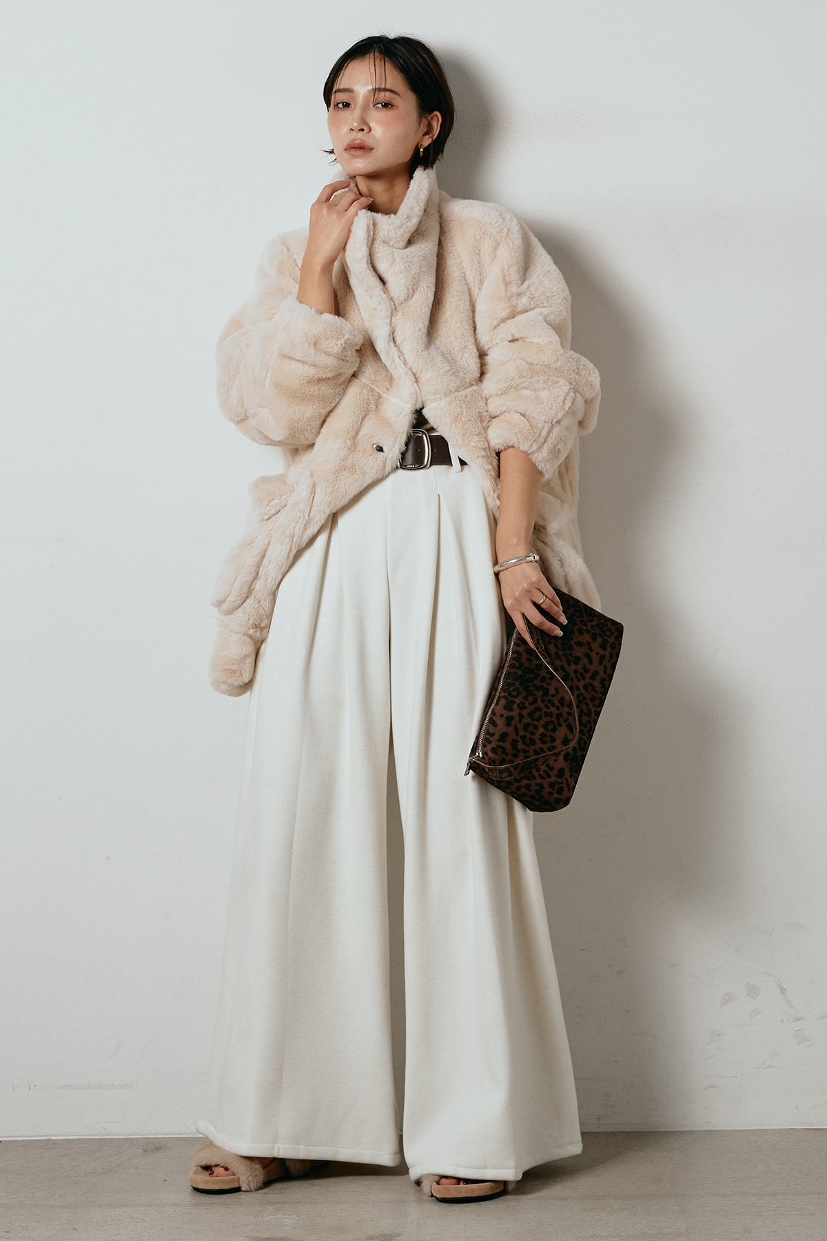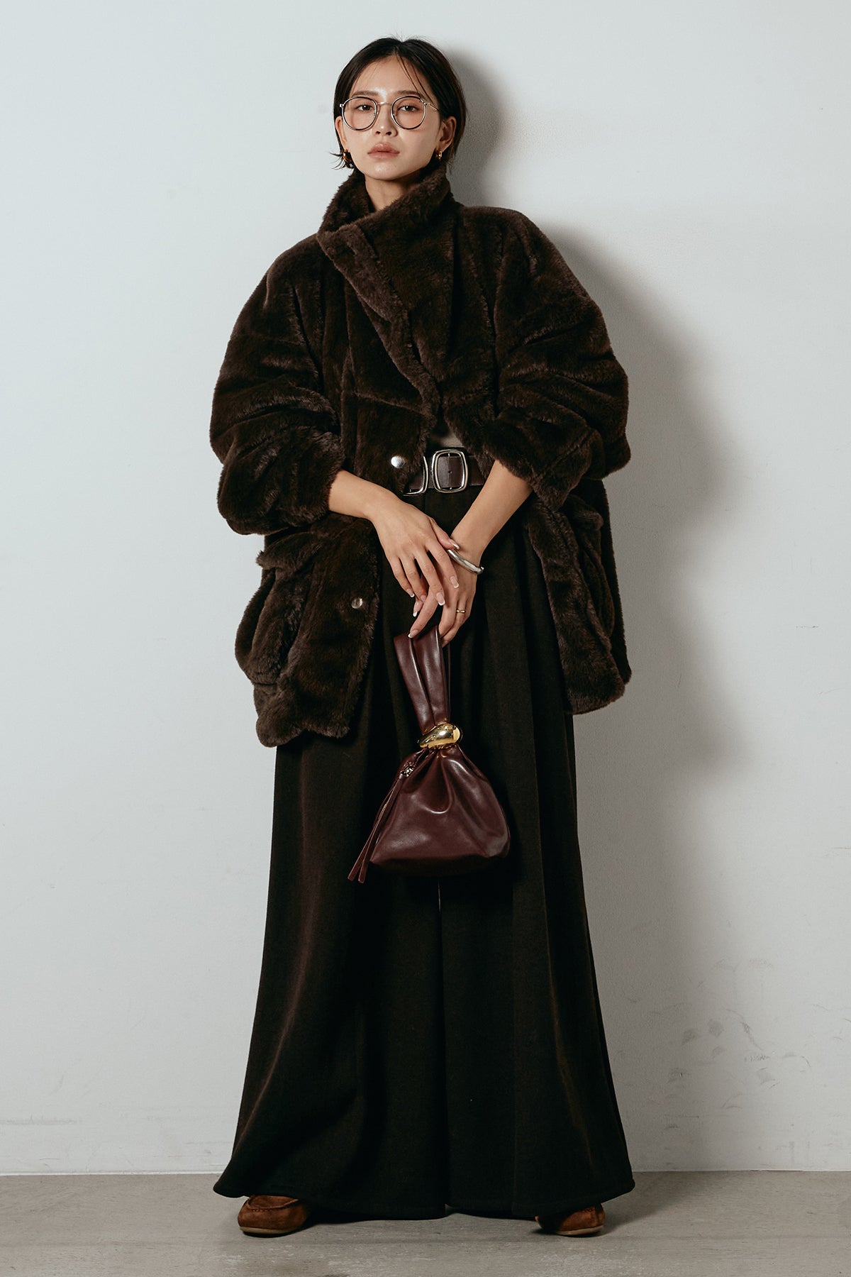 ふんわりとしたボリュームが魅力のスタンドネックファーコート。