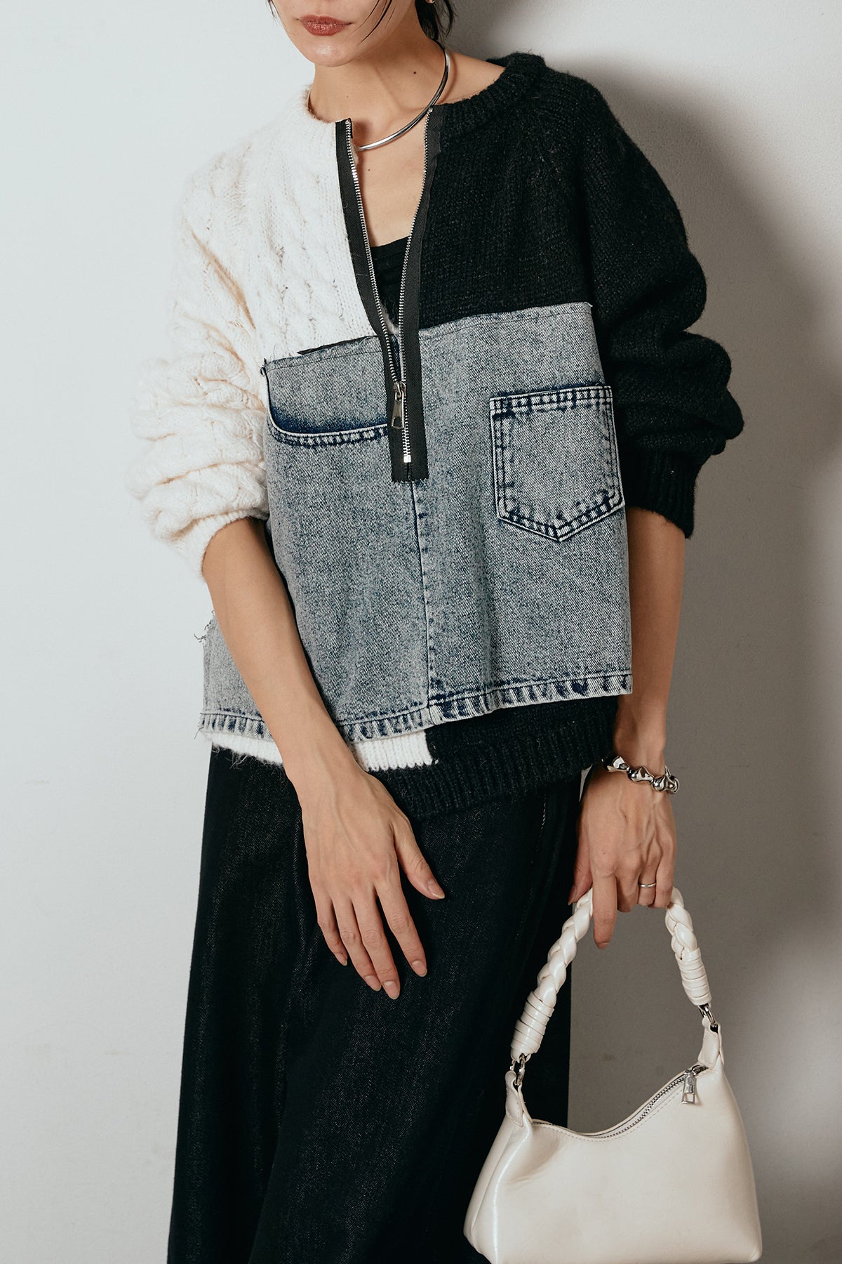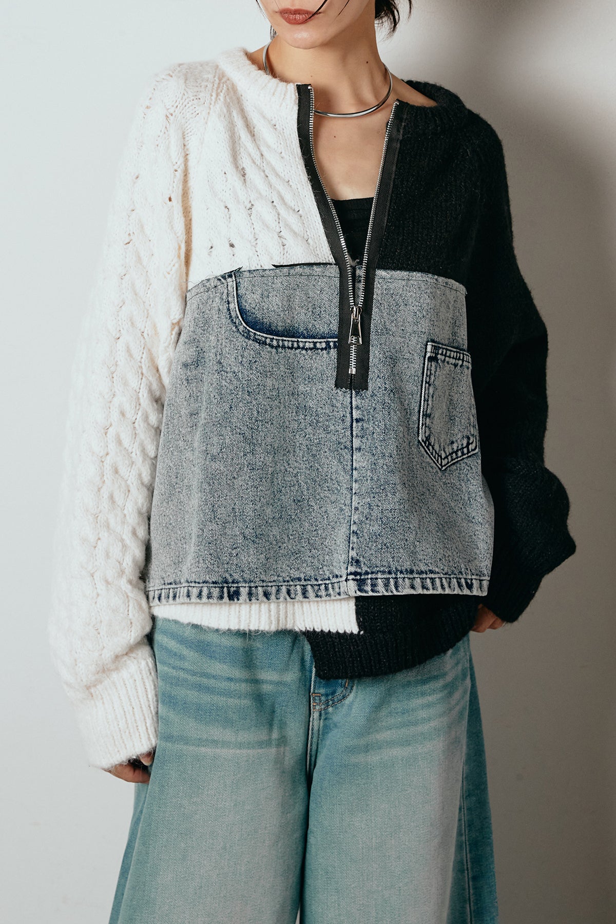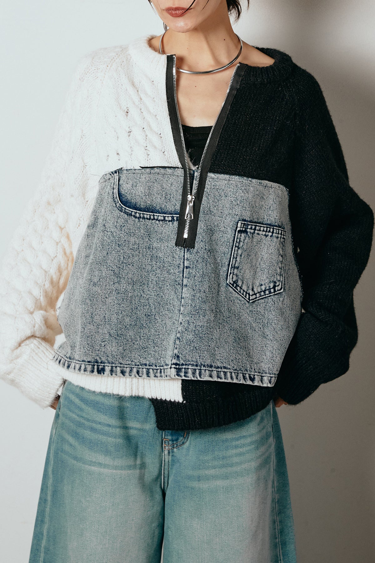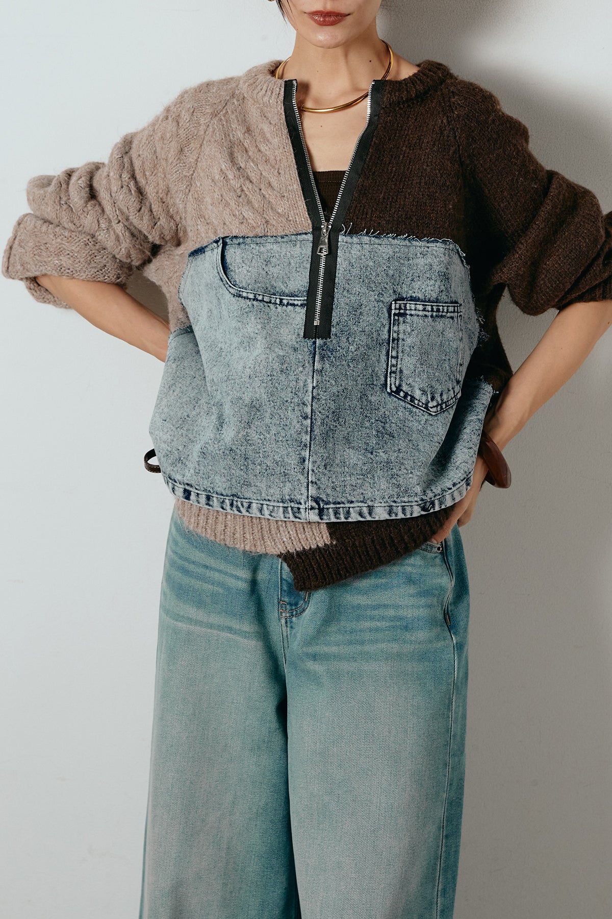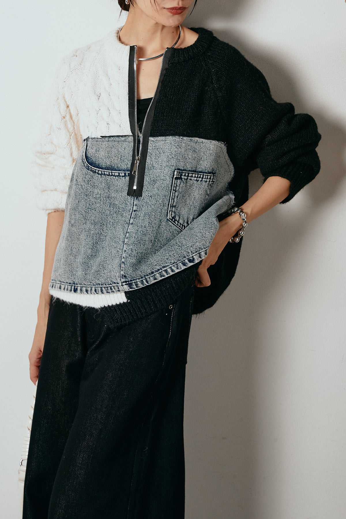 異素材を組み合わせた存在感のあるドッキングデザイン。ざっくりとしたニットにデニムパネルをミックスし、ラフさとモード感をバランスよく取り入れたトップスです。ハーフジップ仕様で抜け感の調整がしやすく、レイヤードやアクセ合わせも楽しめるデザイン。ゆるめのシルエットがこなれた印象をつくり、デニムやワイドパンツと合わせるだけで印象的なスタイリングに仕上がります。