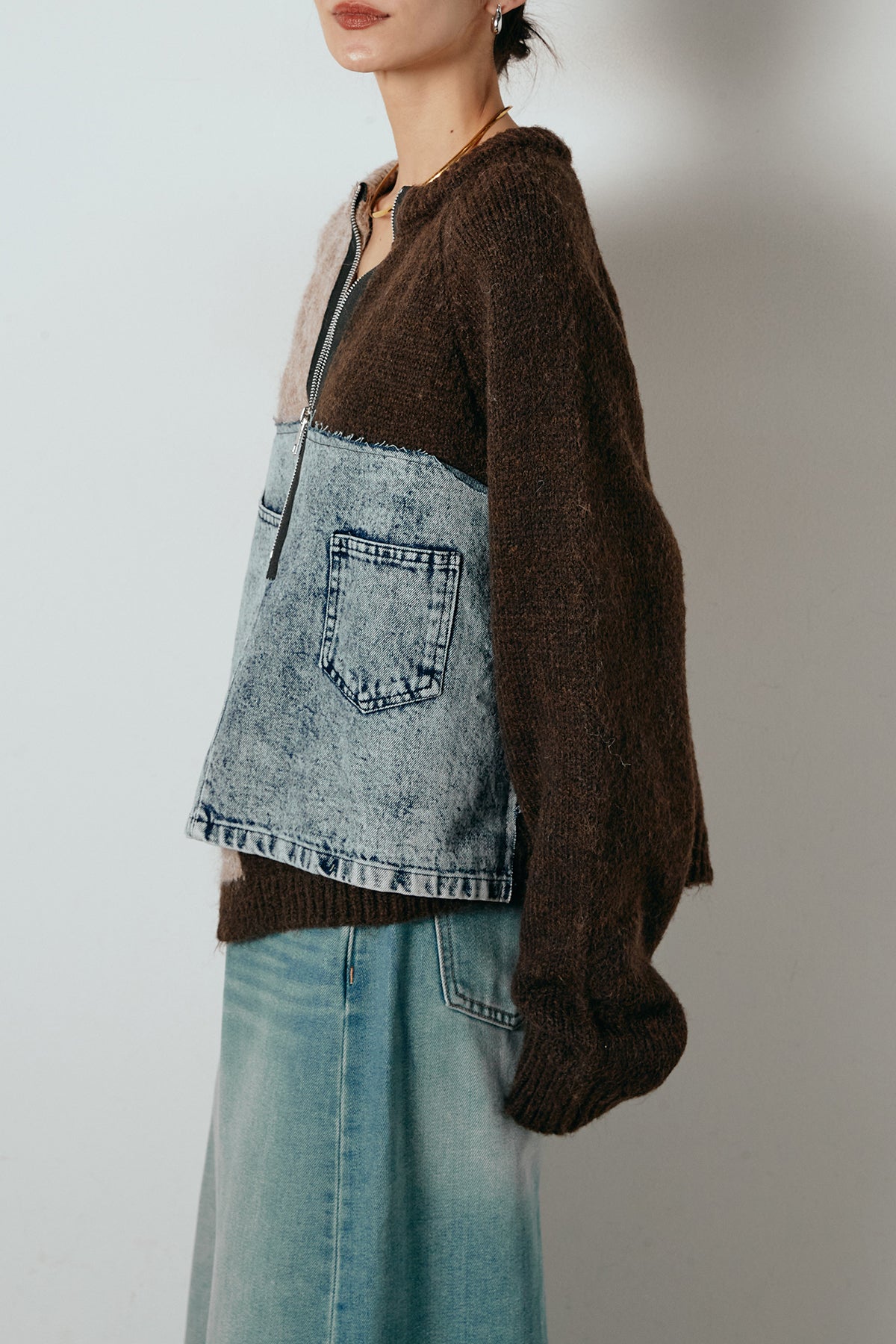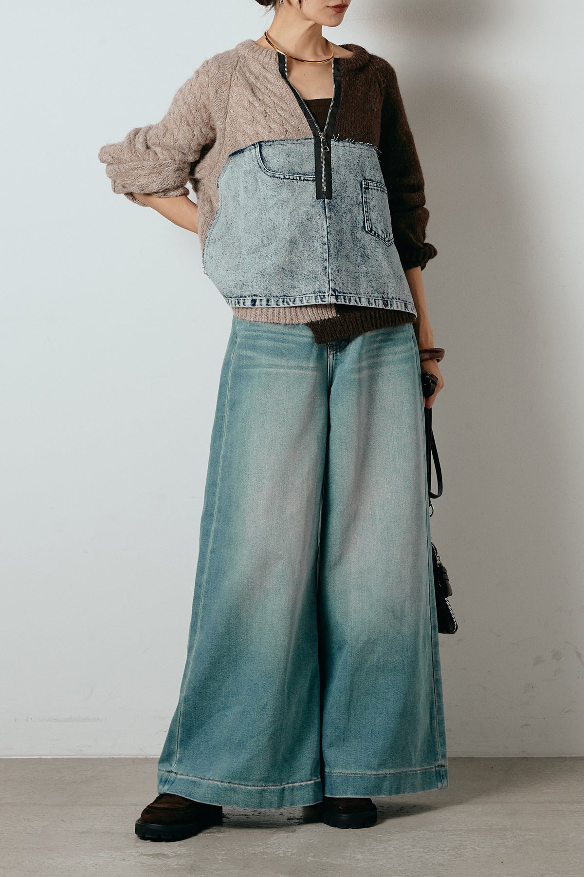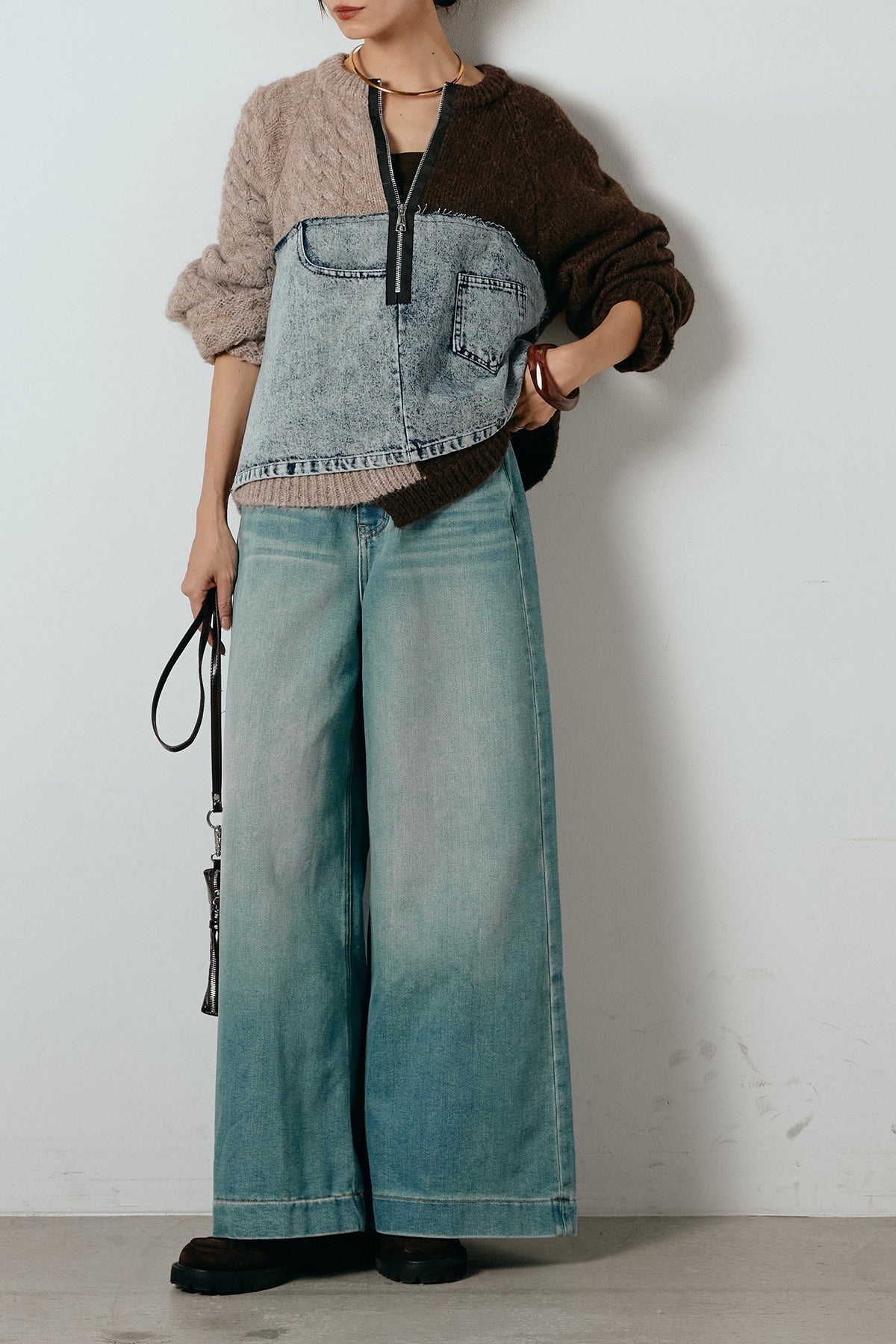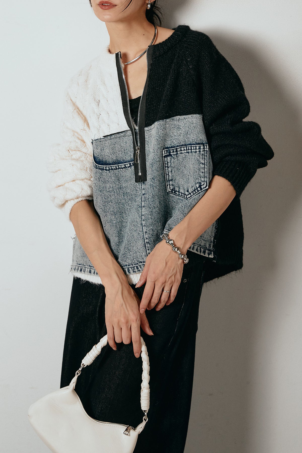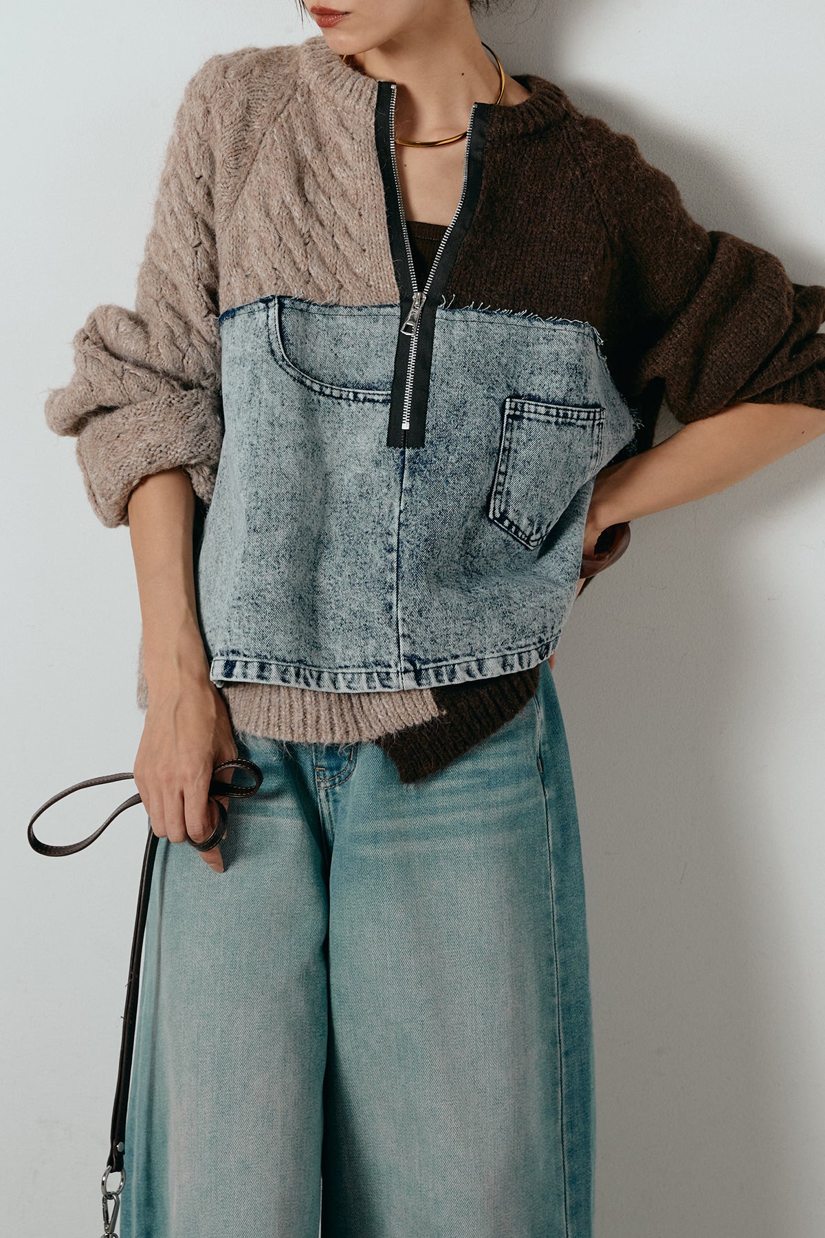 異素材を組み合わせた存在感のあるドッキングデザイン。ざっくりとしたニットにデニムパネルをミックスし、ラフさとモード感をバランスよく取り入れたトップスです。ハーフジップ仕様で抜け感の調整がしやすく、レイヤードやアクセ合わせも楽しめるデザイン。ゆるめのシルエットがこなれた印象をつくり、デニムやワイドパンツと合わせるだけで印象的なスタイリングに仕上がります。