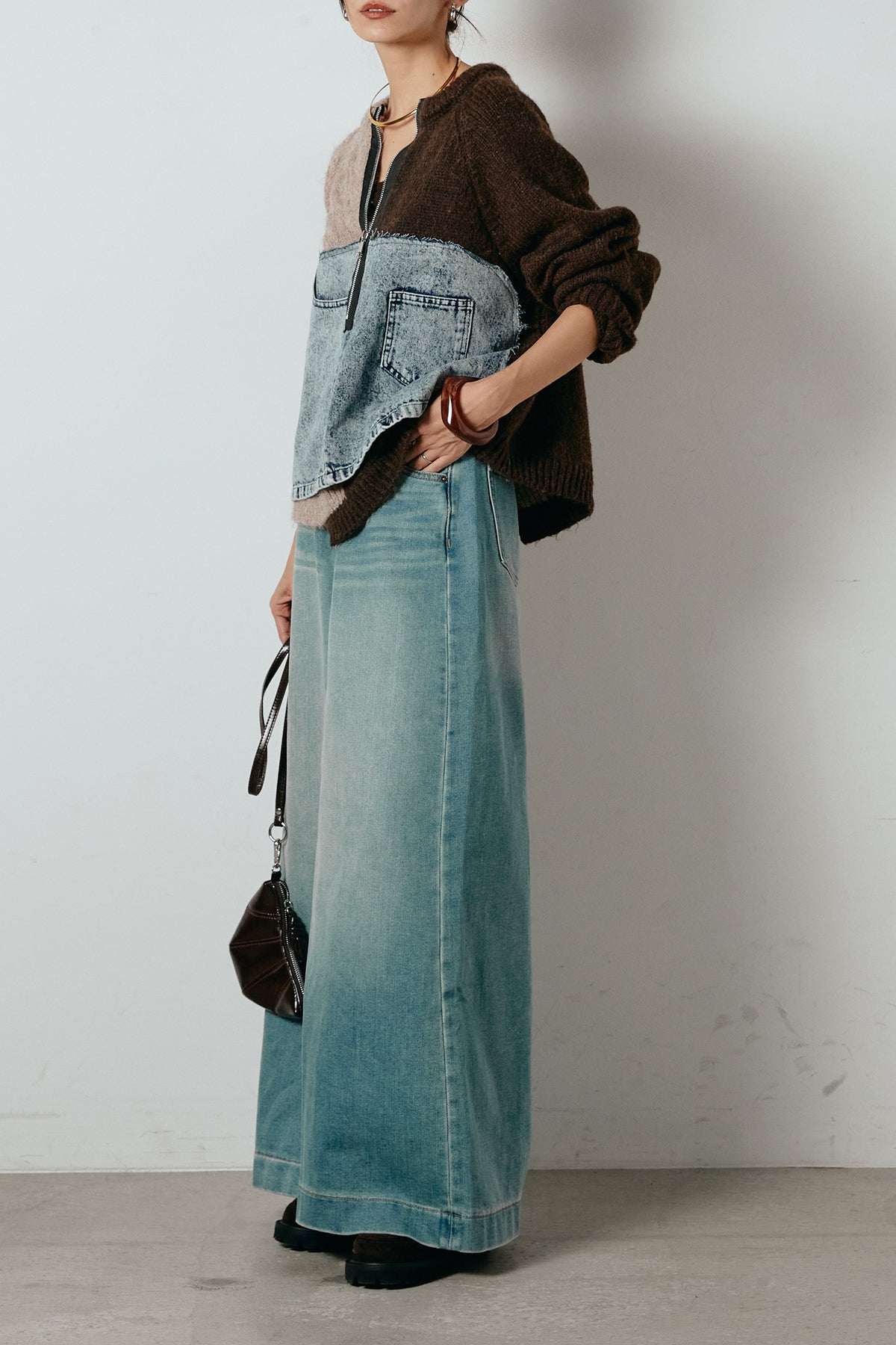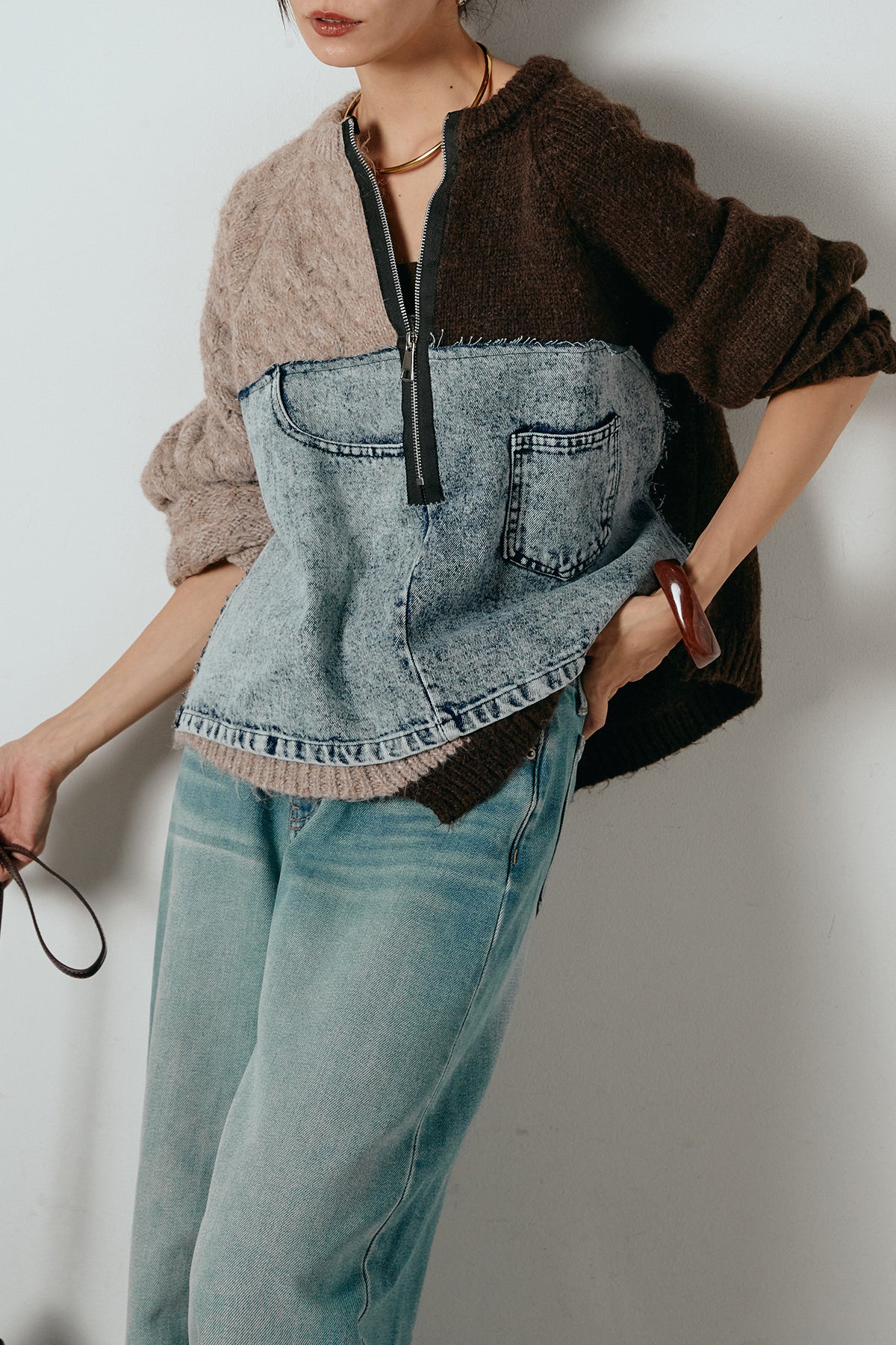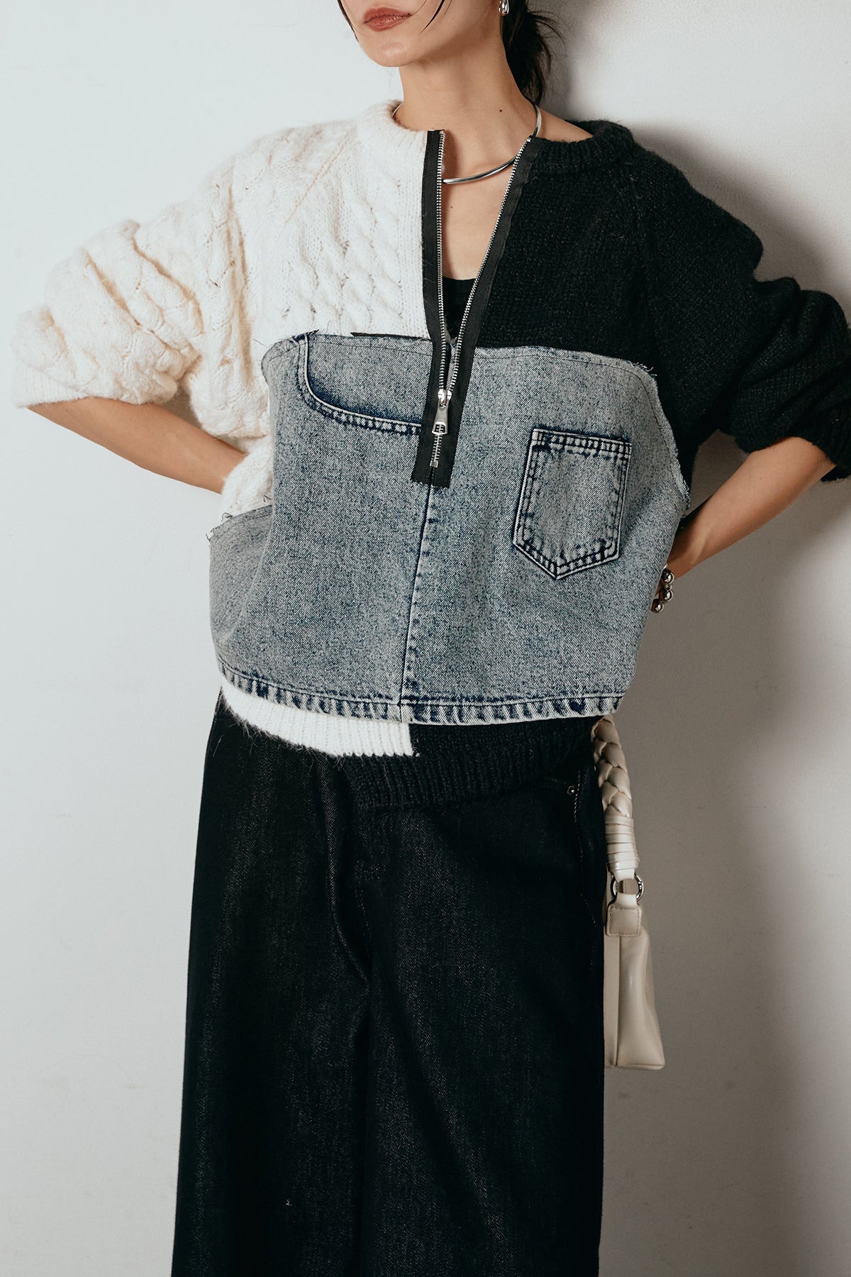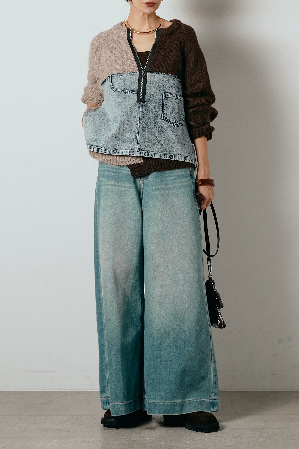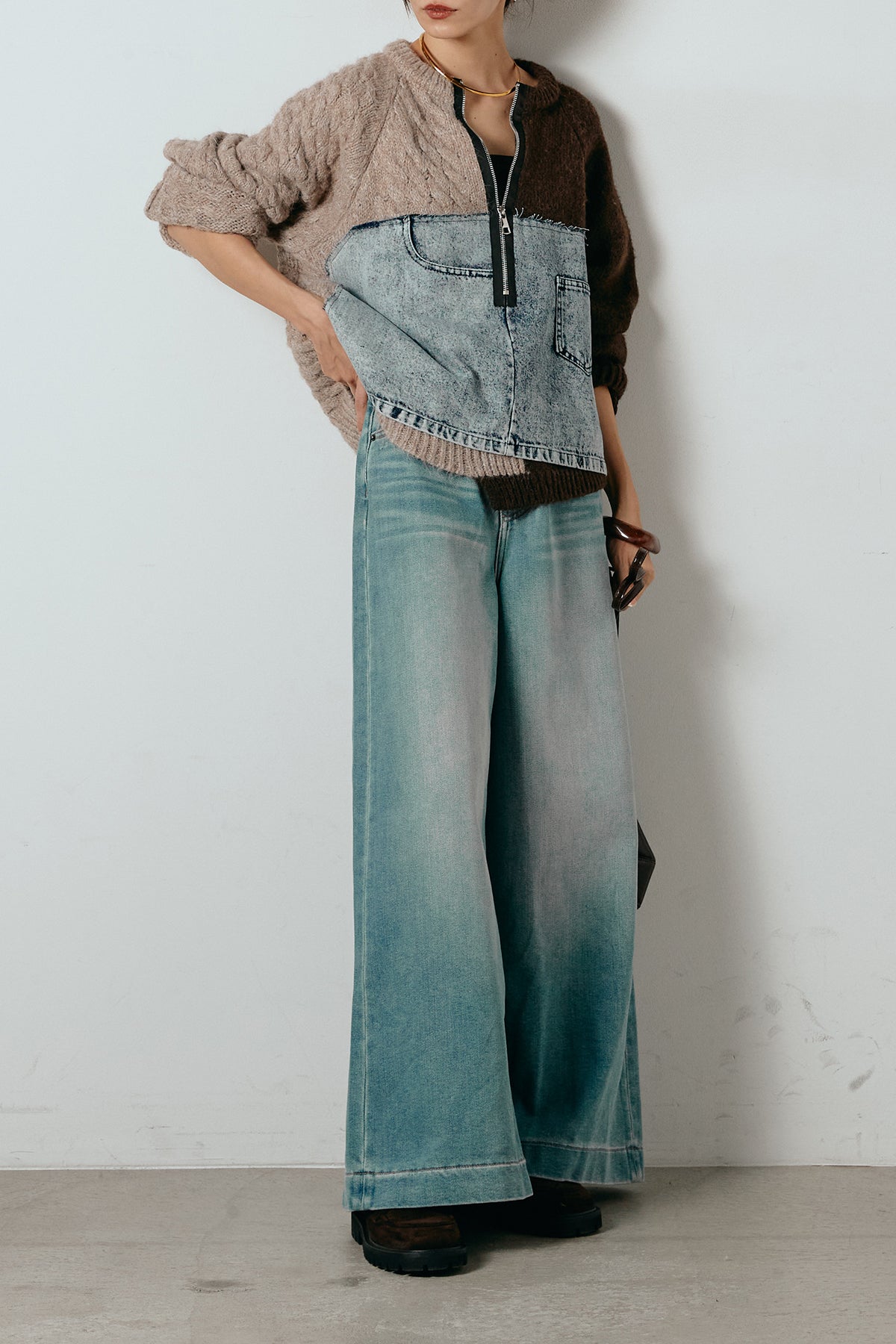 異素材を組み合わせた存在感のあるドッキングデザイン。ざっくりとしたニットにデニムパネルをミックスし、ラフさとモード感をバランスよく取り入れたトップスです。ハーフジップ仕様で抜け感の調整がしやすく、レイヤードやアクセ合わせも楽しめるデザイン。ゆるめのシルエットがこなれた印象をつくり、デニムやワイドパンツと合わせるだけで印象的なスタイリングに仕上がります。