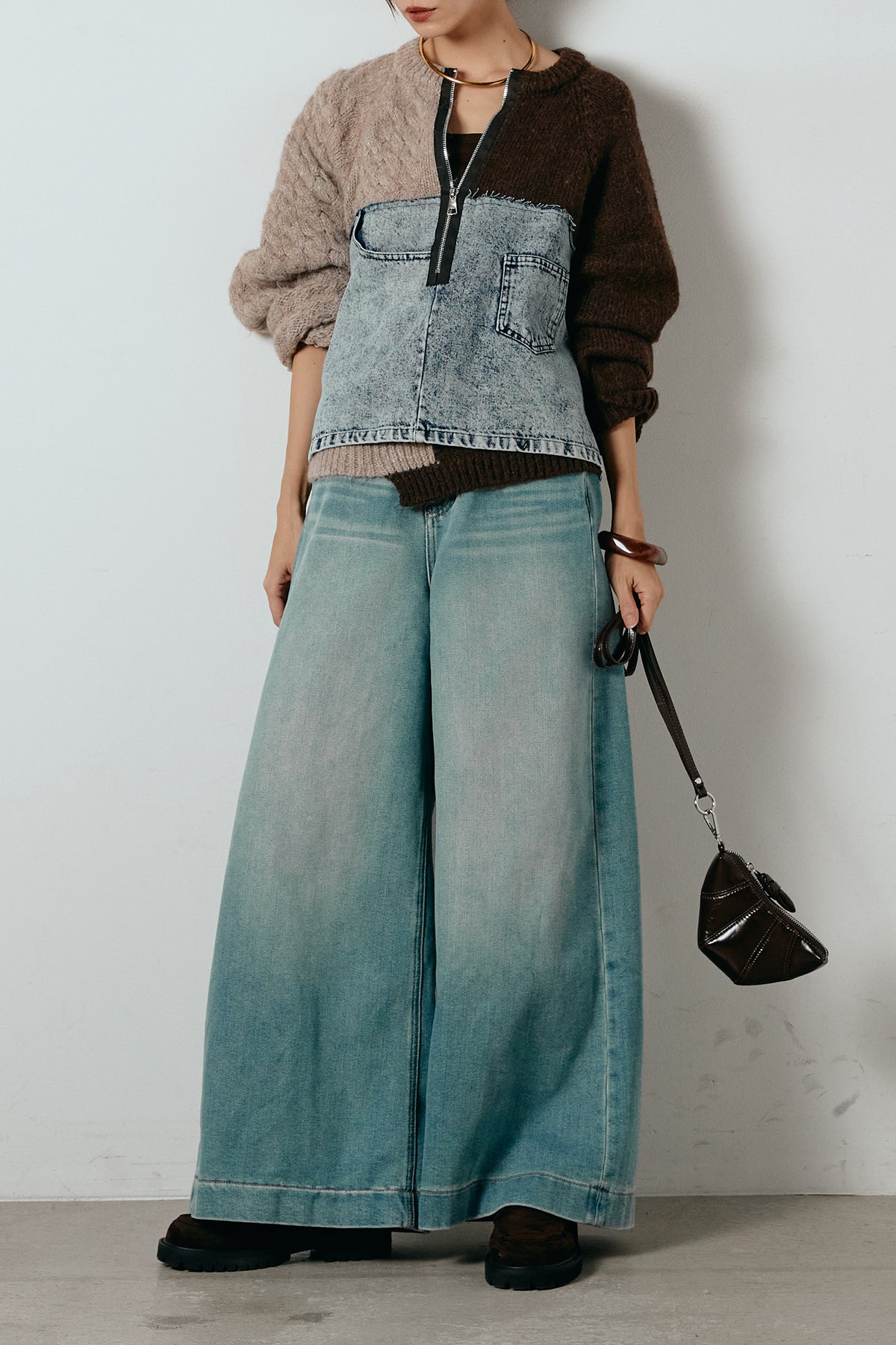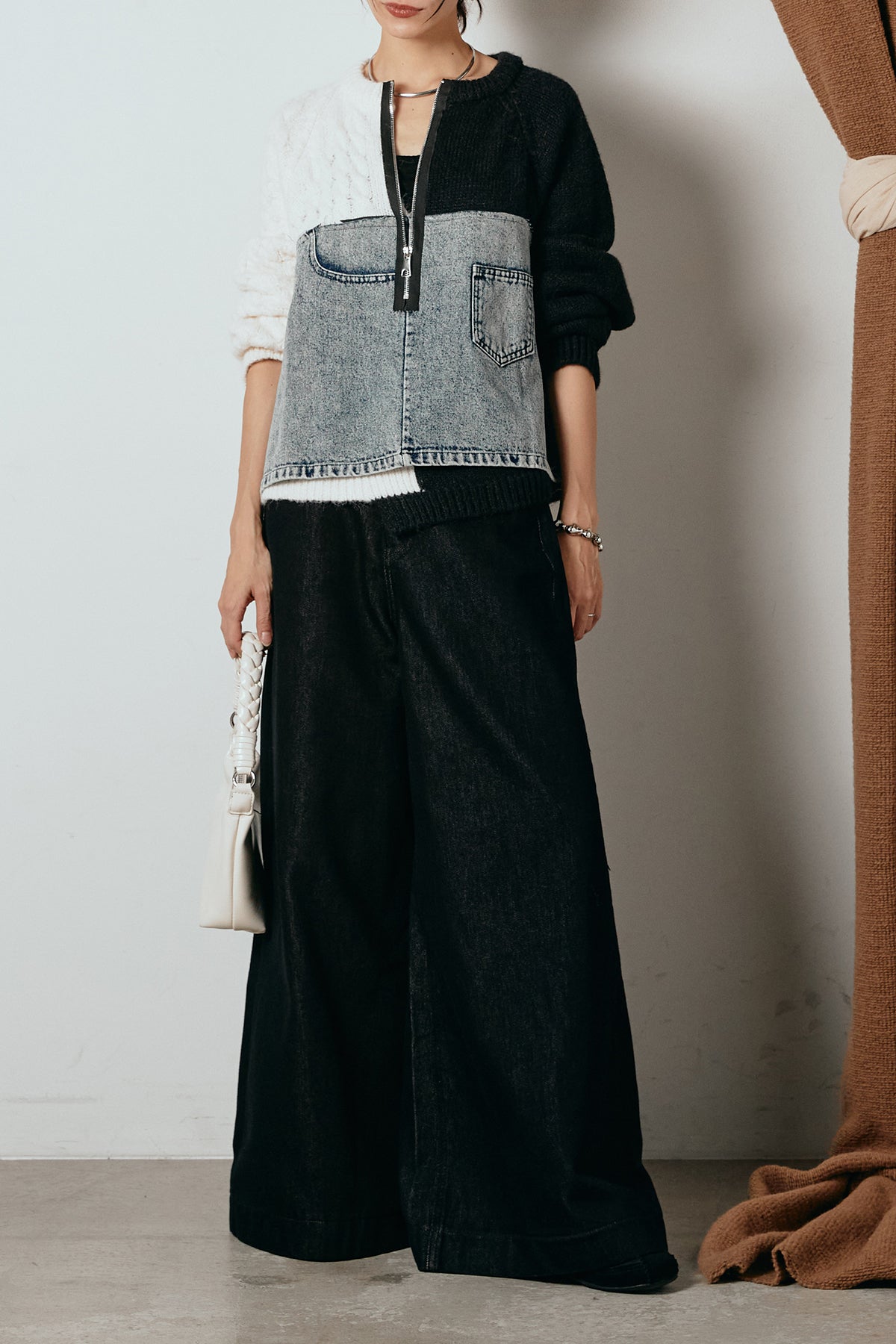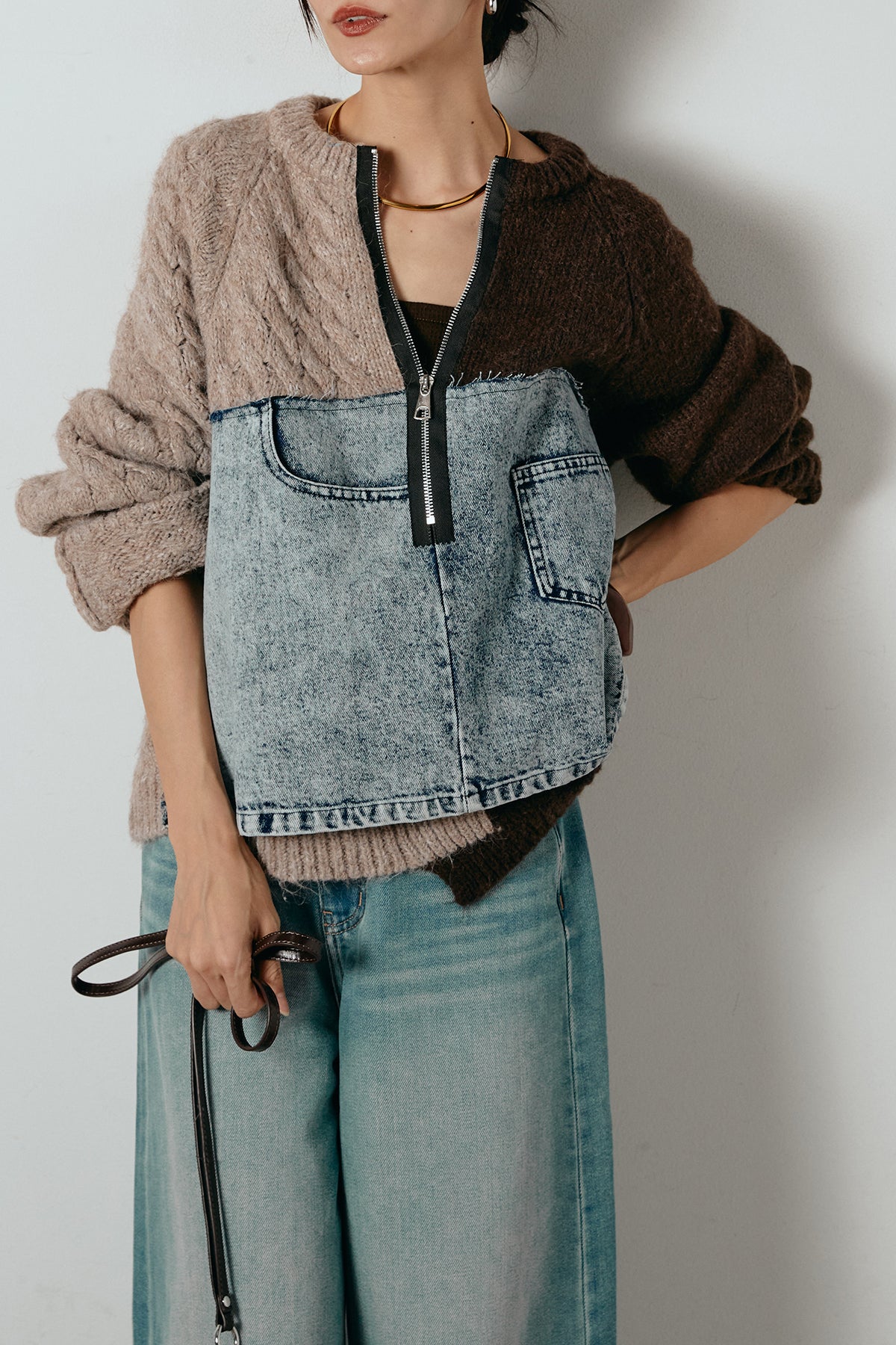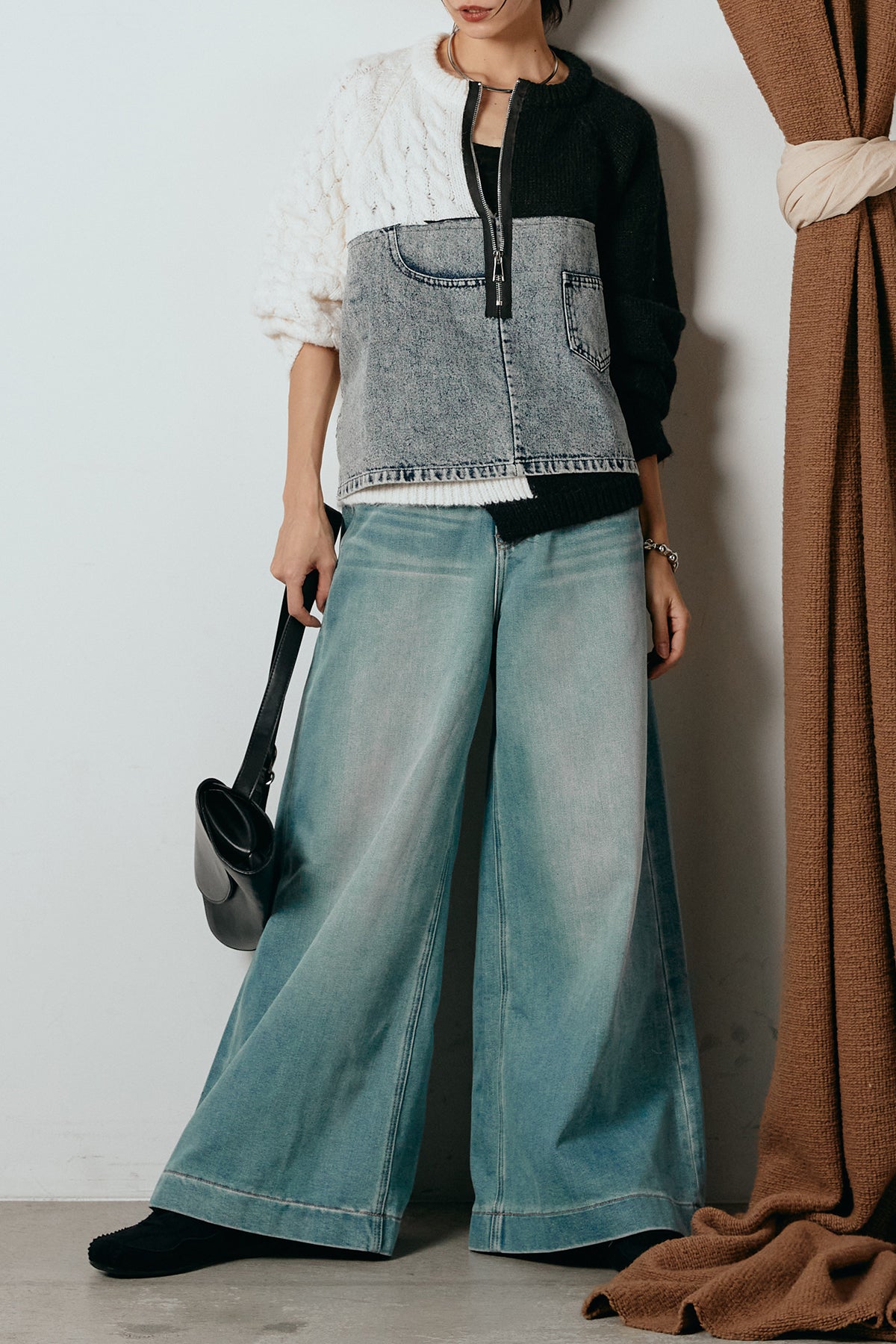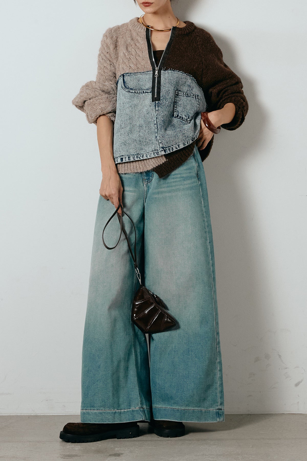 異素材を組み合わせた存在感のあるドッキングデザイン。ざっくりとしたニットにデニムパネルをミックスし、ラフさとモード感をバランスよく取り入れたトップスです。ハーフジップ仕様で抜け感の調整がしやすく、レイヤードやアクセ合わせも楽しめるデザイン。ゆるめのシルエットがこなれた印象をつくり、デニムやワイドパンツと合わせるだけで印象的なスタイリングに仕上がります。