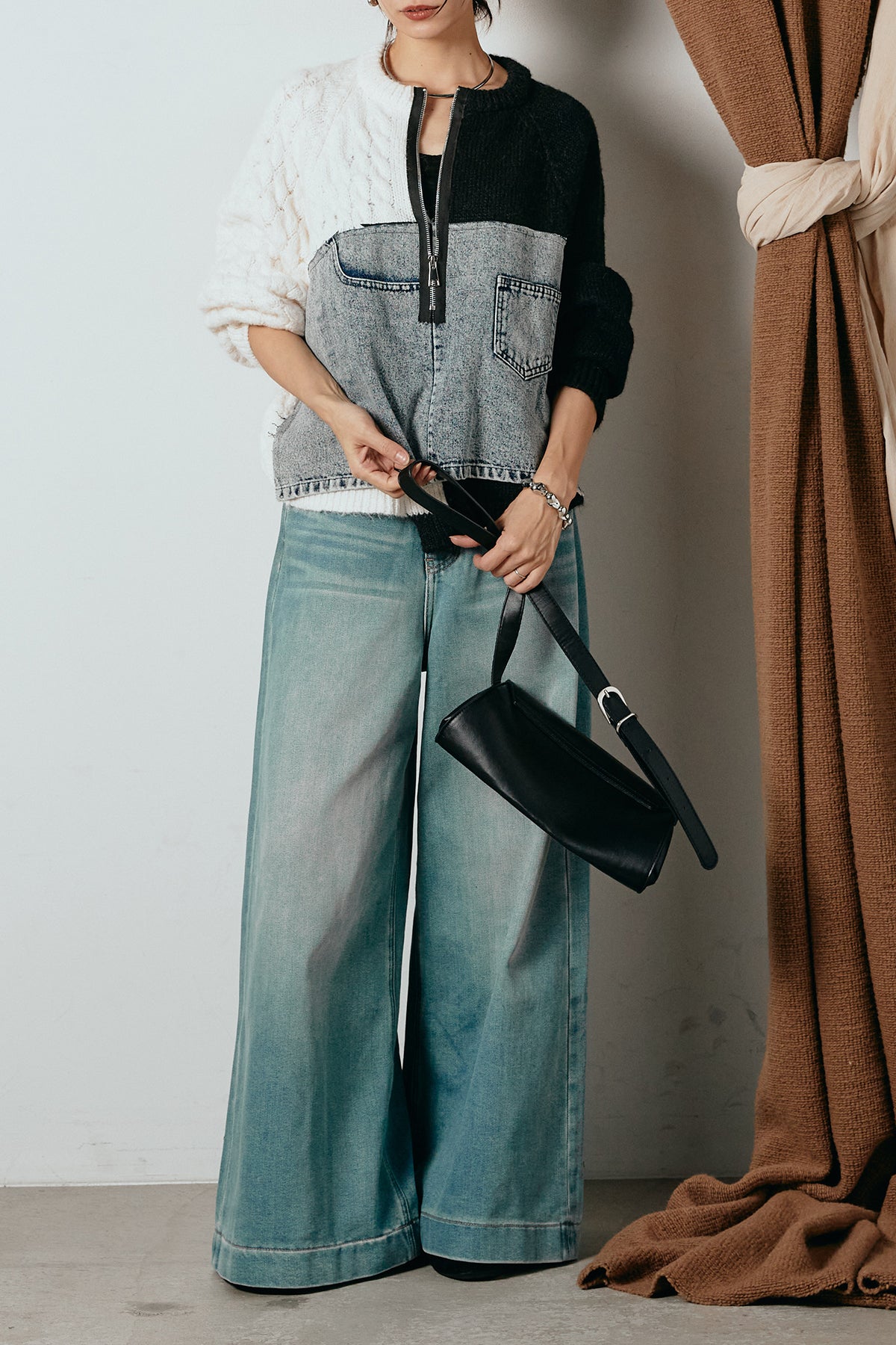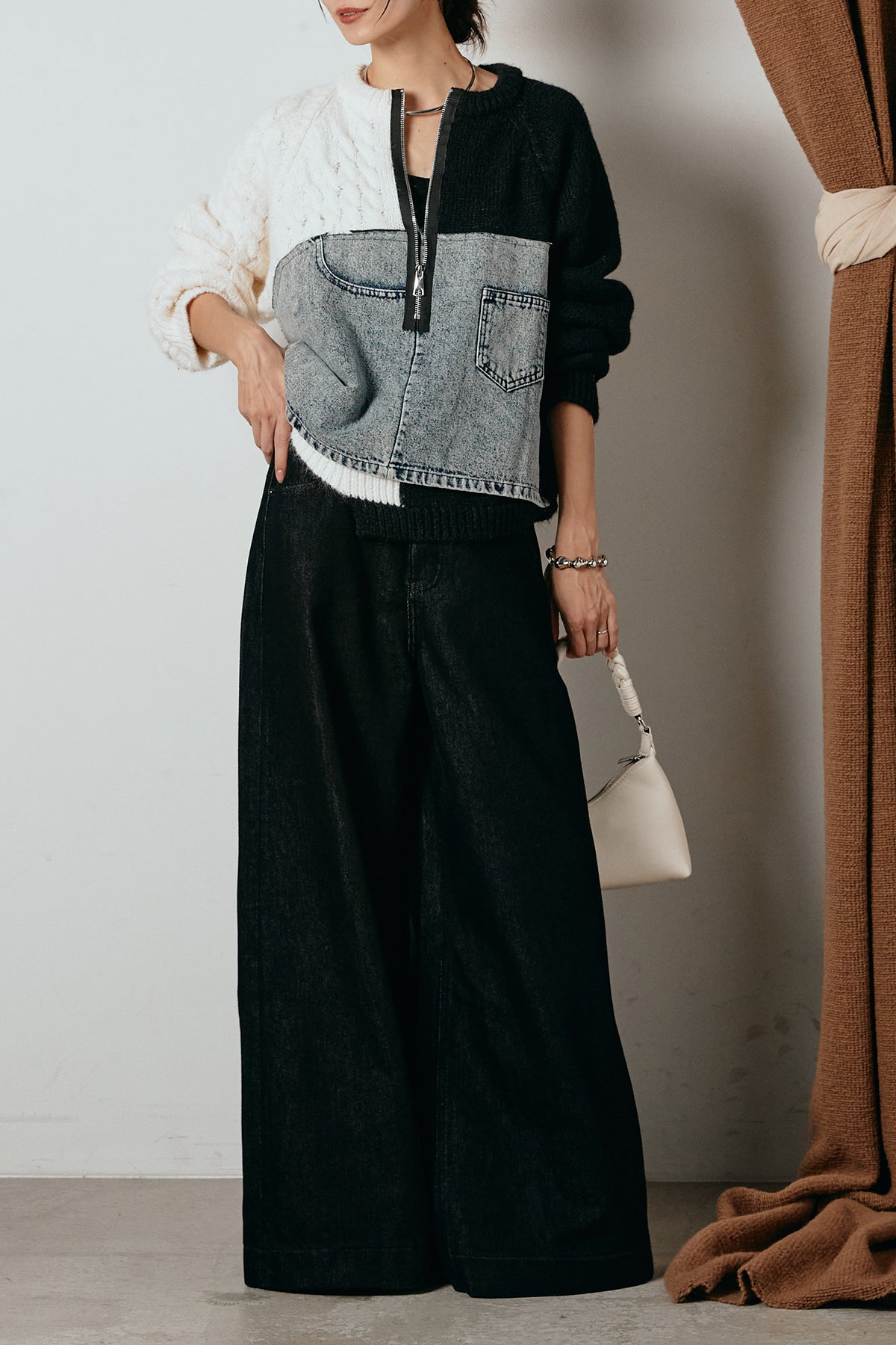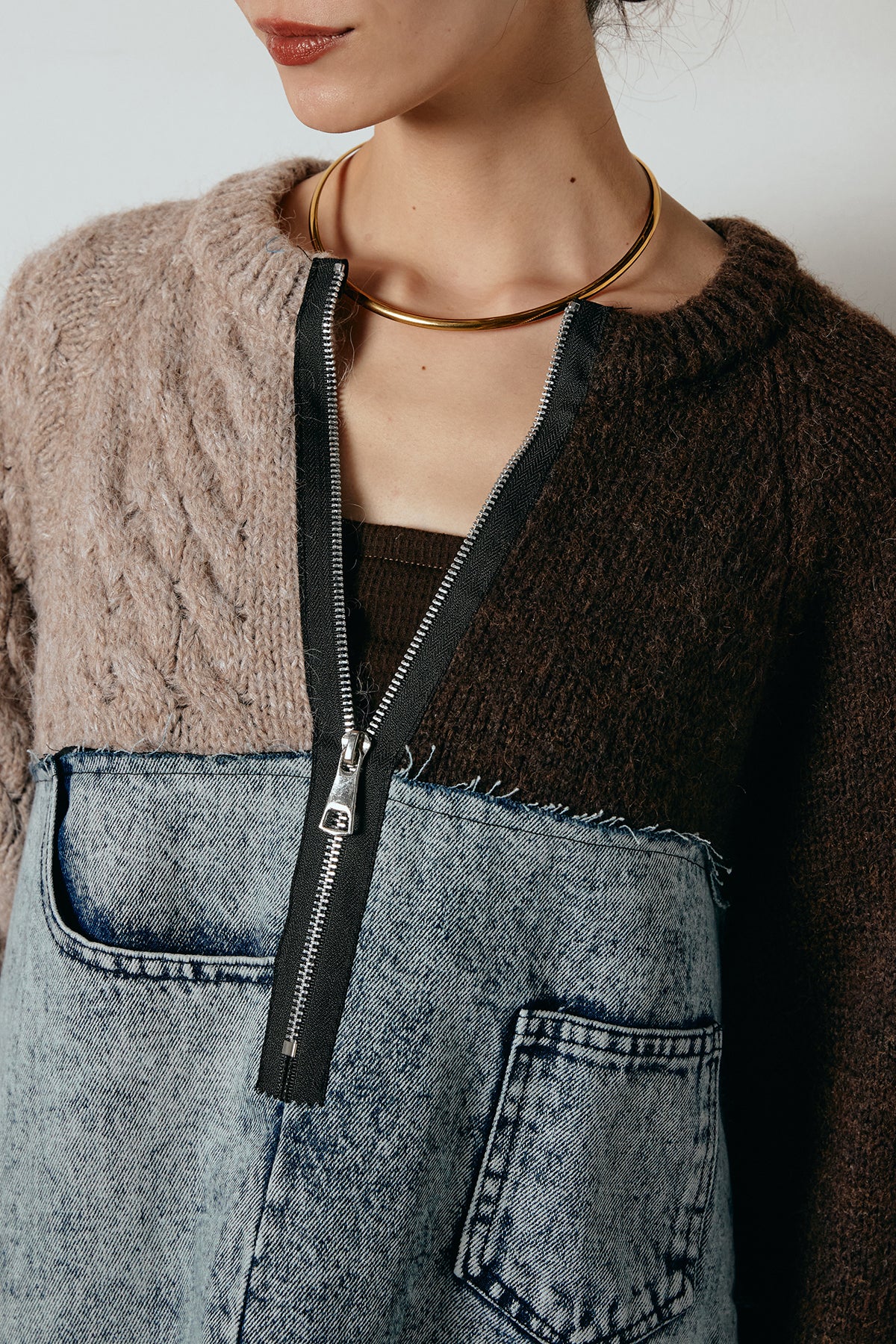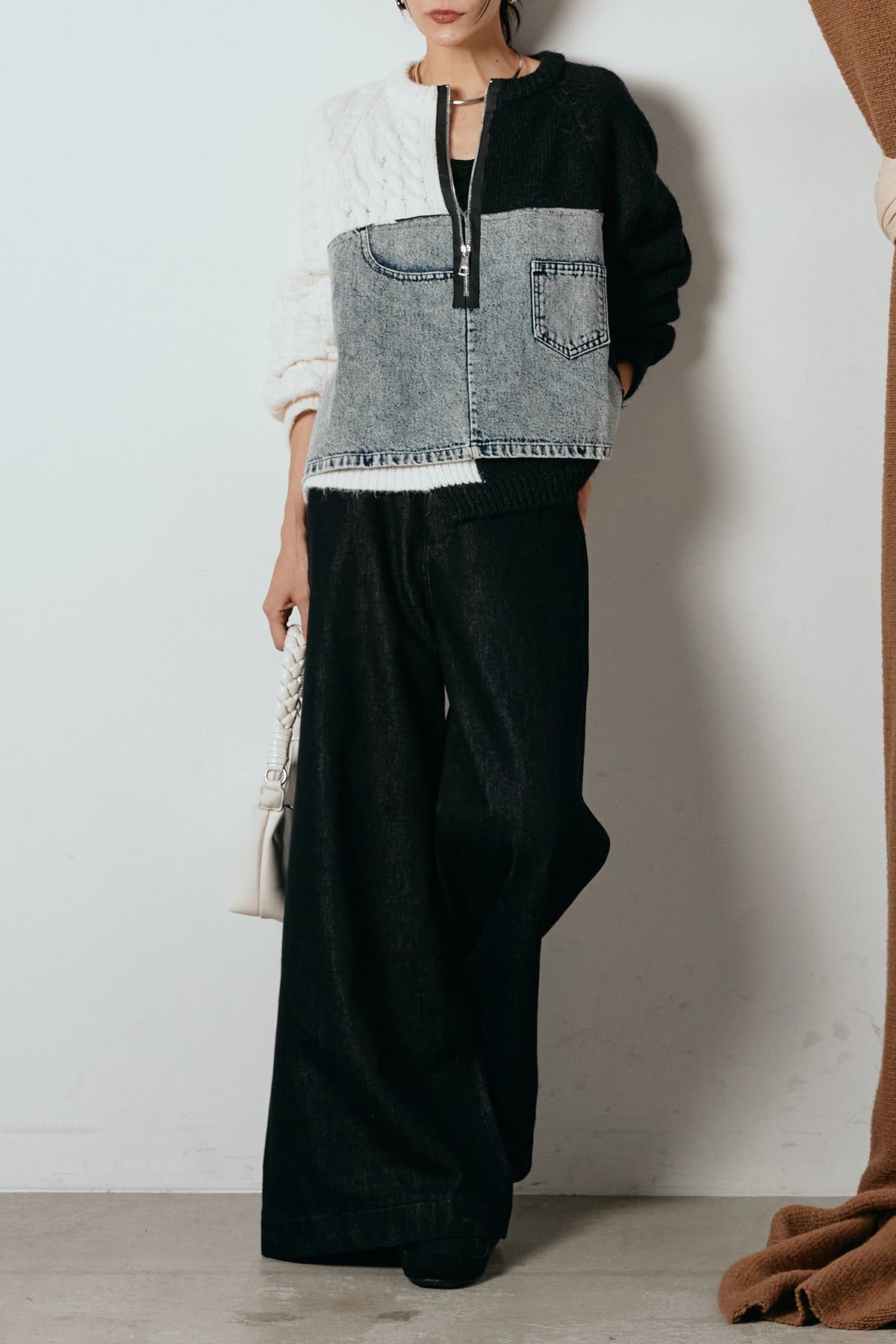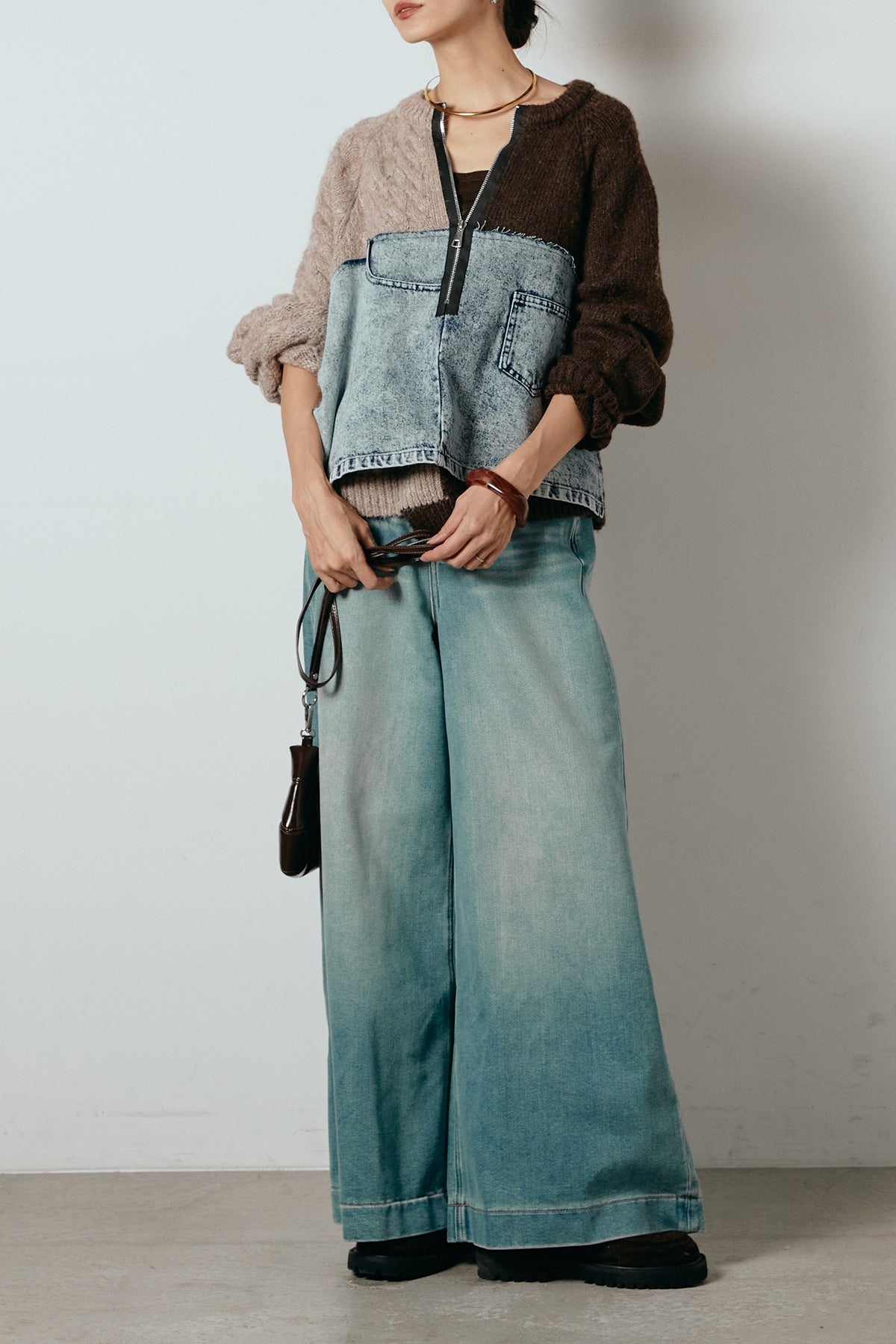 異素材を組み合わせた存在感のあるドッキングデザイン。ざっくりとしたニットにデニムパネルをミックスし、ラフさとモード感をバランスよく取り入れたトップスです。ハーフジップ仕様で抜け感の調整がしやすく、レイヤードやアクセ合わせも楽しめるデザイン。ゆるめのシルエットがこなれた印象をつくり、デニムやワイドパンツと合わせるだけで印象的なスタイリングに仕上がります。