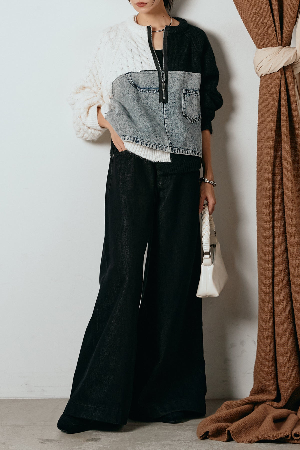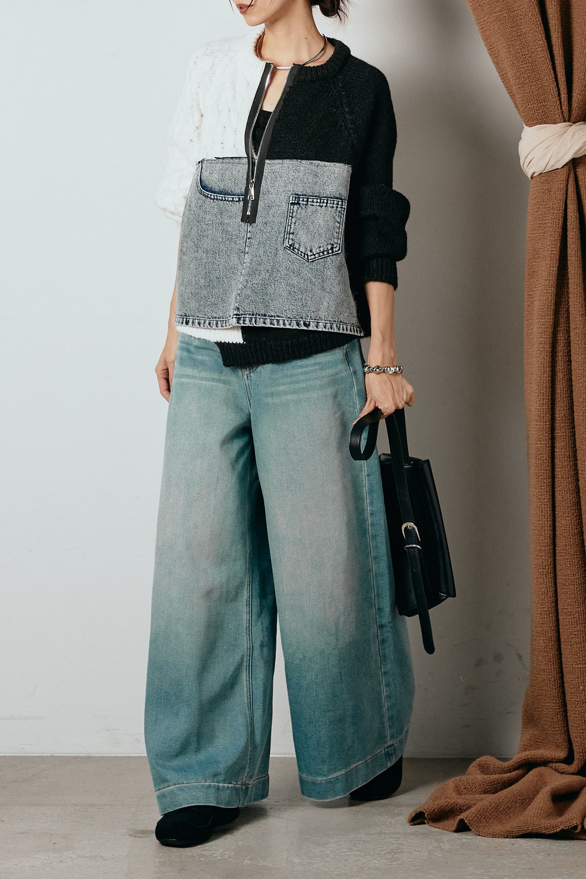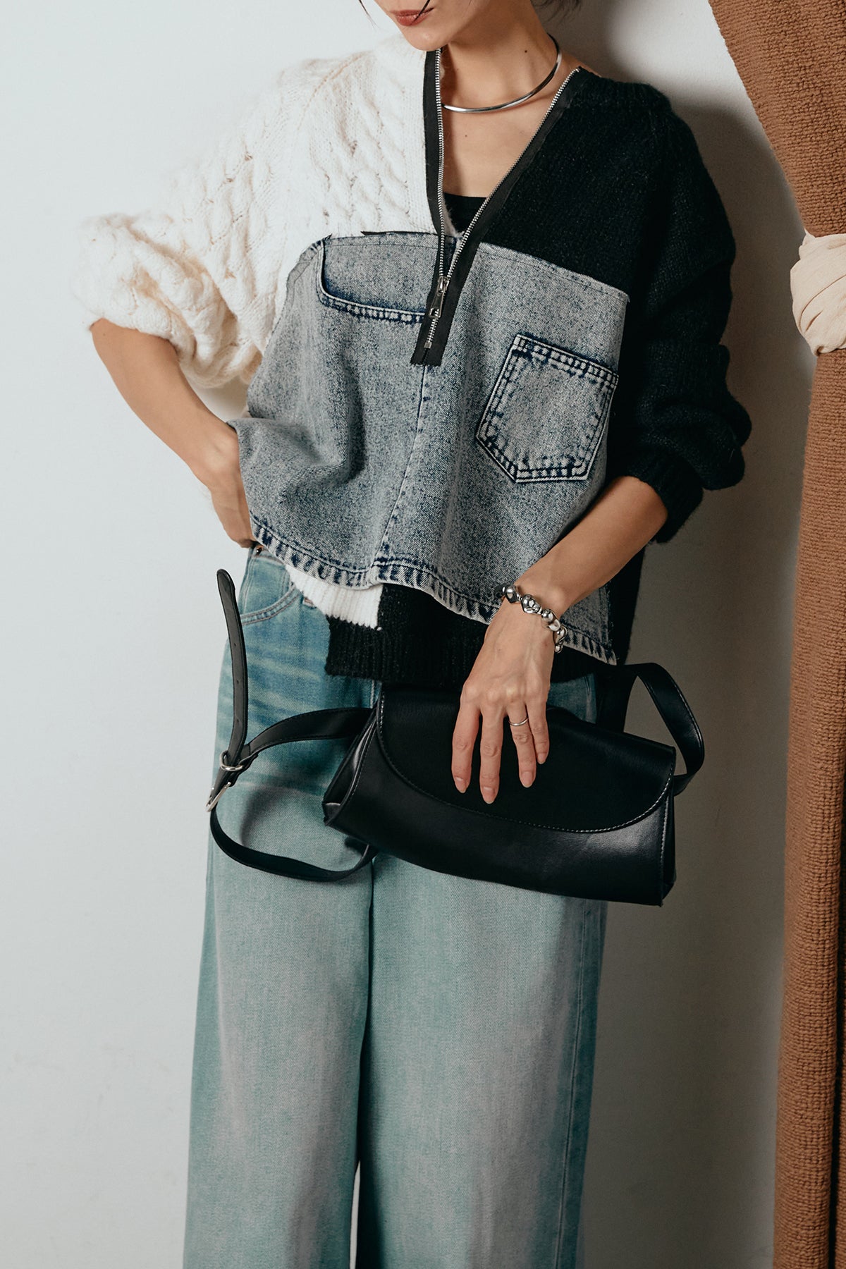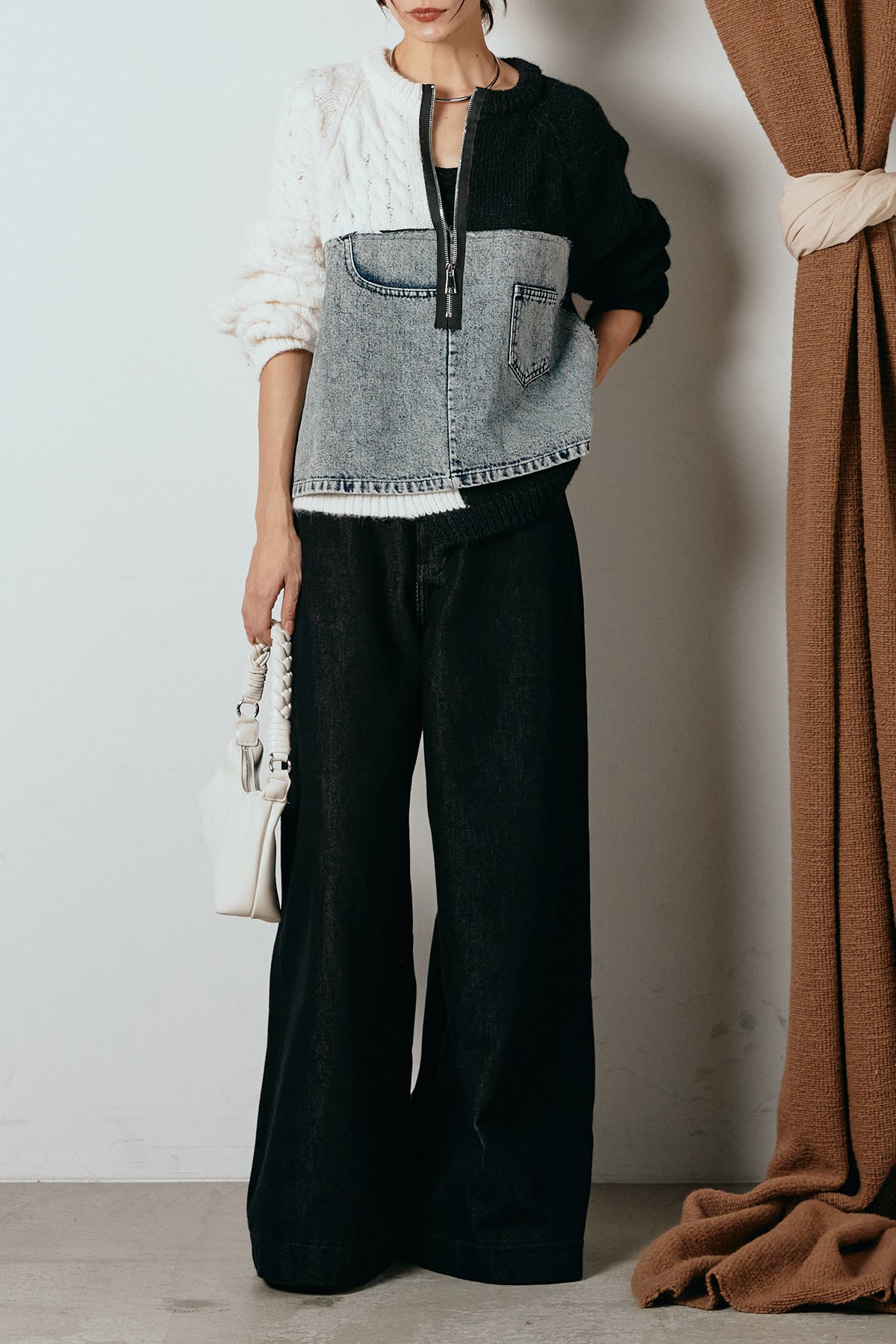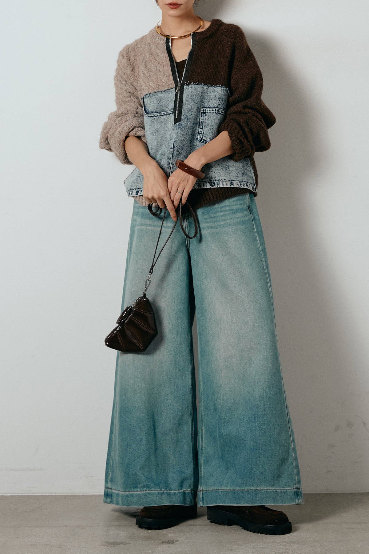 異素材を組み合わせた存在感のあるドッキングデザイン。ざっくりとしたニットにデニムパネルをミックスし、ラフさとモード感をバランスよく取り入れたトップスです。ハーフジップ仕様で抜け感の調整がしやすく、レイヤードやアクセ合わせも楽しめるデザイン。ゆるめのシルエットがこなれた印象をつくり、デニムやワイドパンツと合わせるだけで印象的なスタイリングに仕上がります。